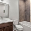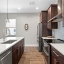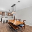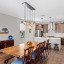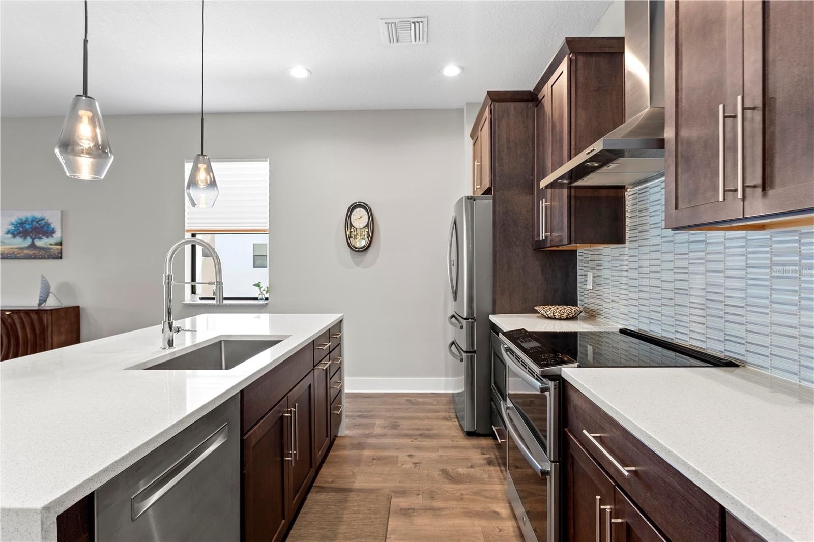 The second floor showcases a gourmet kitchen that opens to the dining and living areas. The kitchen is equipped with stainless steel appliances, including a double oven (one convection), double-door refrigerator with bottom freezer and flex drawer, built-in microwave, and a newer dishwasher. Quartz countertops and an oversized waterfall island complete the space.