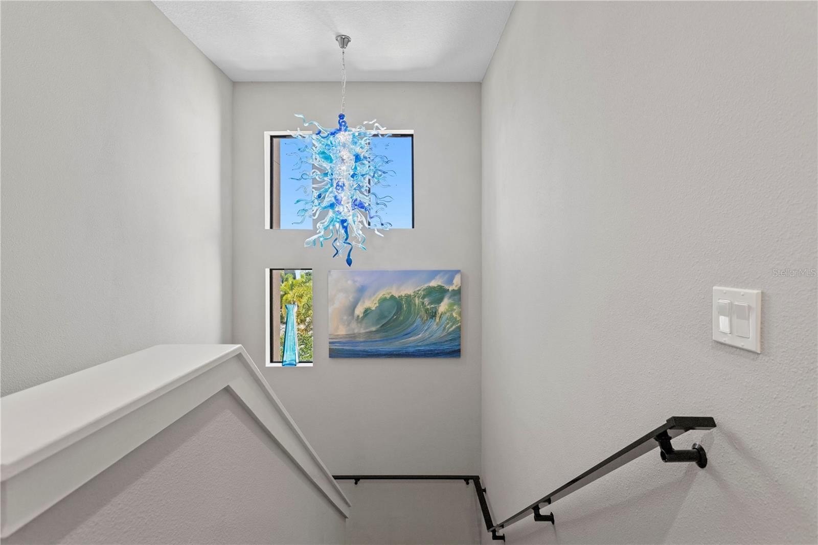 The home is loaded with luxury features, including two stunning blue Chihuly chandeliers in the stairway, upgraded flooring throughout, an EV charger, frameless shower enclosures, a Trane AC system, Bosch dishwasher, water softener, bedroom ceiling fans, soaking tub, and more.