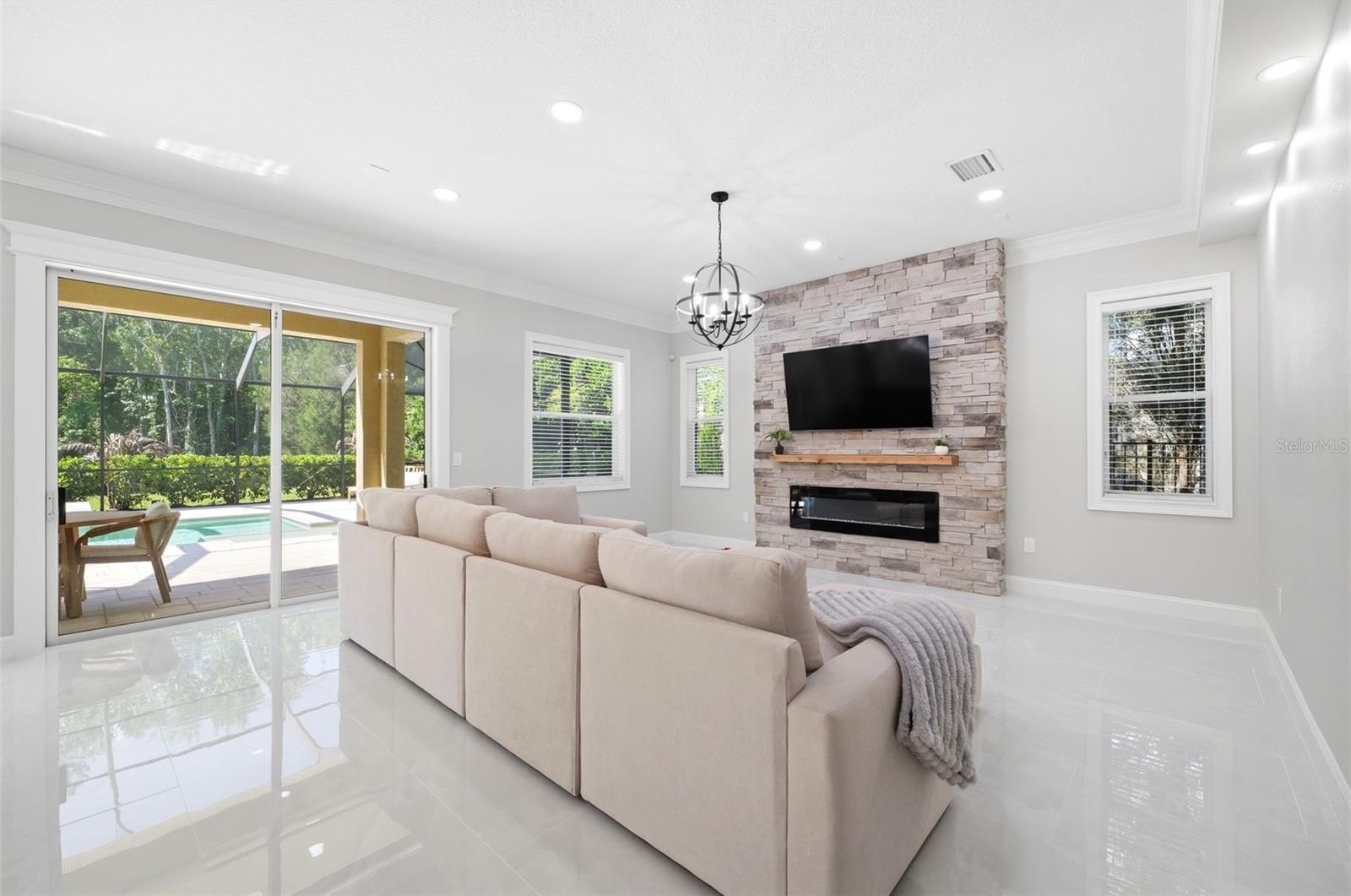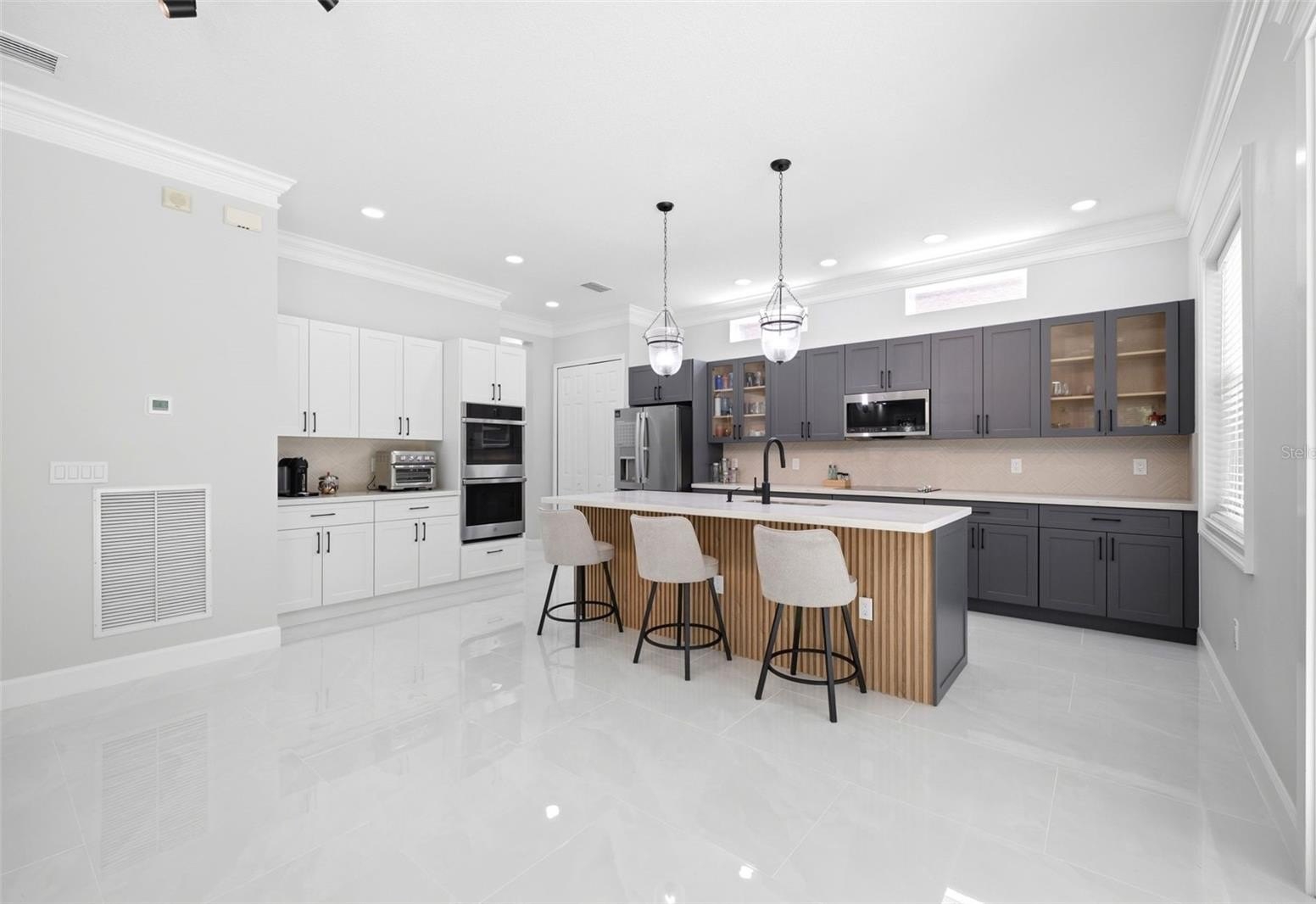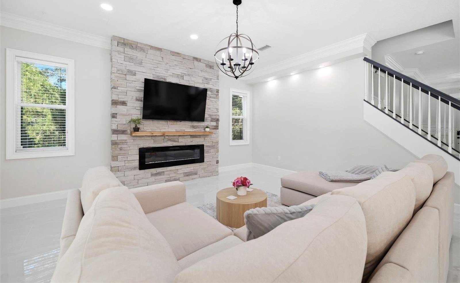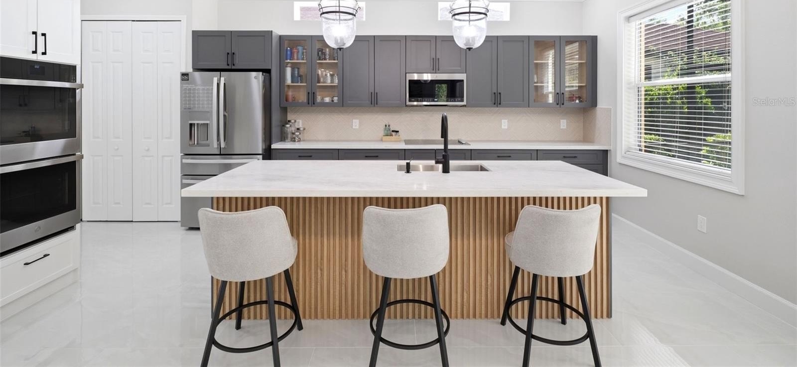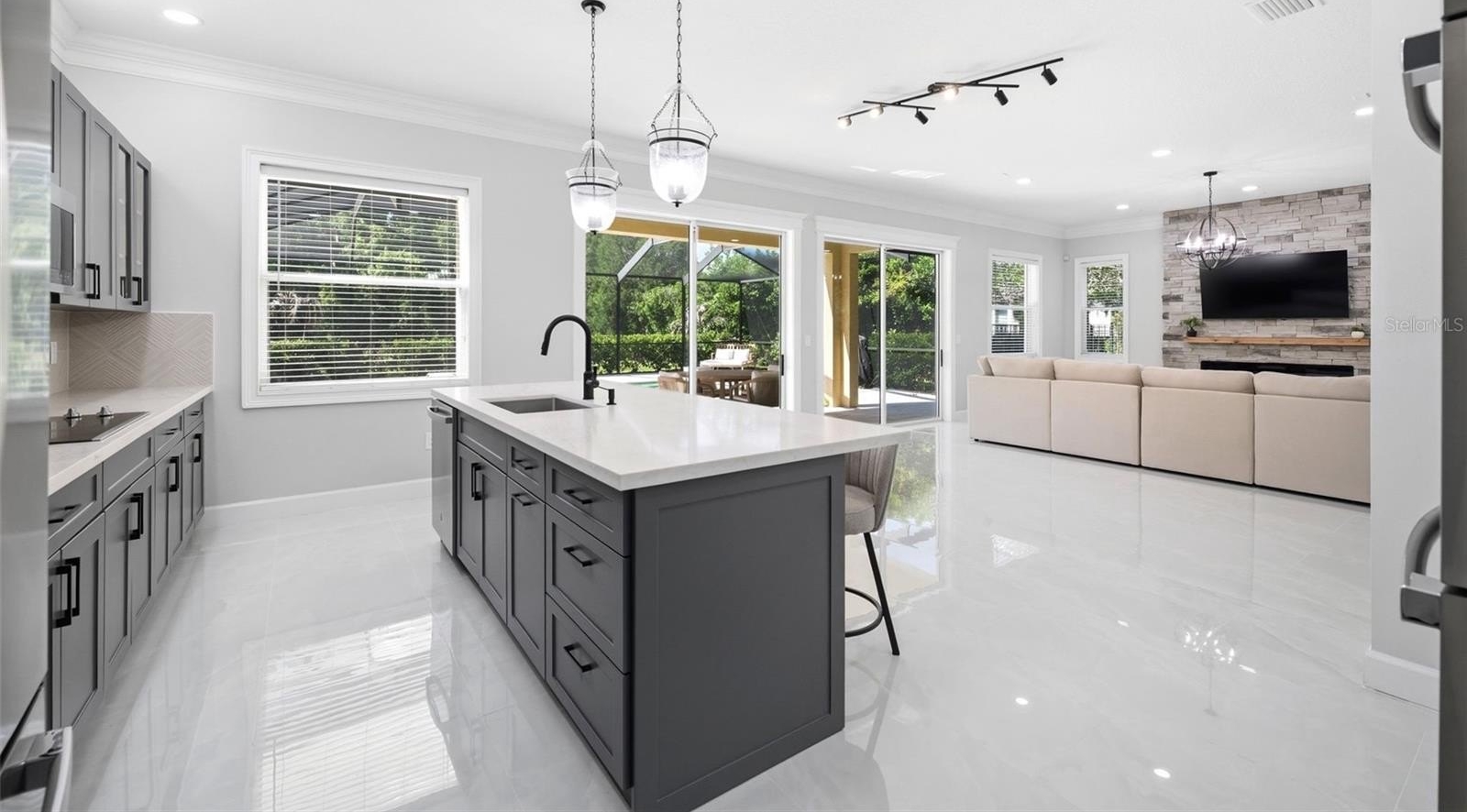The home has been extensively upgraded with oversized tile on the main floor, extreme core waterproof vinyl flooring, impact windows, sliders, exterior doors, and garage door, new crown molding, new kitchen cabinets, quartz kitchen countertops and new backsplash, soft-close cabinetry, GE Profile appliances, double ovens, custom bar / service area, wall-mounted fireplace, new lighting, LED high hats, switches, and plates, and a tankless water heater. Even better, the furnishings call be included in the sale, creating a truly move-in-ready opportunity.