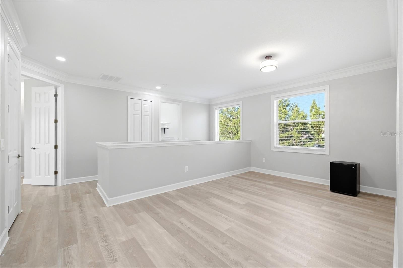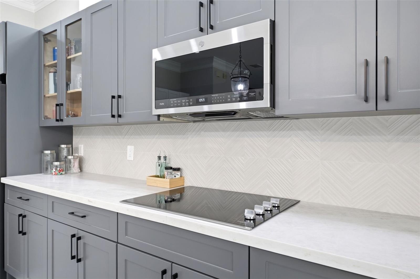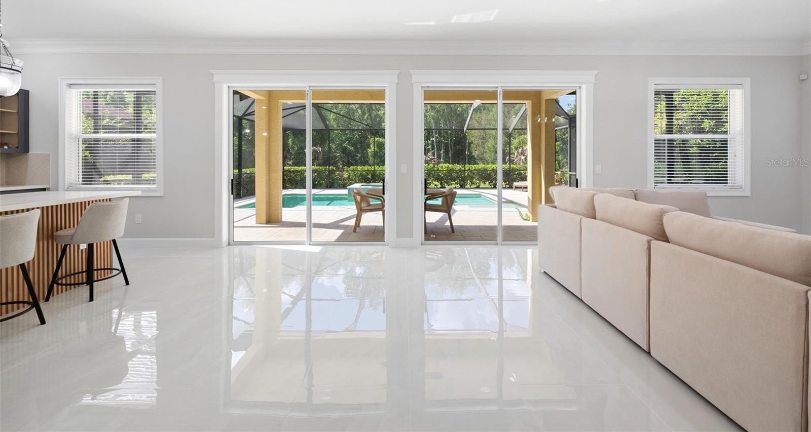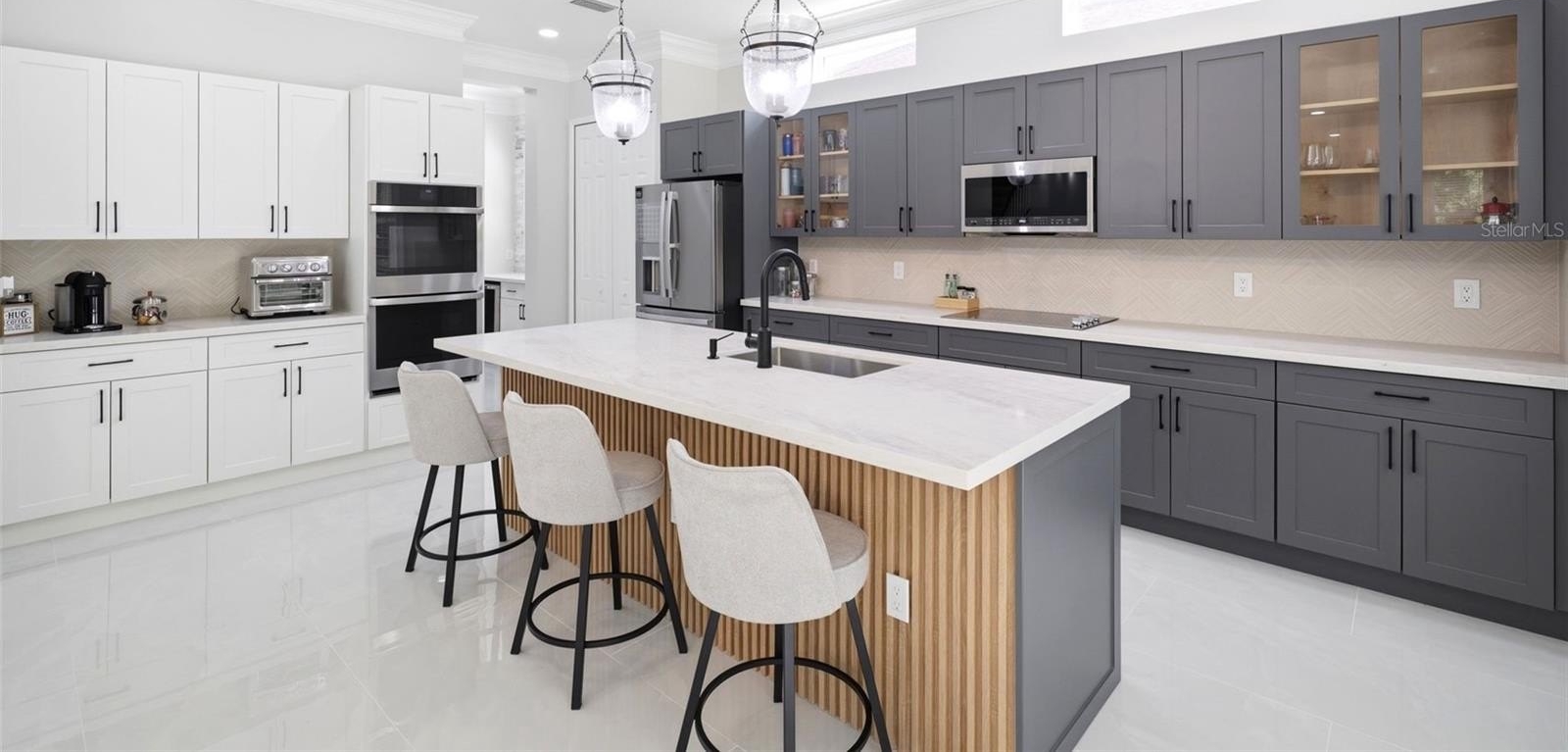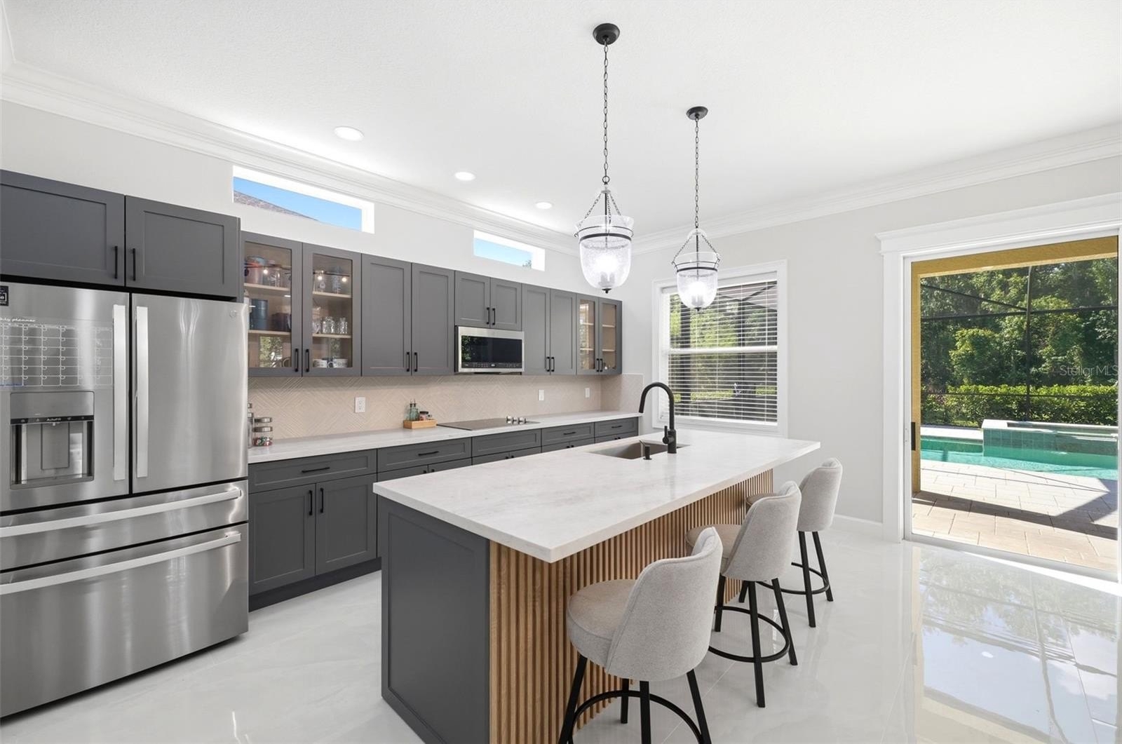 The home has been extensively upgraded with oversized tile on the main floor, extreme core waterproof vinyl flooring, impact windows, sliders, exterior doors, and garage door, new crown molding, new kitchen cabinets, quartz kitchen countertops and new backsplash, soft-close cabinetry, GE Profile appliances, double ovens, custom bar / service area, wall-mounted fireplace, new lighting, LED high hats, switches, and plates, and a tankless water heater. Even better, the furnishings call be included in the sale, creating a truly move-in-ready opportunity.