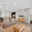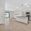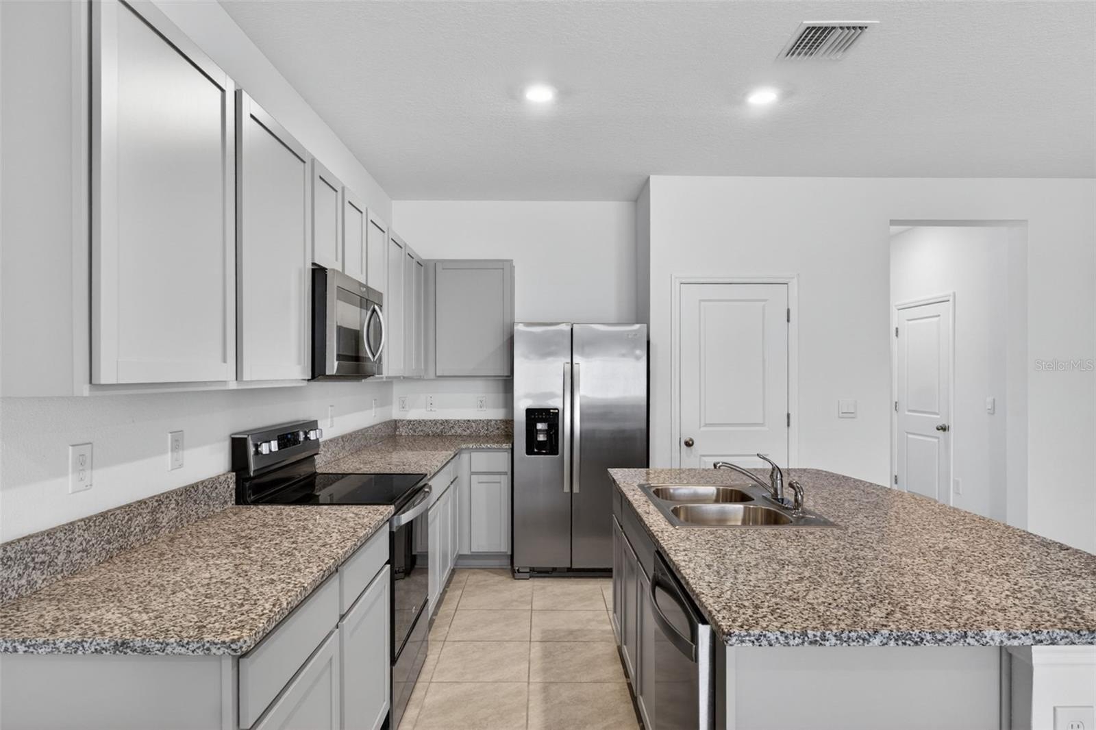 Inside, the open-concept layout is perfect for everyday living and entertaining. The kitchen features granite countertops, stainless steel appliances, ample cabinetry, a large pantry, and an oversized island with bar seating. The bright living area opens to a covered back patio through triple sliding glass doors.