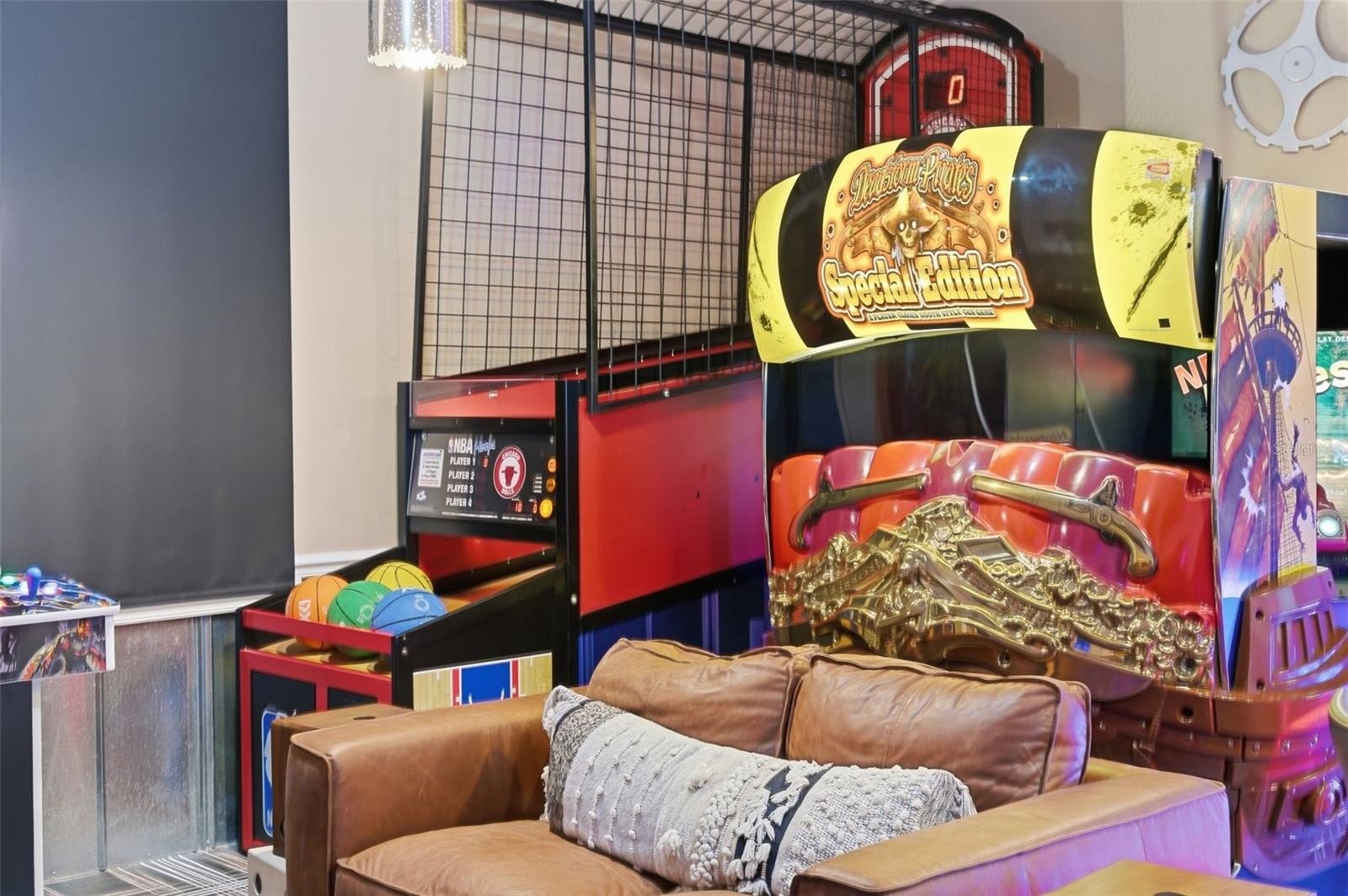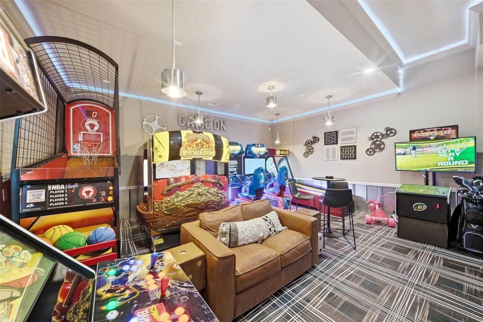 *ACTIVE MEMBERSHIP AVAILABLE*** MUST SEE HOME!!! Located at the end of a quiet cul-de-sac backing up to the tee box of the 7th hole of the Watson designed course in the one of a kind Reunion Resort & Golf Club. Architecturally designed to impress, and accentuated with HIGH-END finishes throughout such as, upgraded light fixtures, soaring ceilings, Cambria Quartz countertops throughout and large windows throughout enhancing the natural light. The Great room opens up into the expansive Lanai area, boasting a large pool & Sauna all WEST FACING WITH SPECTACULAR SUNSET & GOLF COURSE VIEWS! This home has been used only as a personal rental home and has never been rented. It has been meticulously maintained by the current and original owners, it has been equipped with all the upgrades to make it a top rental performer. The current owner has converted the garage to be the ultimate themed game room with all the fan favorites such as the multiple game arcade machine, the Golden Tee, side by side immersive racing machines , Skee Ball, and Basketball Shoot game. Able to occupy 15 guests, and suited for both families or adult groups. It features a Mickey themed bunk room as well as a Encanto themed room. The downstairs billiard room is equipped with a professional style pool table and leads into the oversized dining room table and separate gathering area, perfect for entertaining. The two large upstairs en- suites, with king sized beds, both have private access to the oversized balcony and sensational views, with one featuring a small office area for those who must bring their work with them. The first floor oversized Master Bedroom features a stand alone tub and sliding doors that open up to the lanai. All rooms beside the Encanto themed room are en-suites. This home went through an extensive renovation by previous owners in 2022 with the following upgrades: All new flooring throughout the entire home, repainted ceilings, walls, & trim throughout the home, complete remodel of both master bathrooms with BRAND NEW custom showers in three bathrooms. Stand-alone tubs and designer champagne bronze tub fillers added in both master baths, nearly every window in the home has been replaced, and updated every light fixture in the home. BRAND NEW LED can lights both inside and outside of the homer. Custom linen draperies, shutters and blinds from Cameron Designs in Orlando, All new Cambria Quartz countertops throughout -- kitchen, baths, laundry room, upstairs bar area and dining room buffet. Removed the upstairs laundry room, moved walls, and added an additional bedroom. Additional HVAC venting and electrical added for the new room. Flat screen TV's, double front-load washer and dryer to laundry room. Added a second vent and electrical for additional units, and more! No expense was spared during the renovations of this truly TURN KEY property! Located in a luxury Reunion Resort, one of the kind in the World, the 3 World Class Championship GOLF COURSES and so much more to enjoy! Make this home your primary residence, second home, or income producing rental home! Start making lifelong family memories today!! Dream home, dream views, dream location for family who loves elegance! Schedule your showing today!