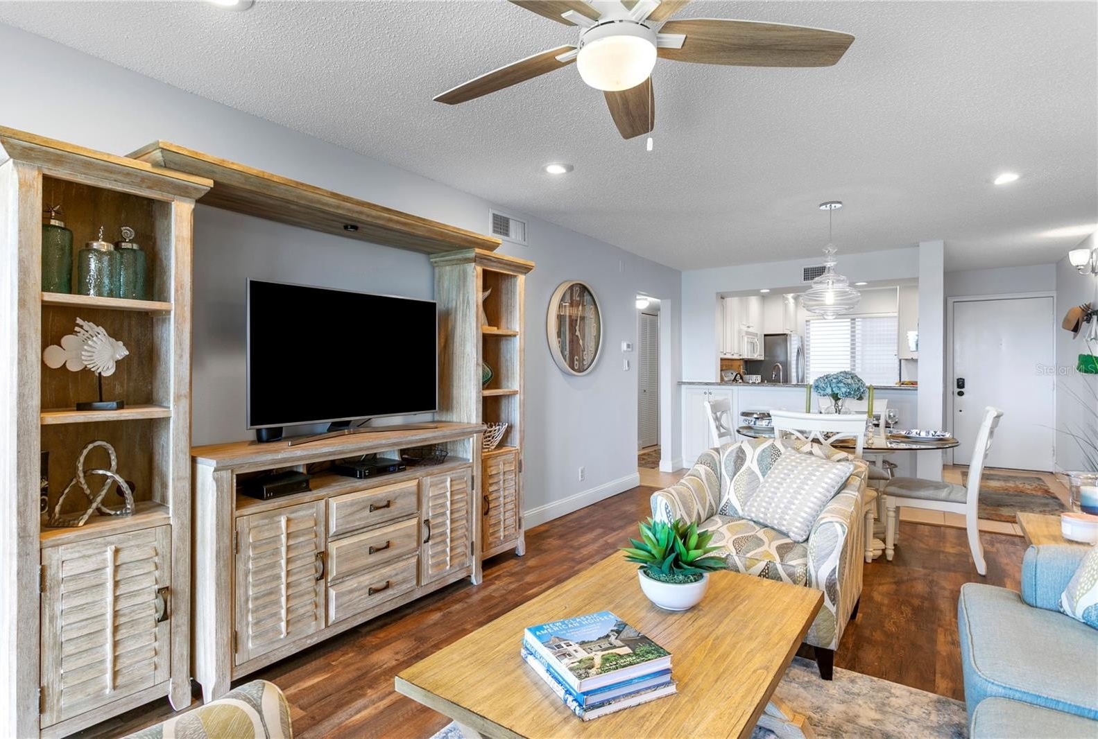 The kitchen is thoughtfully updated with newer appliances, including a recently installed refrigerator and disposal, offering both functionality and ease for everyday living and casual entertaining. The interior is finished in a relaxed coastal palette, complemented by durable vinyl plank flooring that enhances both style and practicality.