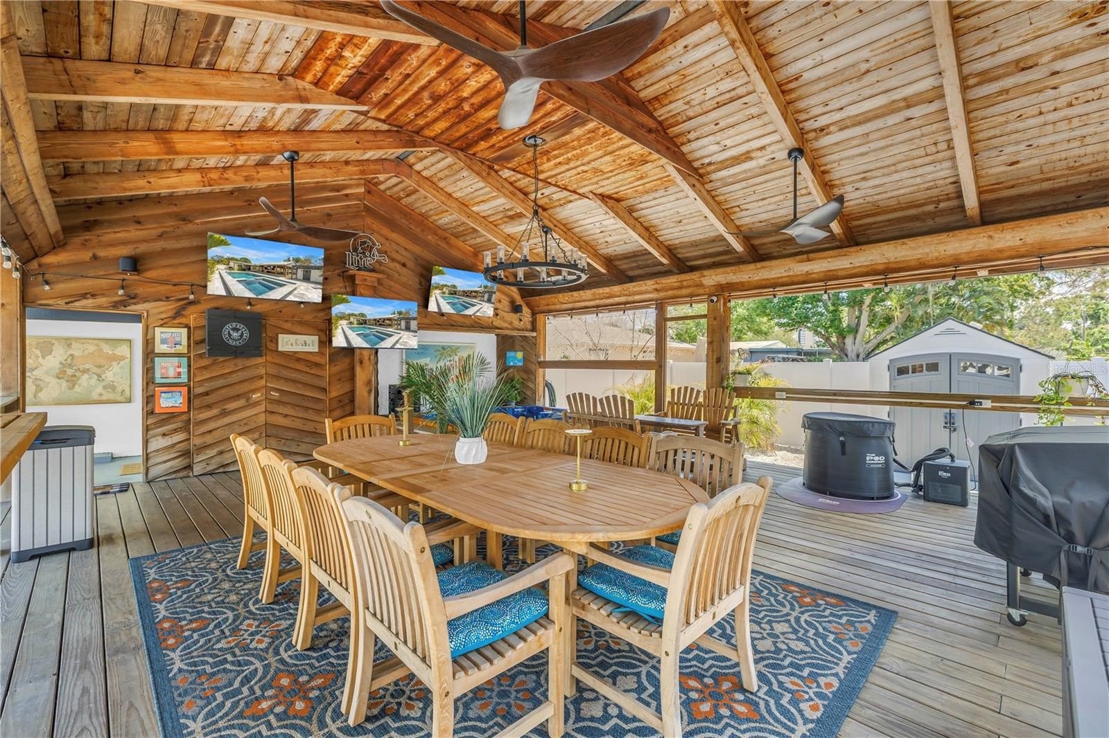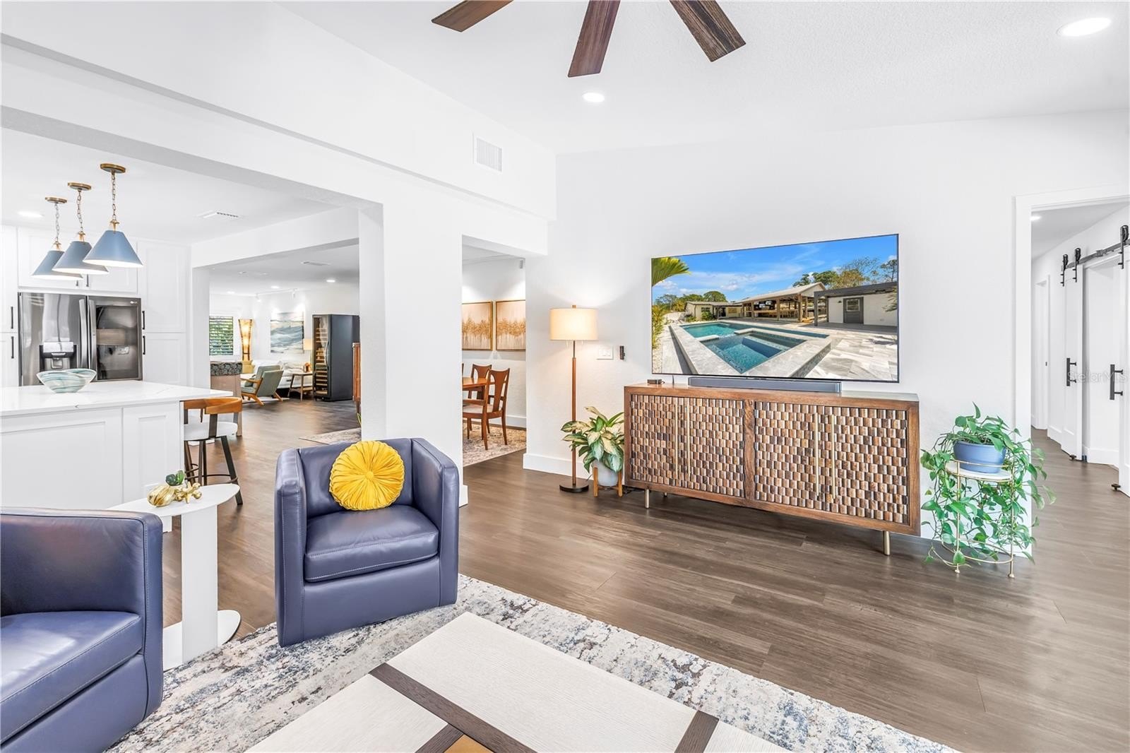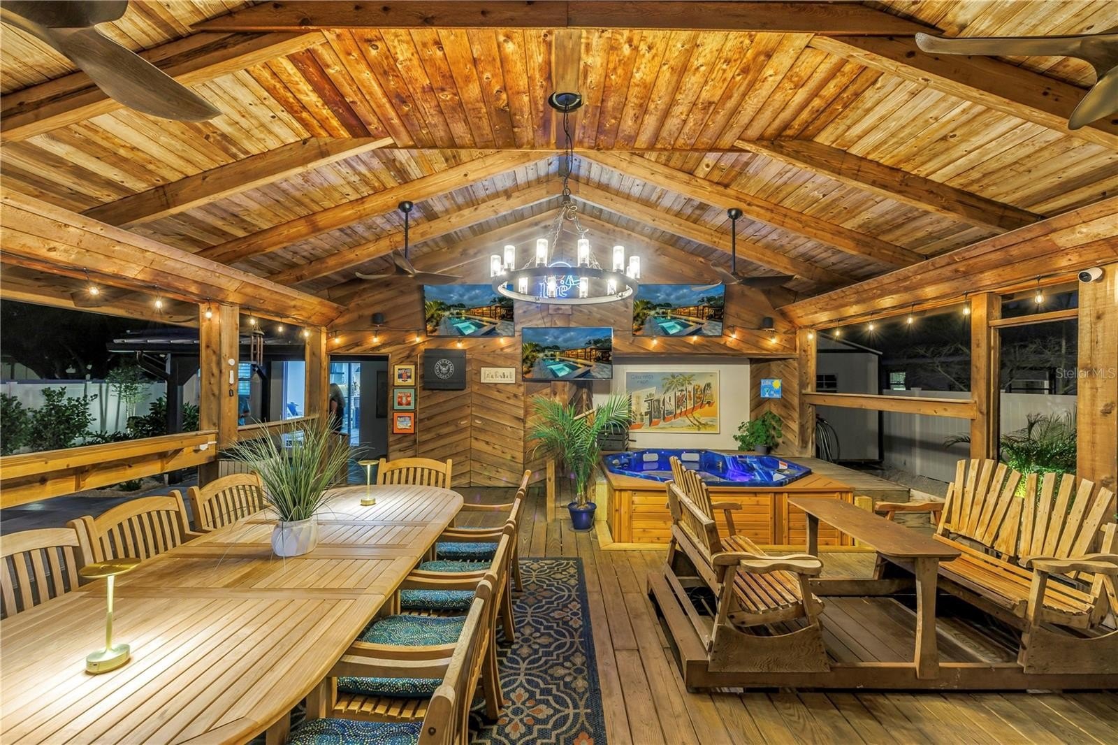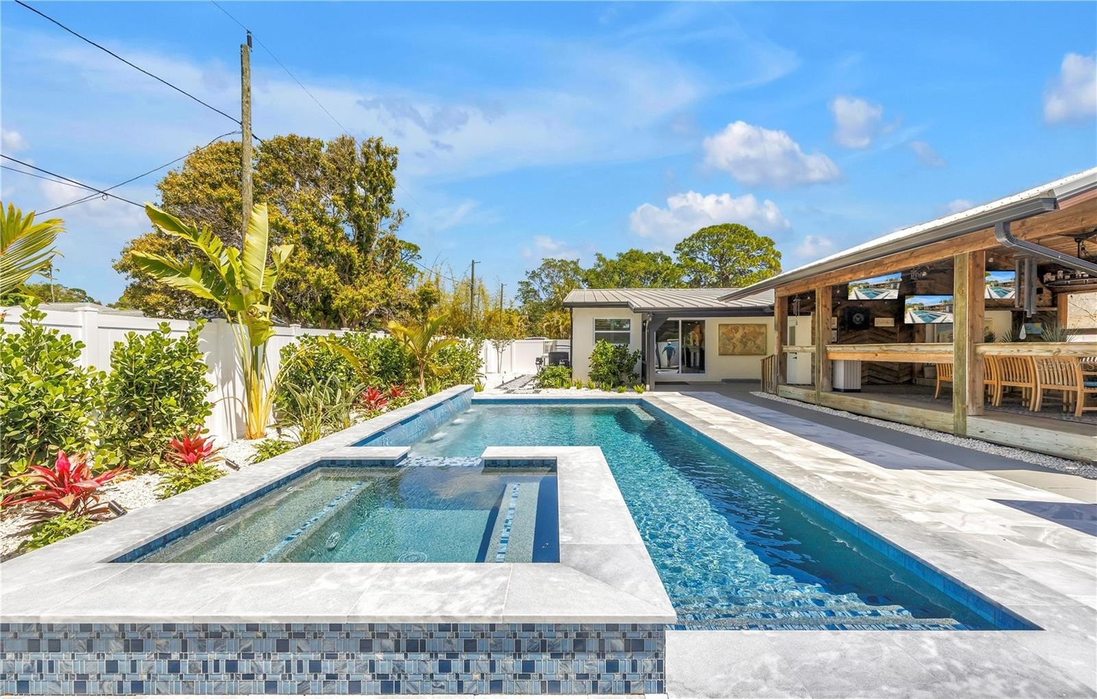 The main home features a split-bedroom layout, a beautifully redesigned chef’s kitchen with oversized island, dual pantries, and abundant storage, all flowing seamlessly into open living spaces and out to an expansive covered lanai. The outdoor retreat showcases a heated saltwater pool, enhanced by lush landscaping, a 638 sq ft vaulted covered, “Entertainment Pavilion”, complete with a spa/jacuzzi and a spacious dining area that comfortably seats 12, with multiple TV mounting locations already in place.