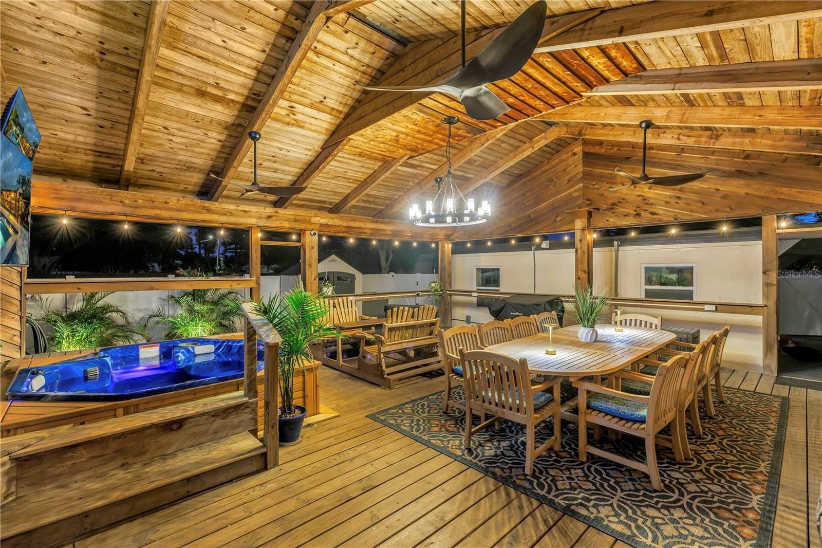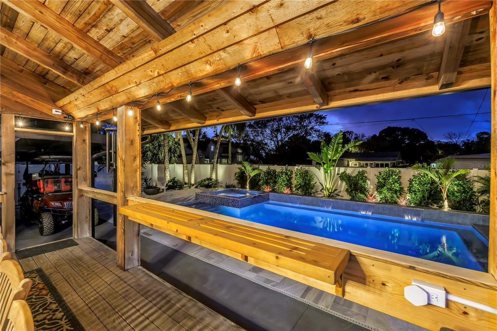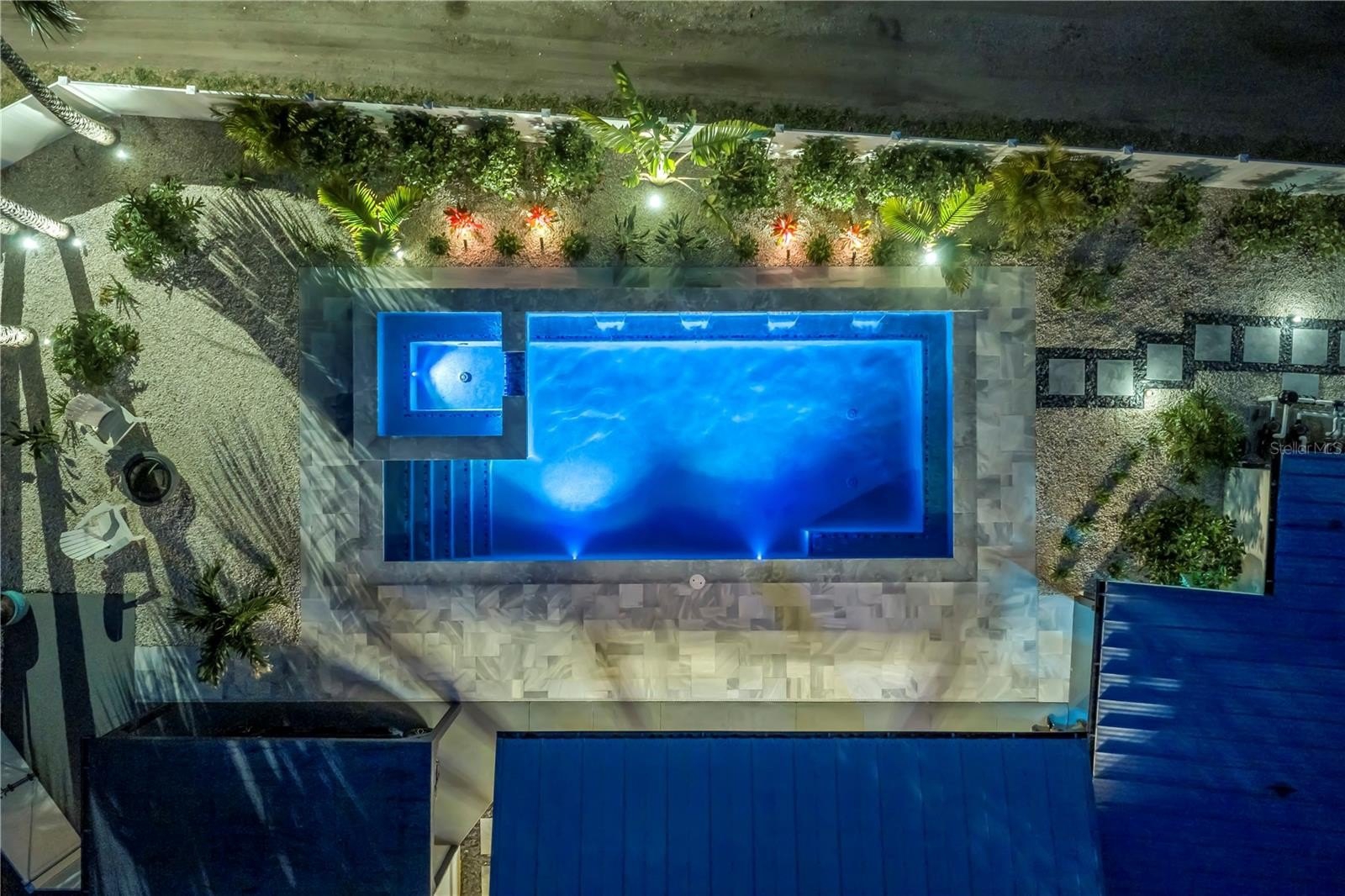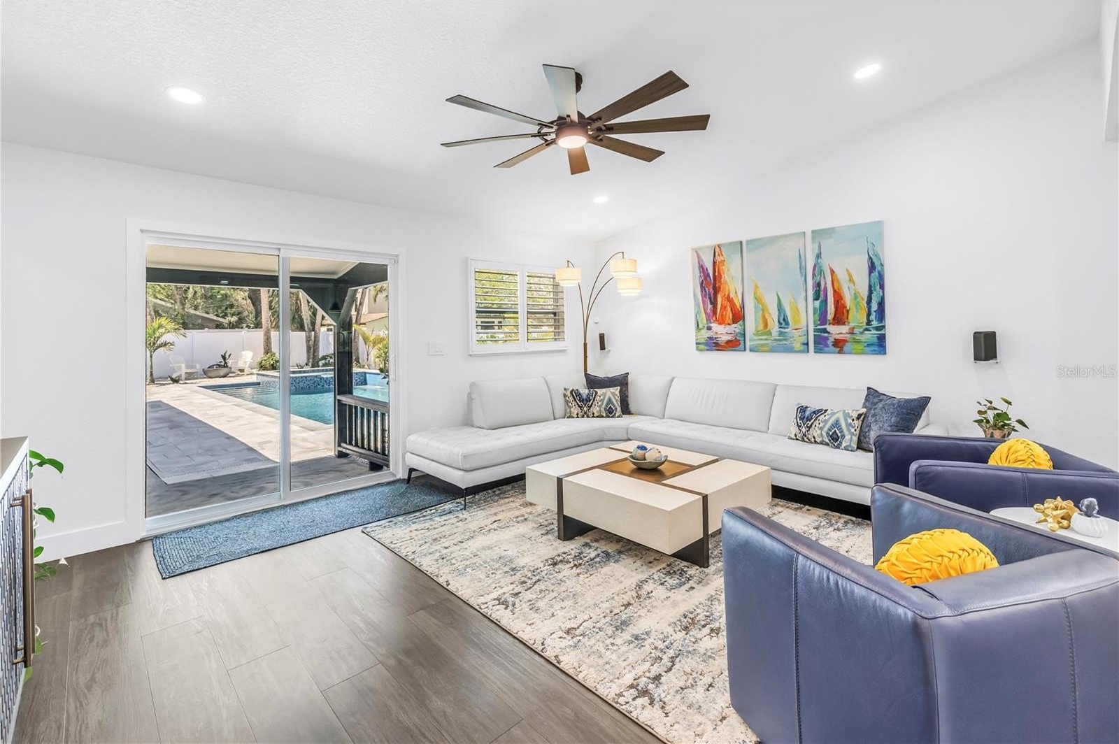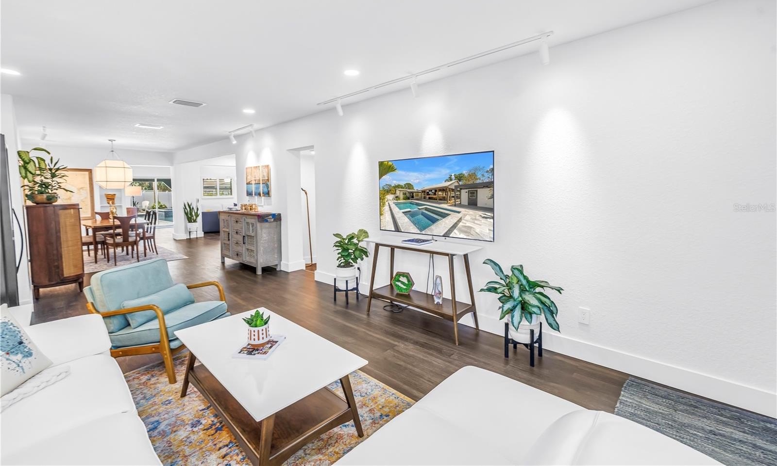 The main home features a split-bedroom layout, a beautifully redesigned chef’s kitchen with oversized island, dual pantries, and abundant storage, all flowing seamlessly into open living spaces and out to an expansive covered lanai. The outdoor retreat showcases a heated saltwater pool, enhanced by lush landscaping, a 638 sq ft vaulted covered, “Entertainment Pavilion”, complete with a spa/jacuzzi and a spacious dining area that comfortably seats 12, with multiple TV mounting locations already in place.