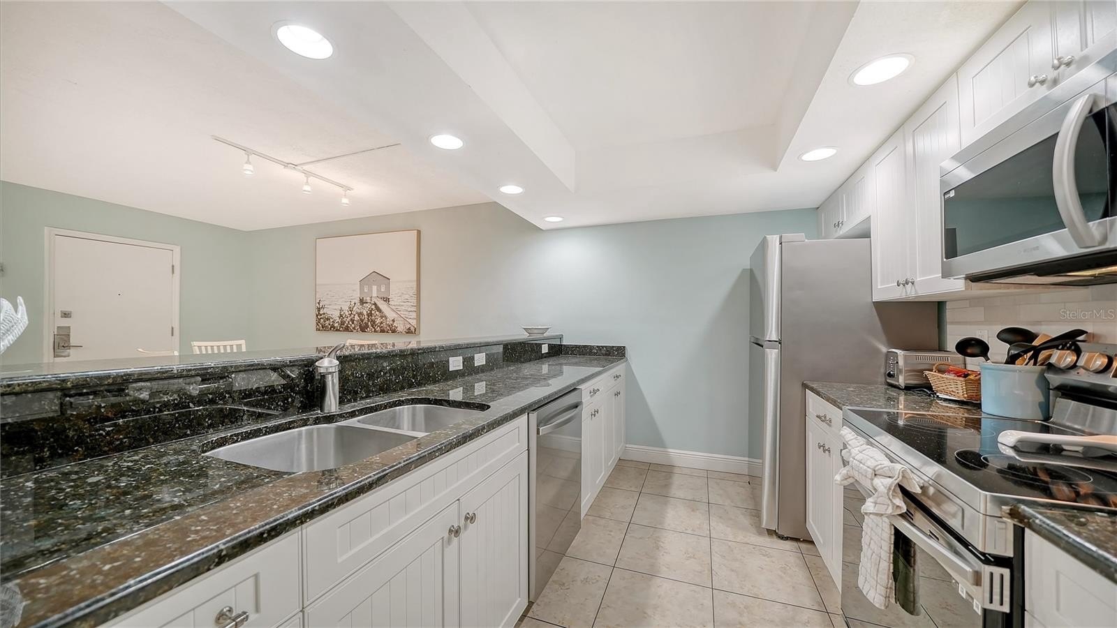 The light-filled interior features an open layout designed for ease and comfort, where the kitchen, dining, and living areas flow together naturally. Oversized tile flooring, updated impact glass, and sliding doors enhance both durability and livability, while the kitchen is well-appointed with granite countertops, solid wood cabinetry, stainless steel appliances, and built-in shelving—creating a functional space for everyday living or hosting.