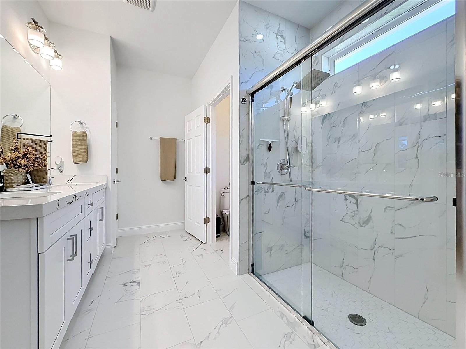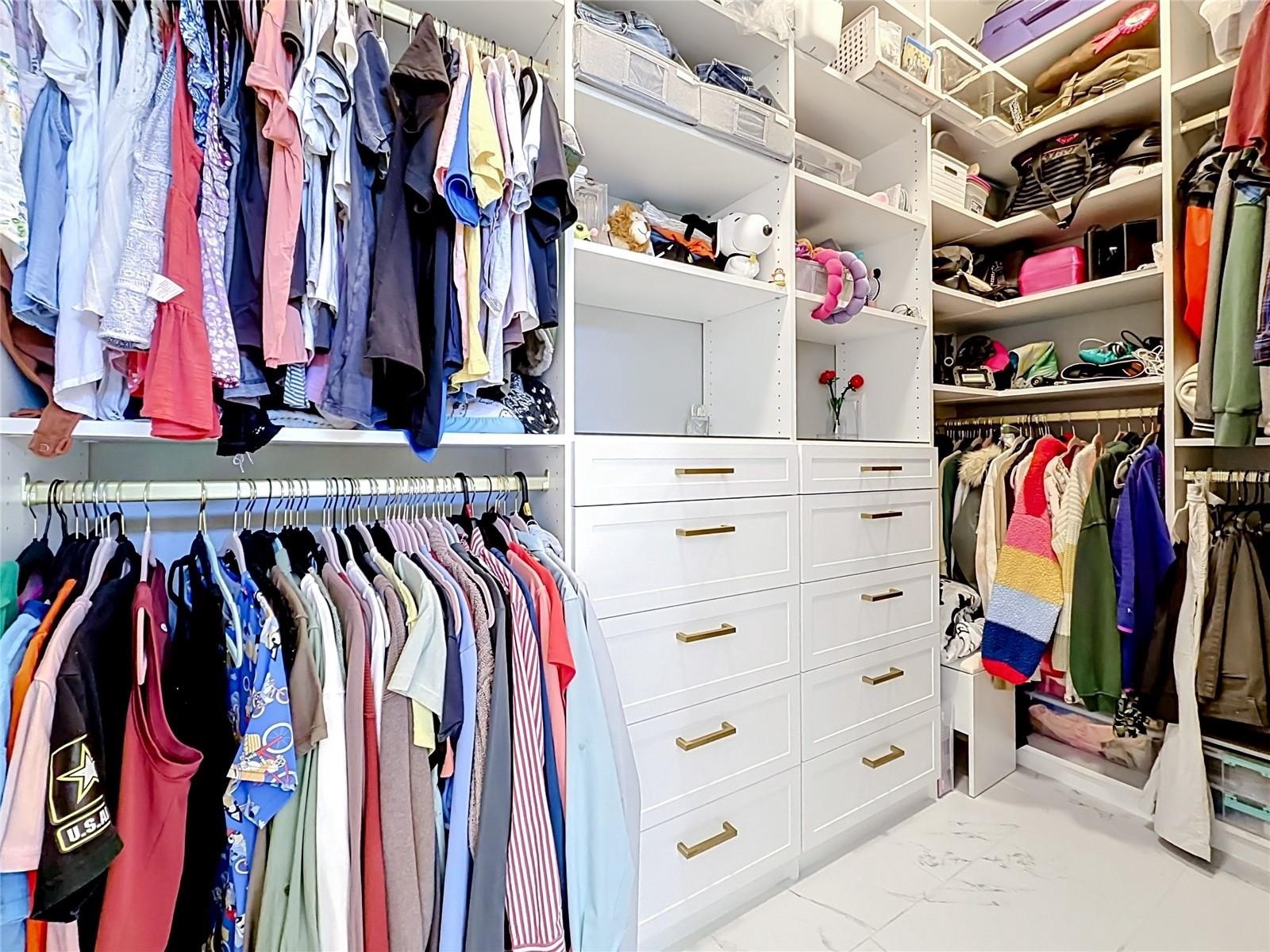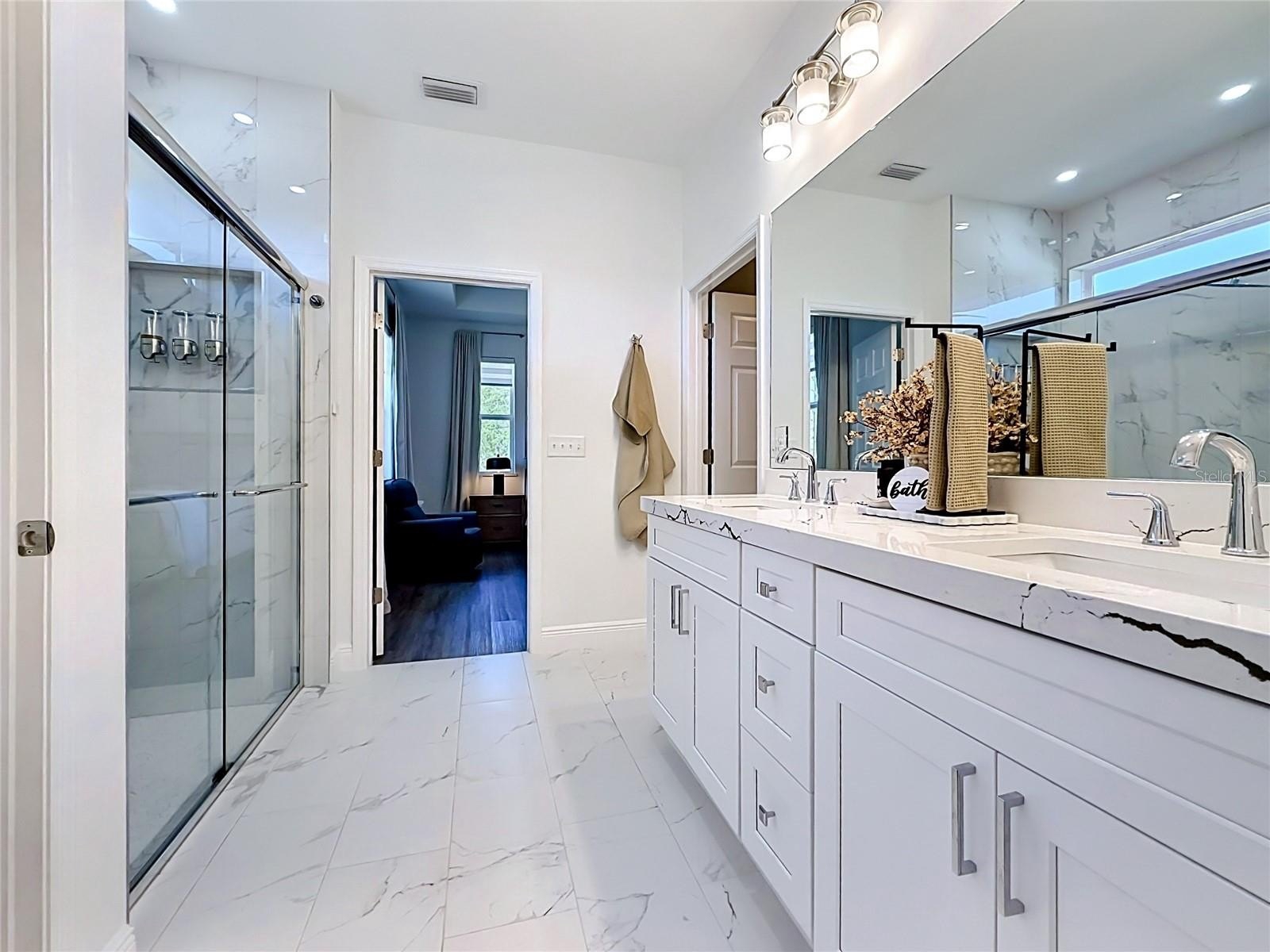 The bathrooms are thoughtfully designed with granite counters and refined, modern fixtures. Additional upgrades include built-in closets, beautiful lighting and hardware, a full water treatment system, and gutters for added convenience.