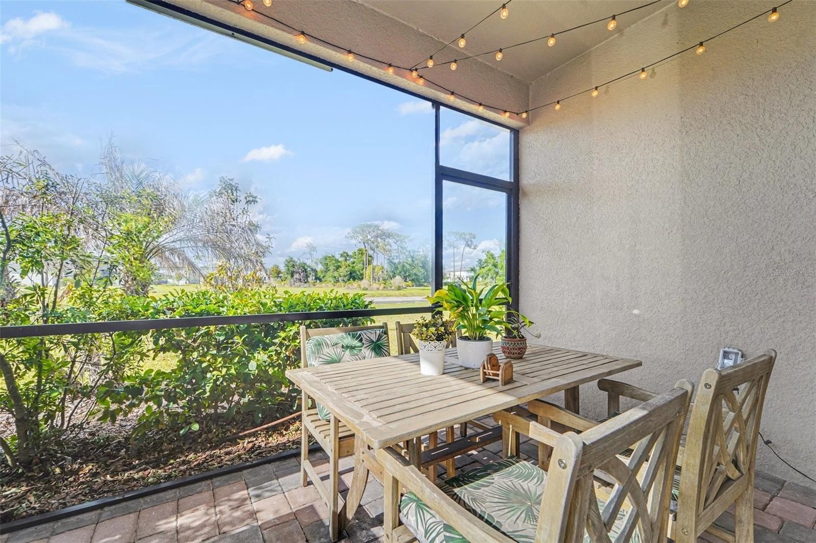 Dramatic twelve-foot sliding glass doors open to a covered, screened-in paver lanai, offering a seamless indoor-outdoor living experience. Enjoy tranquil pond views and the rare privacy.