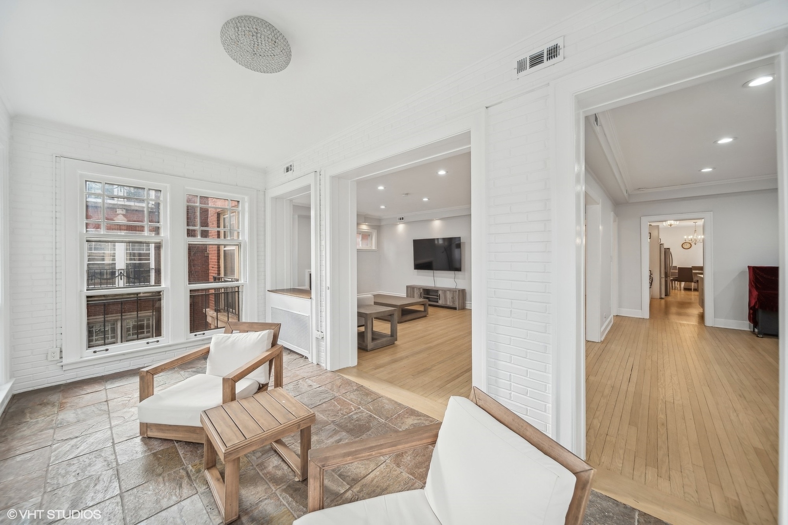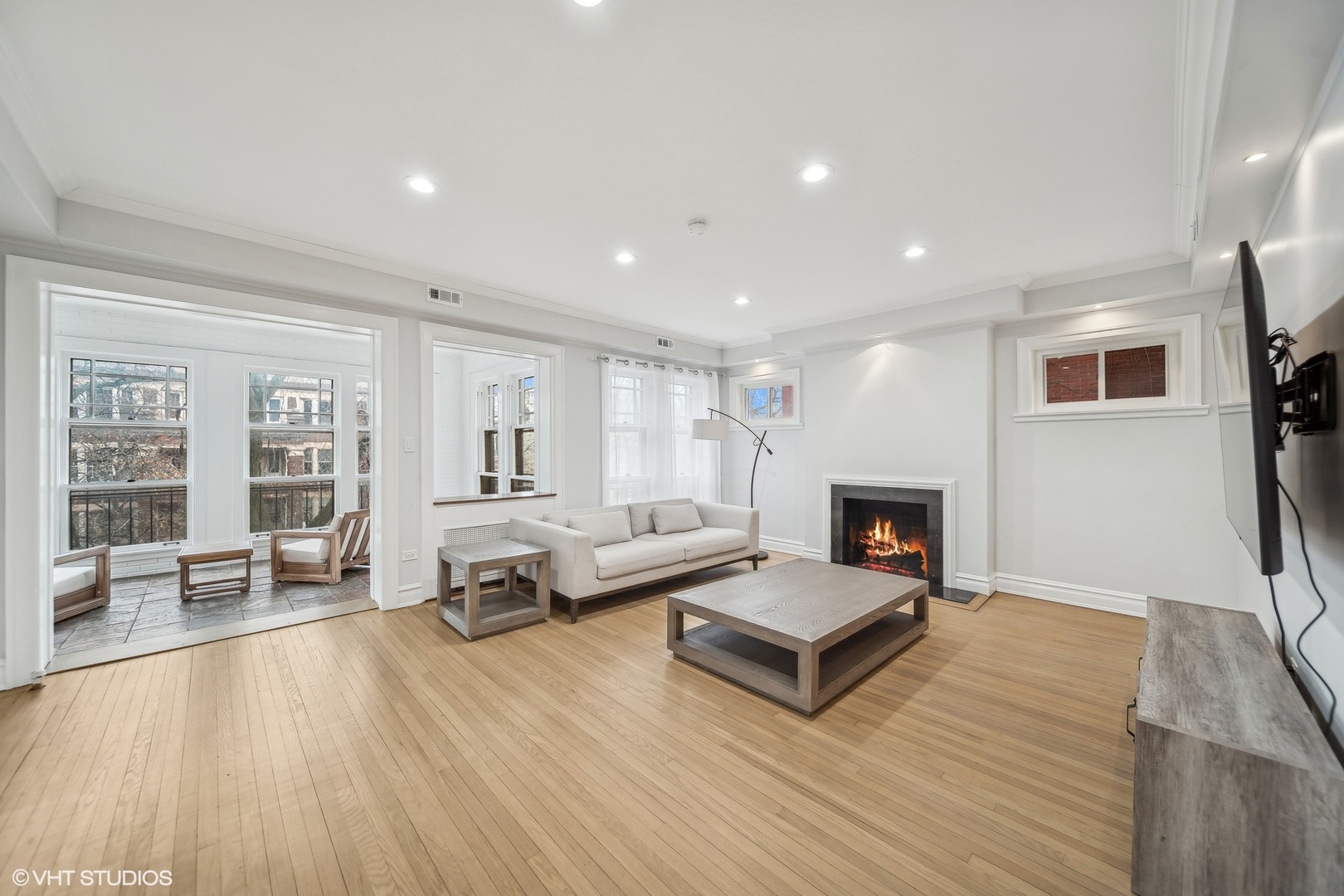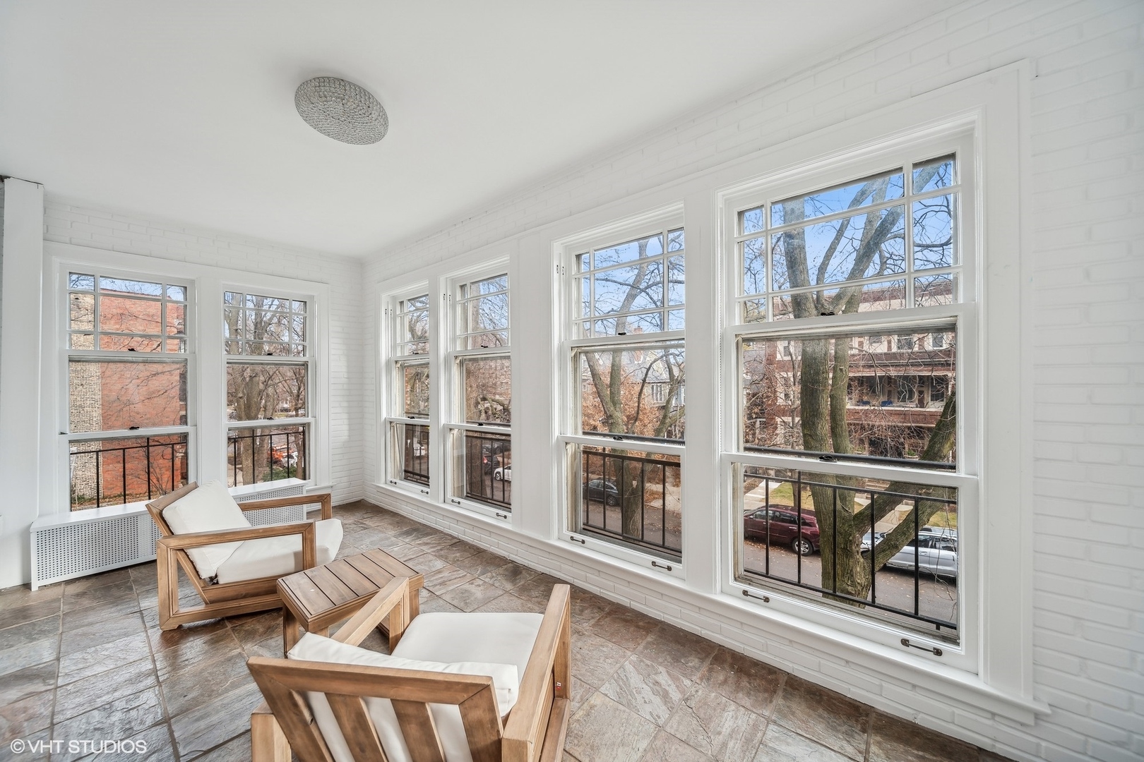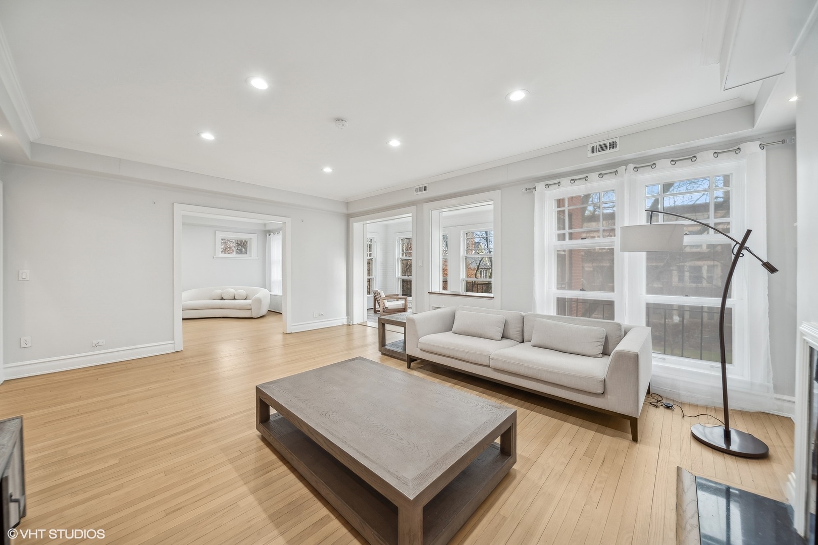 Rarely avail palatial 3200+ Sqft single floor walkup condo in coveted UC campus location. This exquisite 5 bedroom, 4 bath unit retains the character and flow of grandiose residences of yesteryear, while offering modern amenities with an extensive list of upgrades. Upon entering the home, you are greeted by an immense living room with wood burning fireplace and large windows, an adjacent equally sized formal dining room that can also function as a family room, and an amazing sunroom with walls of windows that let in abundance of natural light. The recently upgraded gourmet kitchen features a large butler's pantry, loads of white cabinetry, quartz counters, Viking stove and full suite of stainless steel appliances. The adjoining eating area has seating space for 8 or more. The gigantic primary suite is fitting for loyalty with large walk in closets finished with custom organizers, a stunning bath with soaking tub, walk in shower, double sink vanity and beautiful finishes. There are two more bedroom suites each with its own, recently rehabbed full baths finished with gorgeous tiles, vanities and hardware. The hall full bath is equally dazzling with a custom walk in shower and double sink vanity. The bedrooms are all spacious and upgraded with loads of custom built-ins and closet organizers. Additional features include garage parking and on site storage room. This special home is in one of the best locations in Hyde Park within walking distance to UC Campus, Univ Lab school, The Obama Library, and Metra station.