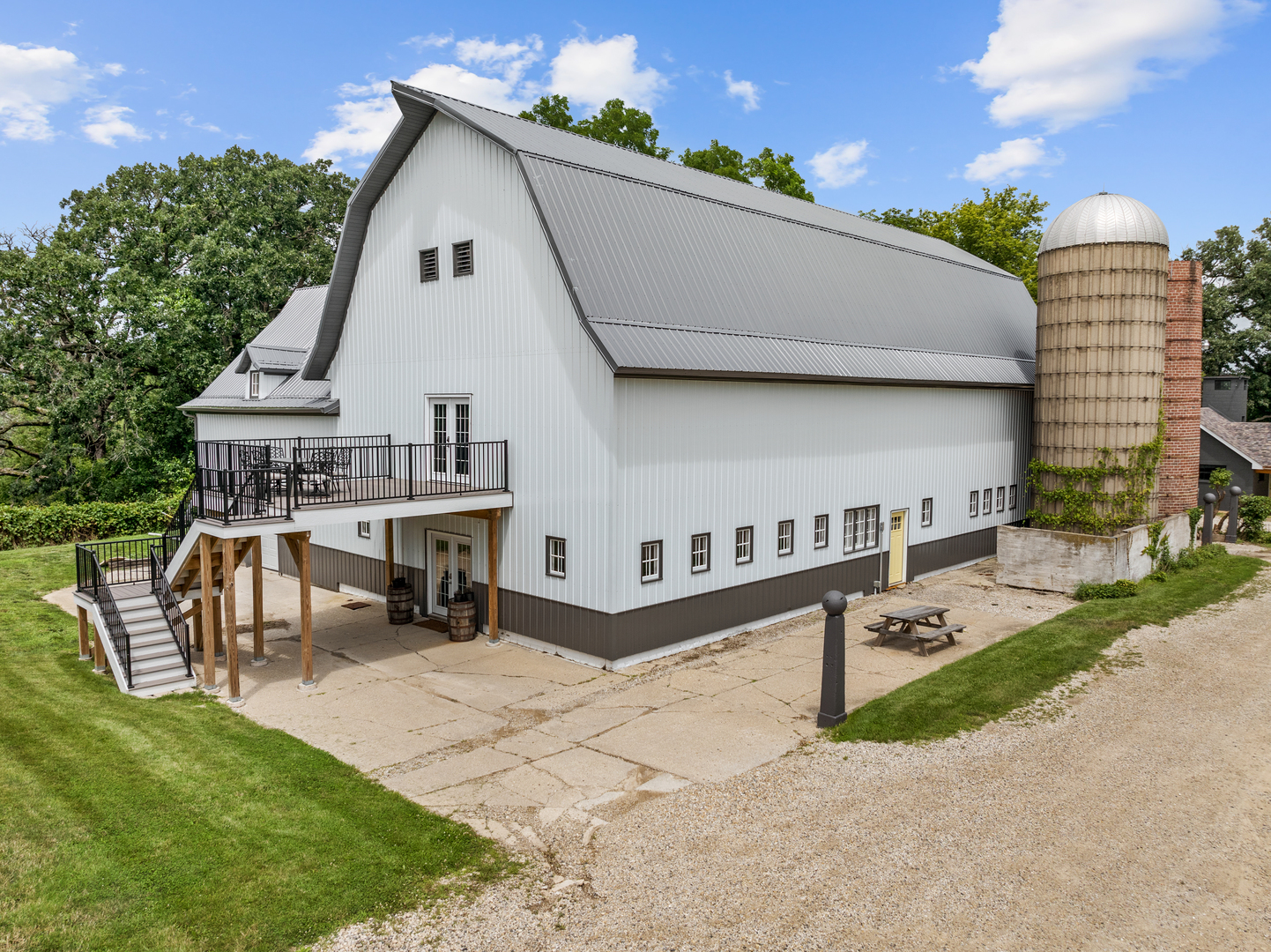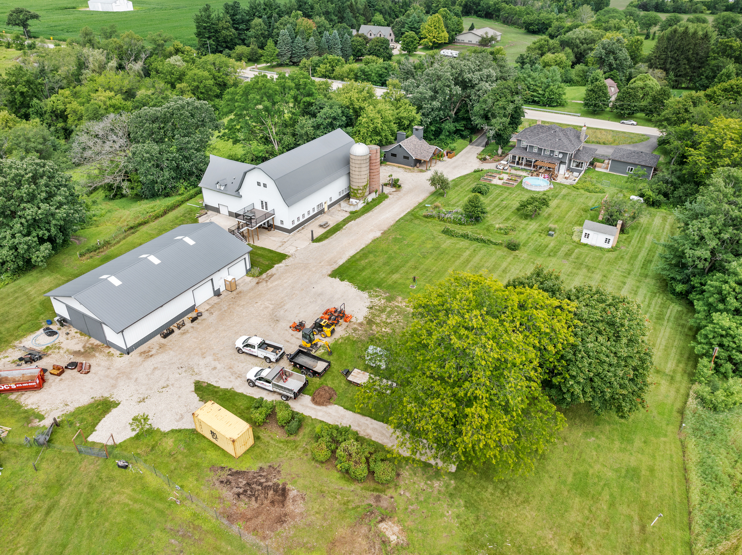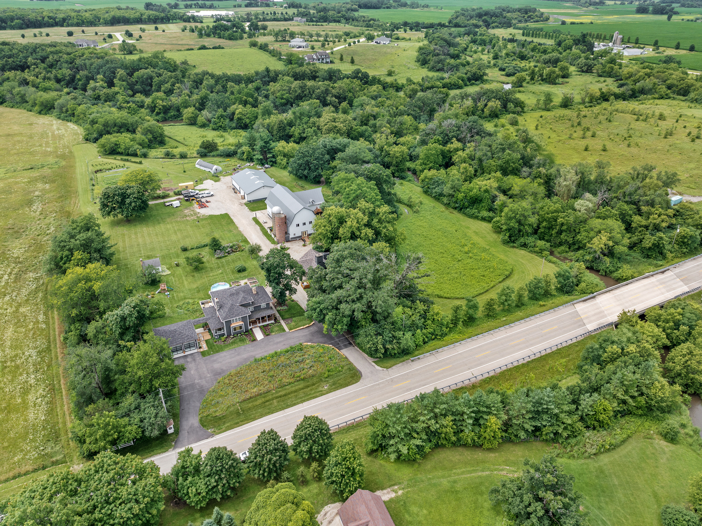 FANTASTIC 13 ACRE FARMETTE FOR SALE. Thoughtfully composed improvements have been executed to the highest standard of quality to create a turn key property of singular style and value. This renovated home elevates and honors the American Foursquare design where a sweeping floorplan balances bountiful room dimensions with snug, private spaces. 2 fireplaces. There are 2 sizable bedroom suites and 2 additional bedrooms upstairs. 3 1/2 baths. The kitchen is sunny and airy with high end everything, gleaming counter space and expansive table and breakfast bar seating. 2 refrigerators, custom cabinets, pot fillers at the stove and at the coffee bar and glass doors to the decks. Spray foam insulation, newer electric, windows and roof. No worries because there is a whole house Generac generator. Large 2+ oversized garage is connected to the home by a beautiful breezeway. Timeless, classic barn with an abundance of clean, secure rooms on the main level, a gorgeous studio apartment (16' vaulted ceiling in the apartment great room) and an unbelievable 36x80 party room with outside balcony on the upper level. Massive workshop in the 2nd barn for your hobby or collections. Inviting block house with 2 fireplaces (pool table is included). 13.47 Acres on the Nippersink Creek, bordering conservation land. Enjoy trails, wildflowers, mature woods and cultivated gardens. Please request a brochure because there are many more lovely and exciting details for you to discover.