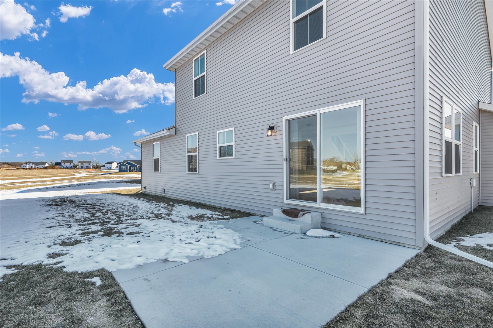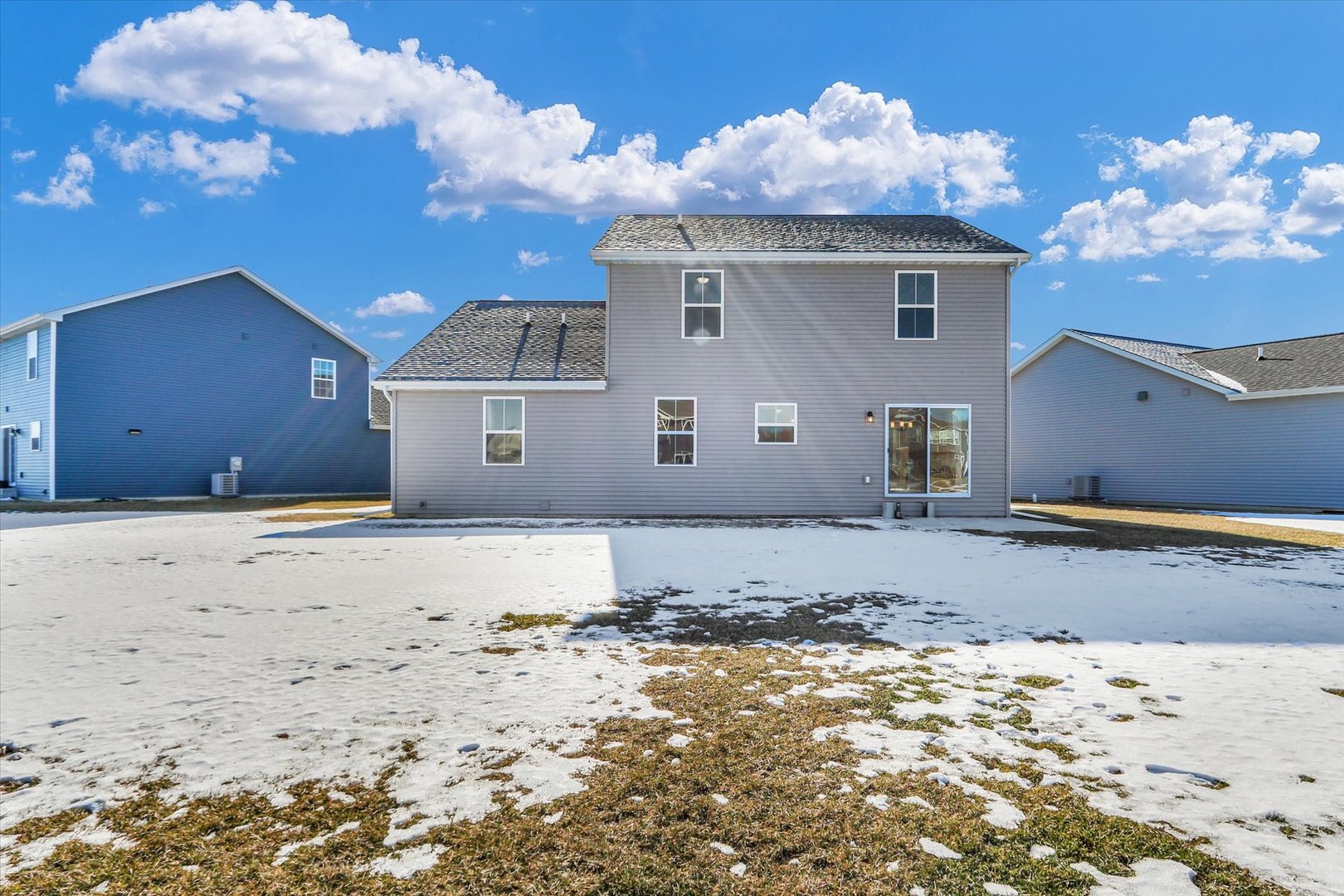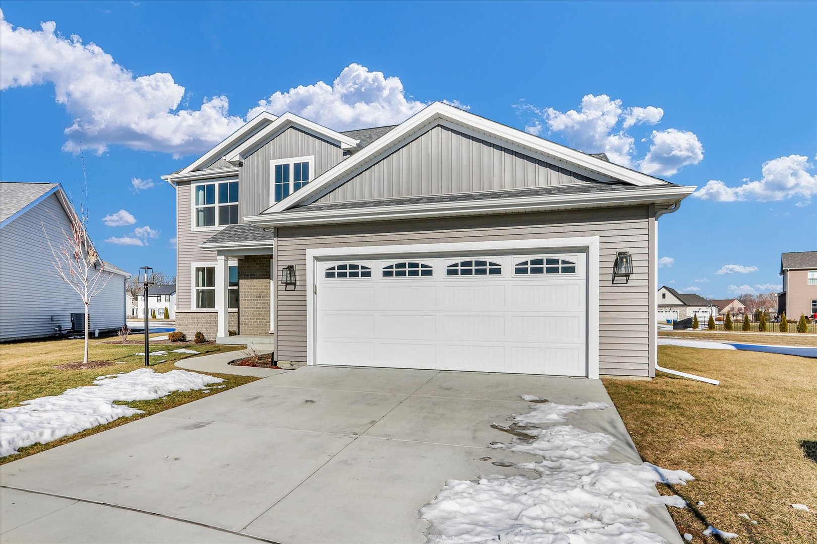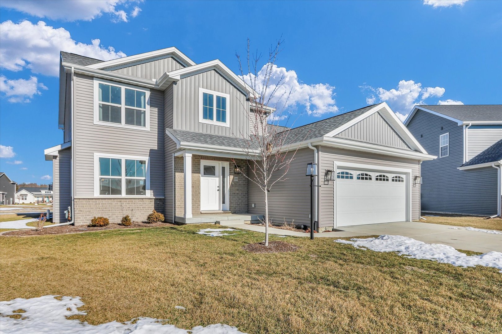 Move right in to this light and bright, spacious home in Sage Meadows! Located on a cul-de-sac, this open concept offers hardwood flooring in the main living area and an abundance of natural light. The kitchen includes an eat-at island, stainless steel appliances, subway tiled backsplash and quartz counter tops. Dining area with sliding glass doors walks out to the concrete patio overlooking the commons area and wellness trail. Desired first-floor primary bedroom with dual walk-in closets. Primary bathroom features a freestanding tub, double sink vanity, linen closet and separate shower. Second floor includes 3 spacious bedrooms and a full bathroom also with dual sink vanity. Mud/laundry room adjacent to the 2-car garage and includes a bench & lockers and additional cabinetry above the included, like new, washer and dryer. Basement is full, unfinished, and plumbed for future bathroom. This home, lived in for just over one year, already boasts numerous upgrades compared to the new builds nearby. Conveniently located next to I-72, Lodge Park, Kirby Medical Center