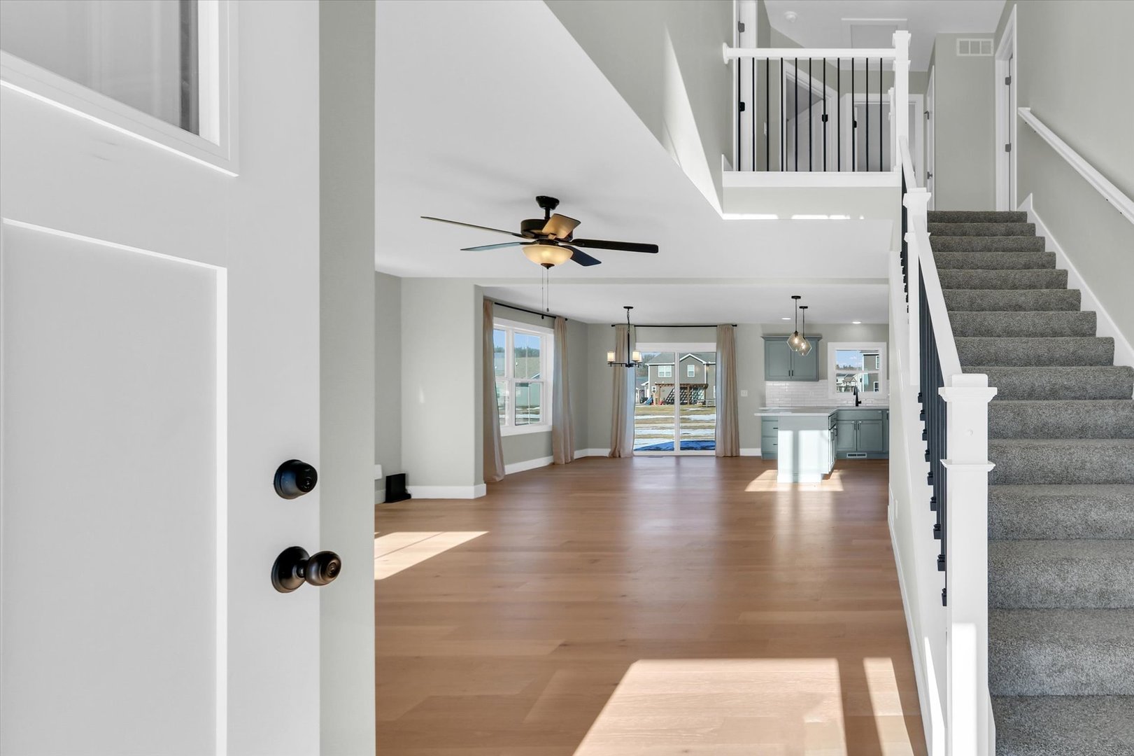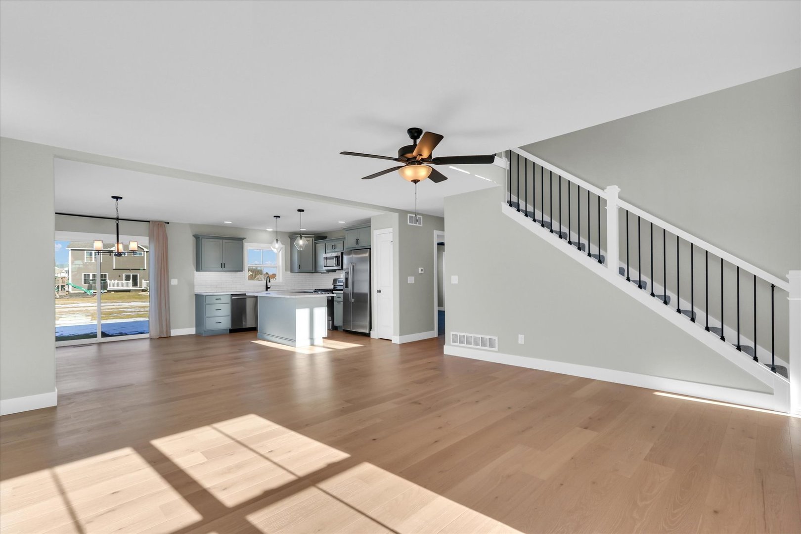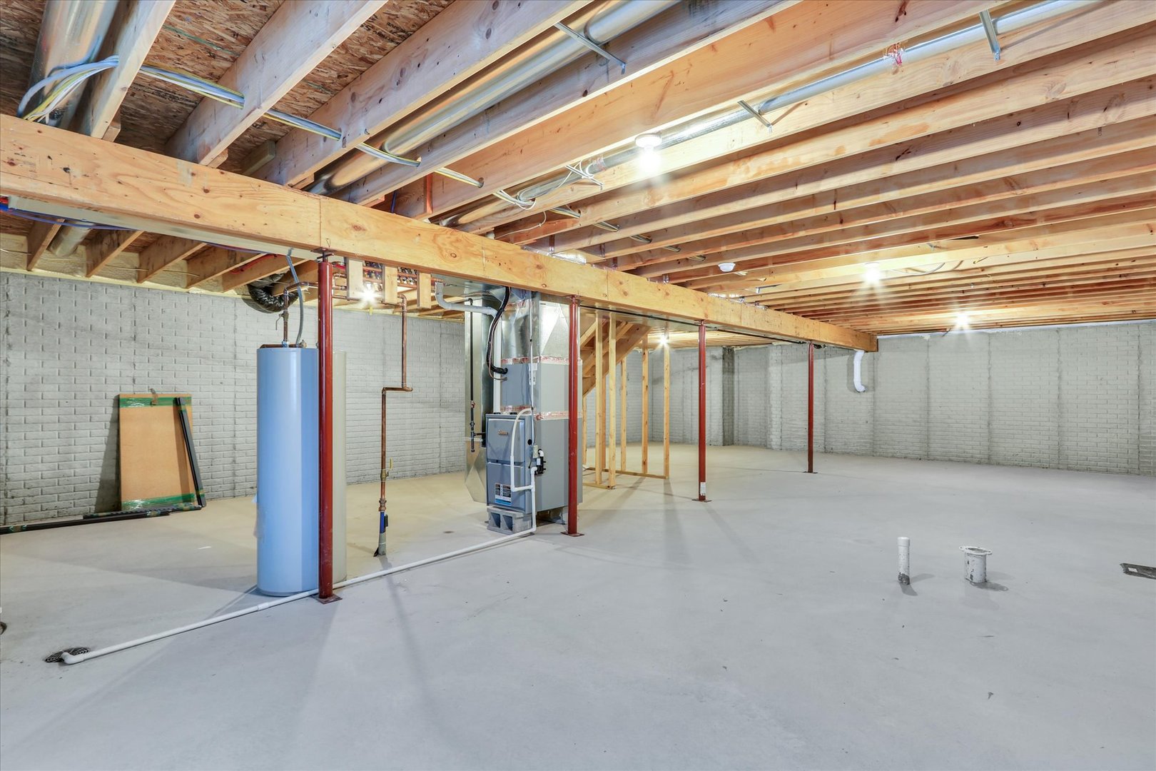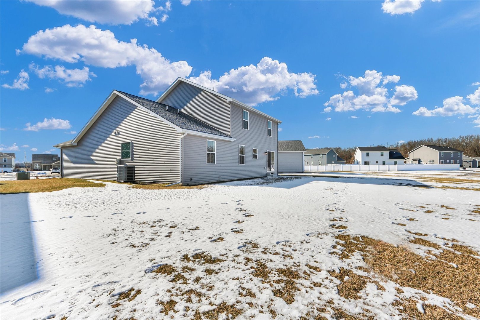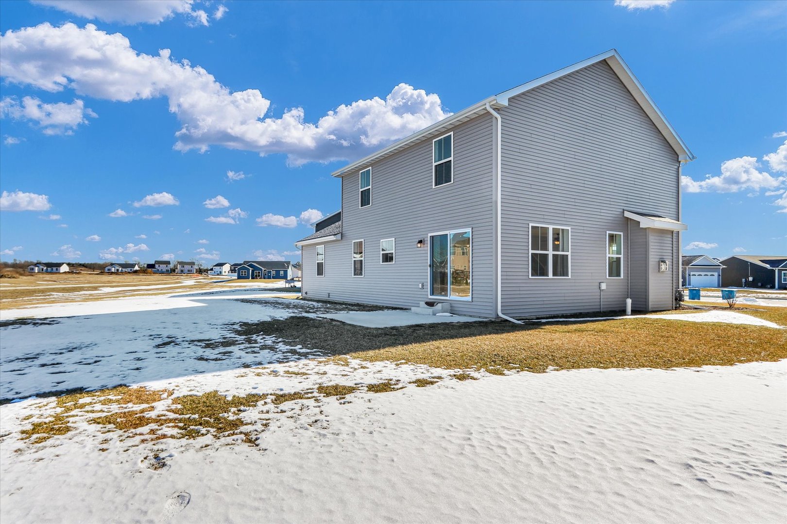 Move right in to this light and bright, spacious home in Sage Meadows! Located on a cul-de-sac, this open concept offers hardwood flooring in the main living area and an abundance of natural light. The kitchen includes an eat-at island, stainless steel appliances, subway tiled backsplash and quartz counter tops. Dining area with sliding glass doors walks out to the concrete patio overlooking the commons area and wellness trail. Desired first-floor primary bedroom with dual walk-in closets. Primary bathroom features a freestanding tub, double sink vanity, linen closet and separate shower. Second floor includes 3 spacious bedrooms and a full bathroom also with dual sink vanity. Mud/laundry room adjacent to the 2-car garage and includes a bench & lockers and additional cabinetry above the included, like new, washer and dryer. Basement is full, unfinished, and plumbed for future bathroom. This home, lived in for just over one year, already boasts numerous upgrades compared to the new builds nearby. Conveniently located next to I-72, Lodge Park, Kirby Medical Center