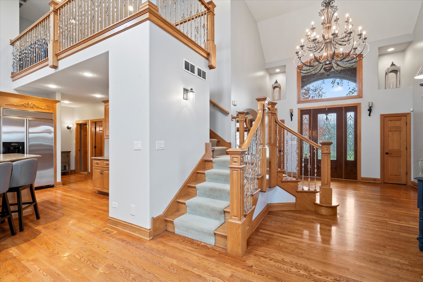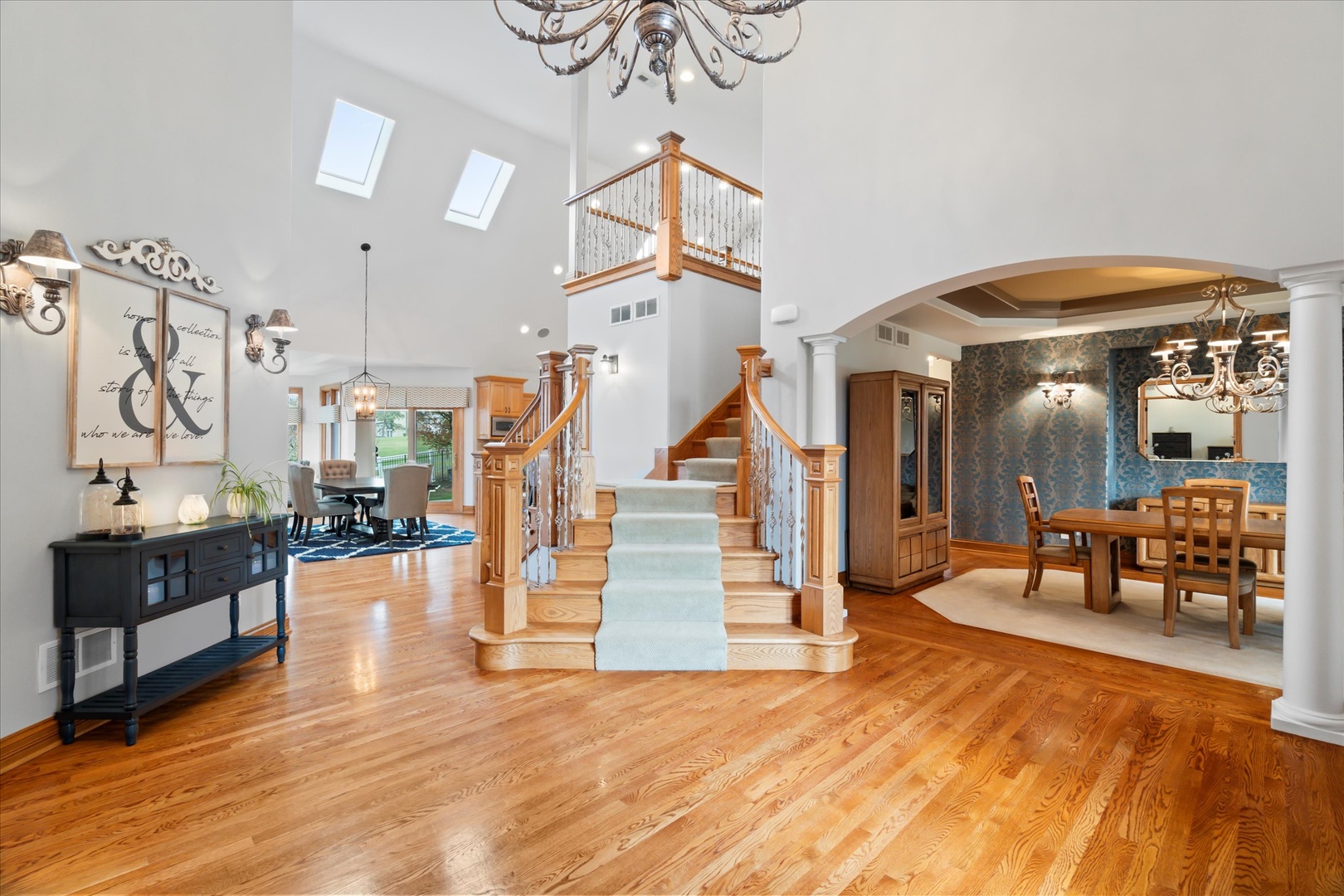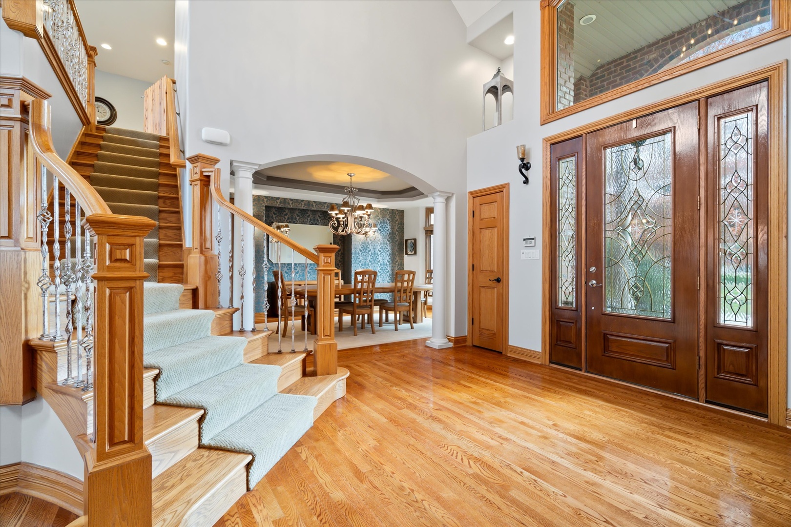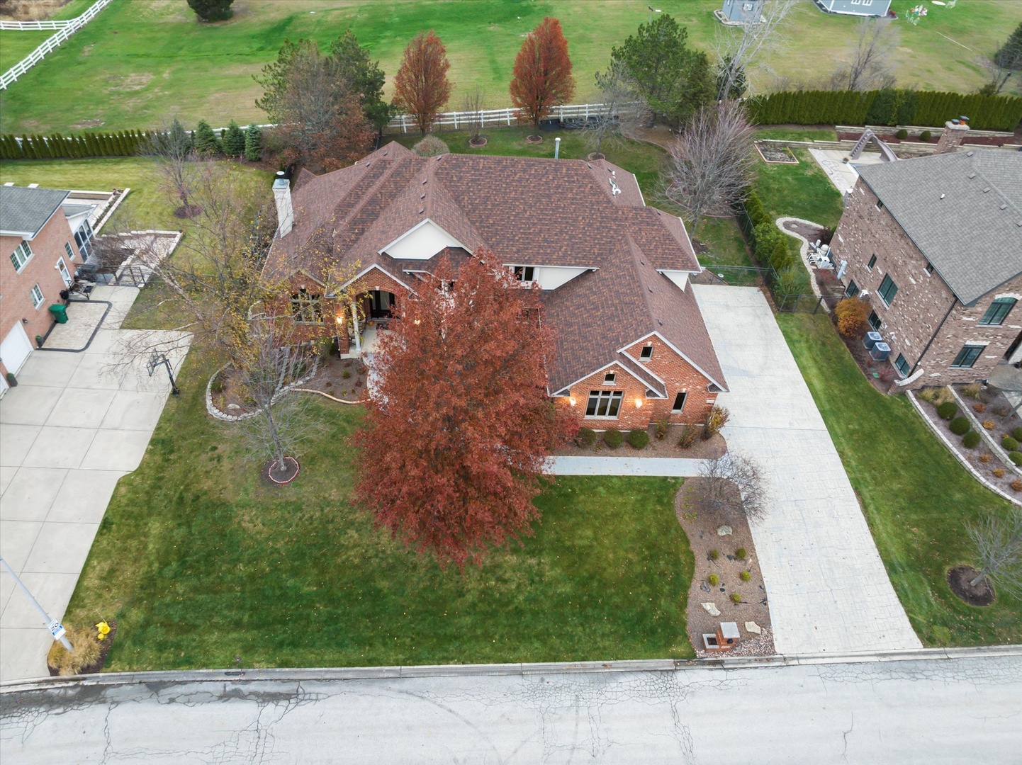 Nestled in a private upscale community, this stunning CUSTOM home exudes sophistication, designer finishes, functionality and luxury living. Exceptional architecture and superior craftsmanship that is sure to wow you at every turn. Upon entering the home, you are greeted by a grand foyer that sets the tone for the rest of this exquisite home. The split staircase, adorned by wrought iron railings, is a true focal point of this space. Open floor plan accented by soaring ceilings and a highly functional design. Decorated in stylish, neutral hues and gleaming hardwood flooring. Formal dining room perfect for entertaining on a grand scale with stylish wallpaper and tray ceilings. Gourmet kitchen has custom cabinetry, granite countertops, a large island/breakfast bar seating, a walk-in pantry and spacious eating area. Comfortable family room with beamed ceiling and a beautiful, corner fireplace. Spectacular sunroom off of the kitchen and family room with tons of windows that allows for tons of sunlight. Regal FIRST FLOOR MASTER SUITE with barnwood accent wall. Private master bath with dual vanity, soaking tub and separate shower. As you go up to the second level you're greeted by a sprawling catwalk/loft area that overlooks the family room and kitchen area. On the second level there are spacious bedrooms with ample closet space and a massive unfinished attic/bonus space that you can turn into your dream space. Finished WALKOUT lower level offers radiant heat, a wet bar, hot tub and room for recreation, gaming, storage, exercise and so much more. Picturesque grounds with mature landscaping and fenced yard for privacy. Paver driveway and expansive patio. 3+ car heated garage. Conveniently located near shopping, dining, Metra, expressway access, world renowned golf courses, parks, schools and thousands of acres of forest preserves. ROOF and Humidifier, Microwave and Dishwasher (2022) Fencing (2020). WATCH THE FULL LENGTH VIDEO!