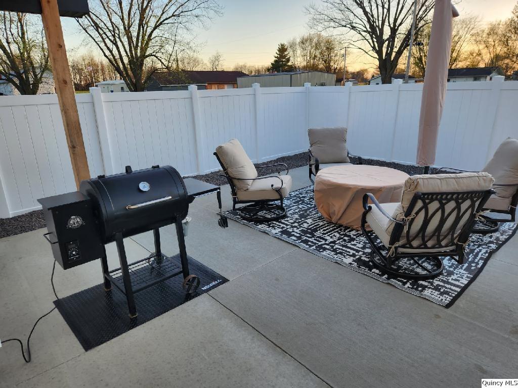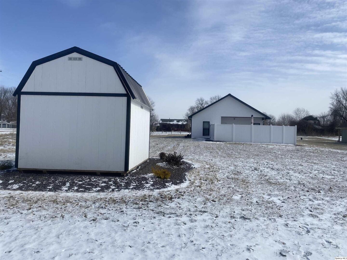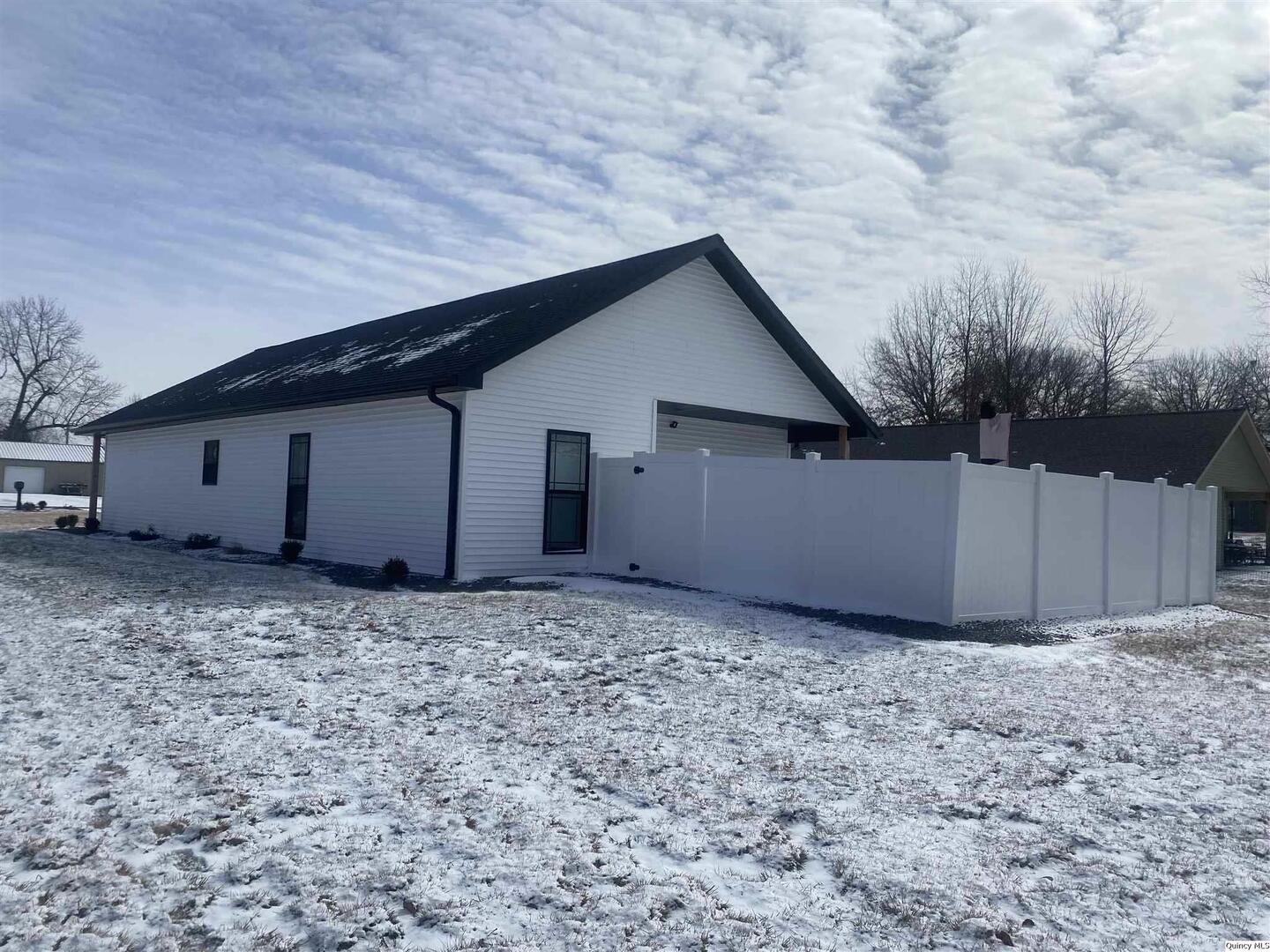 Located just minutes from Quincy, this meticulously maintained, move in ready Charming new construction built in 2023 offers the perfect blend of modern amenities and small-town charm. The interior features 9 ft ceilings, a walk-in pantry, a convenient mud room directly off of the garage, a high efficiency HVAC. The master suite has a walk-in closet. Open floor plan kitchen with stainless steel appliances that convey. The exterior boasts covered front and back porches, new landscaping, a large patio surrounded by a privacy fence and a 10x12 outbuilding on a concrete slab for extra storage. Legal description and parcel are part of a split subject to change. other room listed is mudroom. Washer and dryer do not convey. Utilities: Ameren 12mth average-$78 Nicor Gas: 12mth average $31