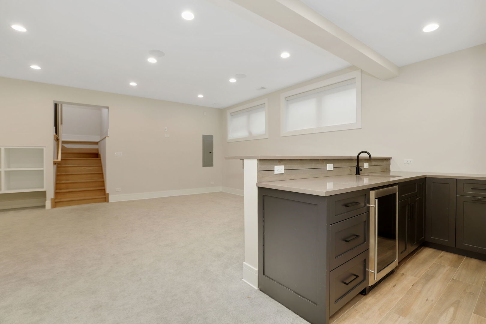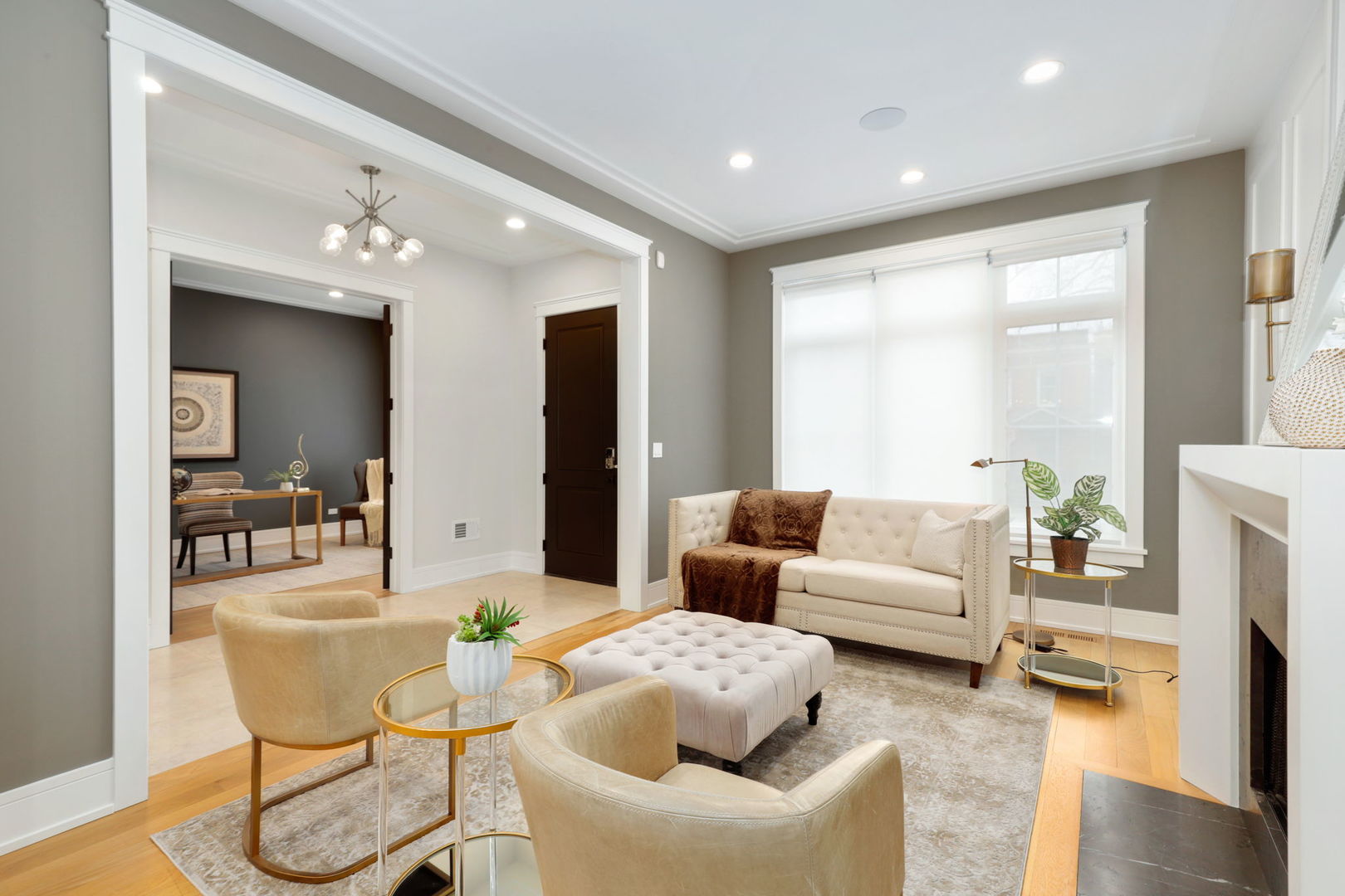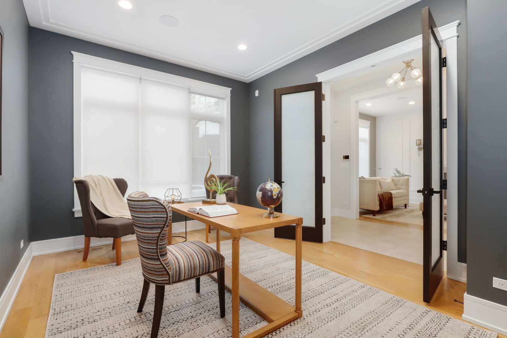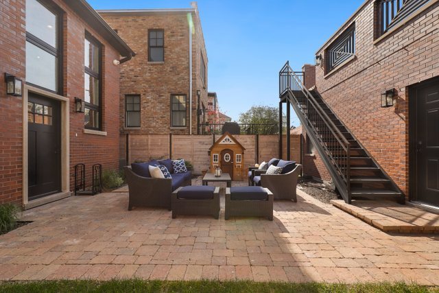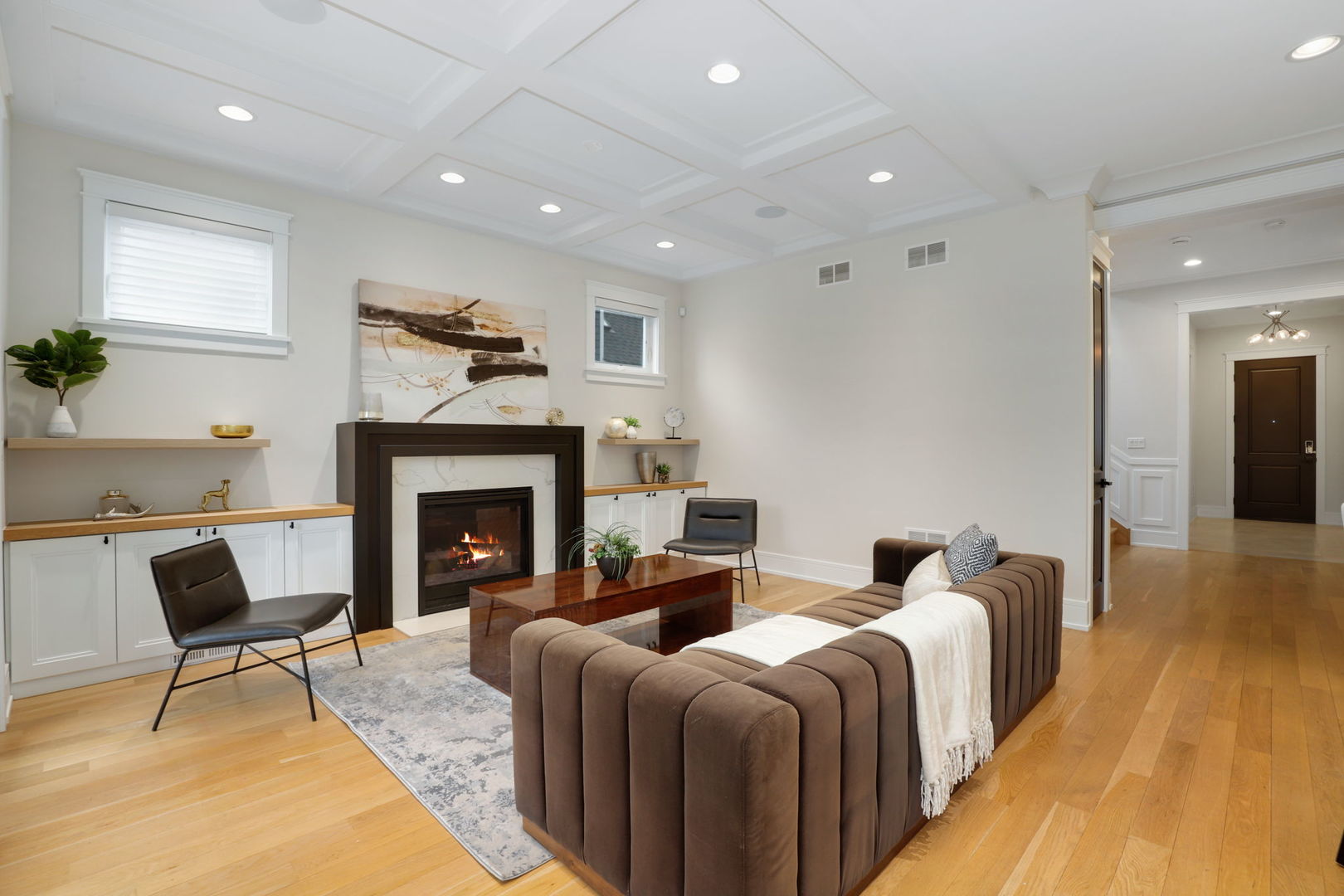 Welcome to this stunning, modern, and elegant all-brick single-family home, perfectly situated on a picturesque tree-lined street. Located on an extra-wide 38' corner lot in the esteemed Bell School District, this 6-bedroom, 6-bath residence showcases exceptional attention to detail from the moment you step inside. Designed for both comfort and entertaining, the spacious and open floor plan features custom millwork, coffered ceilings, and an abundance of natural light. The gracious foyer leads to a sophisticated home office and formal dining area, setting the tone for refined living. The gourmet chef's kitchen is a true showpiece, boasting custom cabinetry, quartz countertops, a large island, high-end Wolf appliances, a beautiful backsplash, a spacious pantry, and a wet bar with a wine chiller. This space seamlessly flows into the expansive family complete with a fireplace with a mantel, and built-in cabinetry. The luxurious primary suite is a private retreat, featuring a tray ceiling, dual walk-in closets, and a spa-like bathroom with a soaking tub, rainfall shower, heated floors, a double vanity, and a water closet. Three additional generously sized bedrooms upstairs offer ample closet space, along with the convenience of a large laundry room with a side-by-side washer and dryer. The lower level is designed for ultimate entertainment, featuring a sprawling recreation/family room with 9' ceilings, heated floors, a wet bar, and a walk-in wine room. Two additional bedrooms, a second laundry area, and a private entrance make this level perfect for an in-law suite or au pair living arrangement. Outdoor living is equally impressive, with a terrace off the family room, a beautifully landscaped backyard with pavers, and the potential to expand outdoor space by completing a rooftop deck above the 2.5-car garage. A motorized gate provides two access points for seamless parking and storage. Enjoy all the conveniences of Roscoe Village, North Center, Lakeview and just steps from top-rated restaurants, shops, Trader Joe's, coffee spots, and public transportation, this home offers the best of city living.