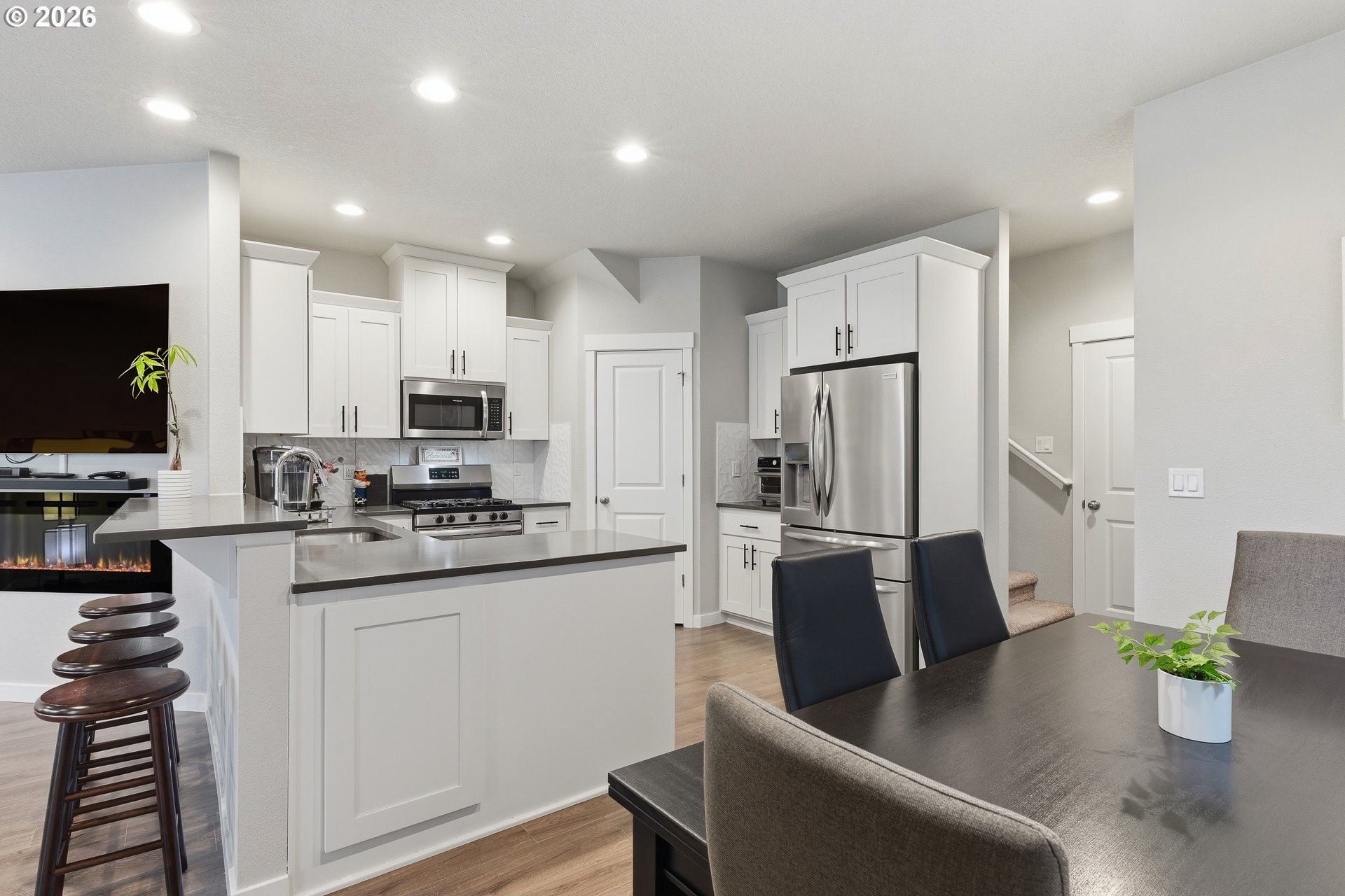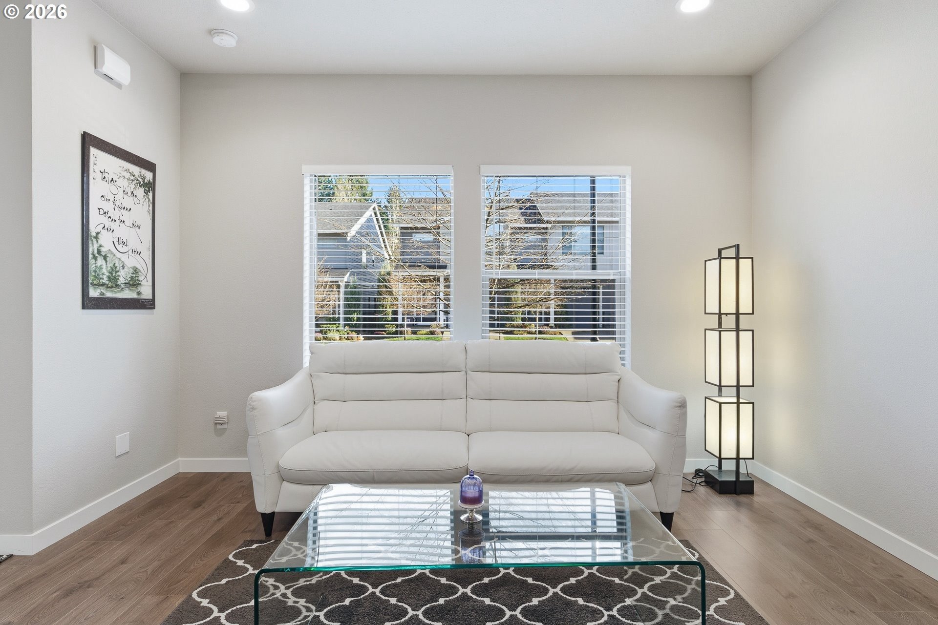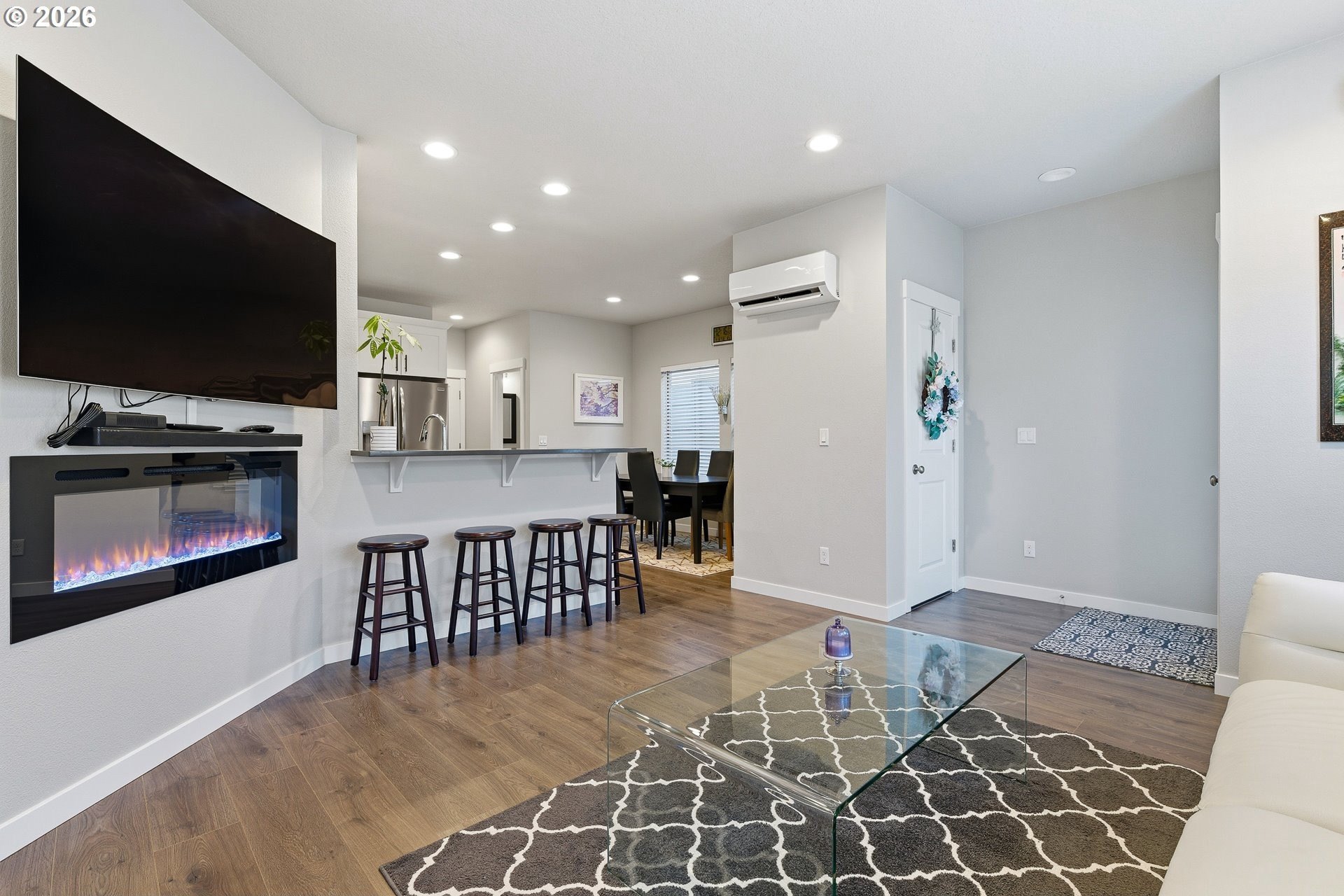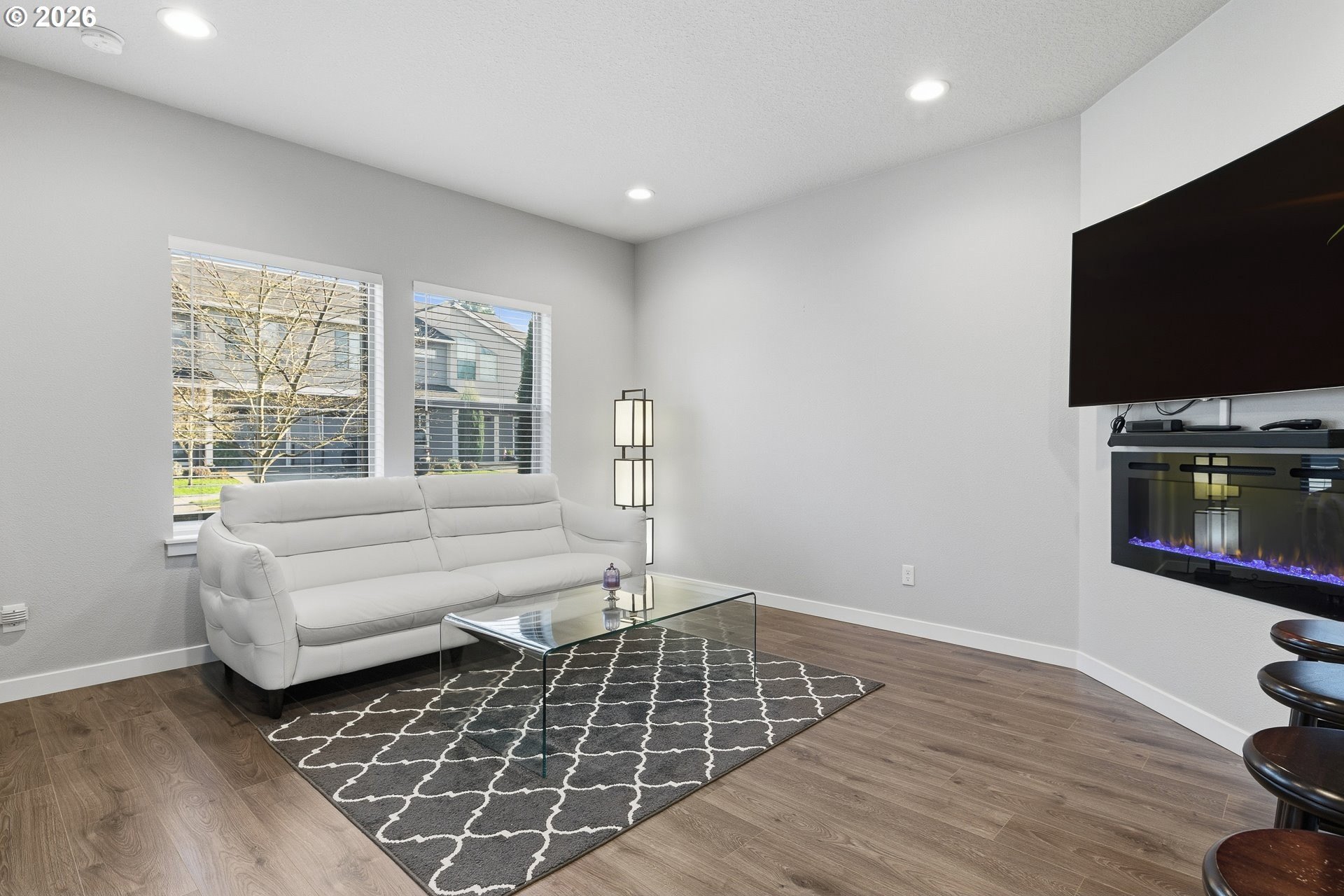 Beautifully maintained 3-bedroom, 2.5-bath townhome, offering 1,547 sq ft of modern, comfortable living. Built in 2020, this one-owner home features an open-concept main level with luxury laminate flooring, recessed lighting, and a bright, inviting layout. The stylish kitchen includes quartz countertops, white cabinetry, stainless steel appliances, tile backsplash, a walk-in pantry, and an eating bar that flows seamlessly into the dining and living areas. The living room is highlighted by a wall-mounted electric fireplace and large TV space. Upstairs, the spacious primary suite offers a walk-in closet and private bath with double vanity and walk-in shower. Two additional bedrooms, a full bath, and a dedicated laundry room complete the upper level. A flex room/office space provides the perfect space for working from home or hobbies. Additional features include ductless mini-split heating & cooling, 2-car garage, and a covered front porch. Enjoy low maintenance living with nearby community park, walking trails, shopping and dining.