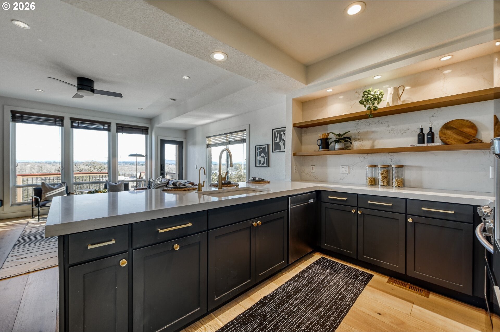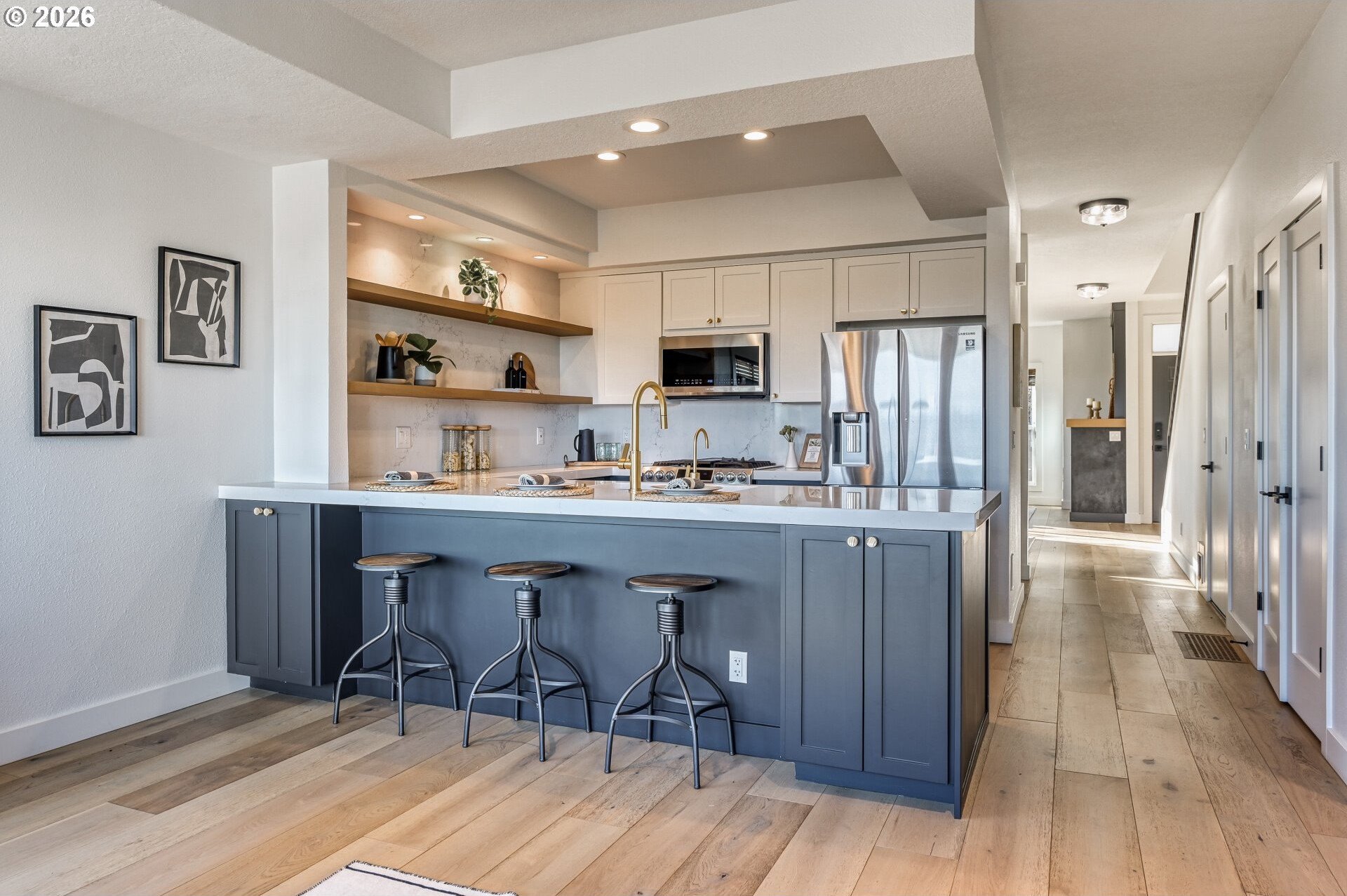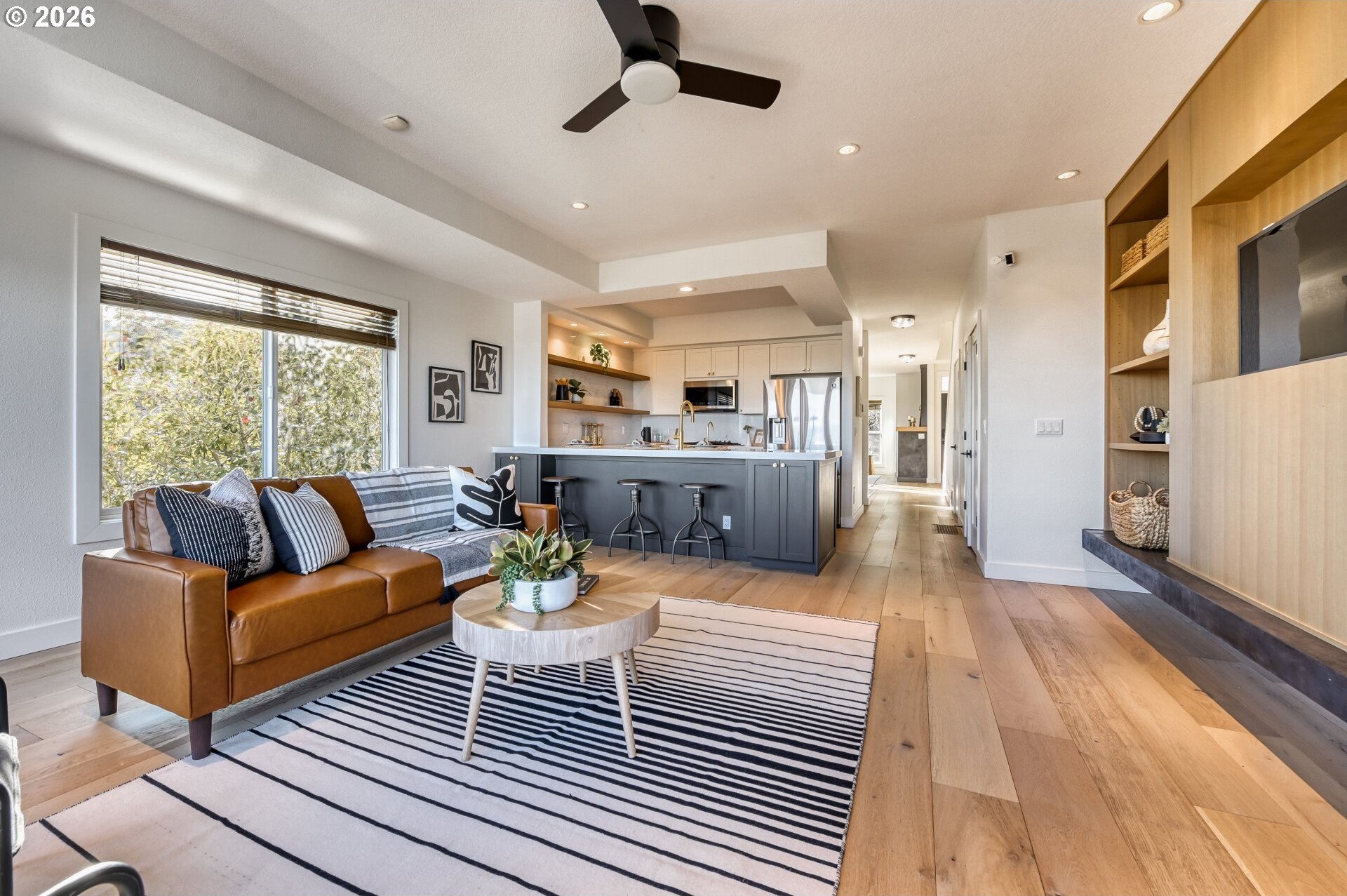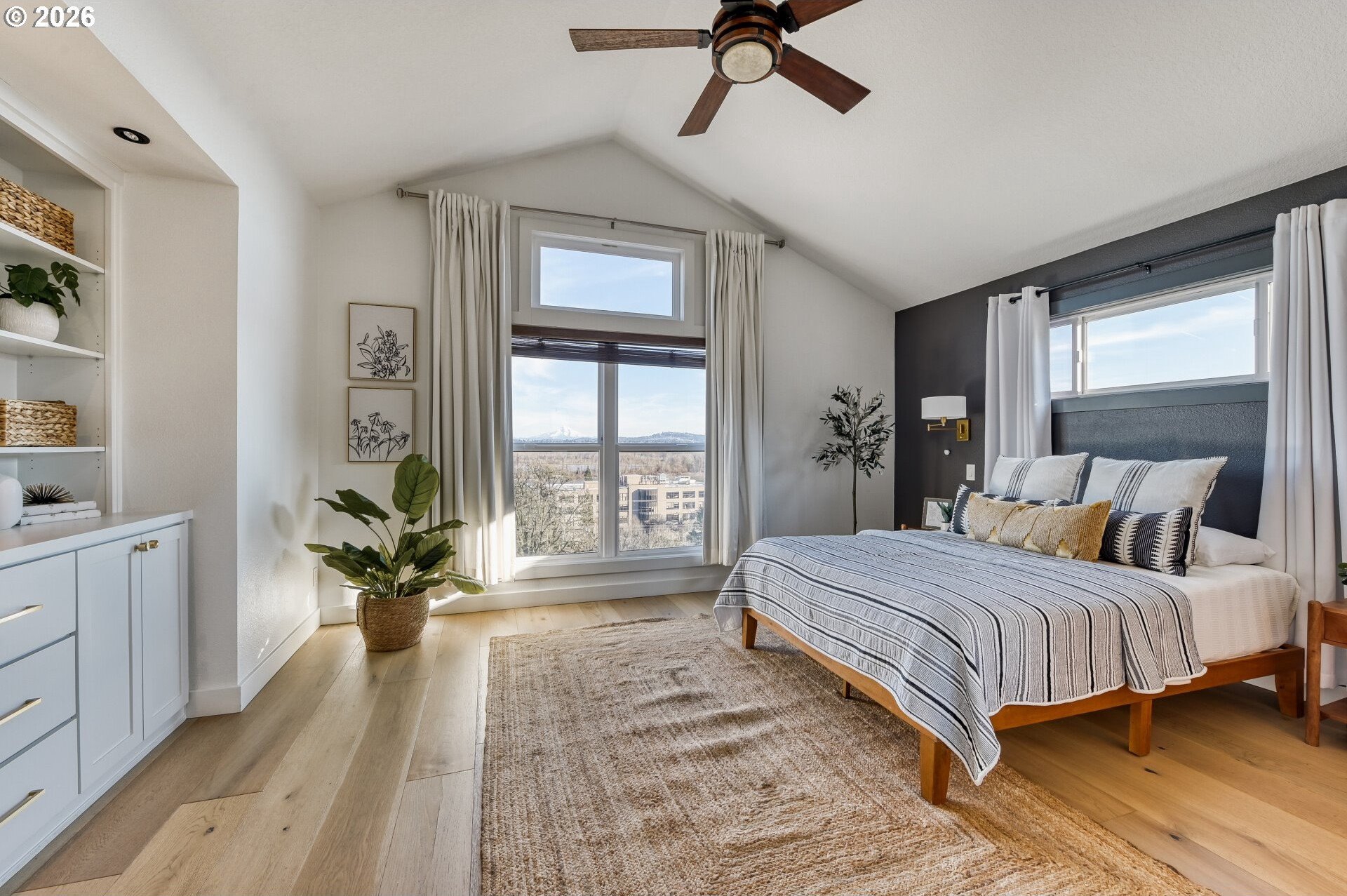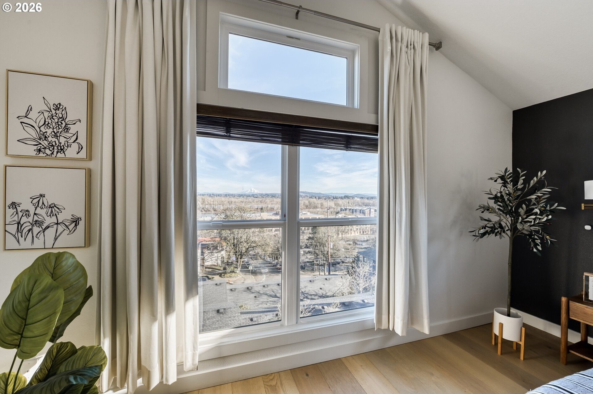 Hidden Luxury Gem in Desirable John's Landing with Custom High-End Finishes, at an Unbeatable Price! 3 BD + 2.5 BA + 2-car oversized tandem garage (700+sqft). This end-unit luxury remodeled townhome showcases many custom details, while embracing breathtaking views of Mt Hood and the River! Incredible value for this home sitting high on a quiet street, with large windows facing East & South (natural light!), and lots to love: Gas fireplaces perfect for winter evenings, exquisite built-in cabinetry throughout, wide wood plank flooring... The kitchen is any chef's dream: 3cm quartz slab countertops and backsplash, floating wood shelves, 2-tone shake custom cabinetry with slow closing doors and drawers, gas stove, well-appointed pantry with French doors, breakfast bar and view of the mountain. Appreciate the custom remodel details in the family room with a floating bench, flooded with natural light and open to a private deck. Upstairs, the primary suite, with its vaulted ceilings, provides unobstructed views of the mountains. With its French doors, double walk-in closets, this suite captures quiet luxury that extends into its ensuite bathroom with the comfort of heated floors and a steam shower. The other 2 bedrooms offer their own fine details: large closets, skylight, vaulted ceilings... The hallway bathroom is equally updated with its heated floors and oversized shower. Incredibly oversized garage: extra wide with storage galore, epoxy floors, EV charger, and extra deep for a shop/workout area (with territorial views!!!). Finally, there is an extra deep, extra wide storage room with concrete floors under the home: "mancave", shop, bike storage? So many options! Low maintenance fenced yard. Central vac, A/C, air purifier... Exceptional home in lovely John's Landing: Willamette Park (26 acres: boat docks and ramps, soccer field, tennis courts, playground, trails, dog off-leash park...), shops, restaurants (Elephant's Deli), close to downtown, OHSU... Fantastic value! Must see!
