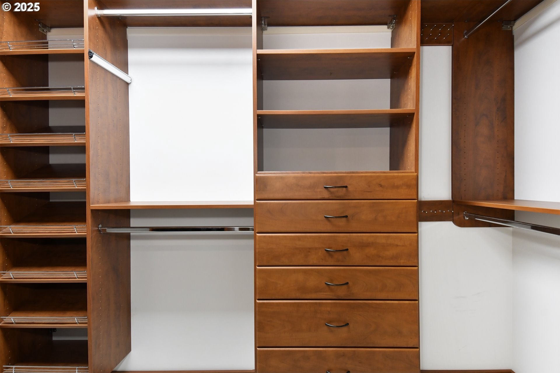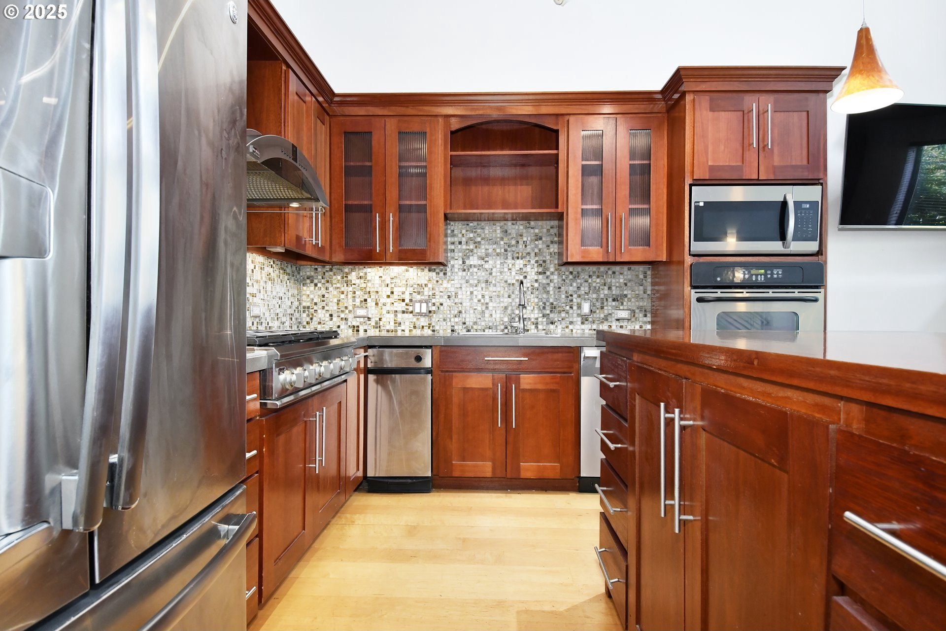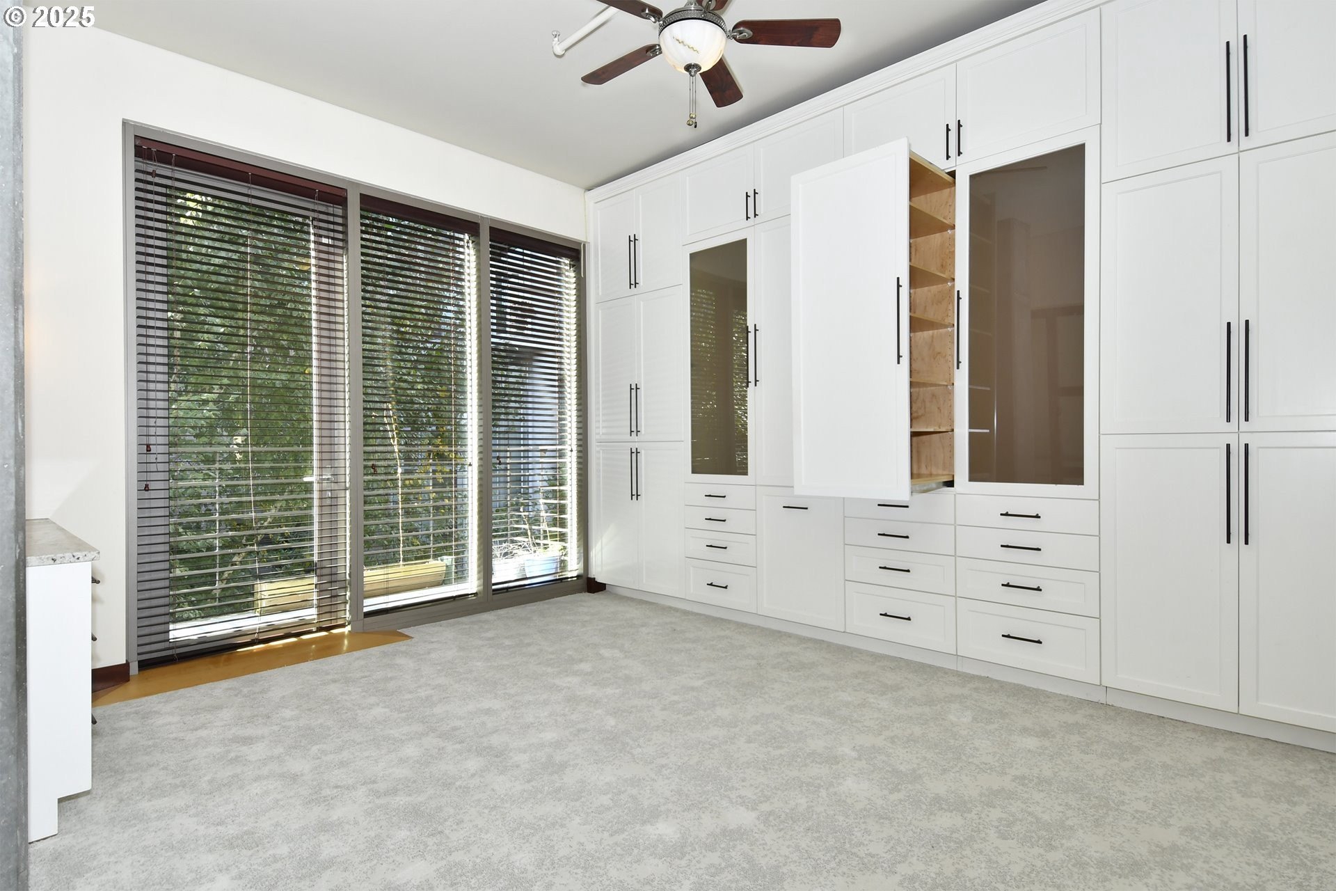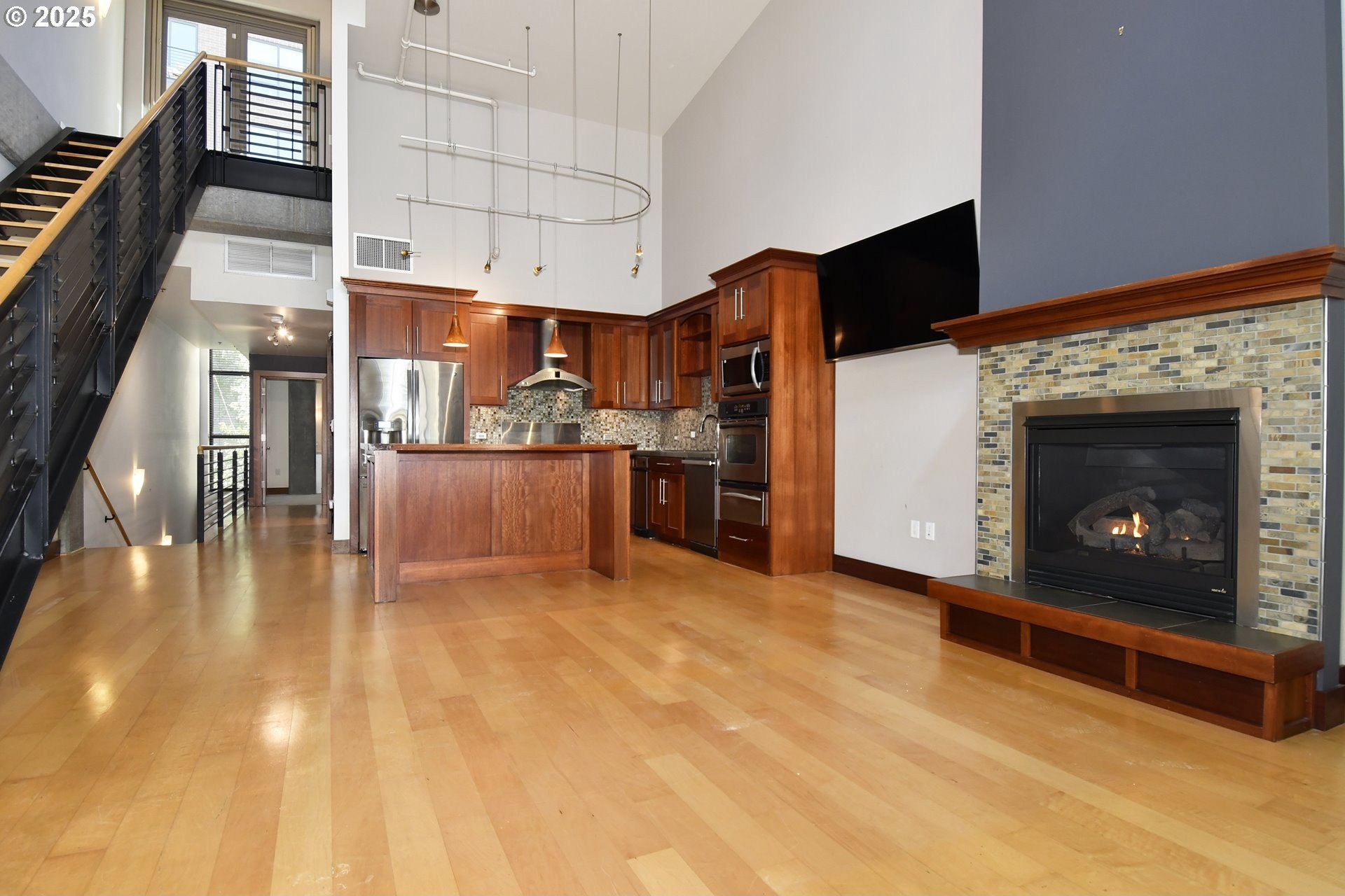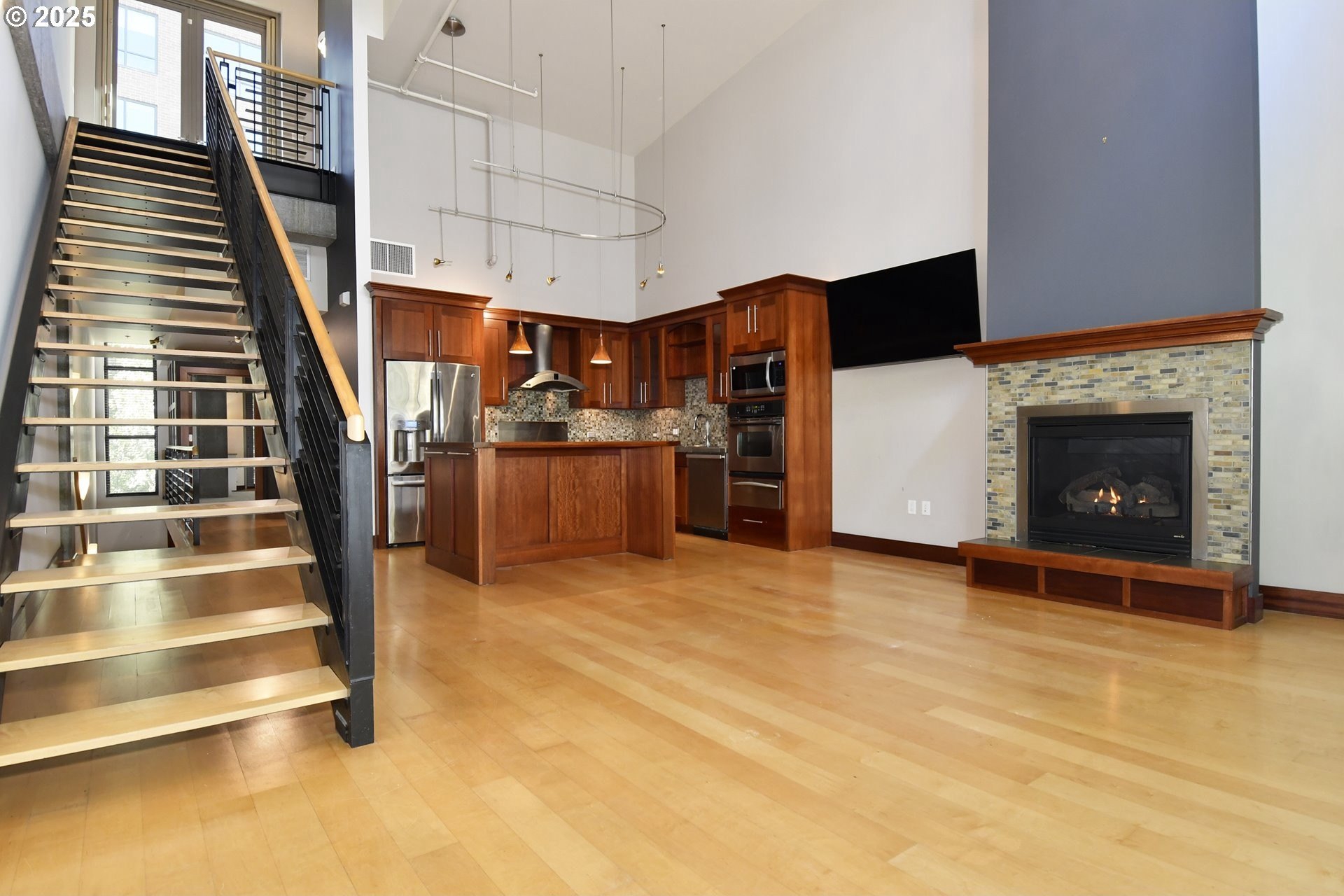2 Bedrooms, 2 Full Baths plus loft space and private rooftop terrace. North Pearl living at its finest! Imagine strolling through a peacefully treed courtyards to get to your own front door in downtown Portland! Set between the bakery and jeweler on one end of the street with Jamison Park at the other. The first floor flex space can easily be used as a spacious second bedroom suite, but is designed with the flexibility of an in-home business or work from home space. One wall is floor to ceiling bookcases and cabinets with a rolling ladder for added style and efficiency. Main floor also includes a full bathroom, storage and laundry room with workspace countertop and cabinets. Modern finishes so tastefully combined with the timeless look and luxury of mahogany and cherry. Cathedral ceilings and pendant lighting. Gleaming wood floors throughout. Floor to ceiling windows. Two walk-out patios plus your own private 260sf rooftop terrace (not included in the sq ft). Primary bedroom has one wall of custom cedar-lined built-in’s plus a desk or vanity, along with another patio. Main full bathroom offers jetted tub, large walk-in shower, and state-of-the-art commode. Pocket door leads to a large, custom walk-in closet with dressing room. Not only can you enjoy the beauty from your three outdoor patios but indoors the large living room has floor to ceiling windows with a gas fireplace. The living room effortlessly adjoins the gourmet island kitchen & eating bar, making both the outdoors and indoors an entertainer’s dream! The building association includes concierge service. One deeded storage area and parking space, in the secured parking garage also included. Don’t miss this amazing opportunity to live in the heart of the Pearl.