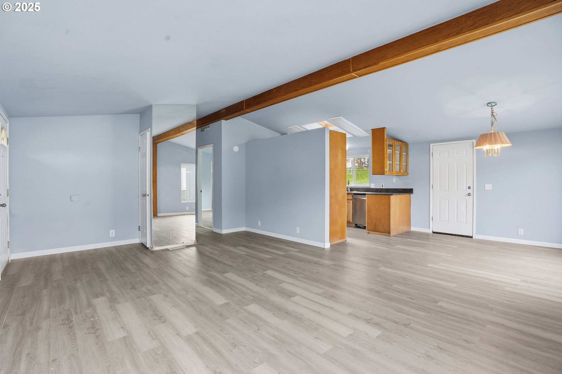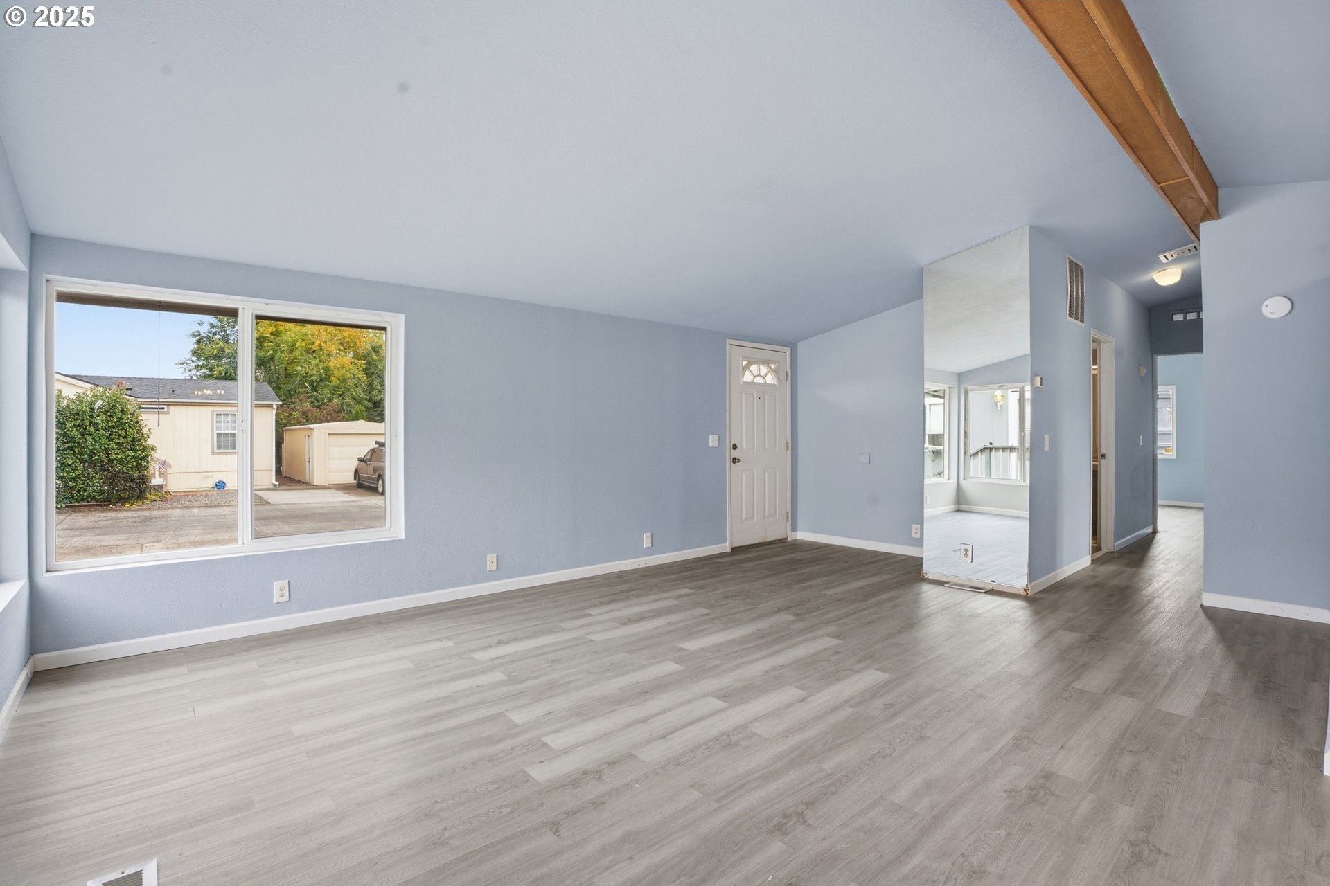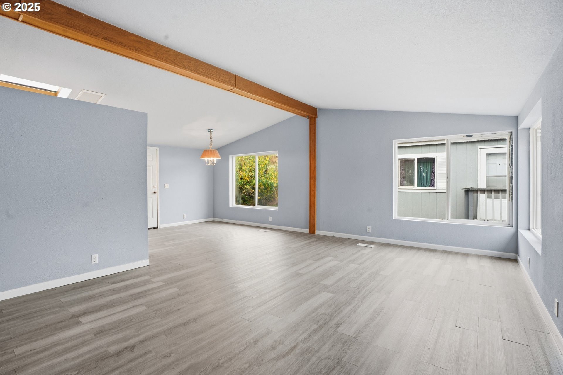 Airy, open-concept home in ALL AGES Park, in St. Helens, Oregon. OPEN HOUSE SUNDAY, NOV. 9, FROM NOON - 2:00PM. 2 bedrooms, 2 full baths, 1100 sf. Huge 100 x 40 lot. Vaulted ceiling. New vinyl plank flooring throughout, new interior paint throughout. Huge primary bedroom is 16" x 11.5", with ensuite bathroom and walk in closet. Kitchen has new SS stove and recent SS dishwasher. Double pane vinyl windows. Back deck and large, grassy (sloped) back yard. Single-car garage with garage door opener, and cement parking area for more two cars. Budget-friendly space rent of $575 a month. RV parking is available from the park for $25 a month. Park allows max two pets, with total weight of both pets together capped at 100 pounds. Please note, some dog breeds are prohibited.