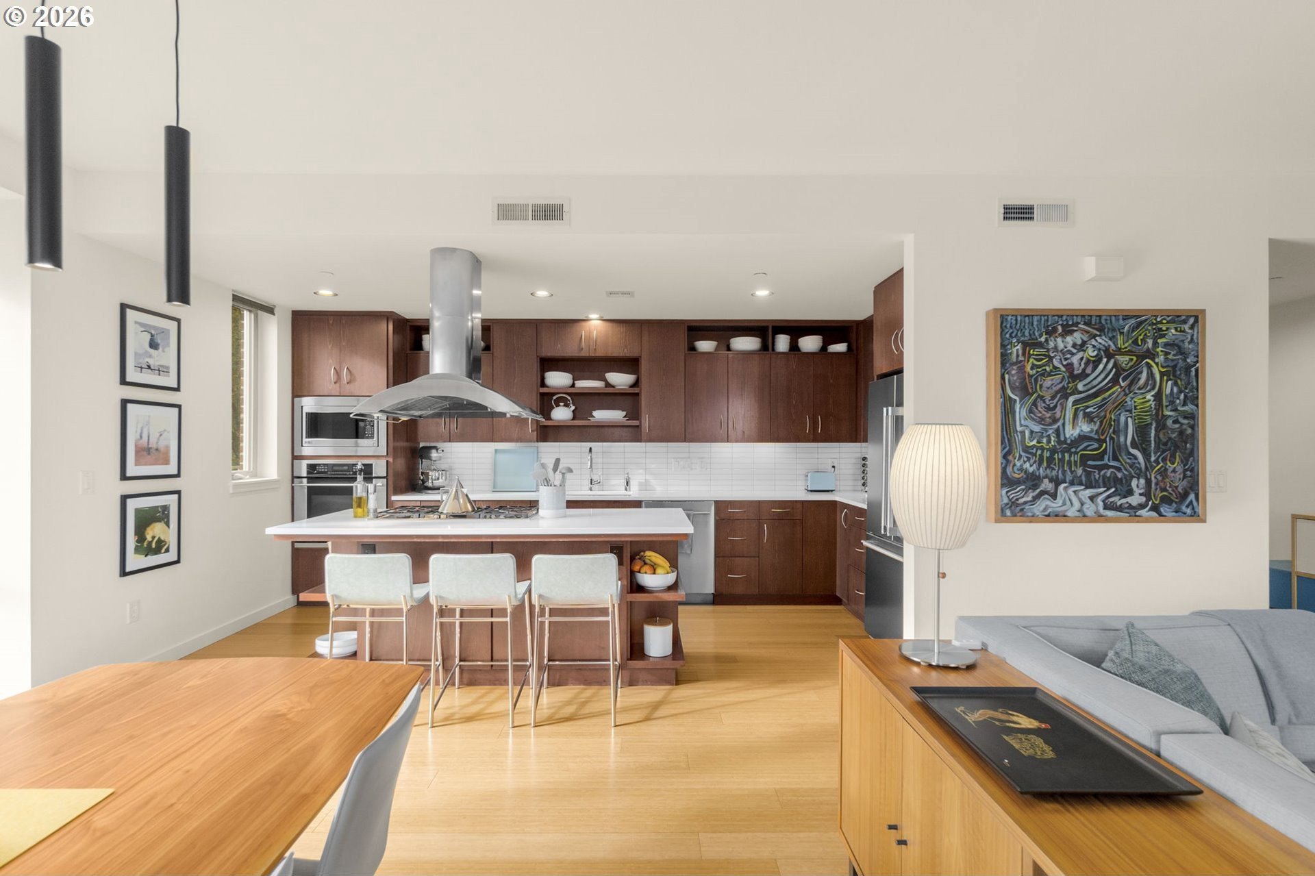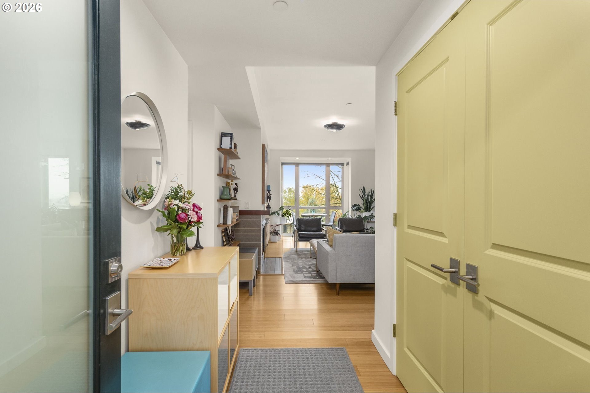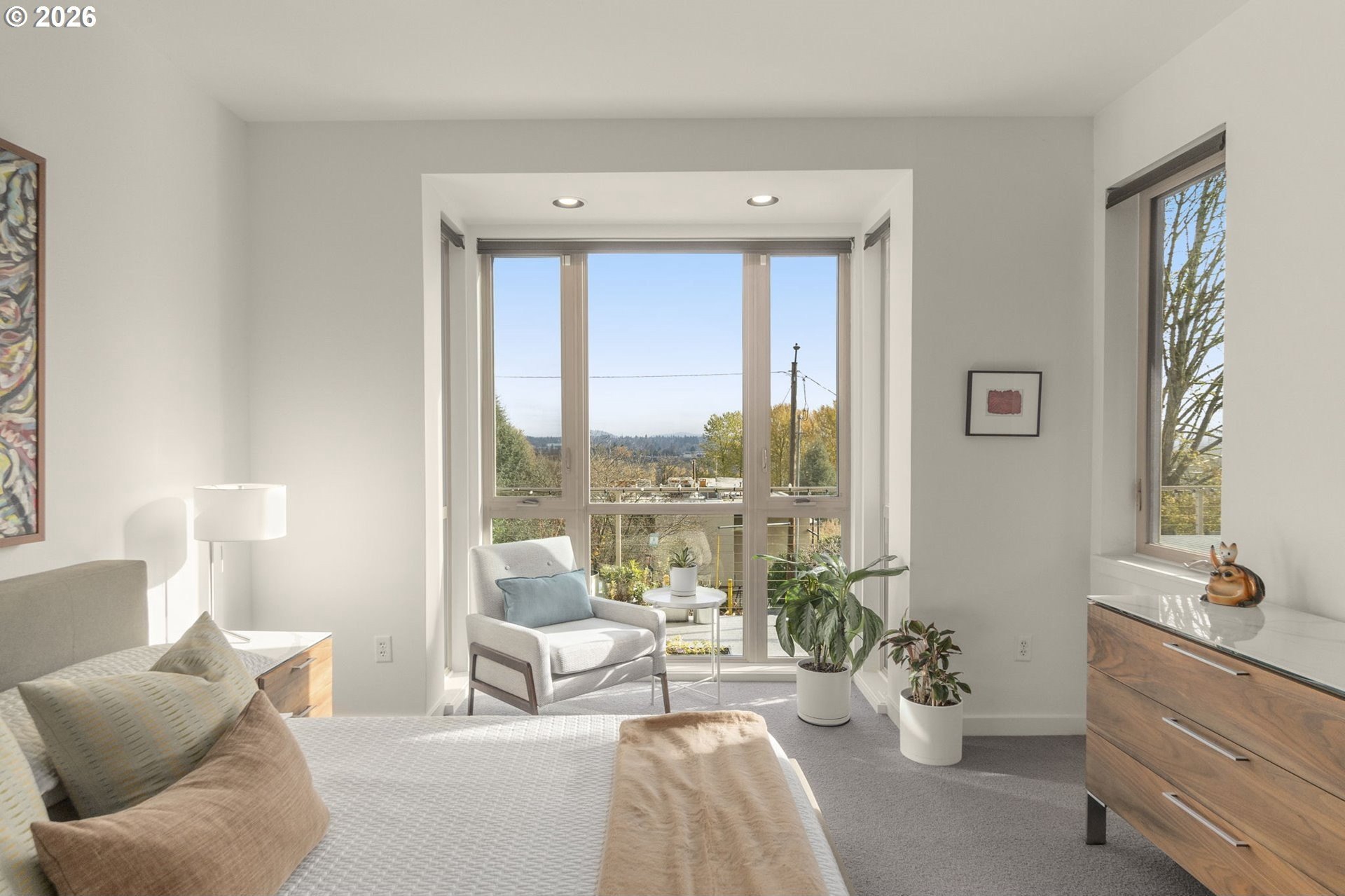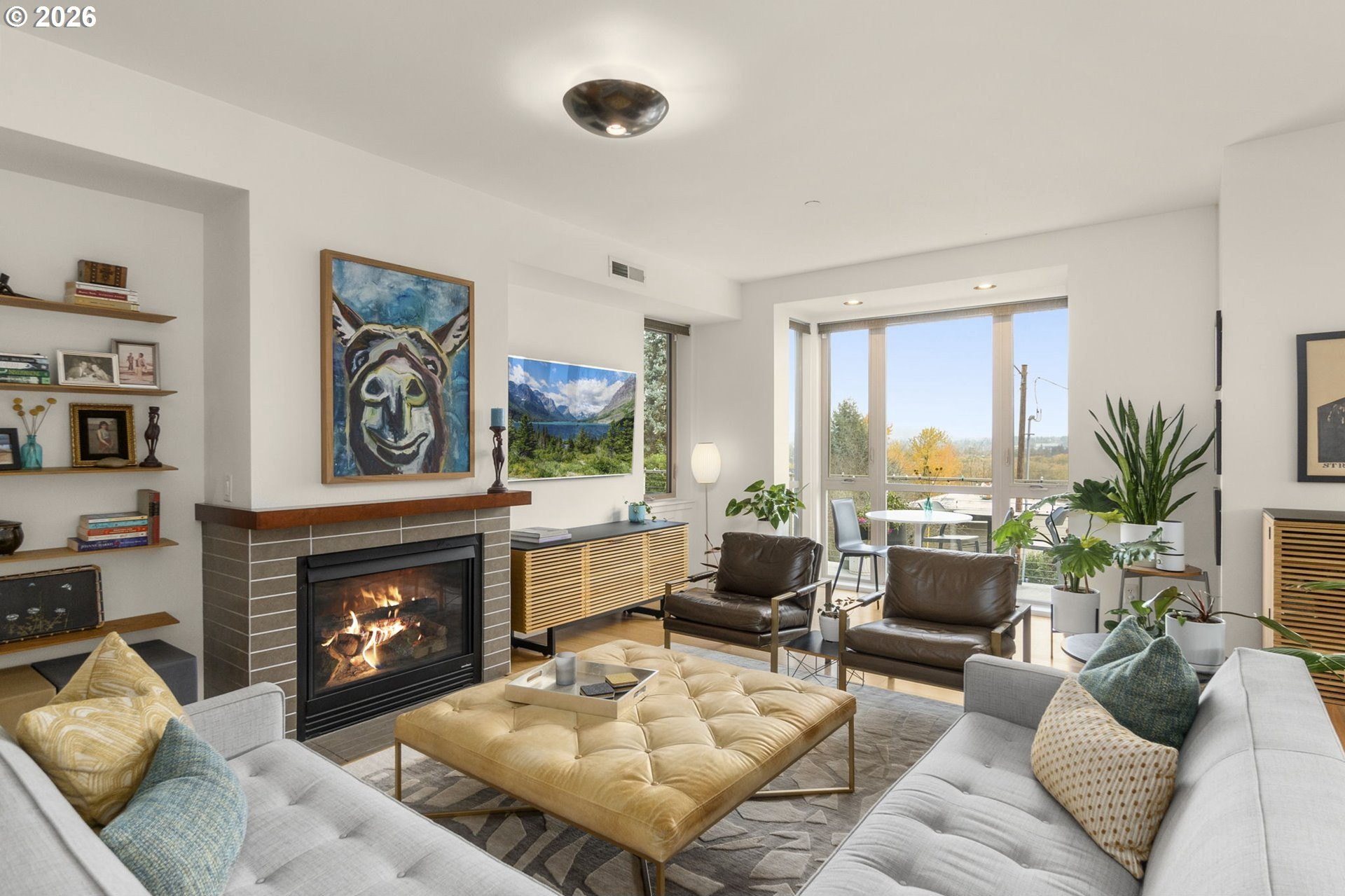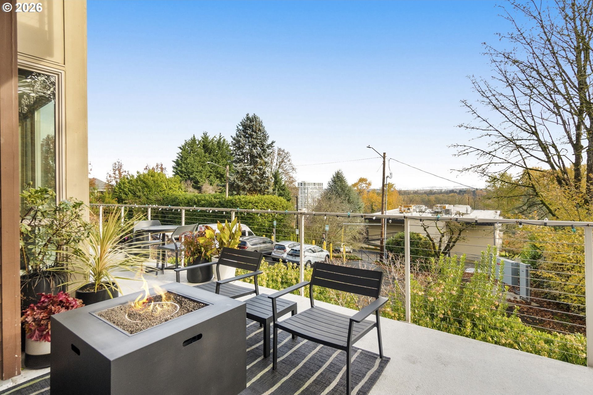 Enjoy carefree, convenient living at the boutique Corbett-Bancroft Condominiums. This home features a spectacular 500 square foot terrace with beautiful views to the east and south, including the Willamette River and Cascade Range. Spacious great room boasts high ceilings, bamboo floors, gas fireplace and terrace access. Large open kitchen with stainless-steel appliances and island. Large primary suite includes segmented ensuite bath and walk-in closet. Flexible second bedroom or office opens to terrace. Over $100,000 in upgrades since seller's ownership including programmable electric window shades (2022), fresh paint throughout (2022), new light fixtures (2022), custom closet systems throughout (2022). In addition, kitchen and bathroom upgrades including Quartz countertops and new appliances (2022-2023), new HVAC with SkyportHome programmable controls (2024), new water heater (2025) and more! Separate laundry room. Secure entry into beautiful courtyard. Extra storage unit in garage with assigned tandem parking for two cars (spaces 18 and 30) with infrastructure in place for electrical vehicle charger. Monthly HOA fee includes insurance, exterior landscaping and maintenance, water, sewer, trash, cable, internet and reserves. Convenient location near John's Landing and the South Waterfront, two blocks from bus lines, one mile to downtown. Easy freeway access.