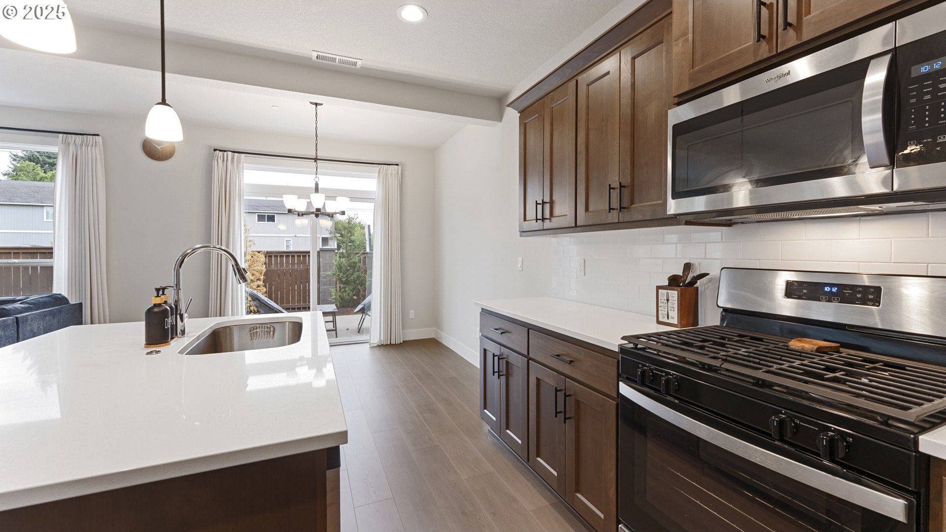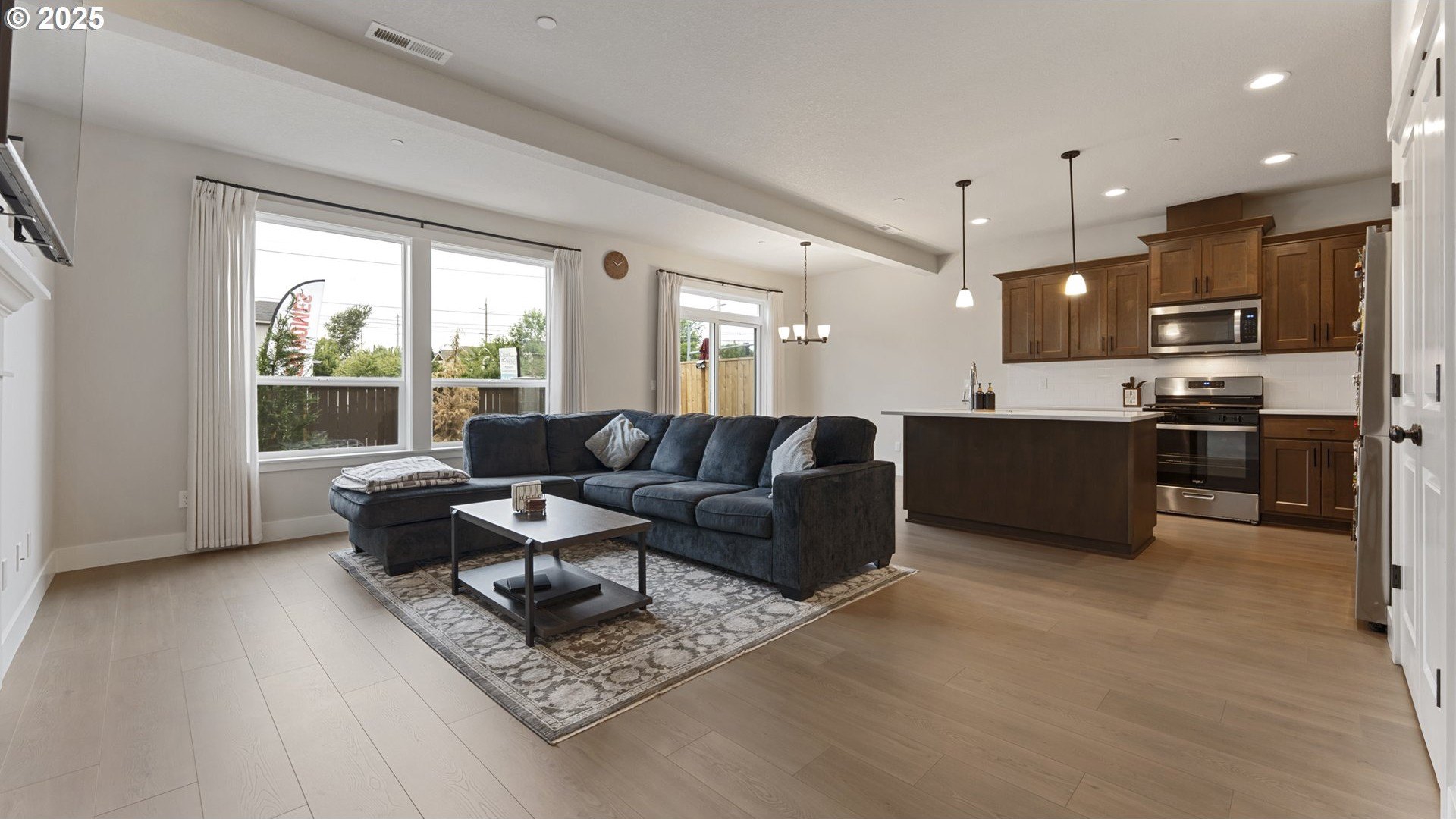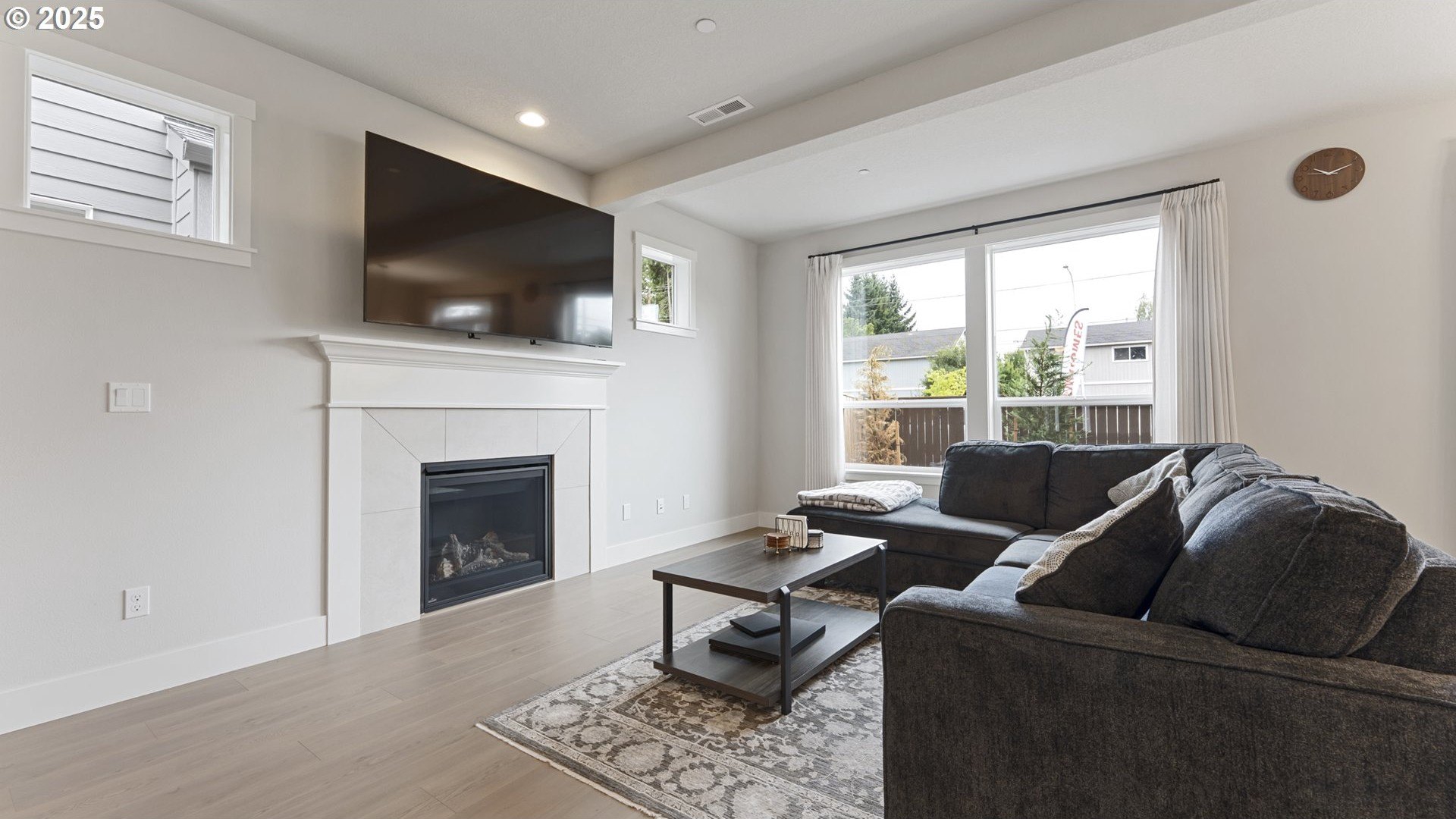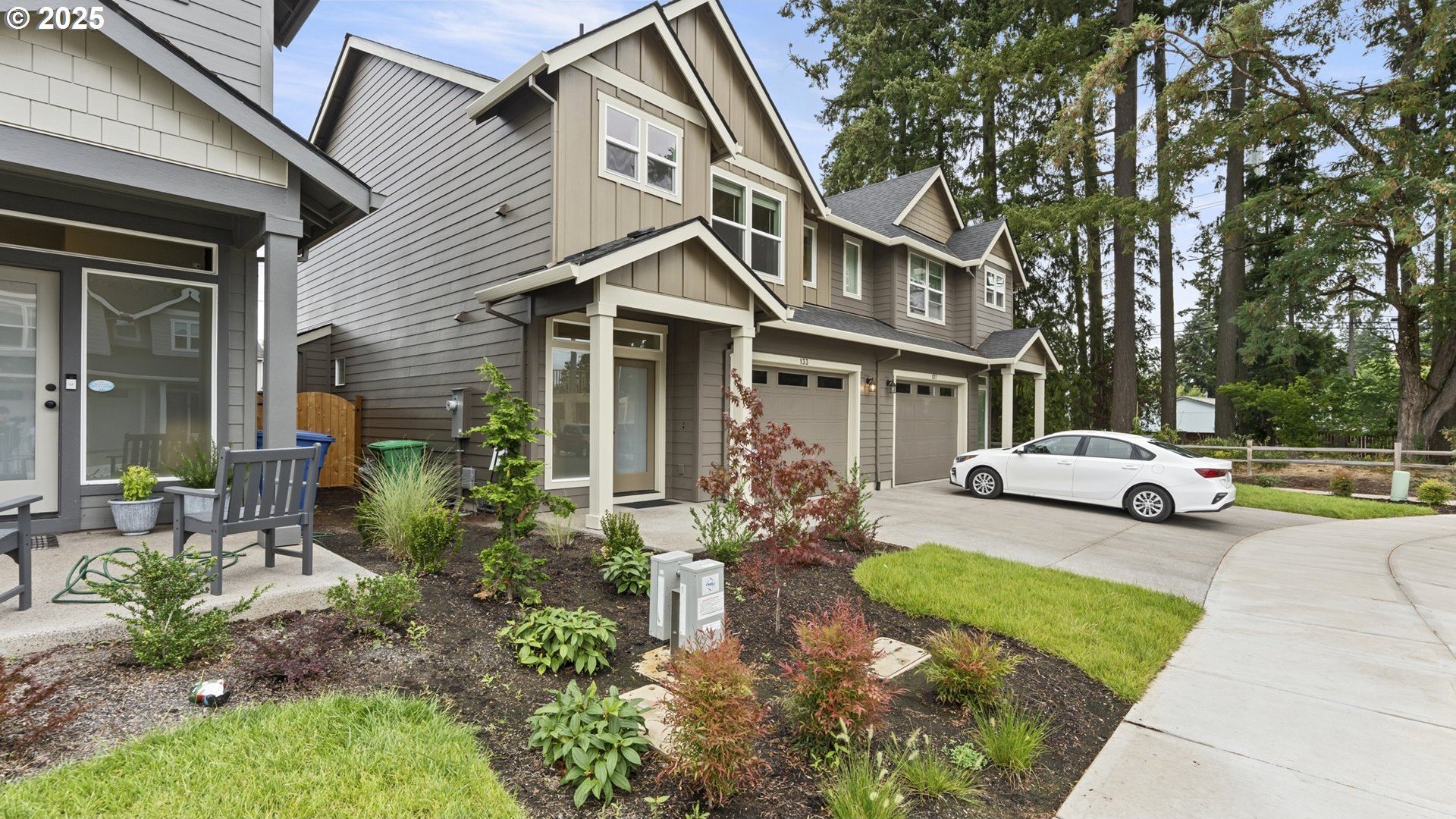 Welcome to the pinnacle of modern living in Hillsboro, OR! This almost brand-new, exquisite 1657 sq ft townhome offers an impeccable blend of style and energy efficiency with a perfect 10/10 energy score, and eco-friendly living, featuring 3 spacious bedrooms and 2.5 elegantly designed bathrooms. Experience the luxury of quartz countertops in the kitchen and baths and the sleek functionality of stainless steel gas appliances. The wide plank laminate flooring offers both durability and a sophisticated aesthetic, complemented by premium soft-close cabinets and drawers with matte finish hardware for a modern touch. Gather around the inviting gas fireplace, adding warmth and ambiance to your living area. A tankless water heater ensures on-demand hot water while offering energy savings, and the solar-ready construction makes it future-proof for eco-friendly enhancements. The home includes a washer/dryer for your convenience and a drop-down TV mount, seamlessly integrating into the living space. Convenience is key, with easy access to local shopping, dining, and major employers, as well as a community recreation center nearby, providing the perfect vibrant backdrop for modern living. Discover the perfect synthesis of comfort, style, and practicality in this exceptional townhome.