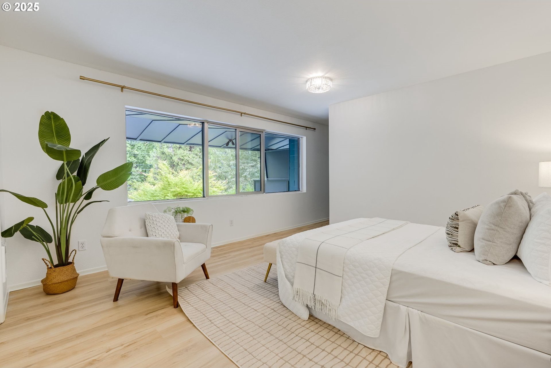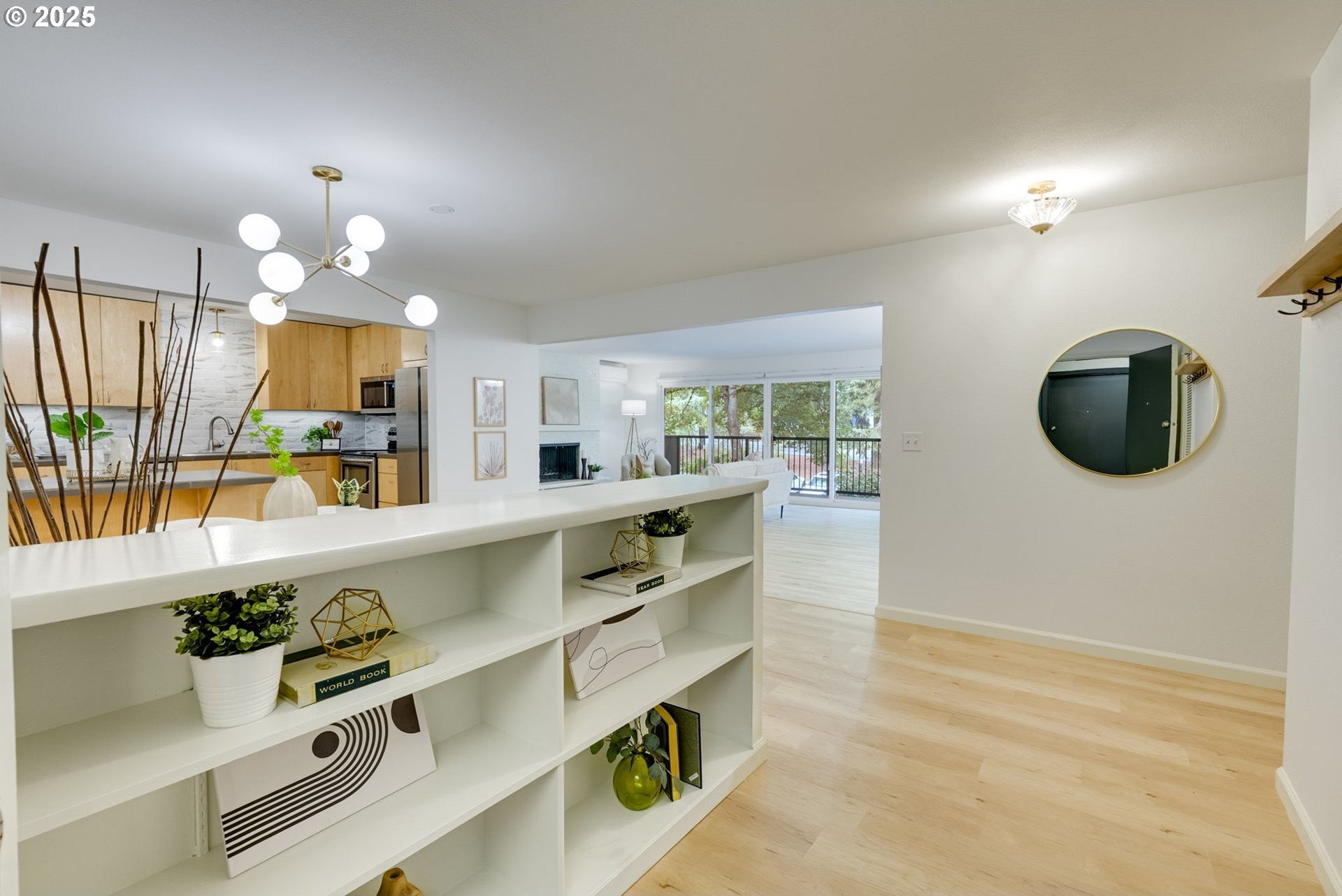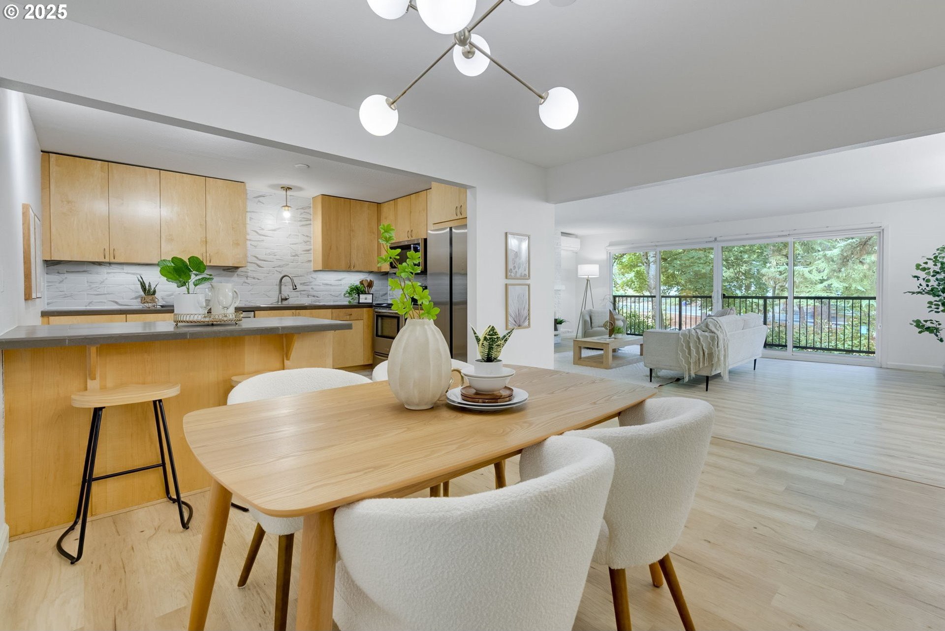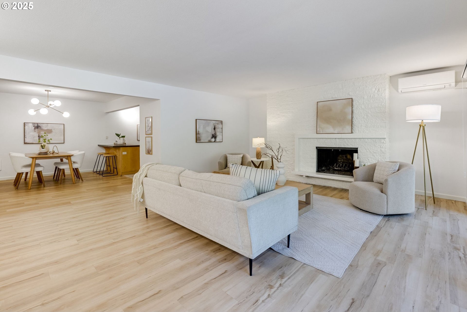 Discover a rare gem in one of Portland’s most sought-after communities. This expansive, single-level 3 bedroom, 2 bathroom condo offers a thoughtfully designed floor plan with a mid-century vibe. One of only two 3-bedroom units in the development, these condos rarely become available, so act fast. The layout is filled with natural light and flows effortlessly from room to room. The expansive great room showcases a wood-burning fireplace and timeless design, creating an inviting space for both relaxation and entertaining. The sleek kitchen boasts contemporary tilework and stainless-steel appliances, blending style and function seamlessly. Adjacent to the kitchen, the dining area offers definition without sacrificing the open-concept feel. The private primary suite features an en-suite bath, walk-in shower, and a dressing area that could easily serve as a home office. Two additional large bedrooms provide access to the oversized balcony, offering flexibility for guests, a home office space, or a creative space. Engineered wood floors throughout, a ductless mini-split system, and curated updates add comfort and sophistication. Enjoy the expansive covered balcony for year-round outdoor living, plus a large storage unit conveniently located adjacent to the condo and a covered parking spot in a secure, gated lot. The well-maintained community offers premium amenities, including two pools, a fitness center, secure bike storage, a meeting room, and dog-friendly spaces. A scenic trail connects the property to George Rogers Park and the riverfront. Spend tranquil evenings near the river or take a short drive to downtown Lake Oswego for boutique shopping, fine dining, Millennium Plaza Park, and the local Farmers Market. Whole Foods is nearby for everyday convenience. This condo combines modern comfort, timeless style, and a prime location; urban living at its finest.