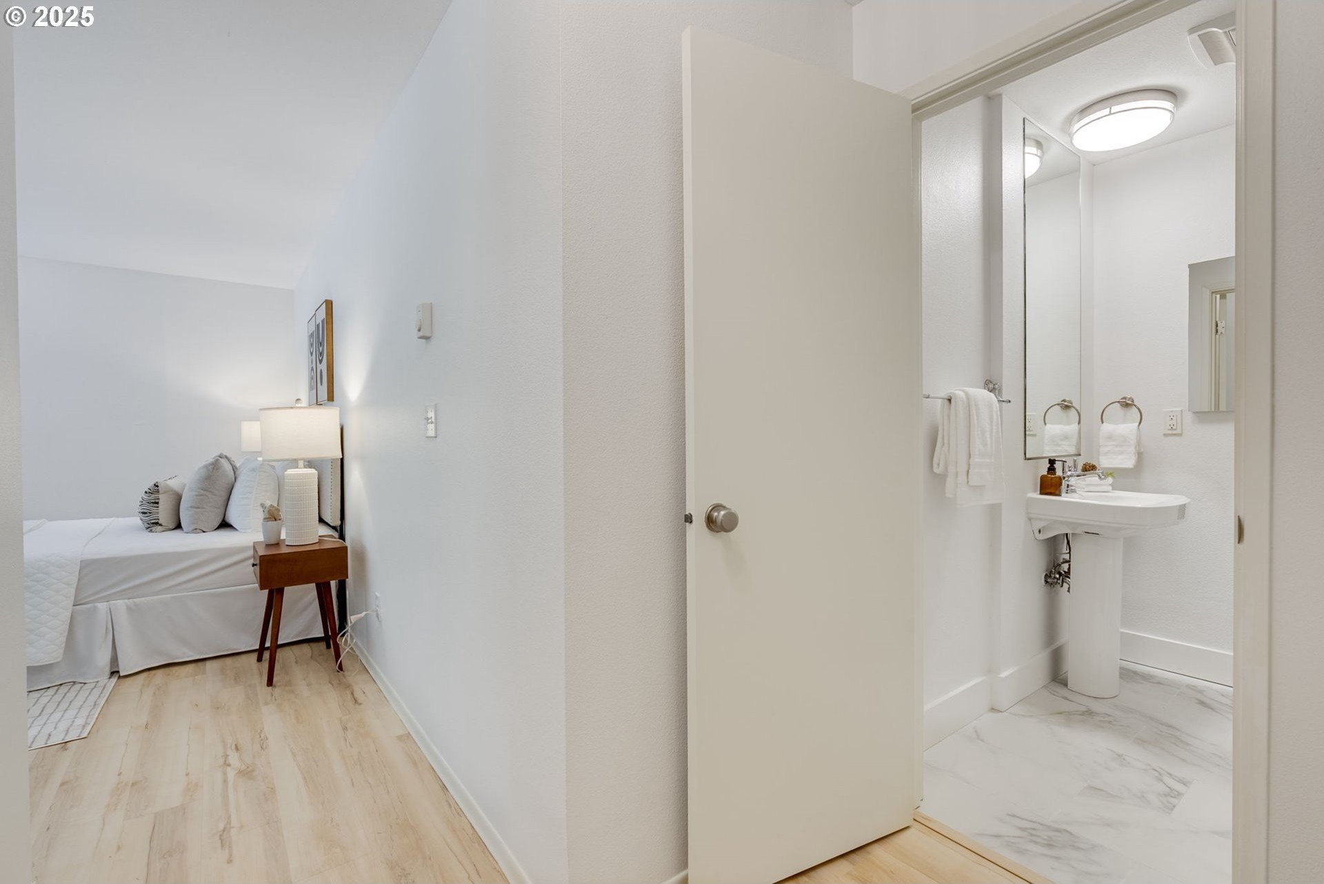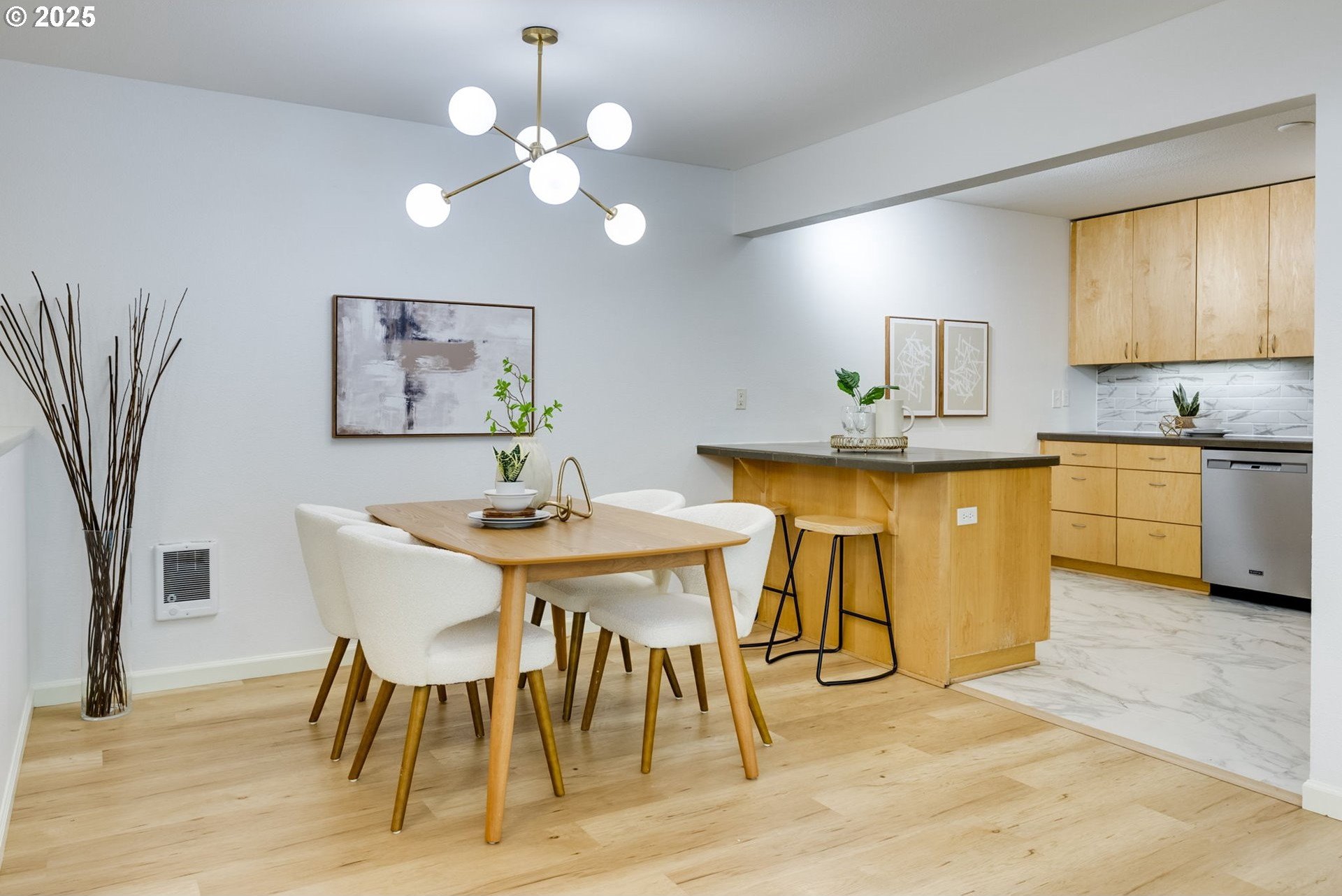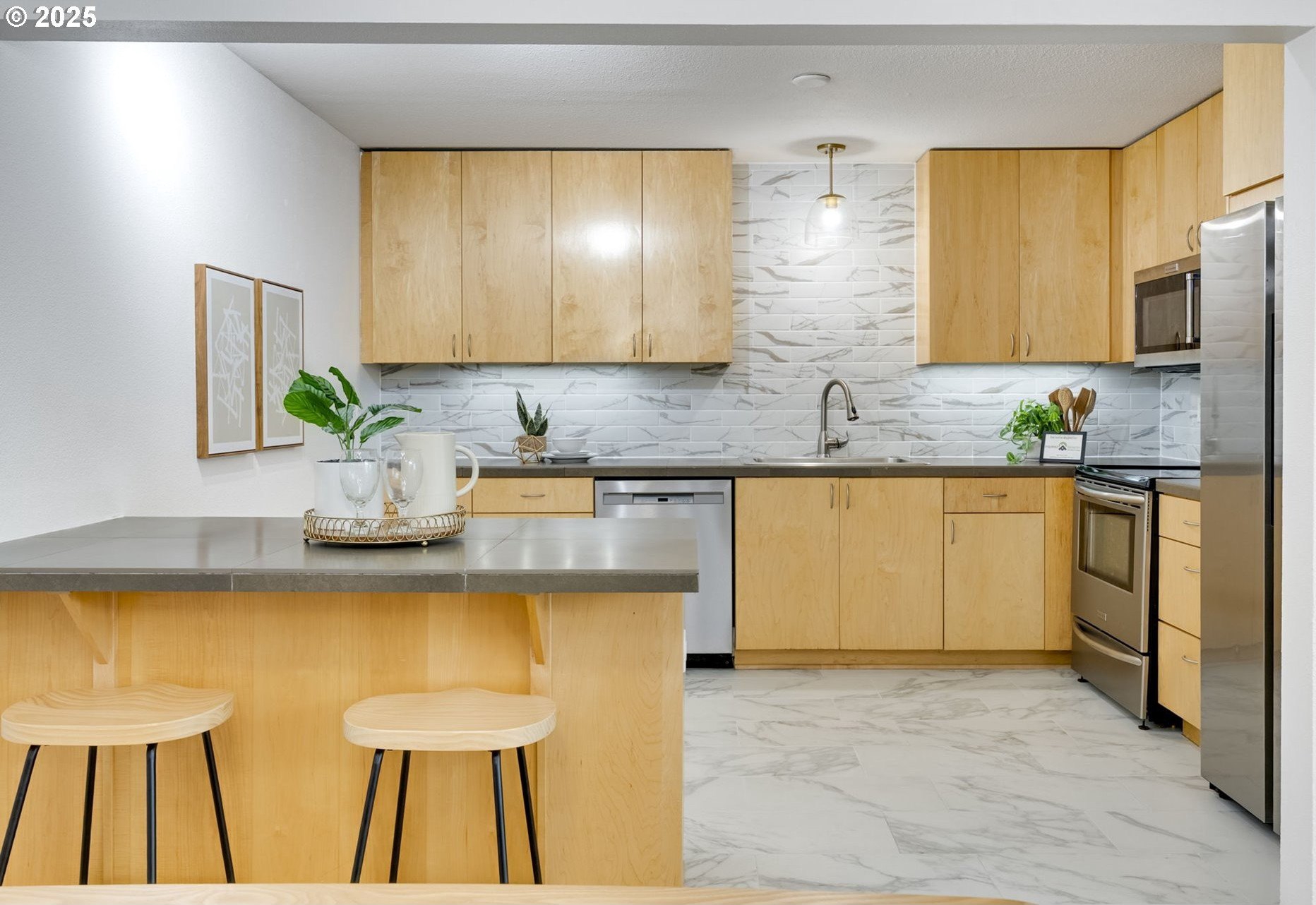 Discover a rare gem in one of Portland’s most sought-after communities. This expansive, single-level 3 bedroom, 2 bathroom condo offers a thoughtfully designed floor plan with a mid-century vibe. One of only two 3-bedroom units in the development, these condos rarely become available, so act fast. The layout is filled with natural light and flows effortlessly from room to room. The expansive great room showcases a wood-burning fireplace and timeless design, creating an inviting space for both relaxation and entertaining. The sleek kitchen boasts contemporary tilework and stainless-steel appliances, blending style and function seamlessly. Adjacent to the kitchen, the dining area offers definition without sacrificing the open-concept feel. The private primary suite features an en-suite bath, walk-in shower, and a dressing area that could easily serve as a home office. Two additional large bedrooms provide access to the oversized balcony, offering flexibility for guests, a home office space, or a creative space. Engineered wood floors throughout, a ductless mini-split system, and curated updates add comfort and sophistication. Enjoy the expansive covered balcony for year-round outdoor living, plus a large storage unit conveniently located adjacent to the condo and a covered parking spot in a secure, gated lot. The well-maintained community offers premium amenities, including two pools, a fitness center, secure bike storage, a meeting room, and dog-friendly spaces. A scenic trail connects the property to George Rogers Park and the riverfront. Spend tranquil evenings near the river or take a short drive to downtown Lake Oswego for boutique shopping, fine dining, Millennium Plaza Park, and the local Farmers Market. Whole Foods is nearby for everyday convenience. This condo combines modern comfort, timeless style, and a prime location; urban living at its finest.