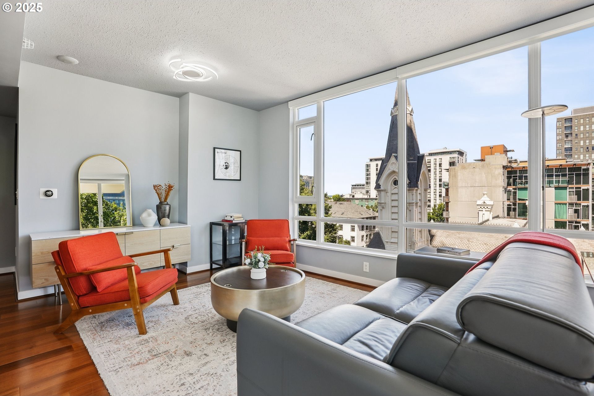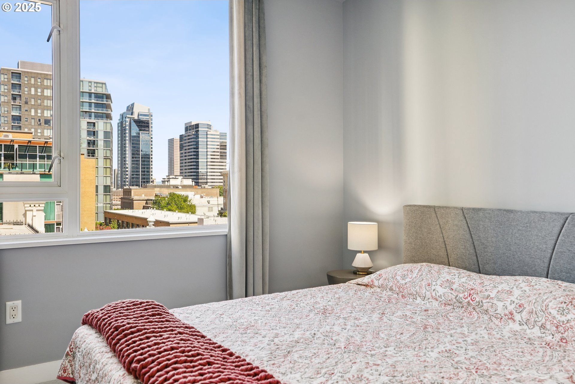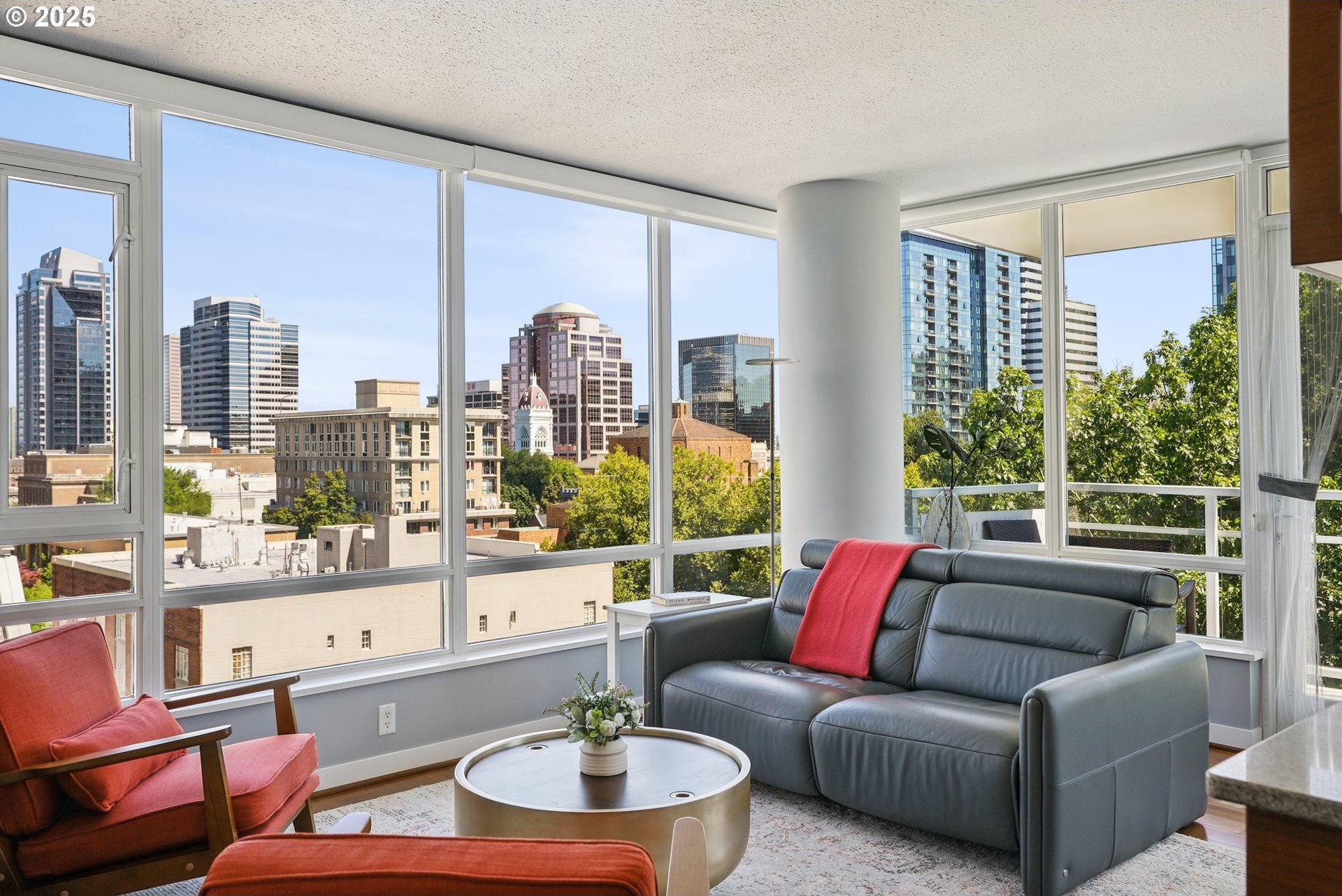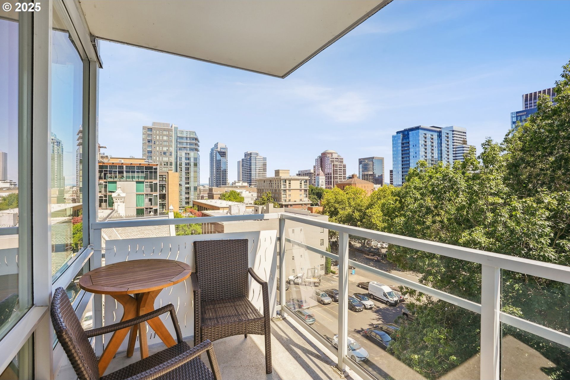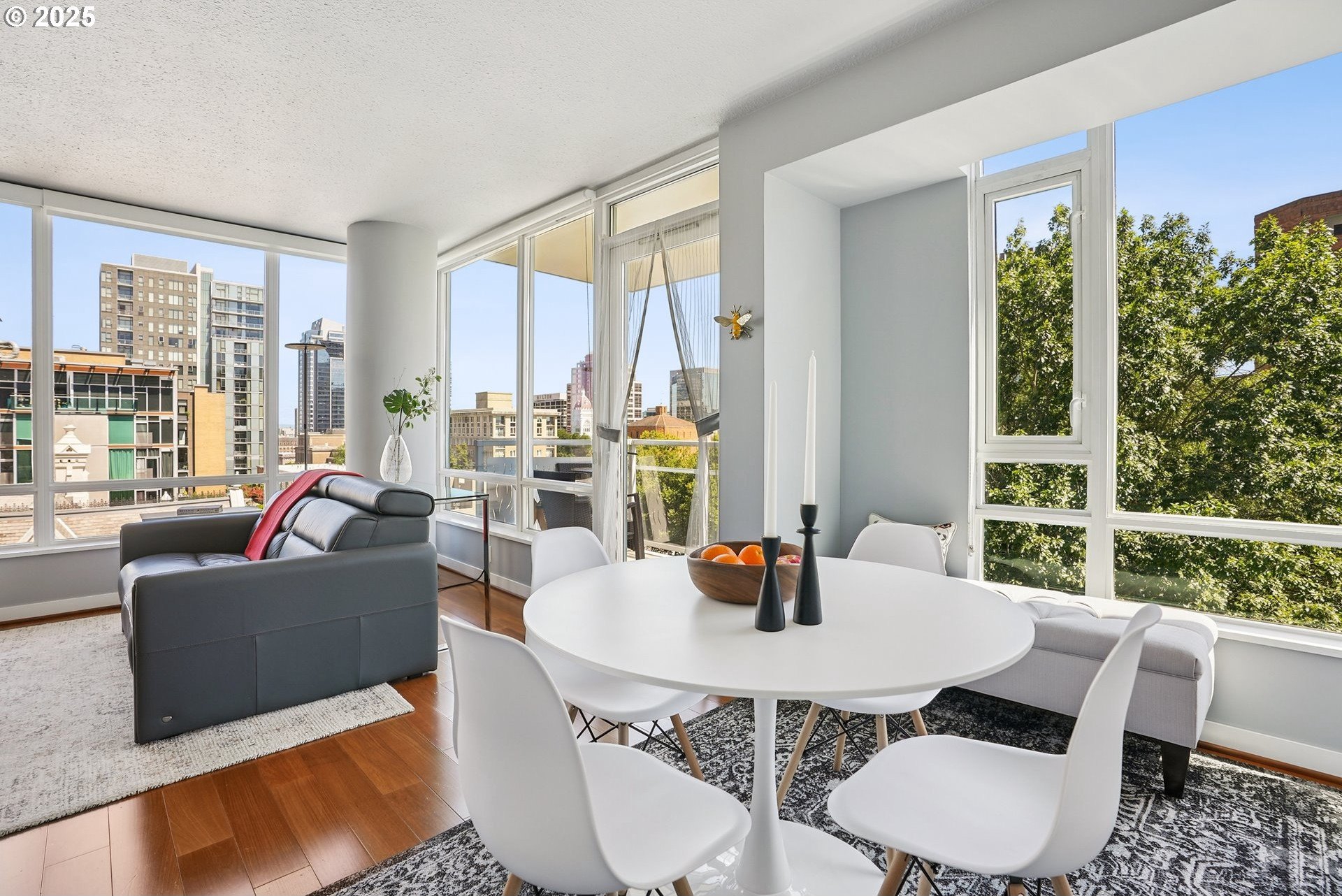 This NE corner condo on the 6th floor offers great views of the city, surrounding, treetops, and neighborhood. Inside, you'll find hardwood floors, large windows that let in plenty of natural light, and custom built-ins for extra storage. The primary bedroom includes an en suite bathroom, and there's also a convenient hallway powder room.The kitchen features a gas range, stainless steel appliances, and an eating bar. A private balcony provides a nice space to relax or enjoy the view.Building amenities include a hot tub, gym, meeting room, and a modern lobby with high ceilings and walls of windows. There’s also a large outdoor common area for gatherings or relaxing.Located in Portland’s Cultural District, this home near Portland State University, the Oregon Historical Society, Directors Park, the South Park Blocks, the Portland Streetcar, and a variety of dining, shopping, and entertainment options.Includes a deeded parking space and storage unit.