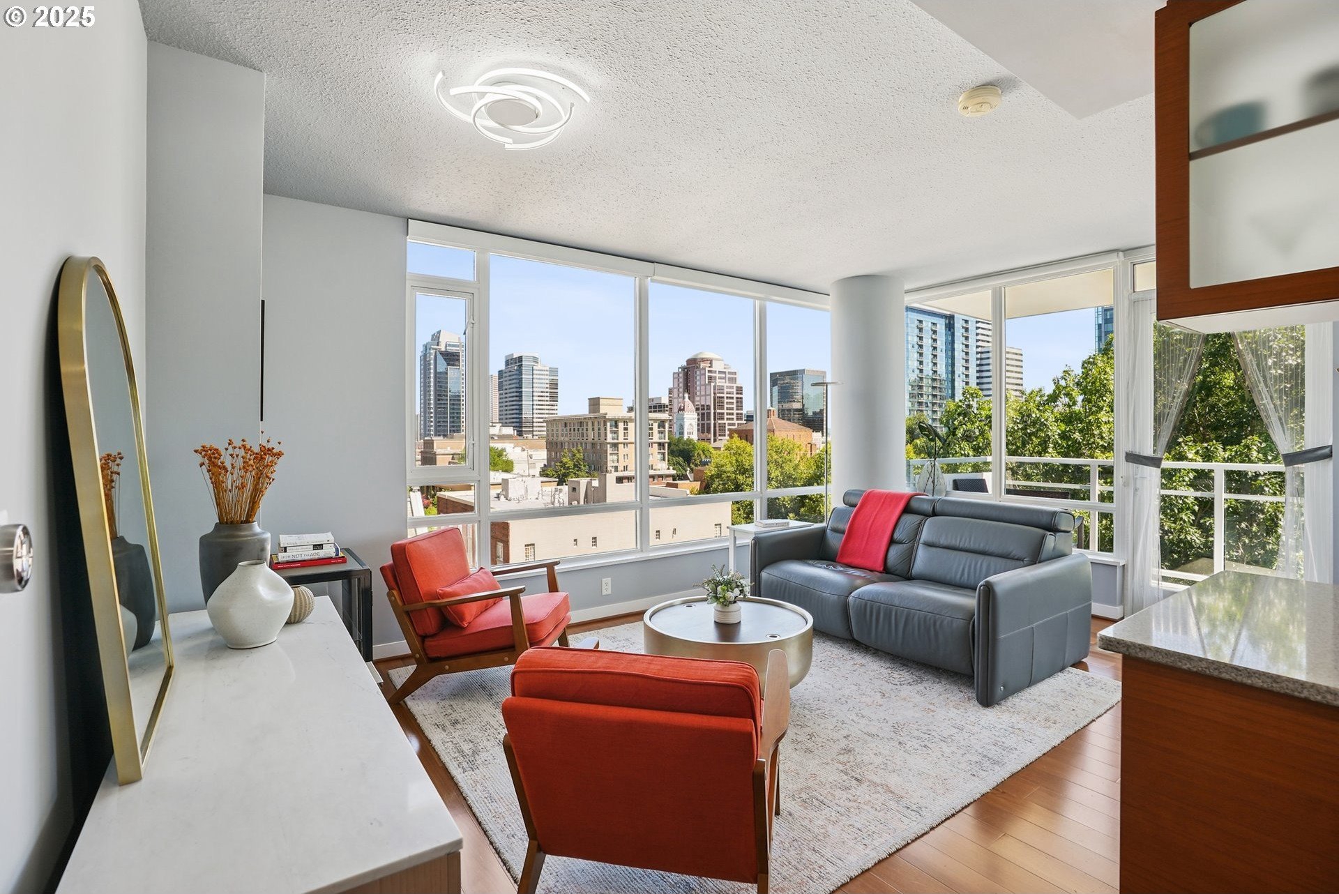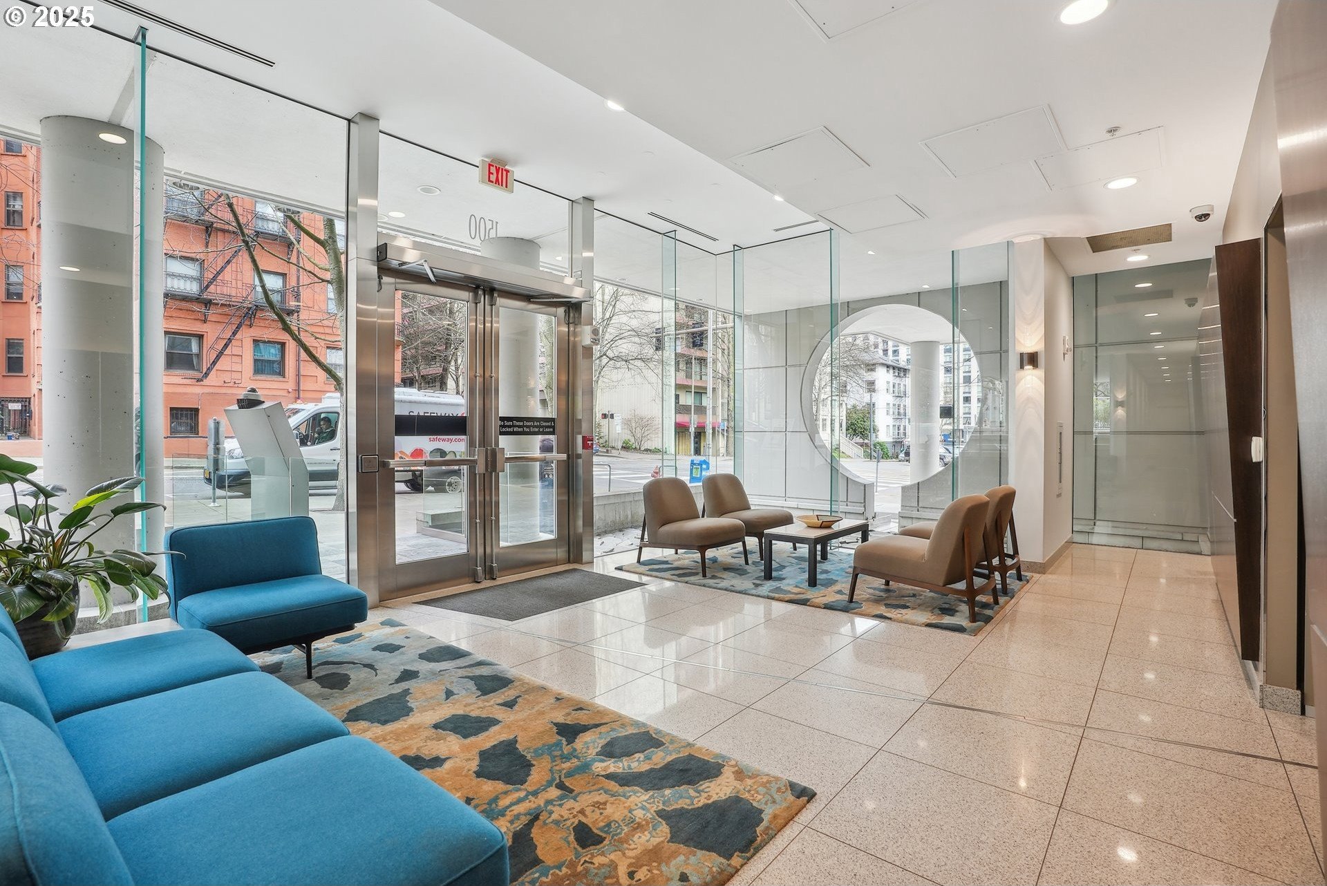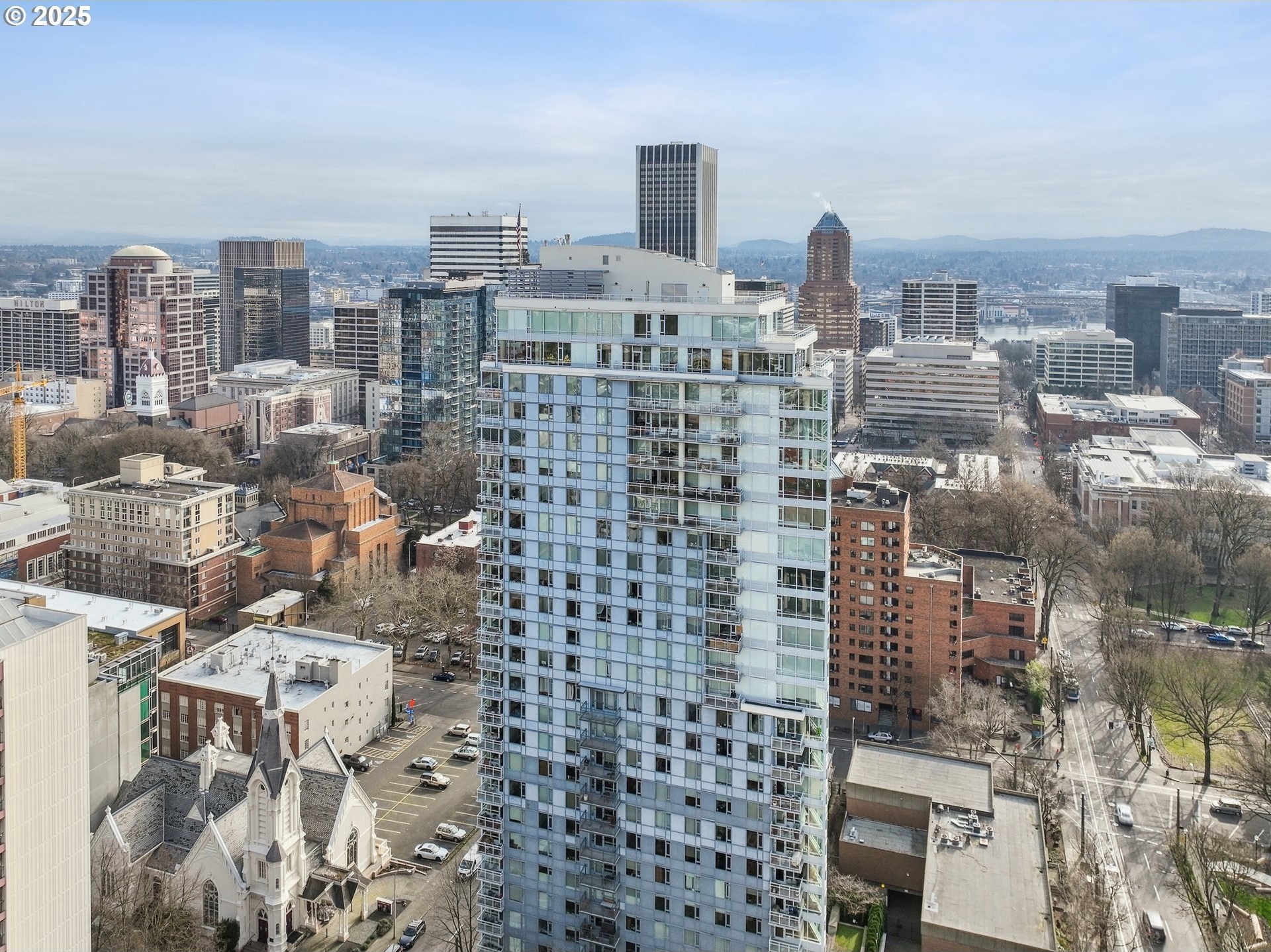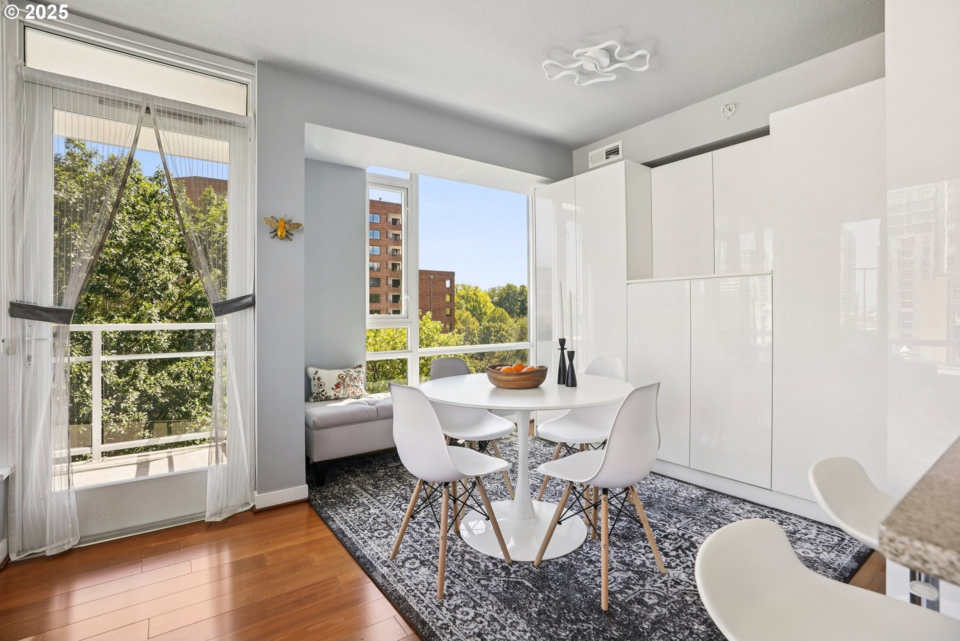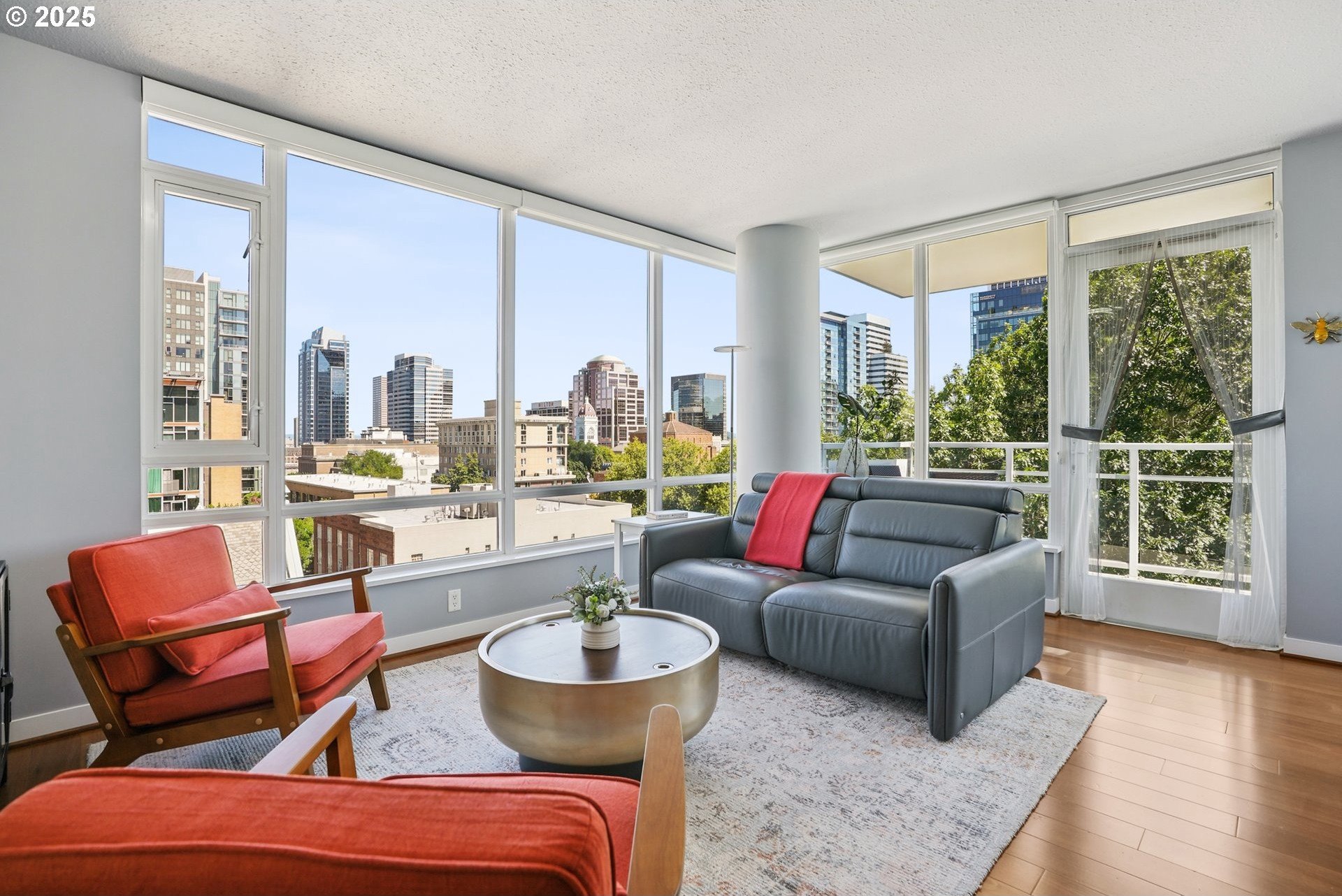 This NE corner condo on the 6th floor offers great views of the city, surrounding, treetops, and neighborhood. Inside, you'll find hardwood floors, large windows that let in plenty of natural light, and custom built-ins for extra storage. The primary bedroom includes an en suite bathroom, and there's also a convenient hallway powder room.The kitchen features a gas range, stainless steel appliances, and an eating bar. A private balcony provides a nice space to relax or enjoy the view.Building amenities include a hot tub, gym, meeting room, and a modern lobby with high ceilings and walls of windows. There’s also a large outdoor common area for gatherings or relaxing.Located in Portland’s Cultural District, this home near Portland State University, the Oregon Historical Society, Directors Park, the South Park Blocks, the Portland Streetcar, and a variety of dining, shopping, and entertainment options.Includes a deeded parking space and storage unit.
