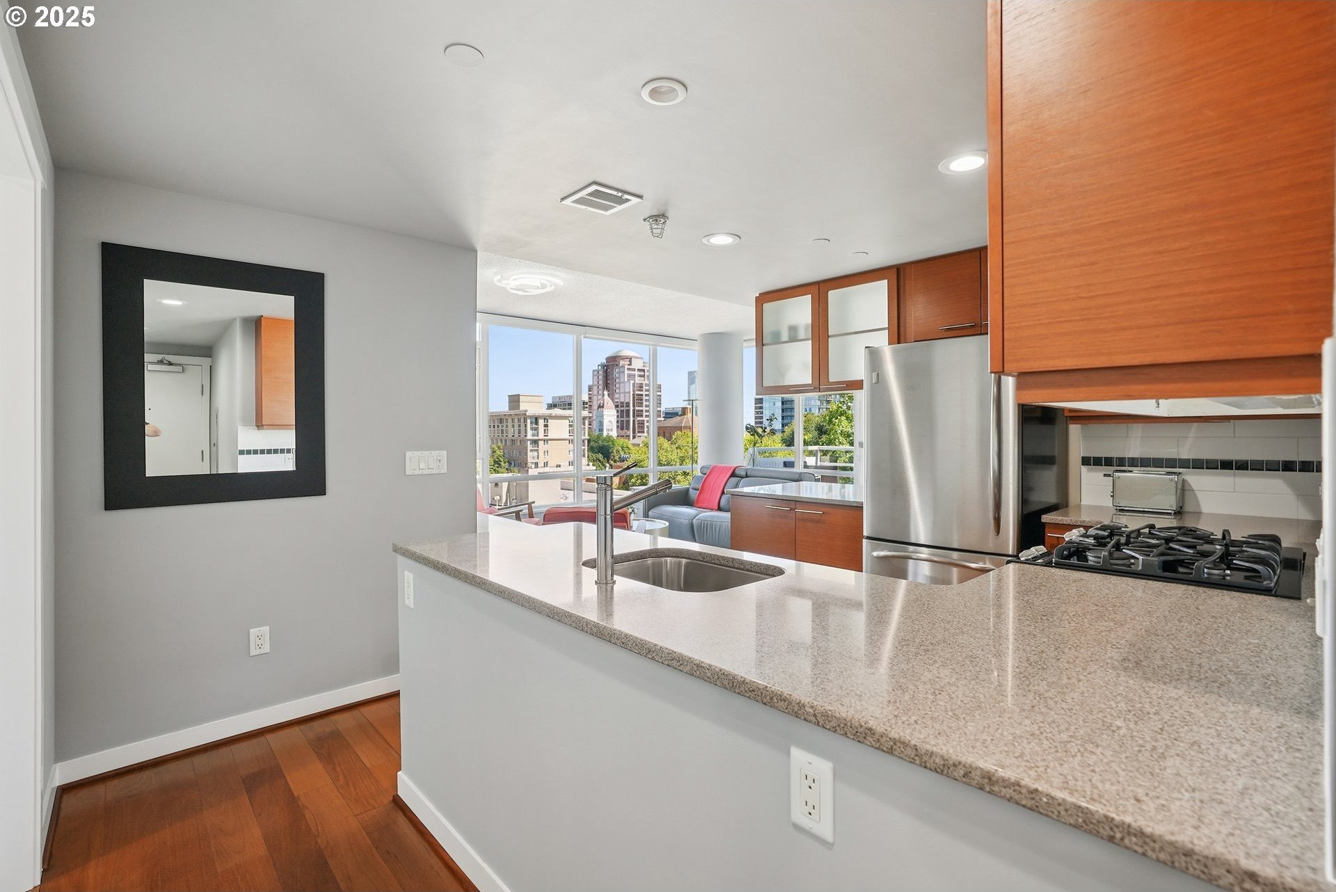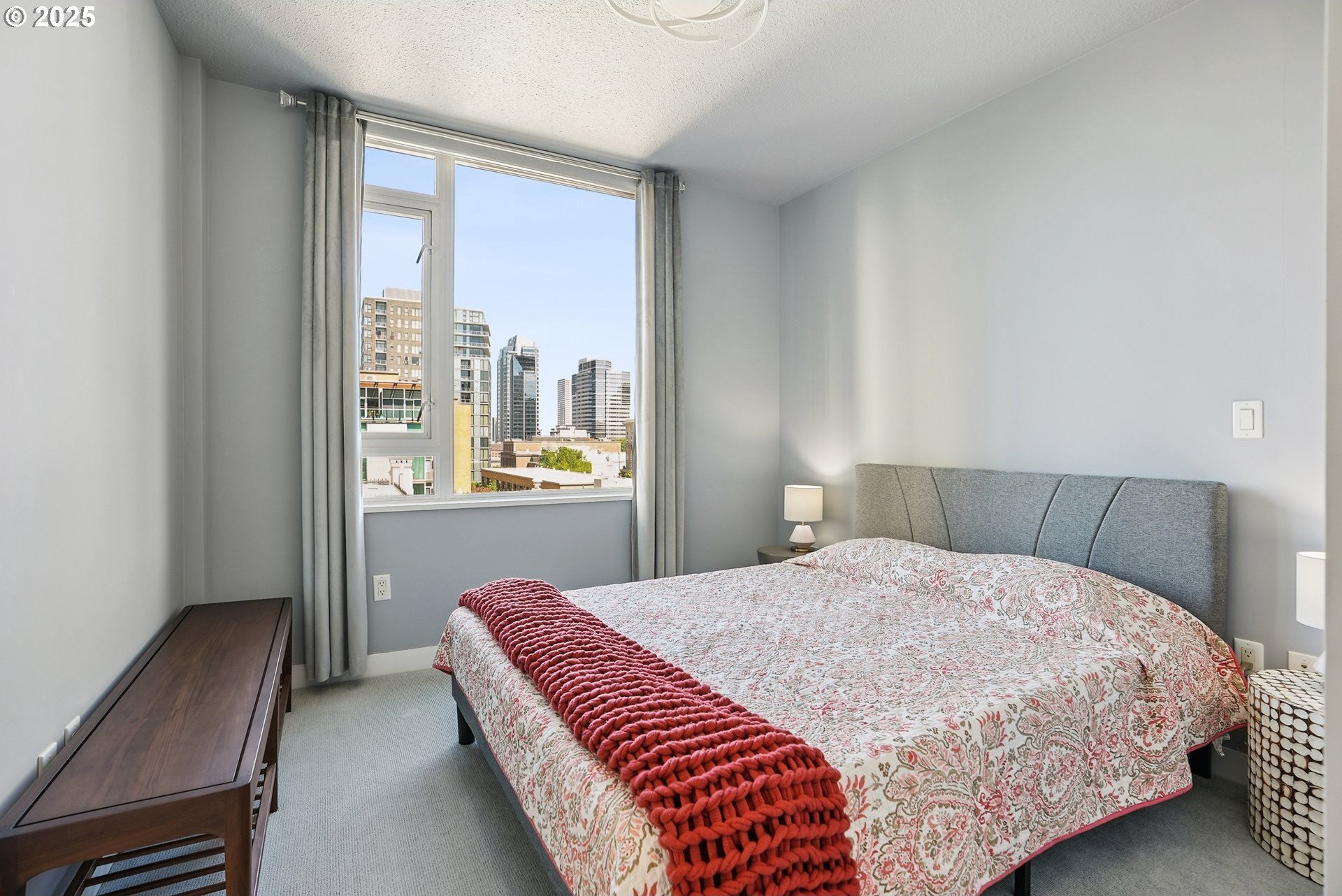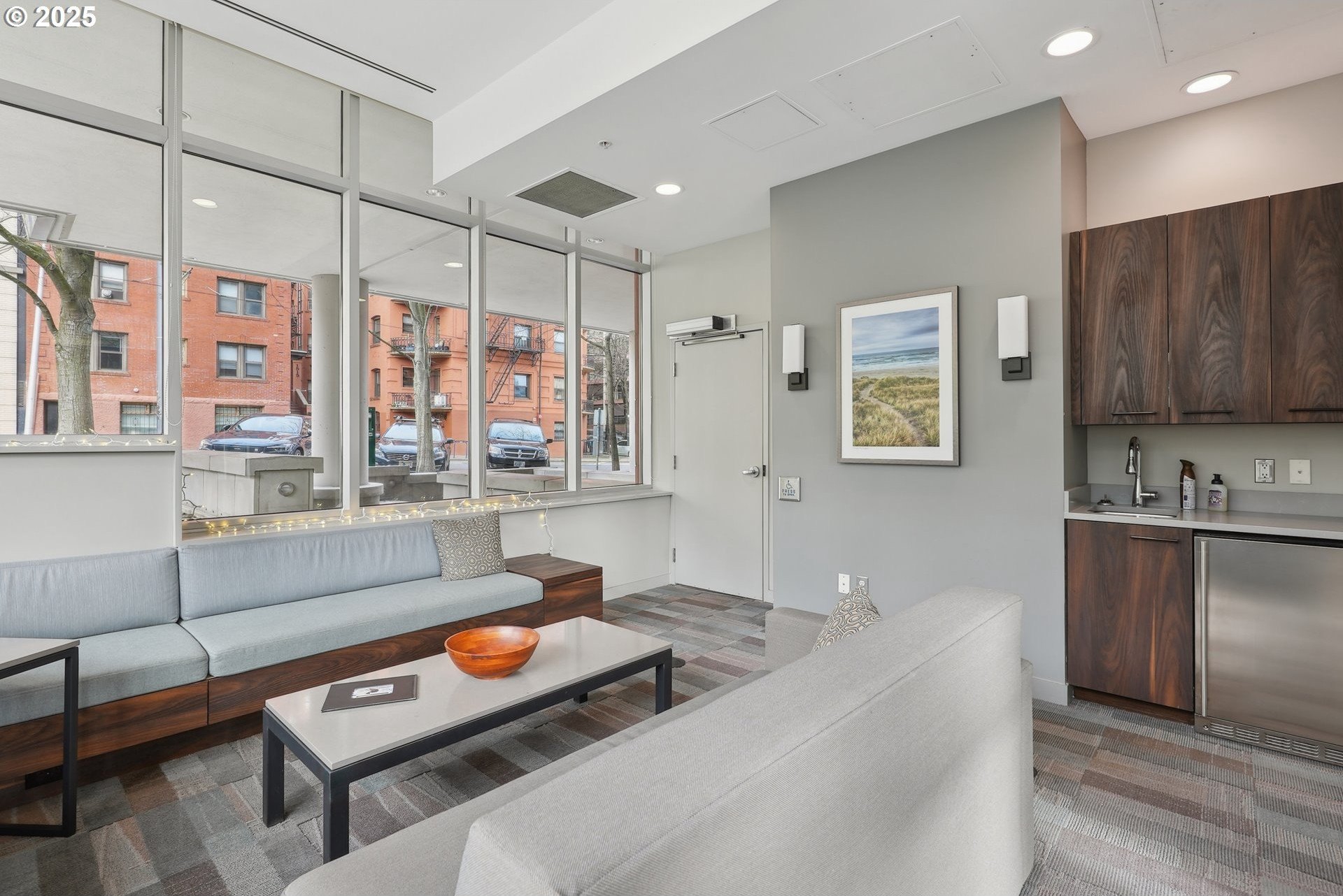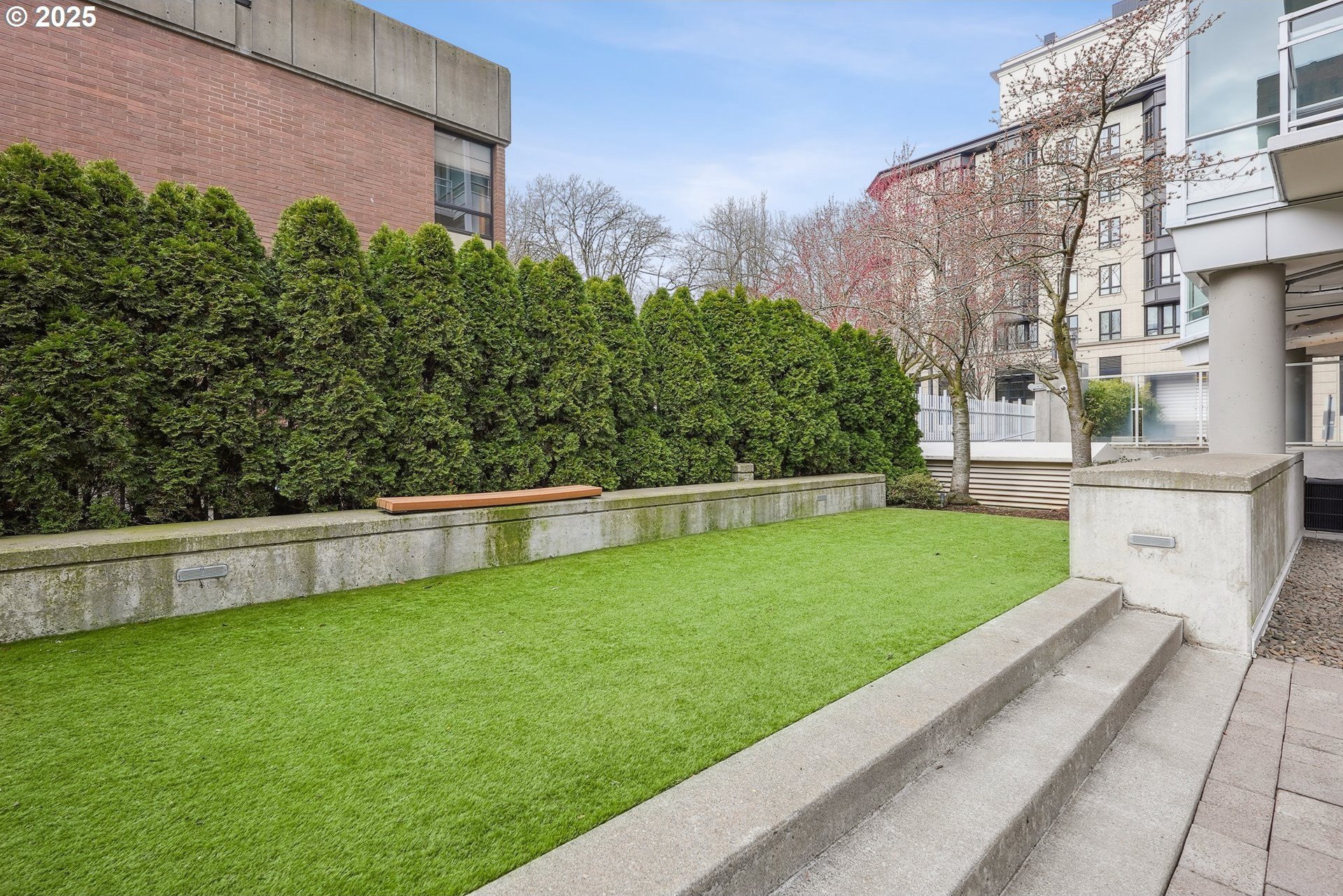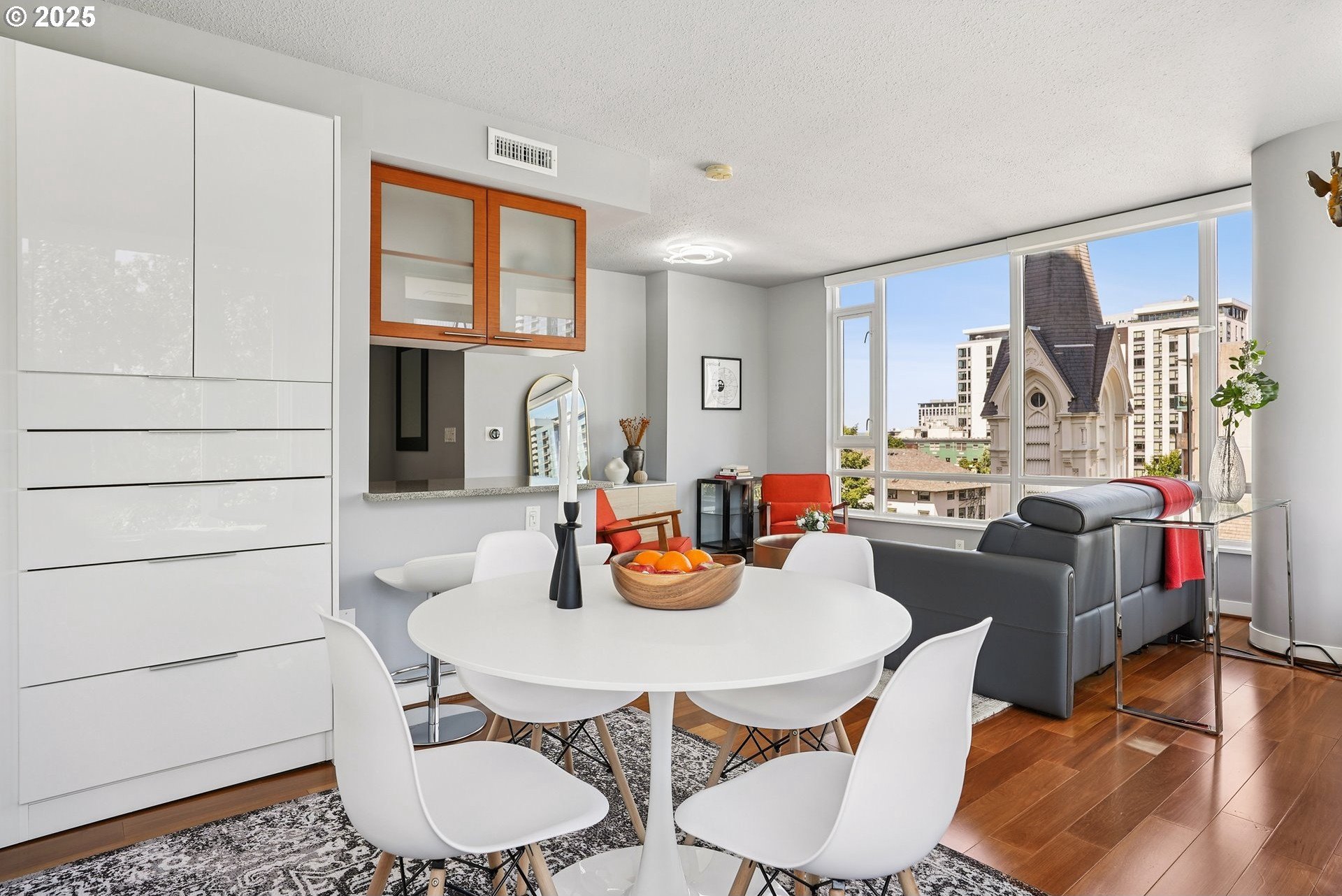 This NE corner condo on the 6th floor offers great views of the city, surrounding, treetops, and neighborhood. Inside, you'll find hardwood floors, large windows that let in plenty of natural light, and custom built-ins for extra storage. The primary bedroom includes an en suite bathroom, and there's also a convenient hallway powder room.The kitchen features a gas range, stainless steel appliances, and an eating bar. A private balcony provides a nice space to relax or enjoy the view.Building amenities include a hot tub, gym, meeting room, and a modern lobby with high ceilings and walls of windows. There’s also a large outdoor common area for gatherings or relaxing.Located in Portland’s Cultural District, this home near Portland State University, the Oregon Historical Society, Directors Park, the South Park Blocks, the Portland Streetcar, and a variety of dining, shopping, and entertainment options.Includes a deeded parking space and storage unit.