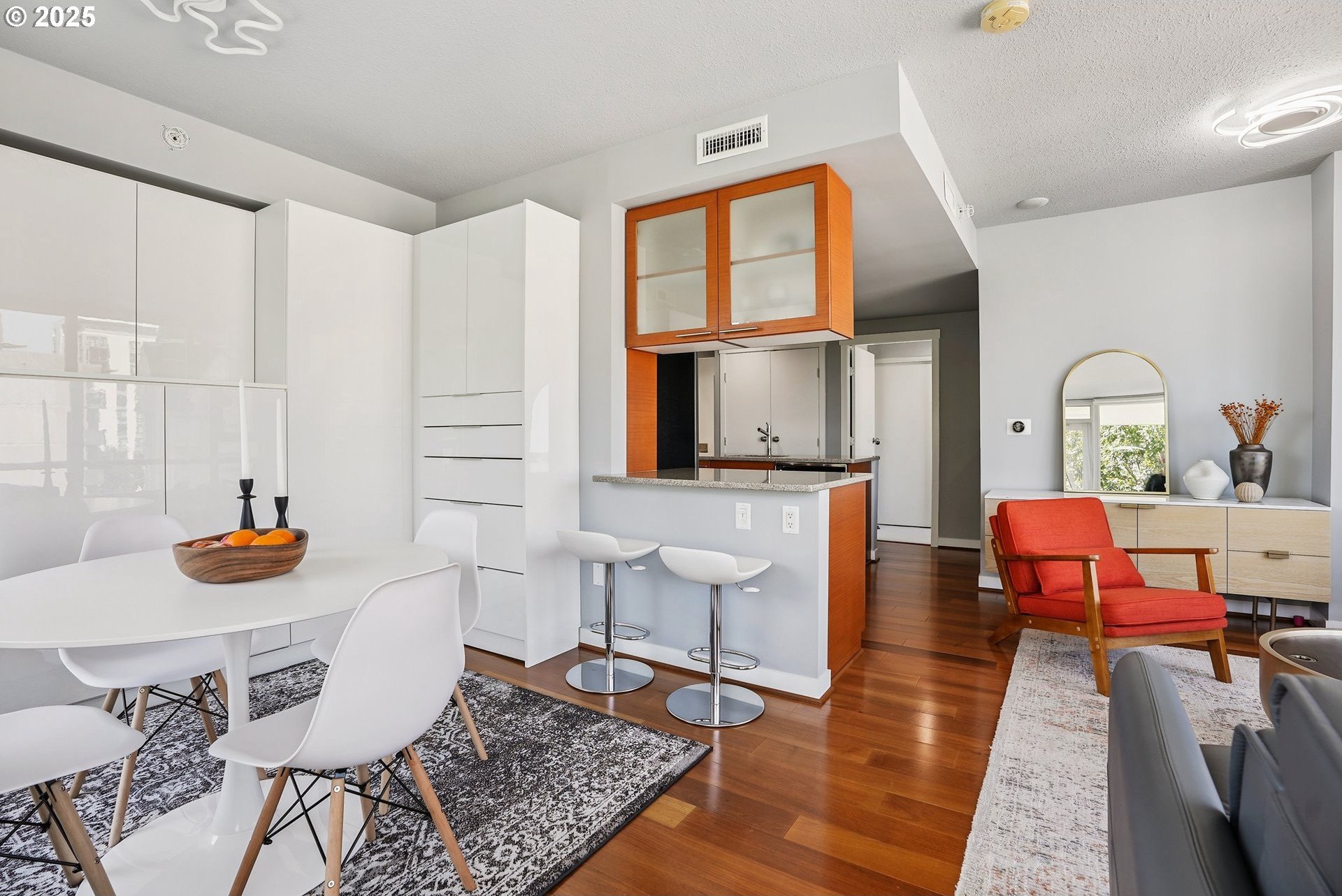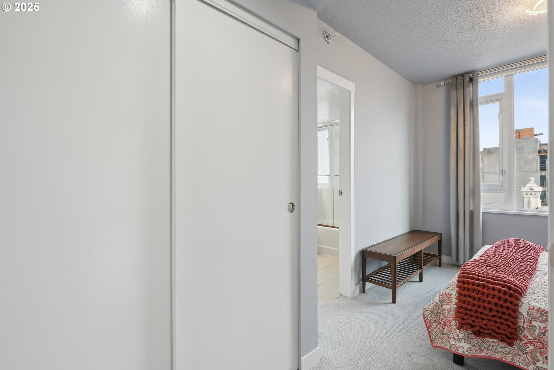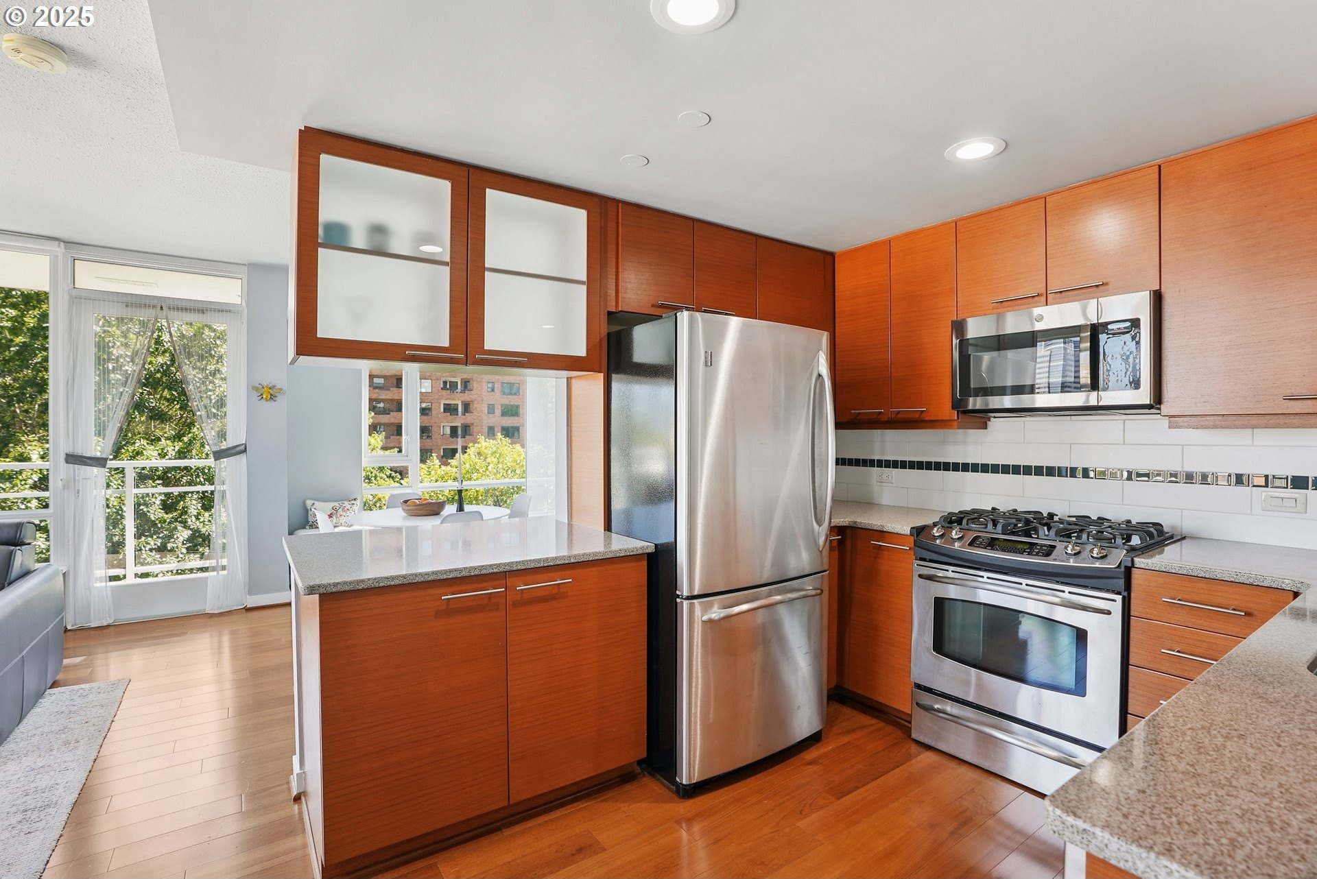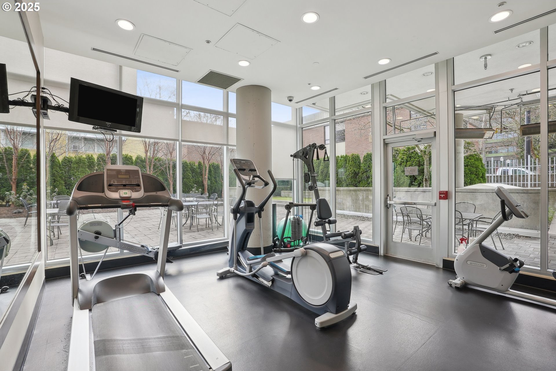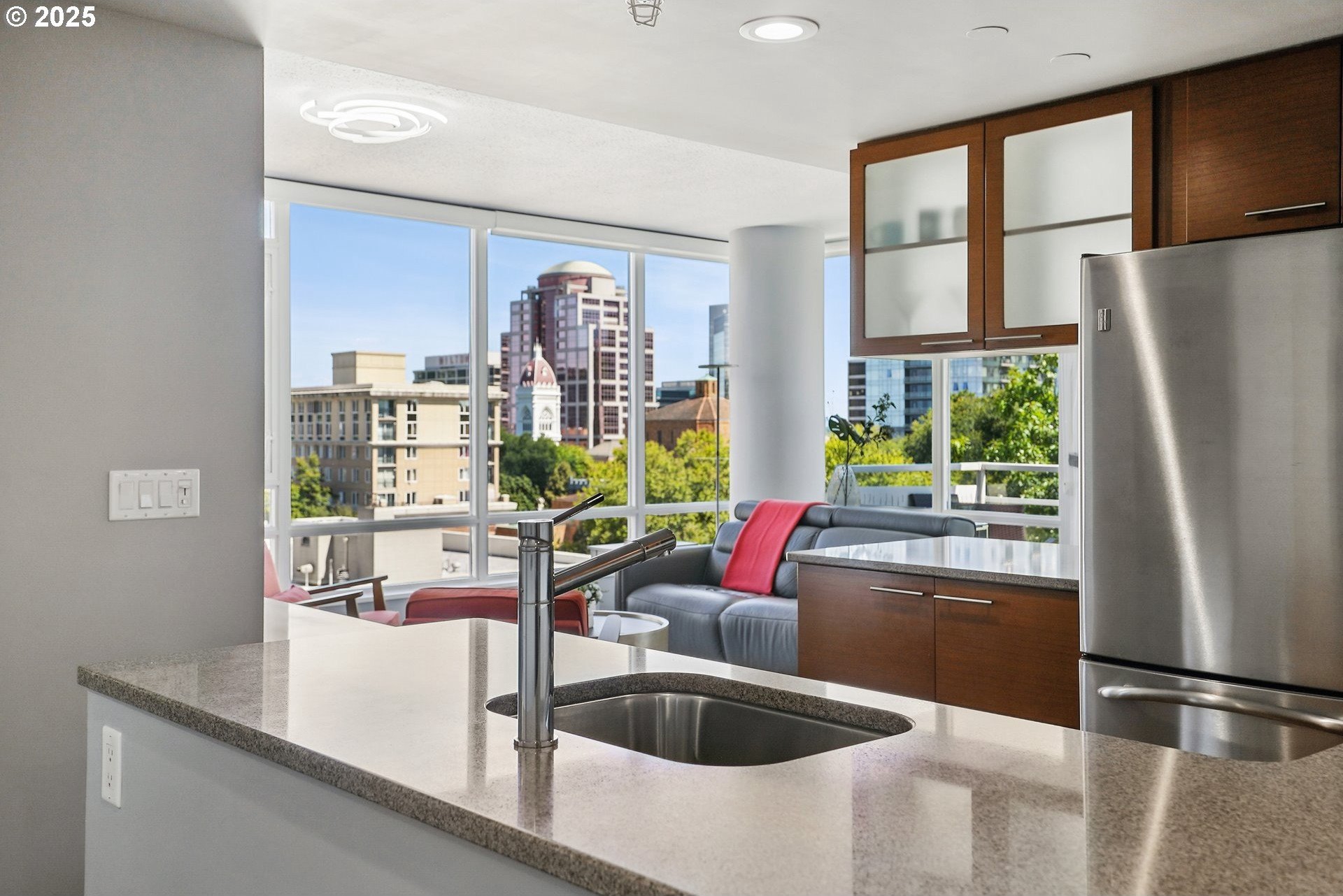 This NE corner condo on the 6th floor offers great views of the city, surrounding, treetops, and neighborhood. Inside, you'll find hardwood floors, large windows that let in plenty of natural light, and custom built-ins for extra storage. The primary bedroom includes an en suite bathroom, and there's also a convenient hallway powder room.The kitchen features a gas range, stainless steel appliances, and an eating bar. A private balcony provides a nice space to relax or enjoy the view.Building amenities include a hot tub, gym, meeting room, and a modern lobby with high ceilings and walls of windows. There’s also a large outdoor common area for gatherings or relaxing.Located in Portland’s Cultural District, this home near Portland State University, the Oregon Historical Society, Directors Park, the South Park Blocks, the Portland Streetcar, and a variety of dining, shopping, and entertainment options.Includes a deeded parking space and storage unit.