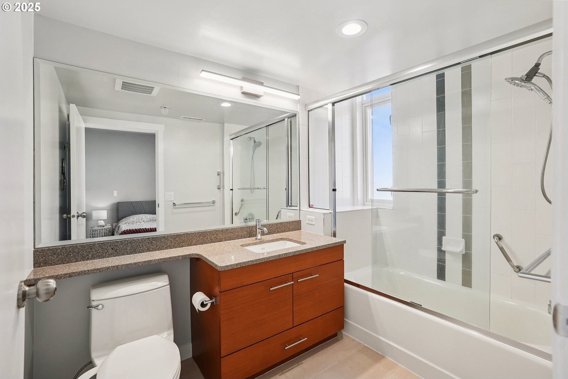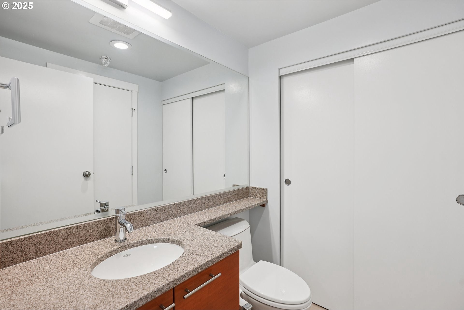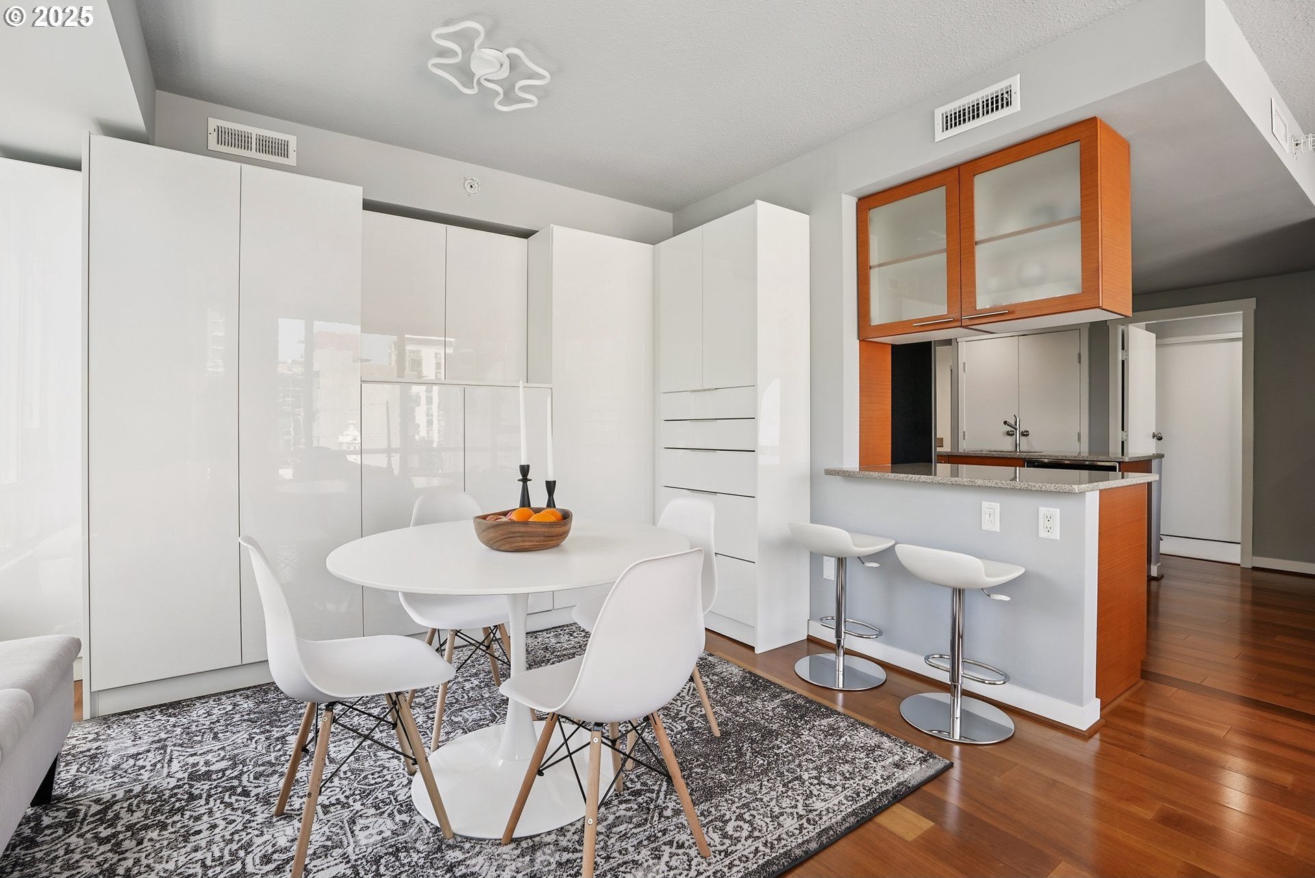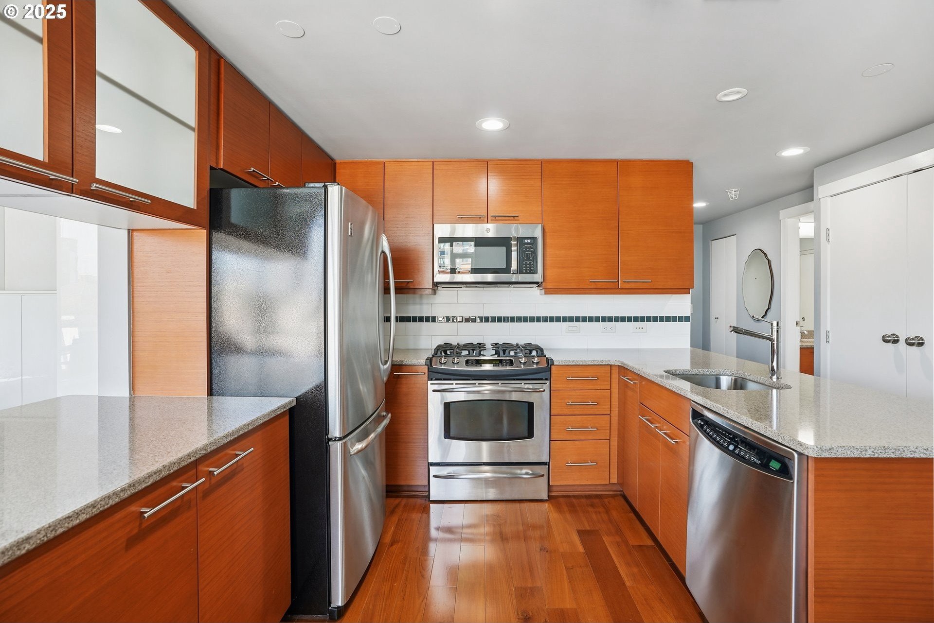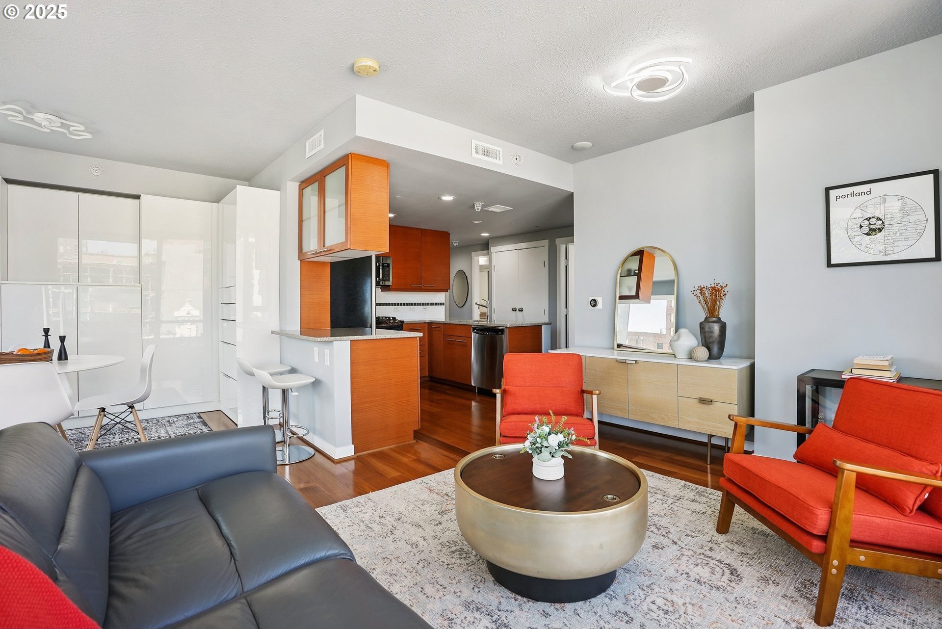 This NE corner condo on the 6th floor offers great views of the city, surrounding, treetops, and neighborhood. Inside, you'll find hardwood floors, large windows that let in plenty of natural light, and custom built-ins for extra storage. The primary bedroom includes an en suite bathroom, and there's also a convenient hallway powder room.The kitchen features a gas range, stainless steel appliances, and an eating bar. A private balcony provides a nice space to relax or enjoy the view.Building amenities include a hot tub, gym, meeting room, and a modern lobby with high ceilings and walls of windows. There’s also a large outdoor common area for gatherings or relaxing.Located in Portland’s Cultural District, this home near Portland State University, the Oregon Historical Society, Directors Park, the South Park Blocks, the Portland Streetcar, and a variety of dining, shopping, and entertainment options.Includes a deeded parking space and storage unit.