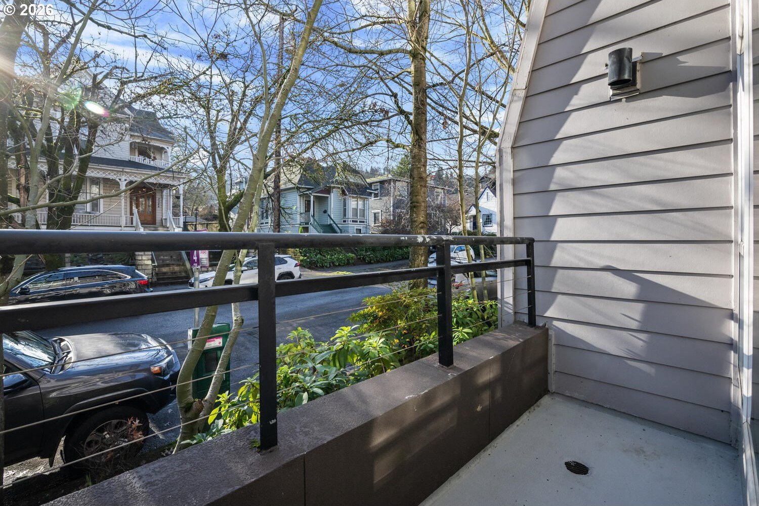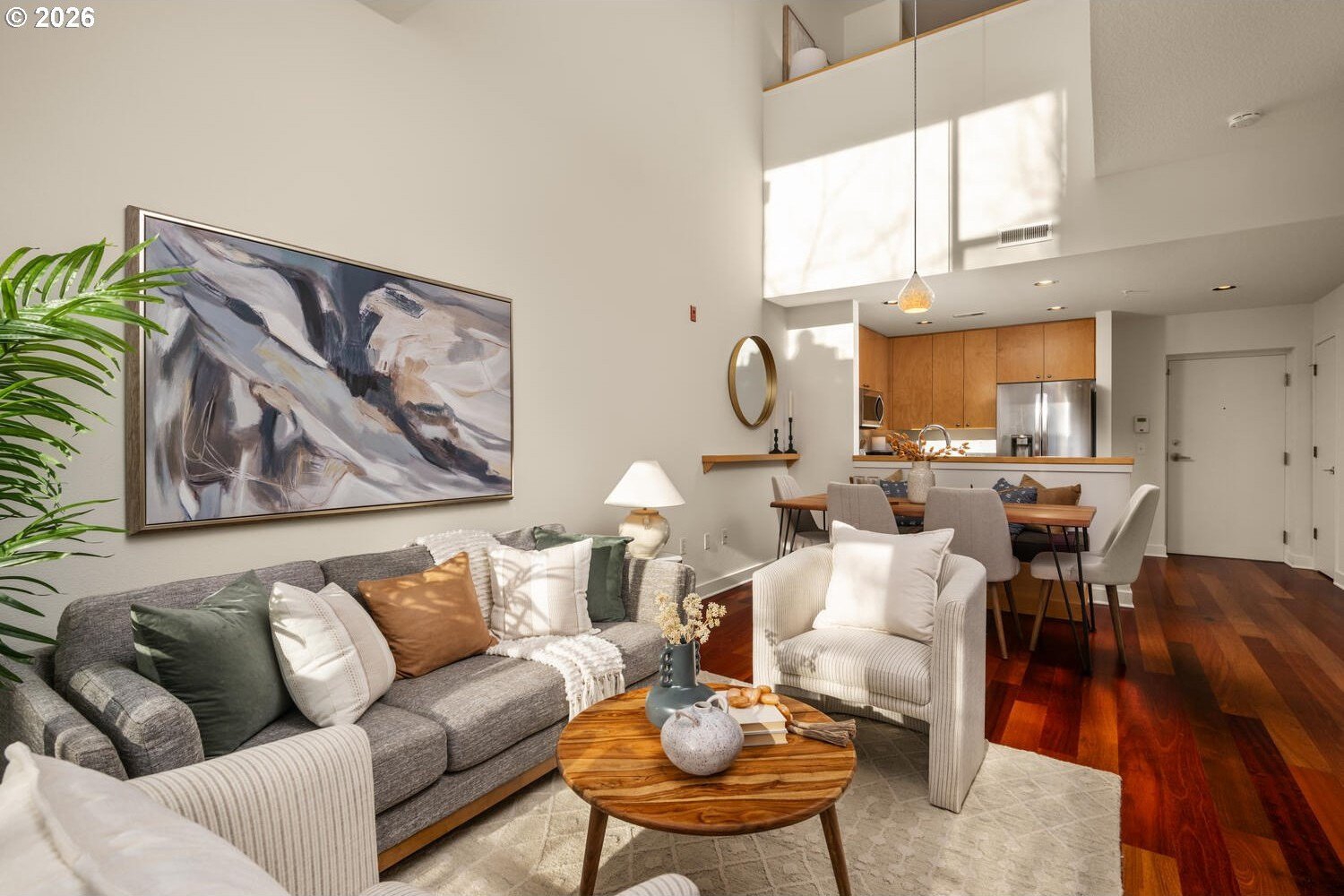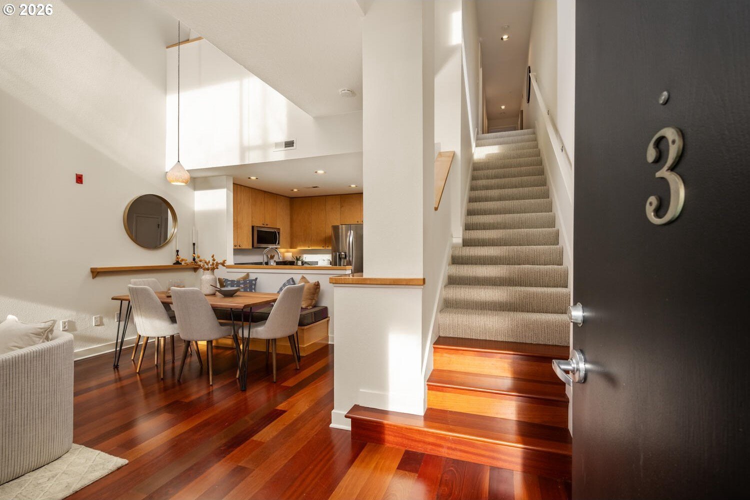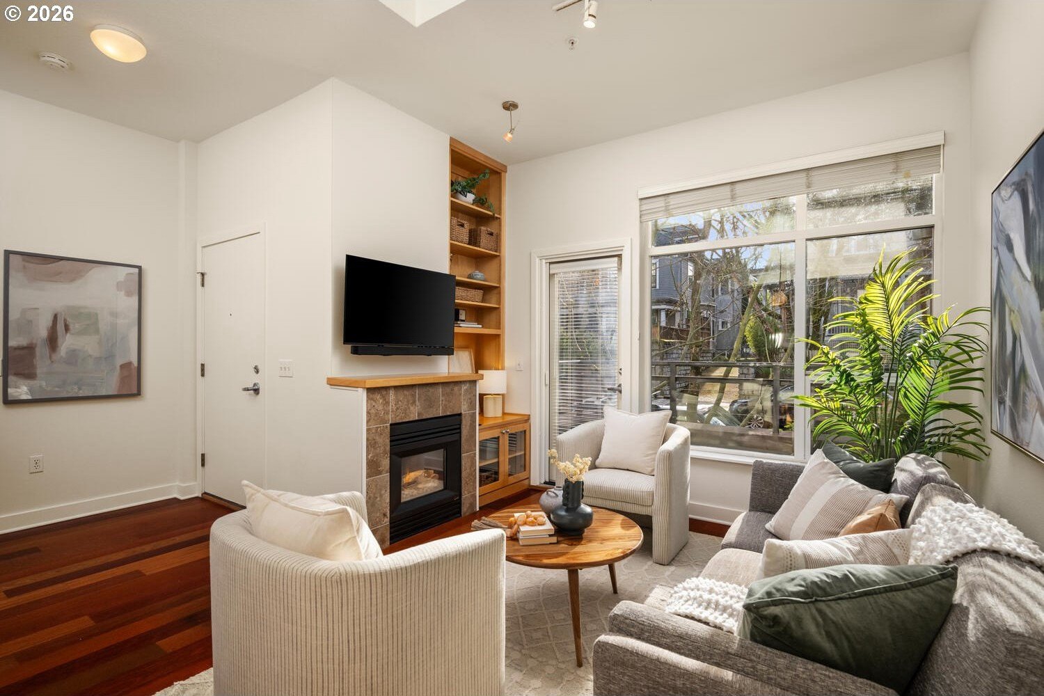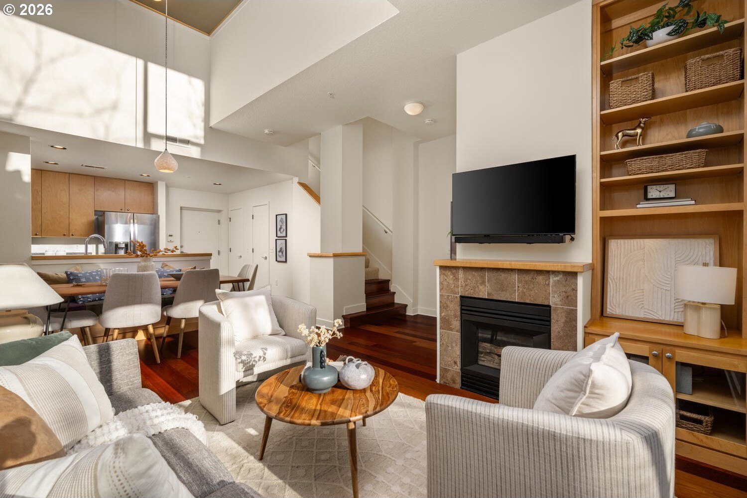 Exceptional townhome-style condominium at Northrup Commons that truly lives and feels like a detached home. With its own private street-level entrance, multi-level layout, and direct interior access to an assigned secure parking space just steps from the kitchen, this residence offers the privacy, separation of space, and day-to-day ease typically found in single-family living-without the maintenance. Designed by award-winning Sienna Architects, the home features north and south exposures, soaring 19-foot lofted ceilings, and an open-concept main living level filled with natural light. Interior highlights include cherry hardwood floors, a gas fireplace with custom built-ins, granite tile kitchen counters, maple cabinetry, newer stainless steel appliances, and in-unit laundry. Three private decks totaling approx. 189 SF extend the living space outdoors. Two bedrooms and two full baths, including a generous primary suite with walk-in closet and soaking tub. Recent paint and carpet throughout. Enjoy views of NW Portland, the West Hills, Mt. St. Helens, and the Fremont Bridge. Walk Score 96, just blocks to NW 23rd Ave shops, dining, parks, and transit.
