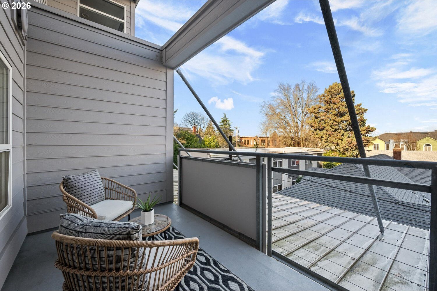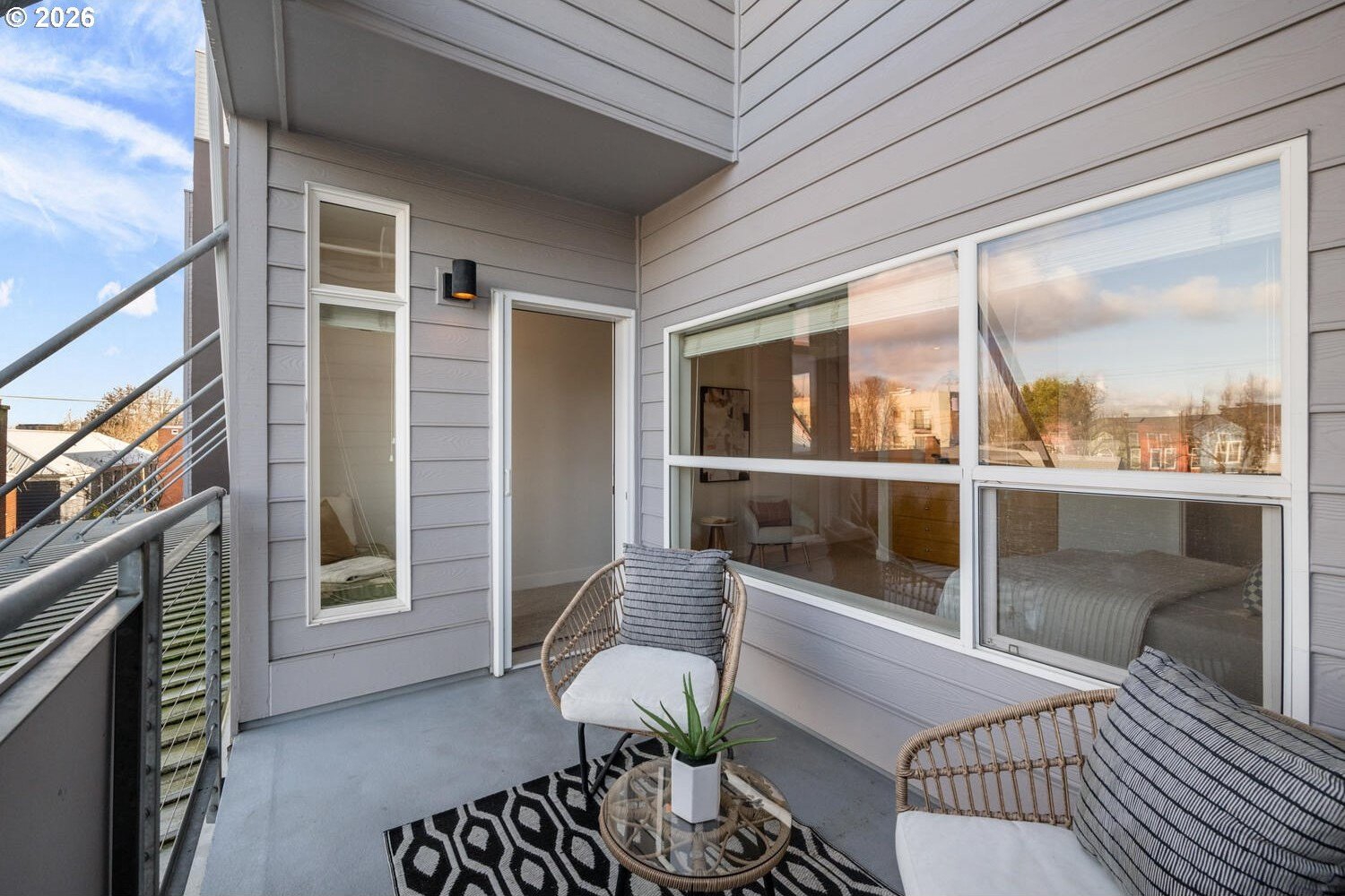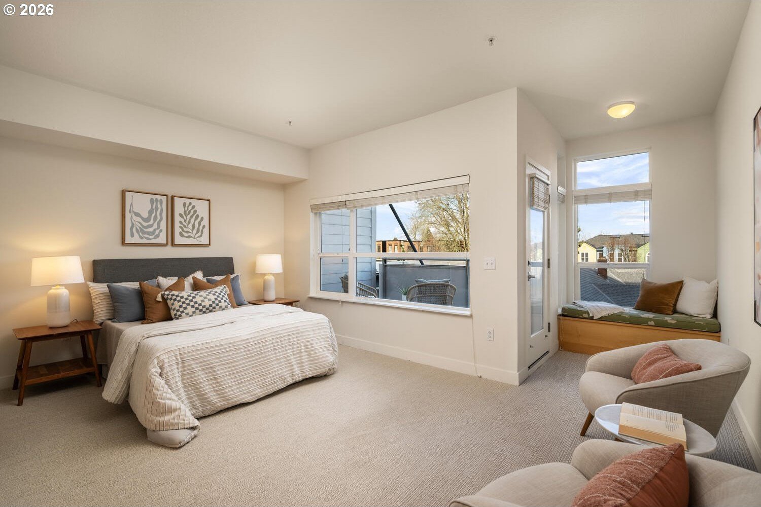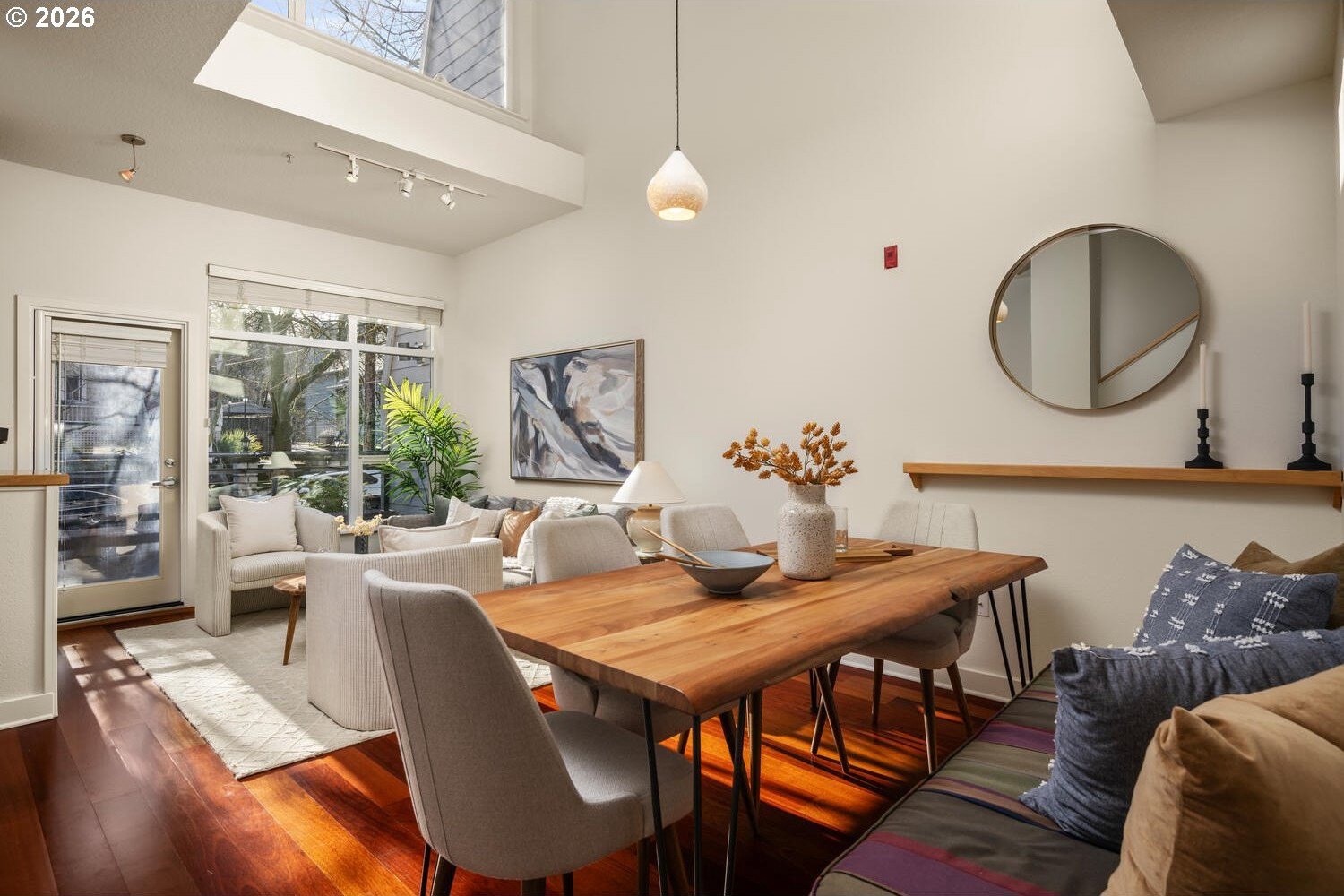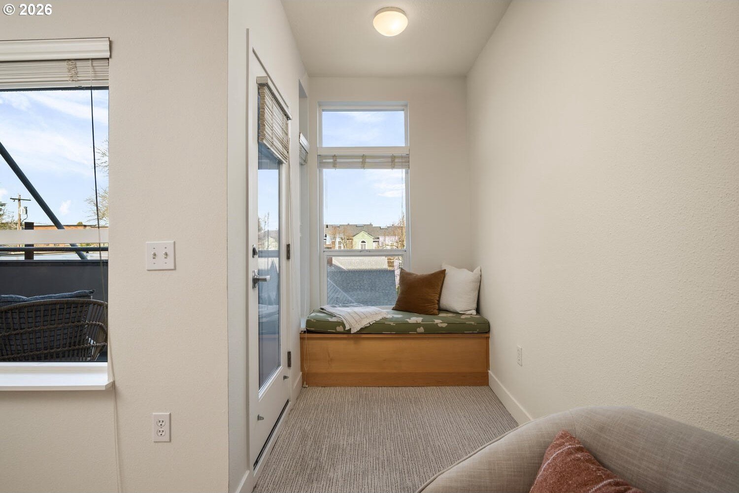 Exceptional townhome-style condominium at Northrup Commons that truly lives and feels like a detached home. With its own private street-level entrance, multi-level layout, and direct interior access to an assigned secure parking space just steps from the kitchen, this residence offers the privacy, separation of space, and day-to-day ease typically found in single-family living-without the maintenance. Designed by award-winning Sienna Architects, the home features north and south exposures, soaring 19-foot lofted ceilings, and an open-concept main living level filled with natural light. Interior highlights include cherry hardwood floors, a gas fireplace with custom built-ins, granite tile kitchen counters, maple cabinetry, newer stainless steel appliances, and in-unit laundry. Three private decks totaling approx. 189 SF extend the living space outdoors. Two bedrooms and two full baths, including a generous primary suite with walk-in closet and soaking tub. Recent paint and carpet throughout. Enjoy views of NW Portland, the West Hills, Mt. St. Helens, and the Fremont Bridge. Walk Score 96, just blocks to NW 23rd Ave shops, dining, parks, and transit.