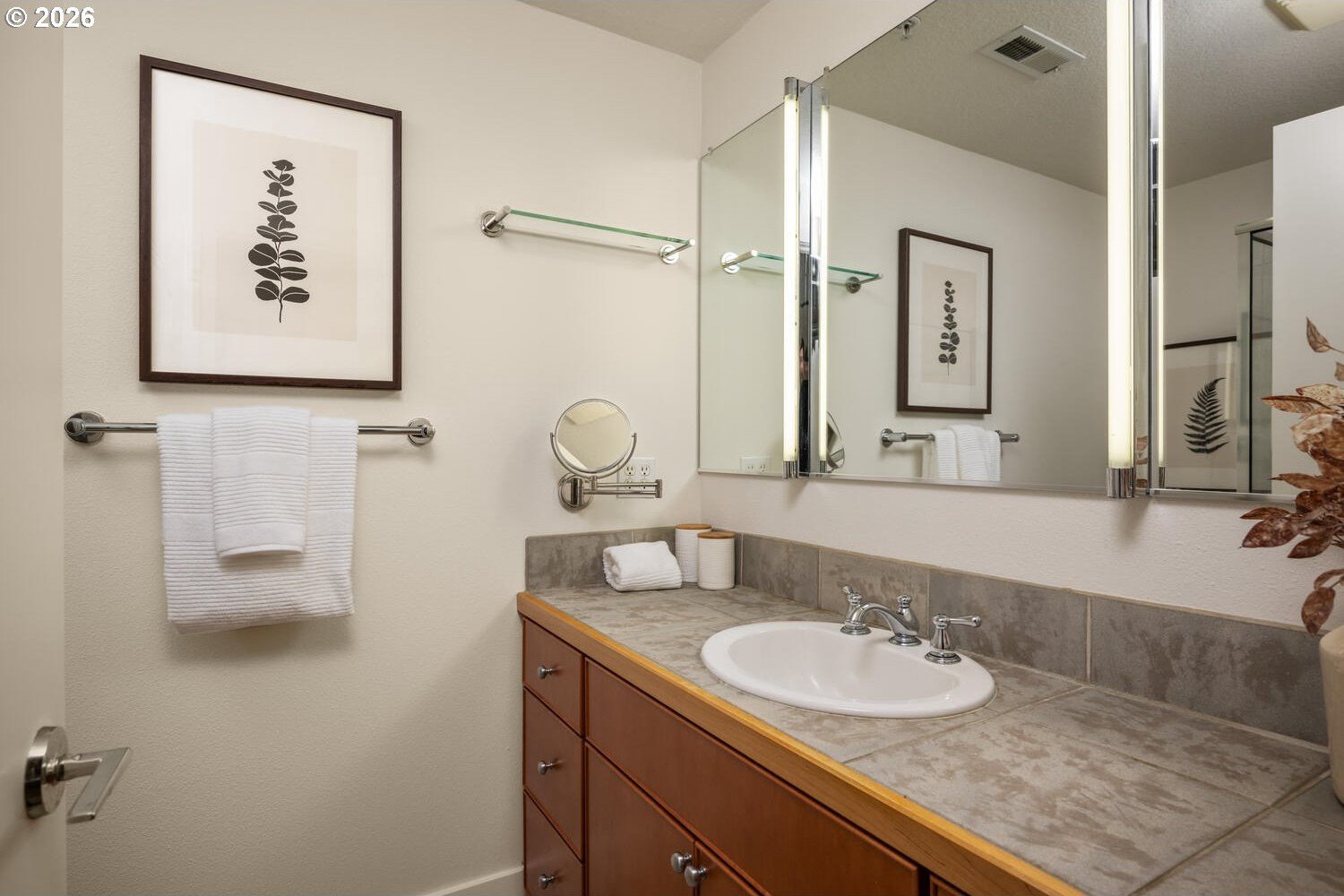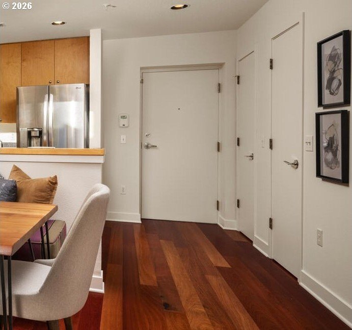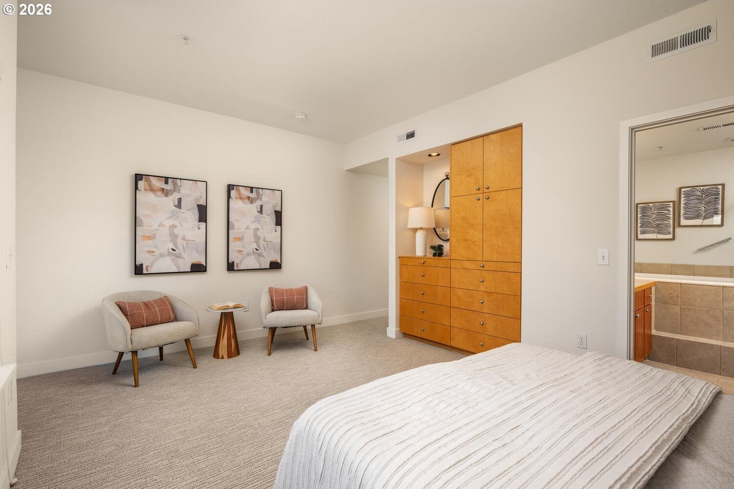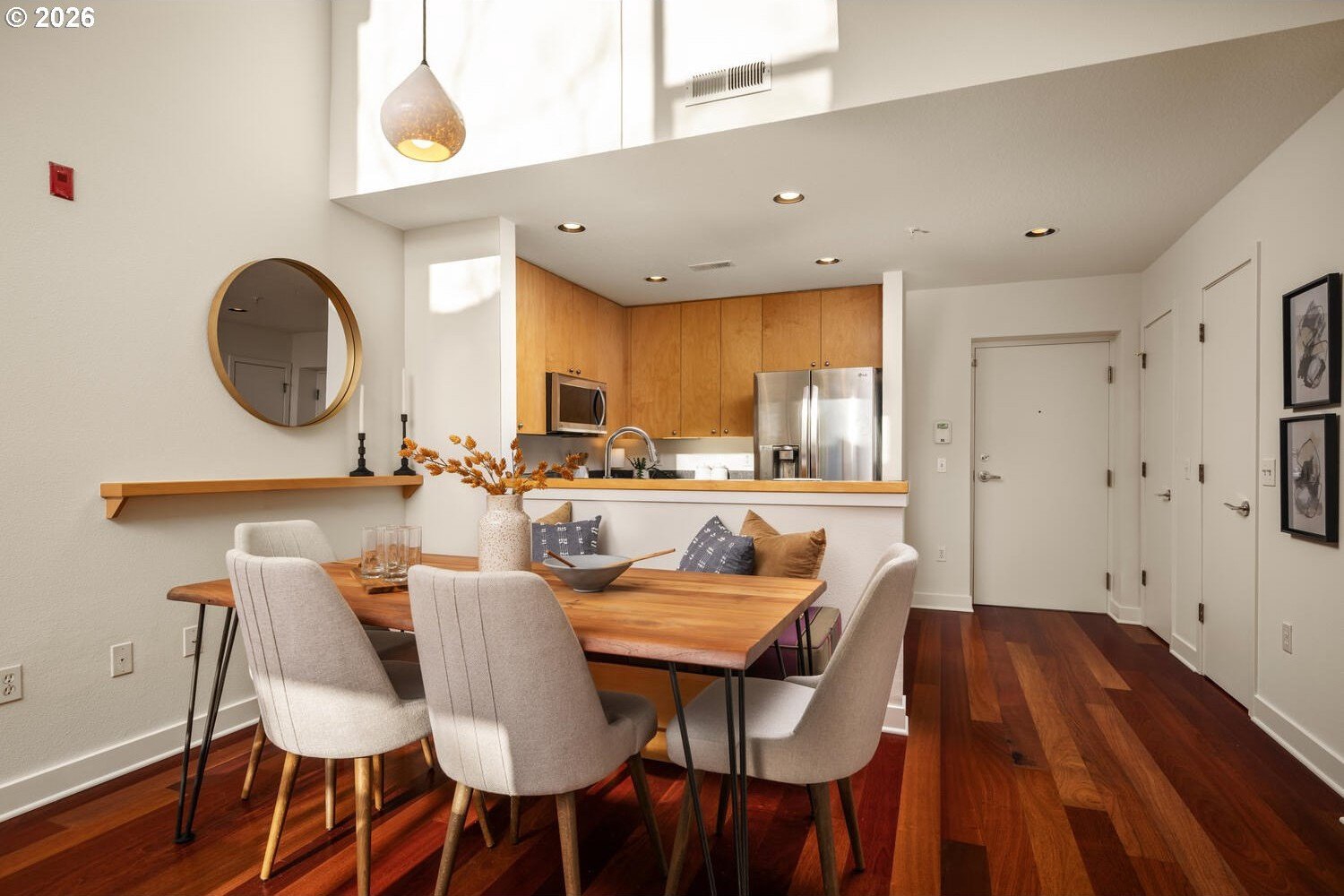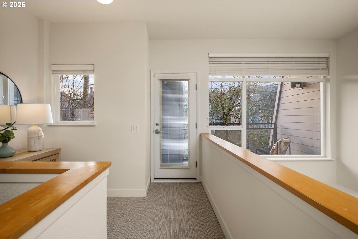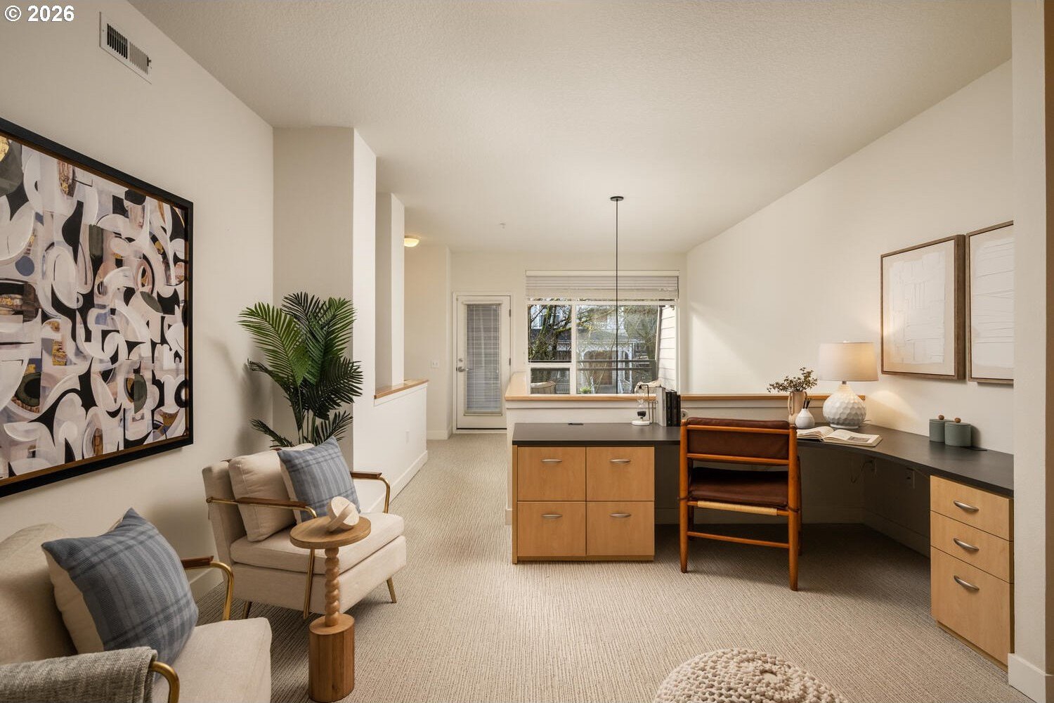Exceptional townhome-style condominium at Northrup Commons that truly lives and feels like a detached home. With its own private street-level entrance, multi-level layout, and direct interior access to an assigned secure parking space just steps from the kitchen, this residence offers the privacy, separation of space, and day-to-day ease typically found in single-family living-without the maintenance. Designed by award-winning Sienna Architects, the home features north and south exposures, soaring 19-foot lofted ceilings, and an open-concept main living level filled with natural light. Interior highlights include cherry hardwood floors, a gas fireplace with custom built-ins, granite tile kitchen counters, maple cabinetry, newer stainless steel appliances, and in-unit laundry. Three private decks totaling approx. 189 SF extend the living space outdoors. Two bedrooms and two full baths, including a generous primary suite with walk-in closet and soaking tub. Recent paint and carpet throughout. Enjoy views of NW Portland, the West Hills, Mt. St. Helens, and the Fremont Bridge. Walk Score 96, just blocks to NW 23rd Ave shops, dining, parks, and transit.
