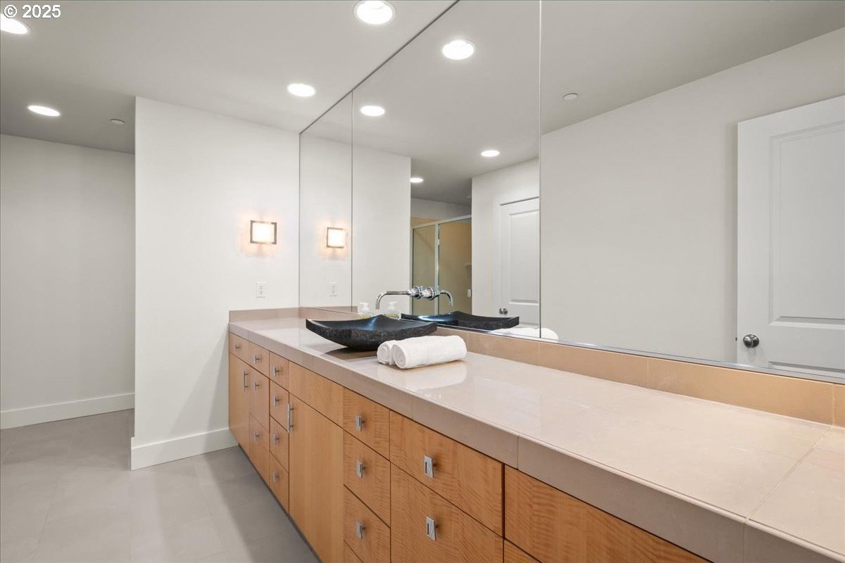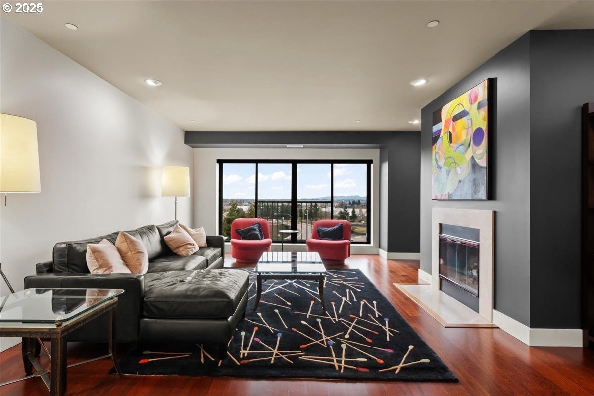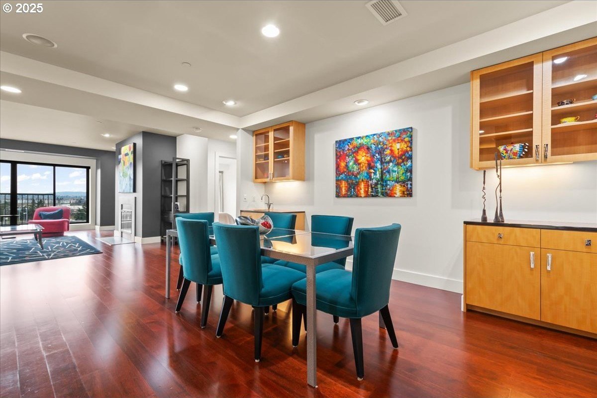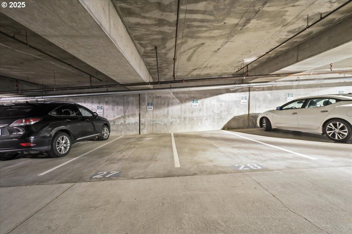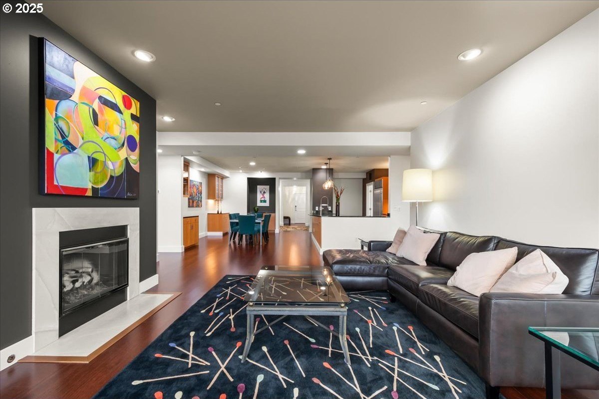 Take in spectacular views of sunsets, the Columbia River, and Portland city lights, from this spacious, one level condo that is move-in ready with a recently painted interior. Enjoy the conveniences of living in downtown Vancouver & the secure and easy lifestyle of being able to lock your door and leave for extended periods of time. Visiting the Vancouver Farmers Market will become a weekly ritual, as well as stopping by your favorite Barista for your morning cup of coffee. Create lifetime memories with family & friends when you explore the downtown Waterfront’s walking and biking paths, fine dining & wine tasting at numerous restaurants & wineries, or shopping at the local boutiques. As you enter the condo, you’ll be drawn to the spacious great room with a wall of floor-ceiling windows that overlook the view. A cozy gas fireplace is a secondary focal point and can be enjoyed from the dining room and kitchen. Entertainers will delight with the size of the dining room that can accommodate an extra-long table for large gatherings or scale it down for more intimate gathers. There is plenty of storage space with built-in cabinets, upper cabinets with glass fronts for displaying your fine glass ware, and a convenient corner wet bar. The kitchen is well appointed with ample cabinet and counter space. Slab granite counter tops, stainless steel appliances, gas range with custom hood fan give the room a sleek look. Spacious bar counter is perfect for a morning breakfast bar or extra seating for guests. The primary bedroom is situated for privacy and a wall of windows overlook the view. Spacious walk-in closet with organizer offers plenty storage and ensuite bath has a second small walk-in closet, & walk-in shower with tile surround. Second bedroom has a wall of windows overlooking the view and across the hallway from full bath. Bonus room, currently used as a TV room, offers flex space. Gated, secured parking in basement, 2 deeded parking spots & deeded walk-in storage.