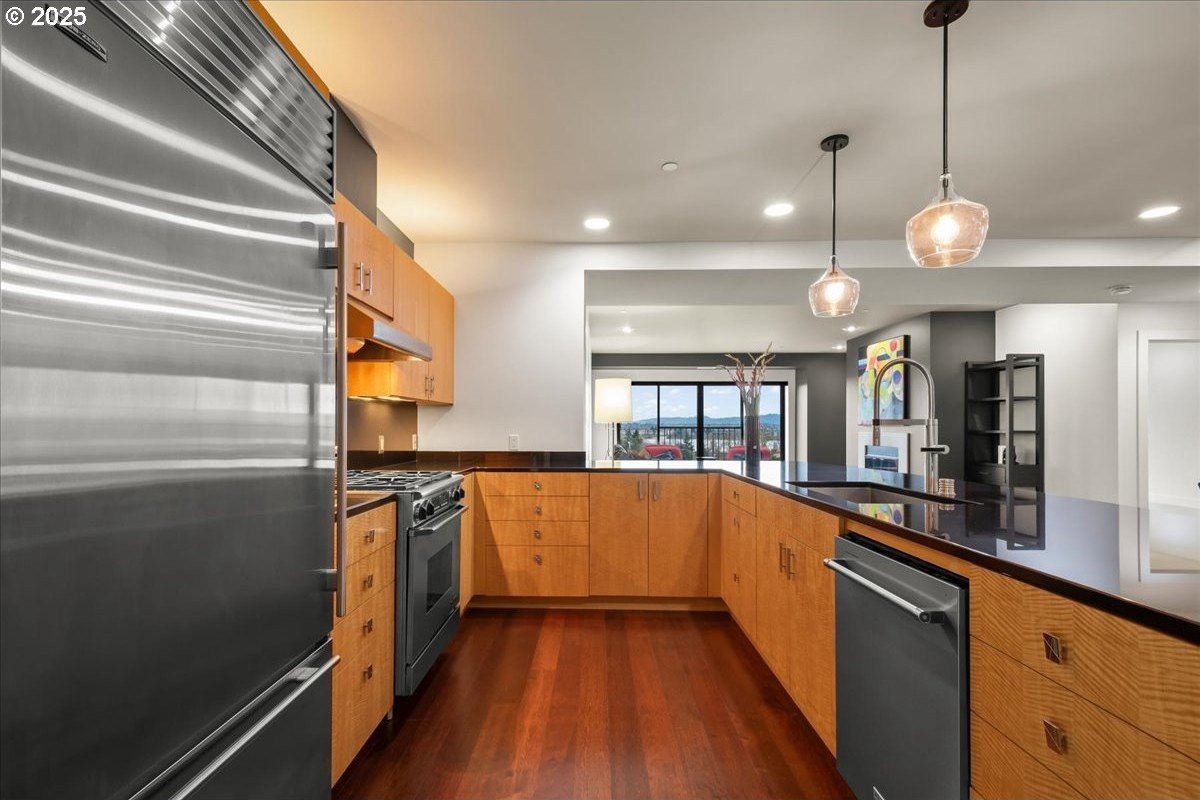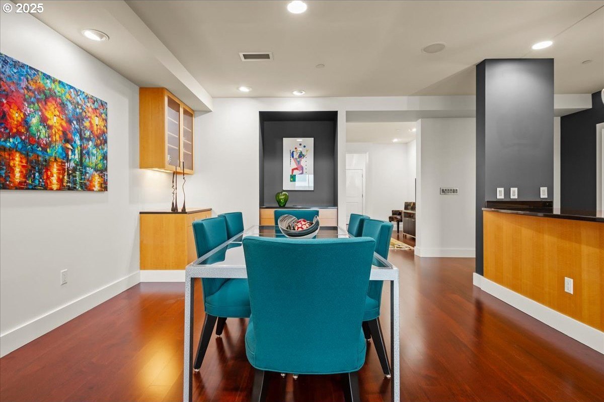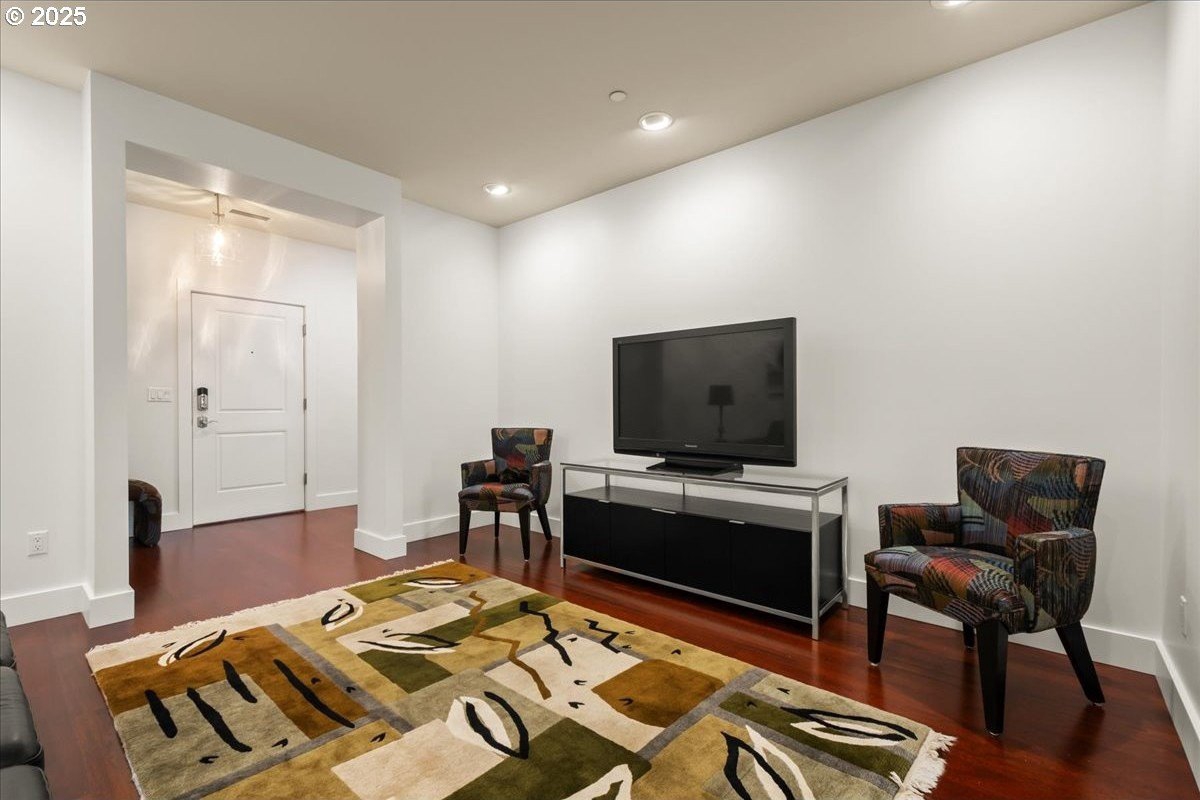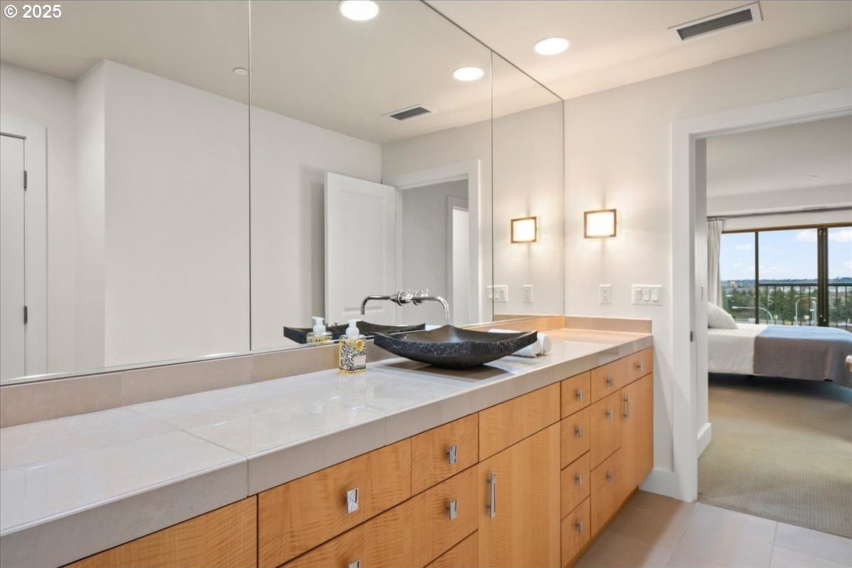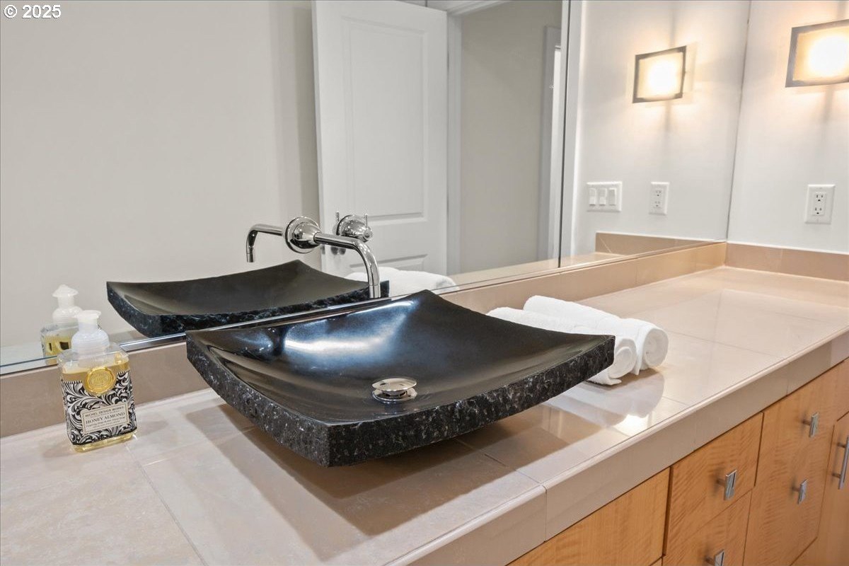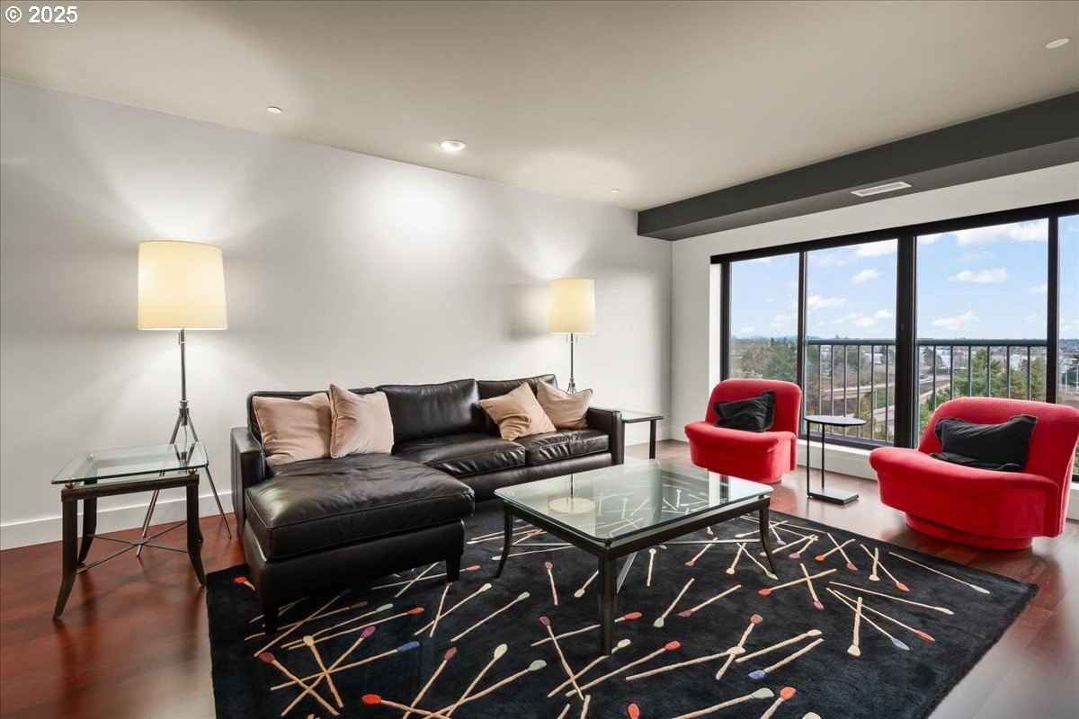 Take in spectacular views of sunsets, the Columbia River, and Portland city lights, from this spacious, one level condo that is move-in ready with a recently painted interior. Enjoy the conveniences of living in downtown Vancouver & the secure and easy lifestyle of being able to lock your door and leave for extended periods of time. Visiting the Vancouver Farmers Market will become a weekly ritual, as well as stopping by your favorite Barista for your morning cup of coffee. Create lifetime memories with family & friends when you explore the downtown Waterfront’s walking and biking paths, fine dining & wine tasting at numerous restaurants & wineries, or shopping at the local boutiques. As you enter the condo, you’ll be drawn to the spacious great room with a wall of floor-ceiling windows that overlook the view. A cozy gas fireplace is a secondary focal point and can be enjoyed from the dining room and kitchen. Entertainers will delight with the size of the dining room that can accommodate an extra-long table for large gatherings or scale it down for more intimate gathers. There is plenty of storage space with built-in cabinets, upper cabinets with glass fronts for displaying your fine glass ware, and a convenient corner wet bar. The kitchen is well appointed with ample cabinet and counter space. Slab granite counter tops, stainless steel appliances, gas range with custom hood fan give the room a sleek look. Spacious bar counter is perfect for a morning breakfast bar or extra seating for guests. The primary bedroom is situated for privacy and a wall of windows overlook the view. Spacious walk-in closet with organizer offers plenty storage and ensuite bath has a second small walk-in closet, & walk-in shower with tile surround. Second bedroom has a wall of windows overlooking the view and across the hallway from full bath. Bonus room, currently used as a TV room, offers flex space. Gated, secured parking in basement, 2 deeded parking spots & deeded walk-in storage.