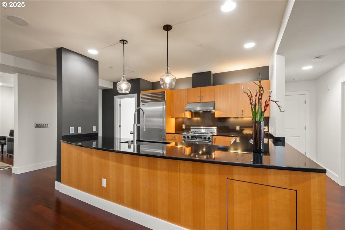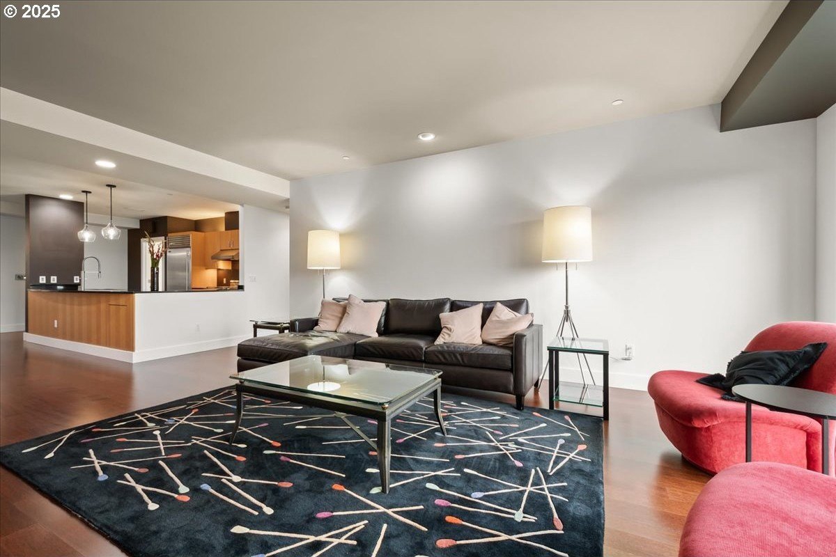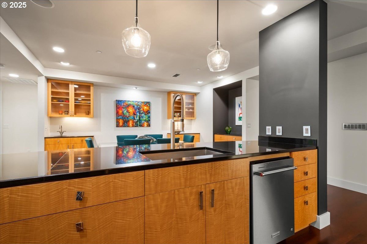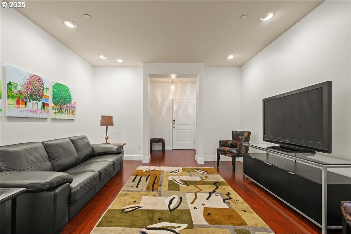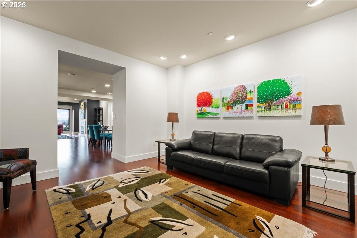 Take in spectacular views of sunsets, the Columbia River, and Portland city lights, from this spacious, one level condo that is move-in ready with a recently painted interior. Enjoy the conveniences of living in downtown Vancouver & the secure and easy lifestyle of being able to lock your door and leave for extended periods of time. Visiting the Vancouver Farmers Market will become a weekly ritual, as well as stopping by your favorite Barista for your morning cup of coffee. Create lifetime memories with family & friends when you explore the downtown Waterfront’s walking and biking paths, fine dining & wine tasting at numerous restaurants & wineries, or shopping at the local boutiques. As you enter the condo, you’ll be drawn to the spacious great room with a wall of floor-ceiling windows that overlook the view. A cozy gas fireplace is a secondary focal point and can be enjoyed from the dining room and kitchen. Entertainers will delight with the size of the dining room that can accommodate an extra-long table for large gatherings or scale it down for more intimate gathers. There is plenty of storage space with built-in cabinets, upper cabinets with glass fronts for displaying your fine glass ware, and a convenient corner wet bar. The kitchen is well appointed with ample cabinet and counter space. Slab granite counter tops, stainless steel appliances, gas range with custom hood fan give the room a sleek look. Spacious bar counter is perfect for a morning breakfast bar or extra seating for guests. The primary bedroom is situated for privacy and a wall of windows overlook the view. Spacious walk-in closet with organizer offers plenty storage and ensuite bath has a second small walk-in closet, & walk-in shower with tile surround. Second bedroom has a wall of windows overlooking the view and across the hallway from full bath. Bonus room, currently used as a TV room, offers flex space. Gated, secured parking in basement, 2 deeded parking spots & deeded walk-in storage.