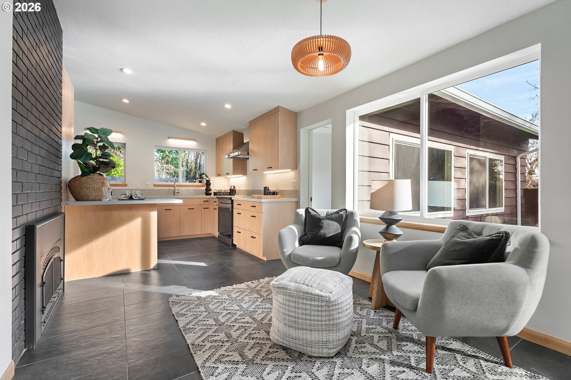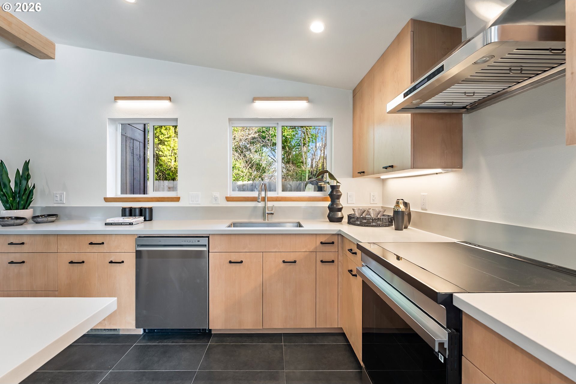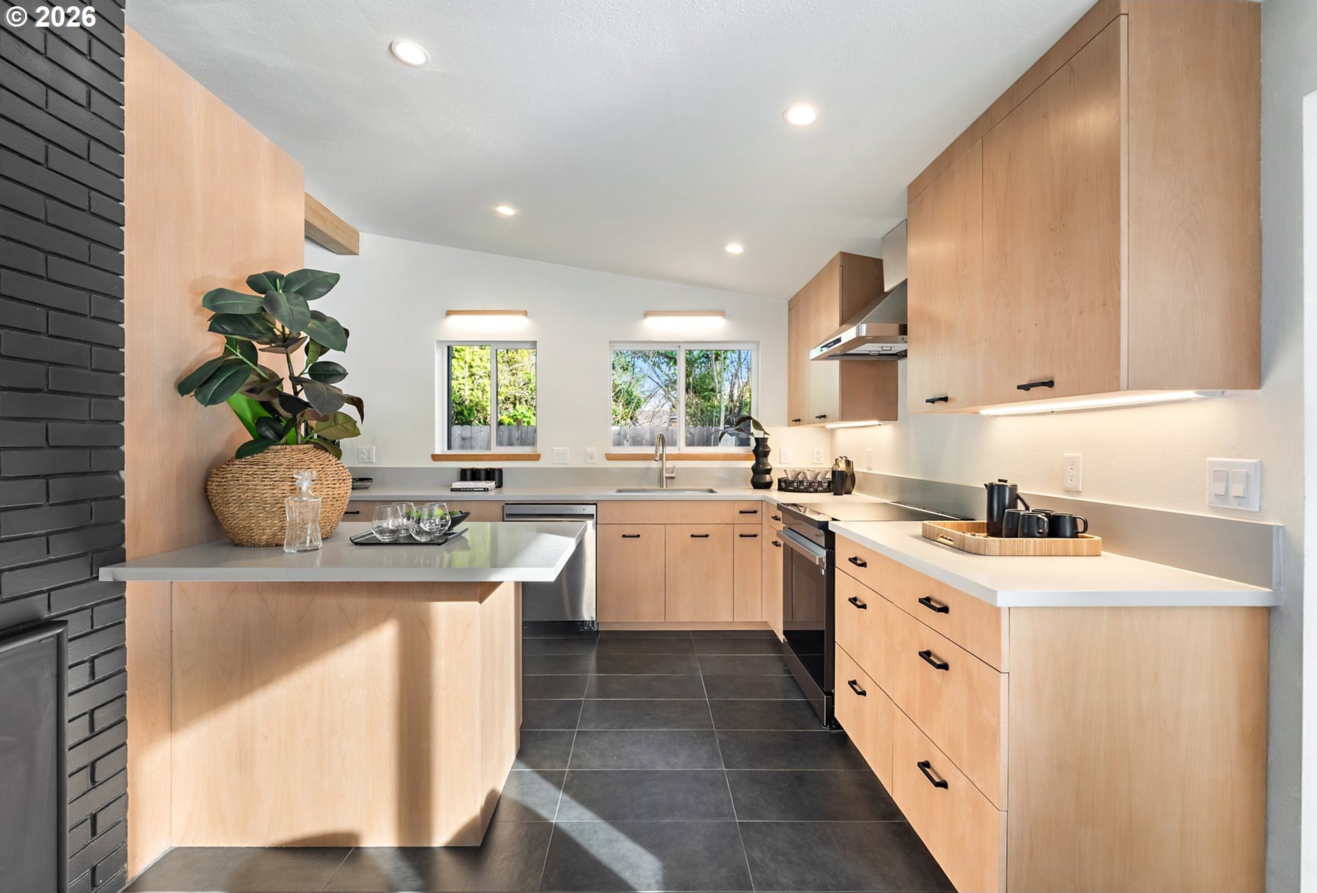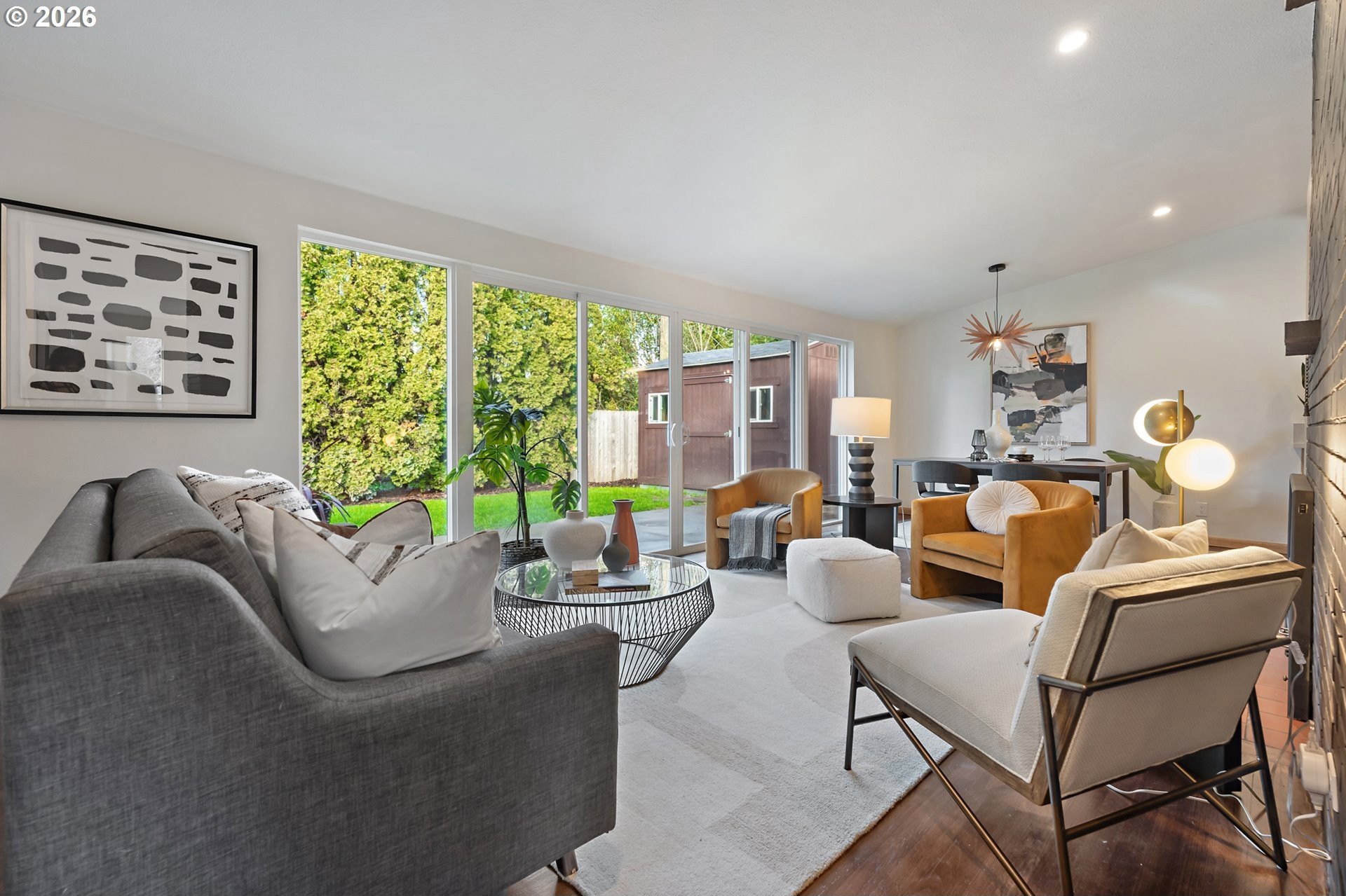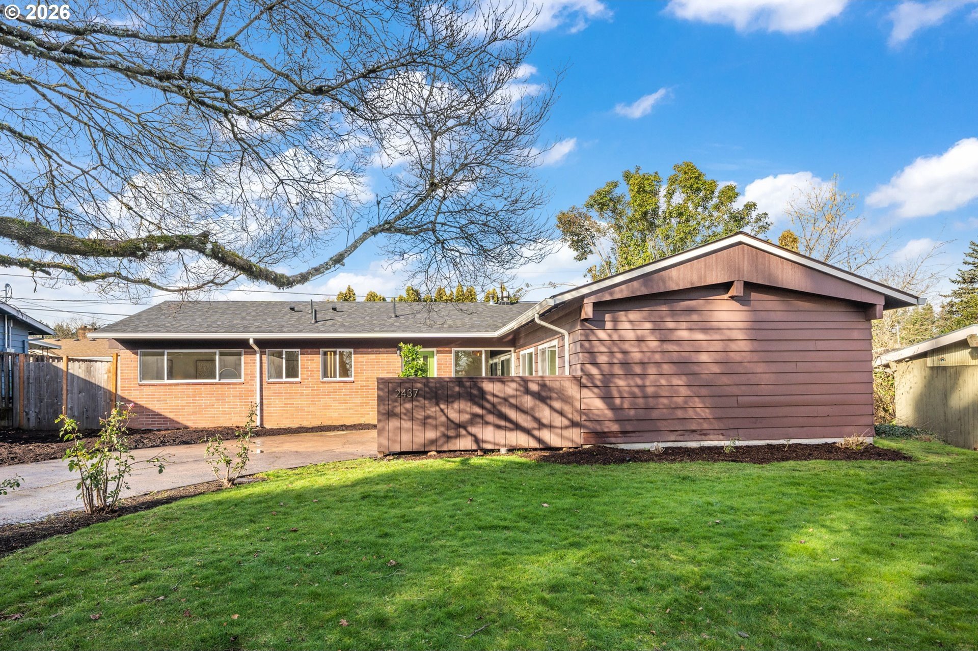 Meticulously updated 1956 mid-century modern ranch with contemporary finishes. Original hardwood floors, period double fireplace, vaulted ceilings. Beautifully remodeled kitchen with custom solid wood cabinets, quartz counters, large pantry, and stainless-steel appliances, including a built-in induction range that flows to a cozy family room and spacious entry. The light and airy living & dining space opens to the fully fenced back yard with an expansive patio that is perfect for outdoor entertaining. A total of four bedrooms and three full baths, including a primary suite with a vaulted tongue and groove wood ceiling, double closets, walk-in shower and custom tile work. A second primary also offers a vaulted ceiling, a walk-in shower and custom tile work. New windows, roof, plumbing, updated electrical, interior and exterior paint, and furnace. The home offers a large tool/garden shed and enclosed exterior storage area on the north side of the home. [Home Energy Score = 1. HES Report