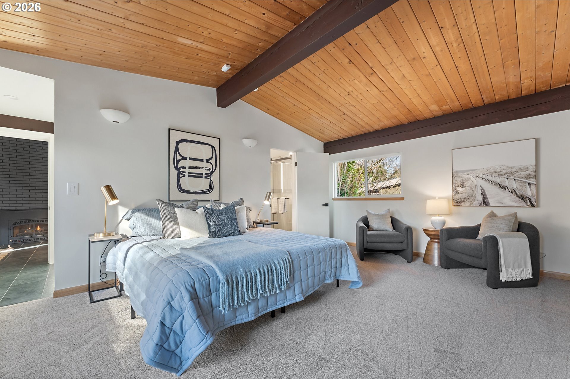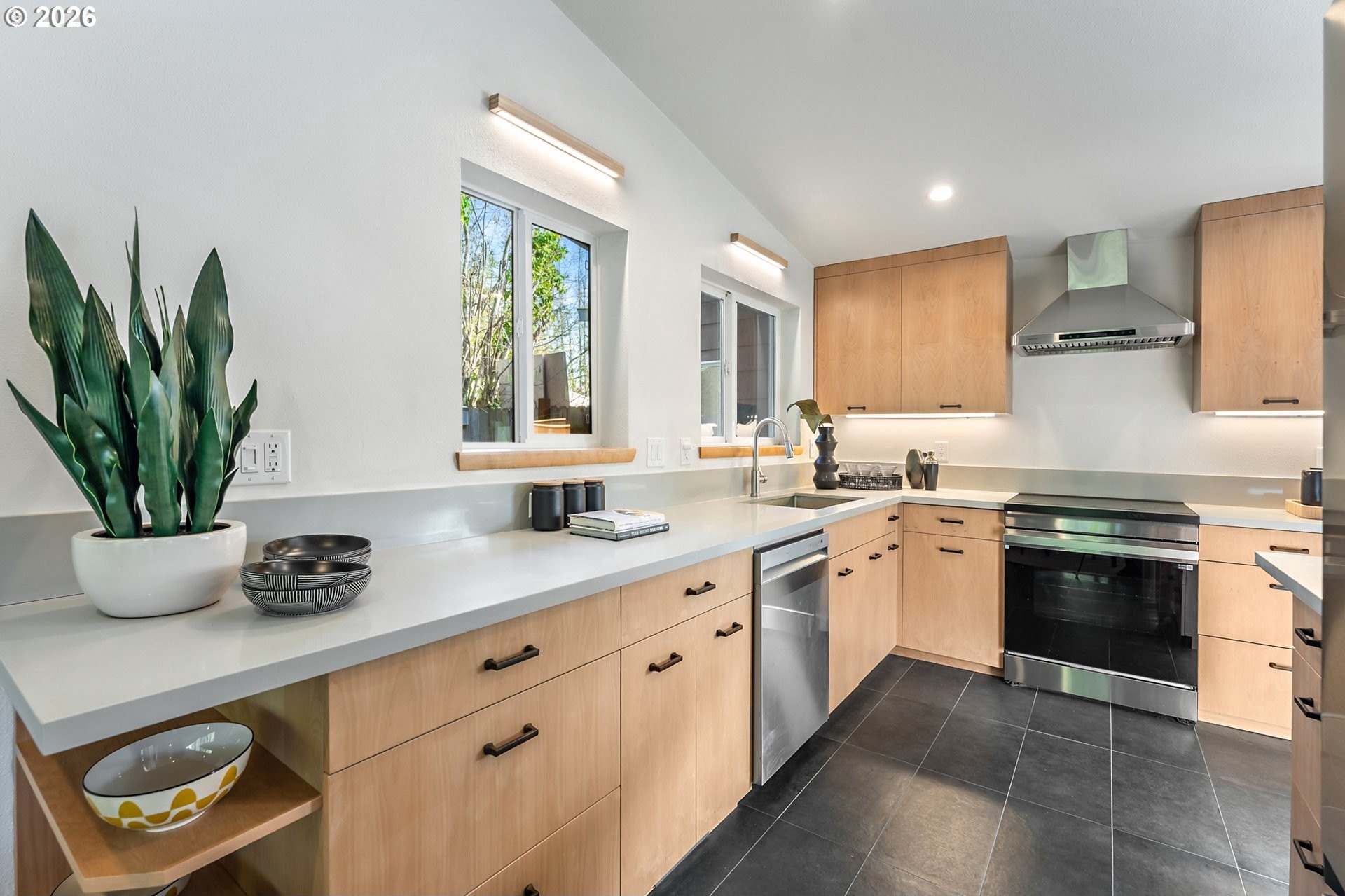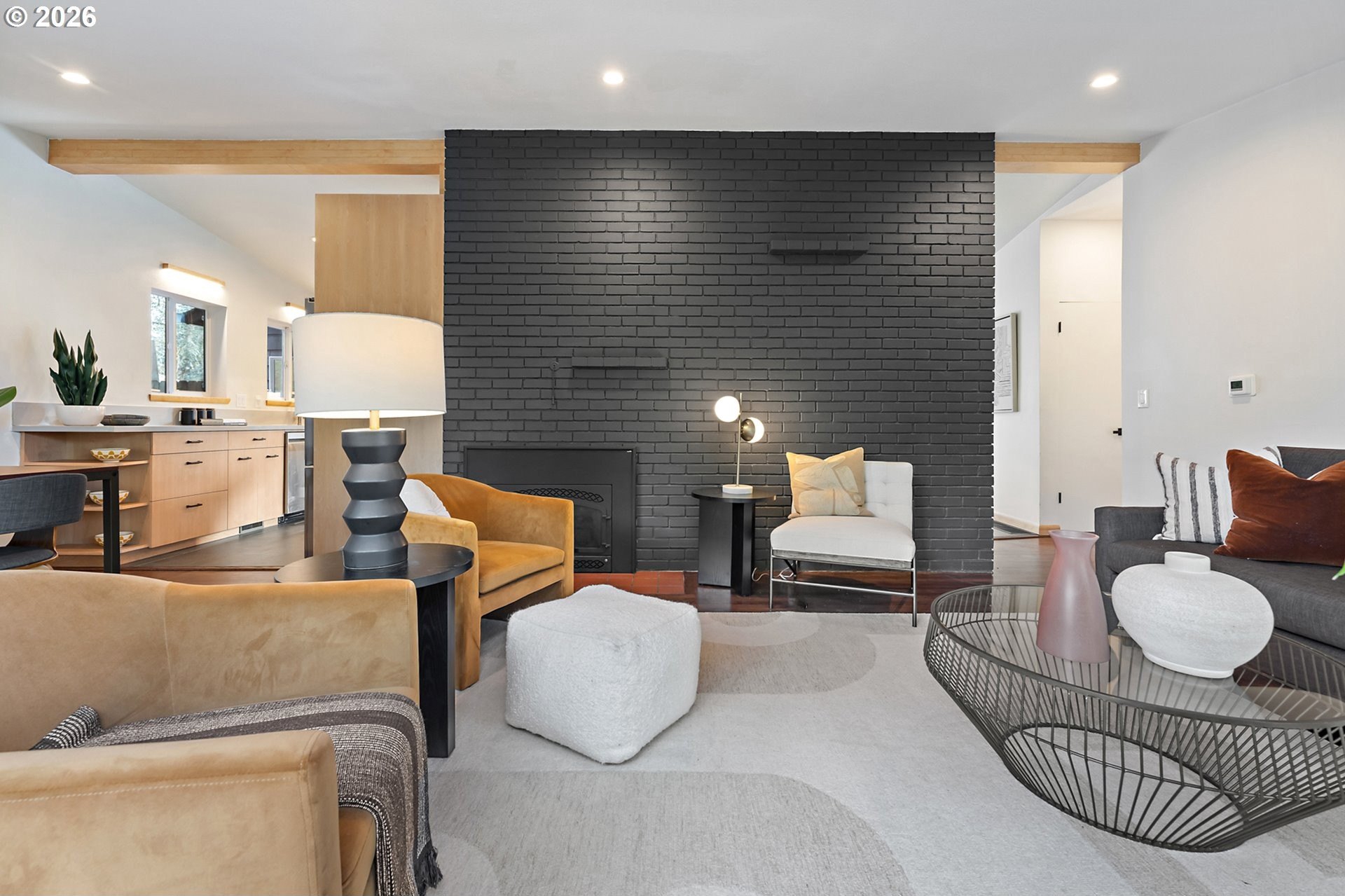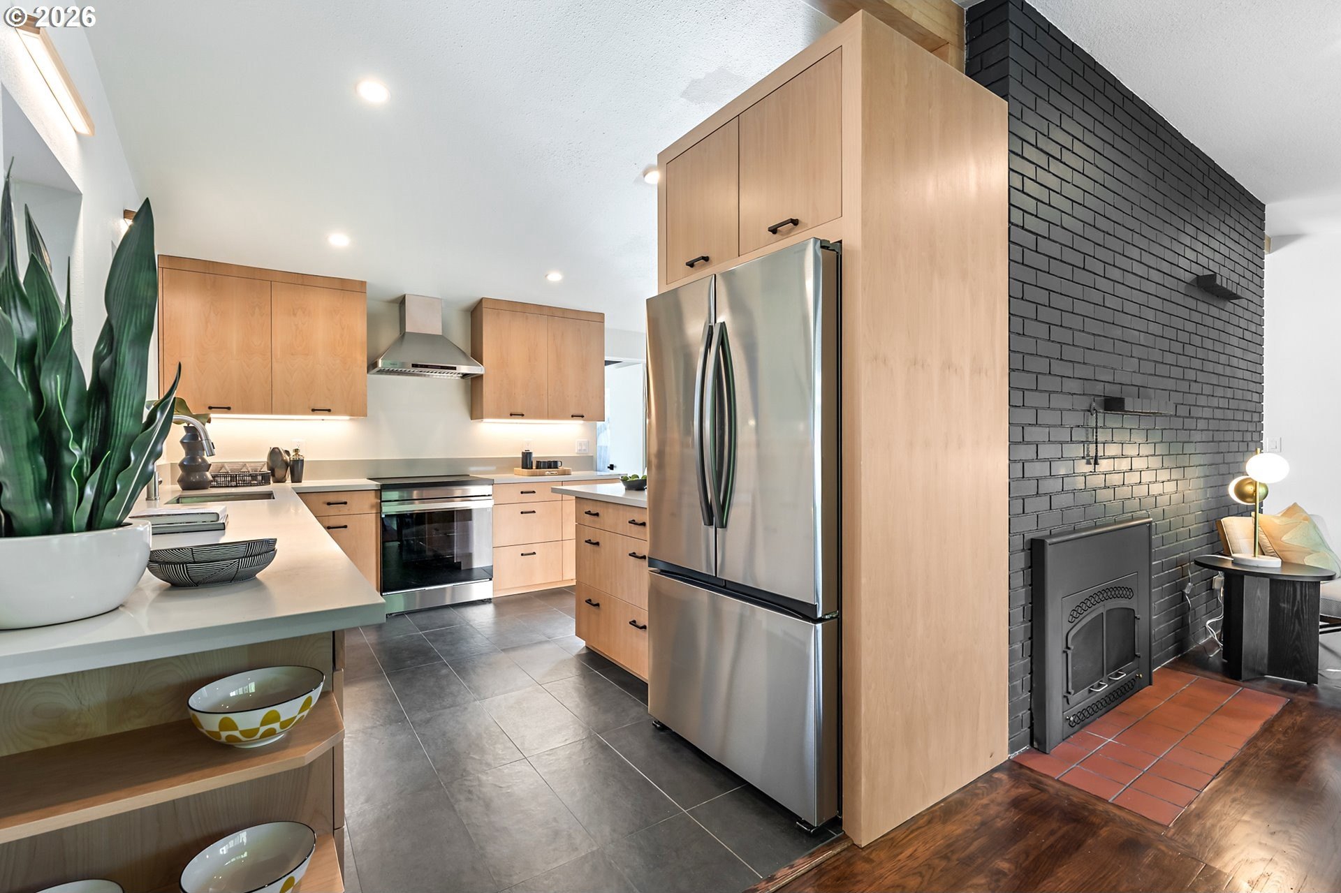 Meticulously updated 1956 mid-century modern ranch with contemporary finishes. Original hardwood floors, period double fireplace, vaulted ceilings. Beautifully remodeled kitchen with custom solid wood cabinets, quartz counters, large pantry, and stainless-steel appliances, including a built-in induction range that flows to a cozy family room and spacious entry. The light and airy living & dining space opens to the fully fenced back yard with an expansive patio that is perfect for outdoor entertaining. A total of four bedrooms and three full baths, including a primary suite with a vaulted tongue and groove wood ceiling, double closets, walk-in shower and custom tile work. A second primary also offers a vaulted ceiling, a walk-in shower and custom tile work. New windows, roof, plumbing, updated electrical, interior and exterior paint, and furnace. The home offers a large tool/garden shed and enclosed exterior storage area on the north side of the home. [Home Energy Score = 1. HES Report
