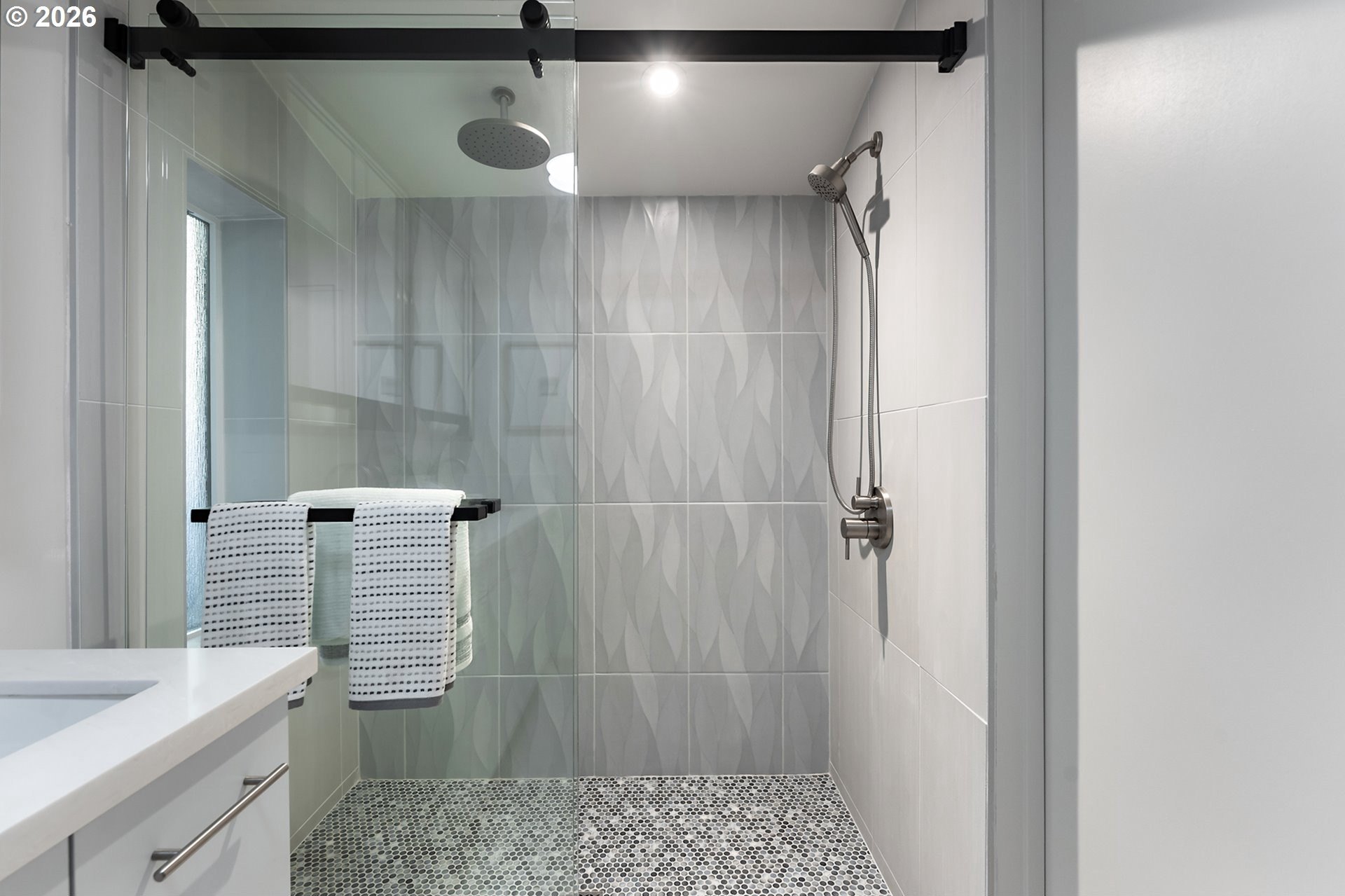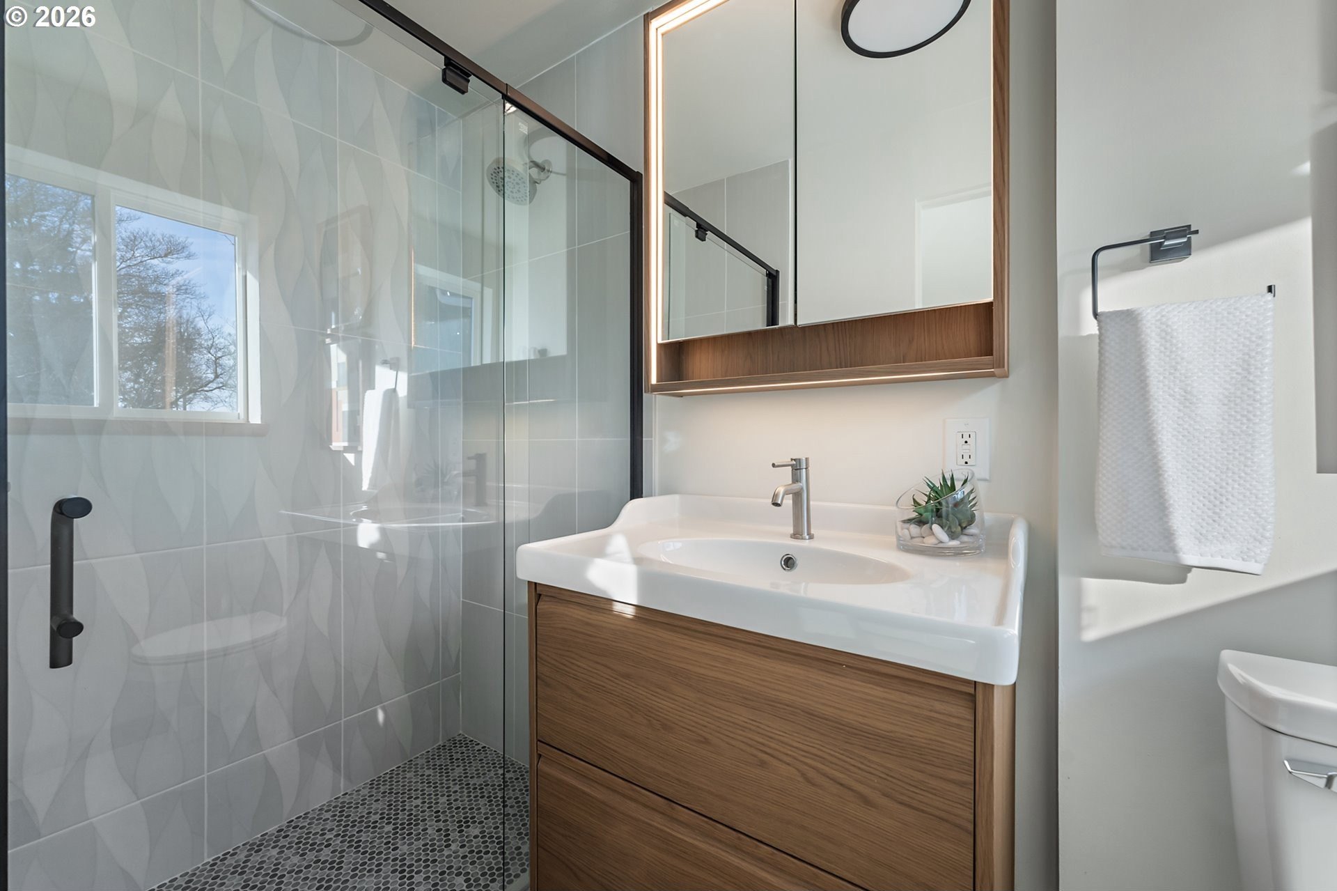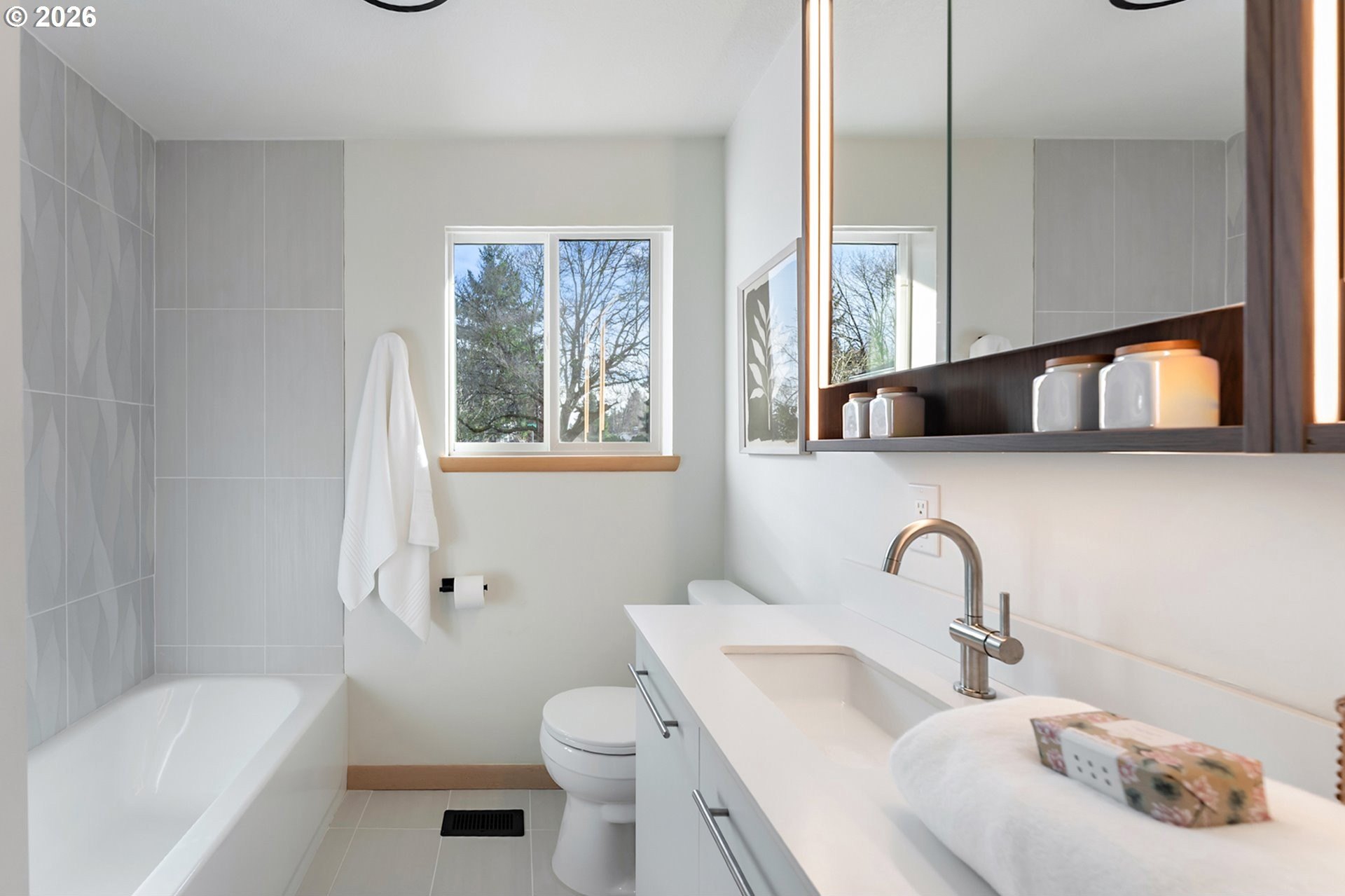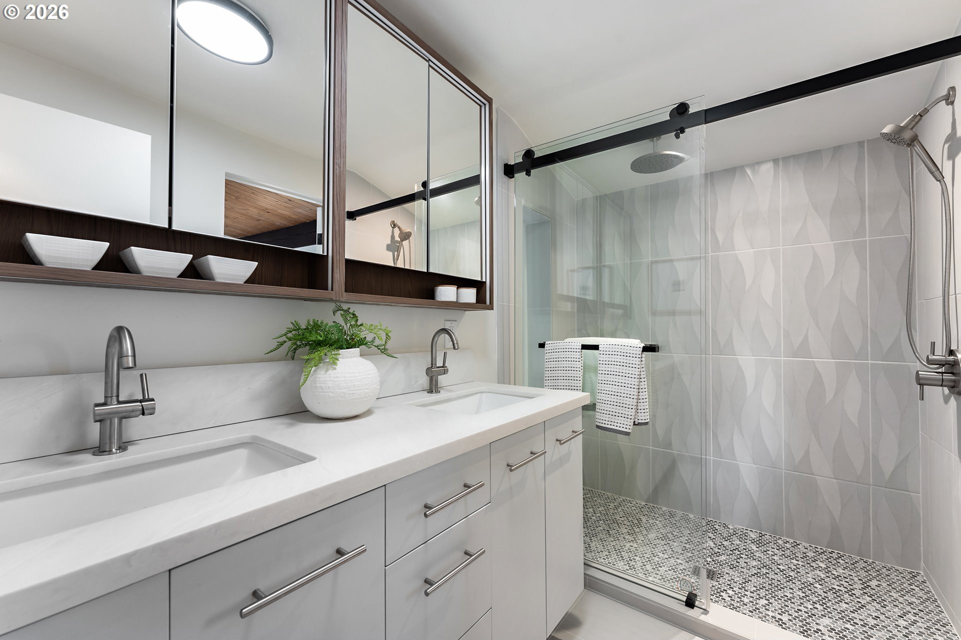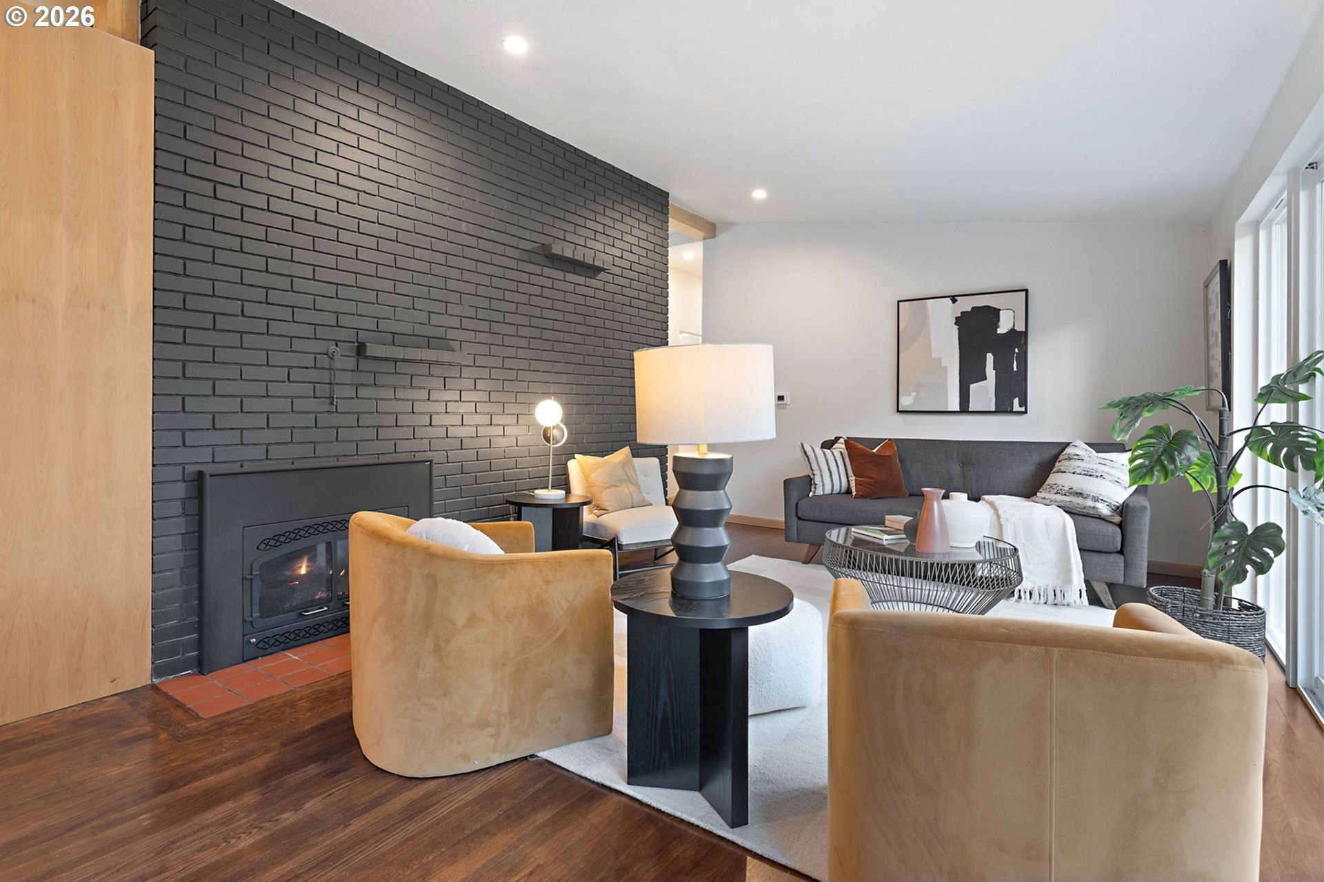 Meticulously updated 1956 mid-century modern ranch with contemporary finishes. Original hardwood floors, period double fireplace, vaulted ceilings. Beautifully remodeled kitchen with custom solid wood cabinets, quartz counters, large pantry, and stainless-steel appliances, including a built-in induction range that flows to a cozy family room and spacious entry. The light and airy living & dining space opens to the fully fenced back yard with an expansive patio that is perfect for outdoor entertaining. A total of four bedrooms and three full baths, including a primary suite with a vaulted tongue and groove wood ceiling, double closets, walk-in shower and custom tile work. A second primary also offers a vaulted ceiling, a walk-in shower and custom tile work. New windows, roof, plumbing, updated electrical, interior and exterior paint, and furnace. The home offers a large tool/garden shed and enclosed exterior storage area on the north side of the home. [Home Energy Score = 1. HES Report