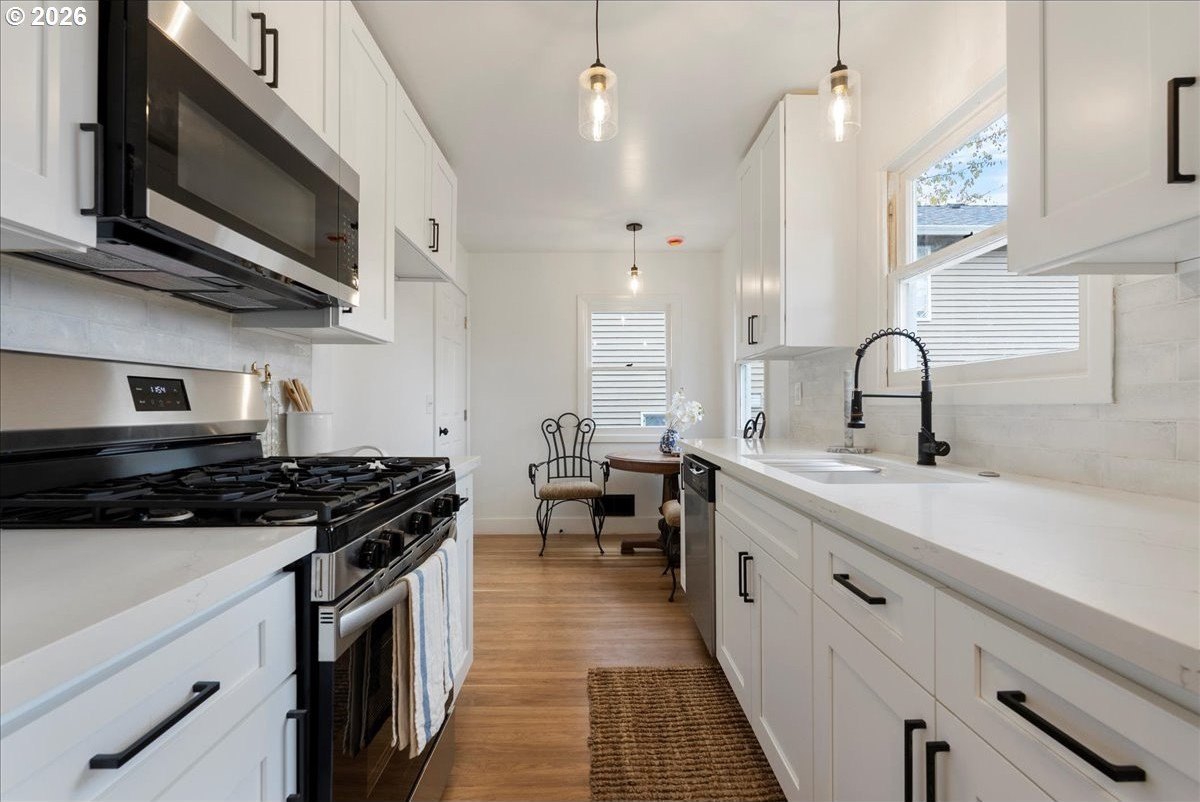 Welcome Home! Step into this beautifully updated mid-century gem featuring 3 bedrooms, 2 full baths, and an unfinished basement ready for your personal touch. Thoughtfully remodeled from top to bottom, this home boasts a new roof and gutters, updated plumbing and electrical panel, and fully renovated kitchen and bathrooms with new cabinetry, stainless steel appliances, and solid-surface countertops. Enjoy the warmth of refinished original hardwood floors throughout and fresh interior and exterior paint. Outside, you'll find a new back deck overlooking the newly landscaped private backyard-perfect for relaxing, gardening, or entertaining outdoors. A one-car garage adds convenience and storage.Located just blocks from Northgate Park, this move-in-ready home perfectly blends mid-century charm with modern updates.