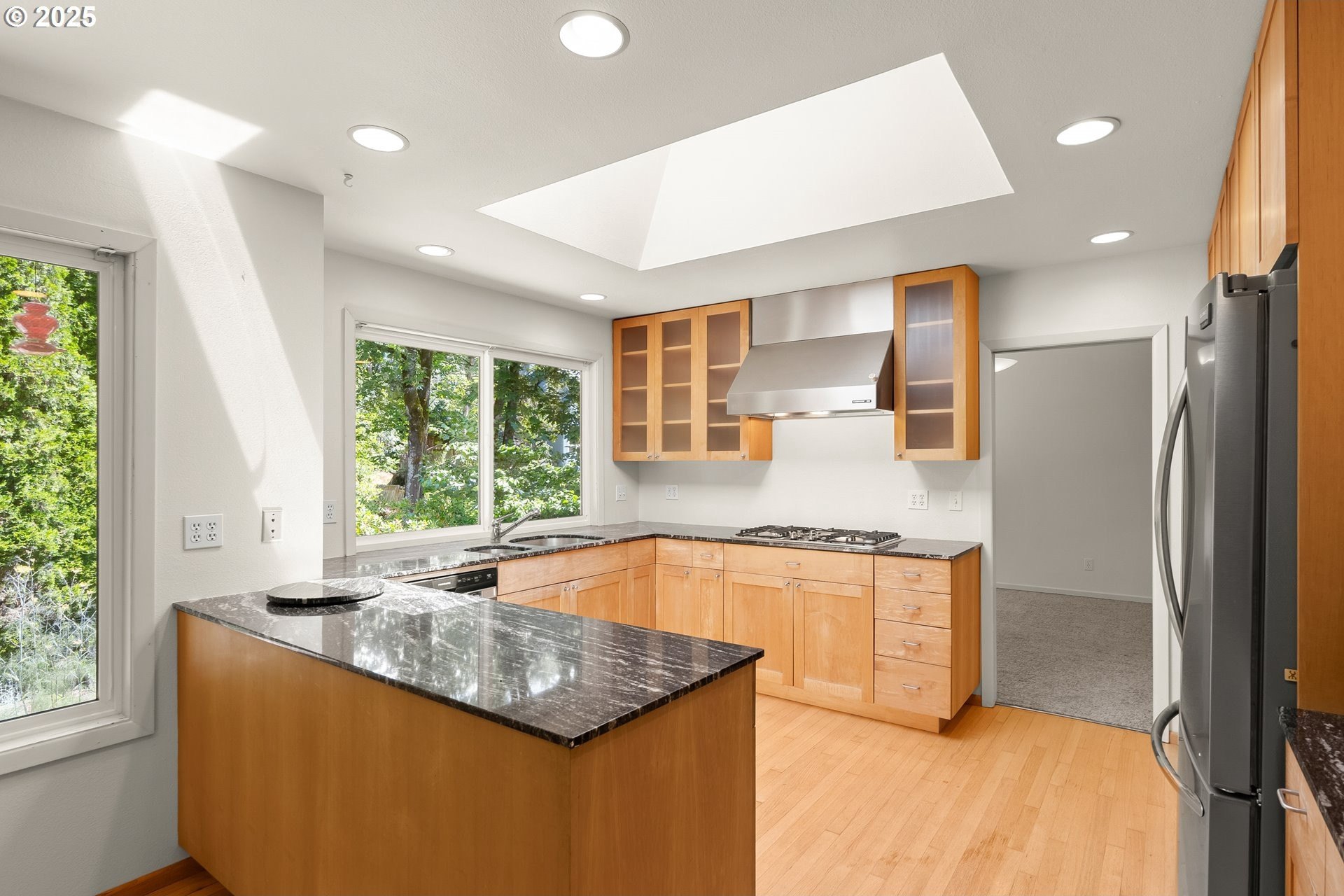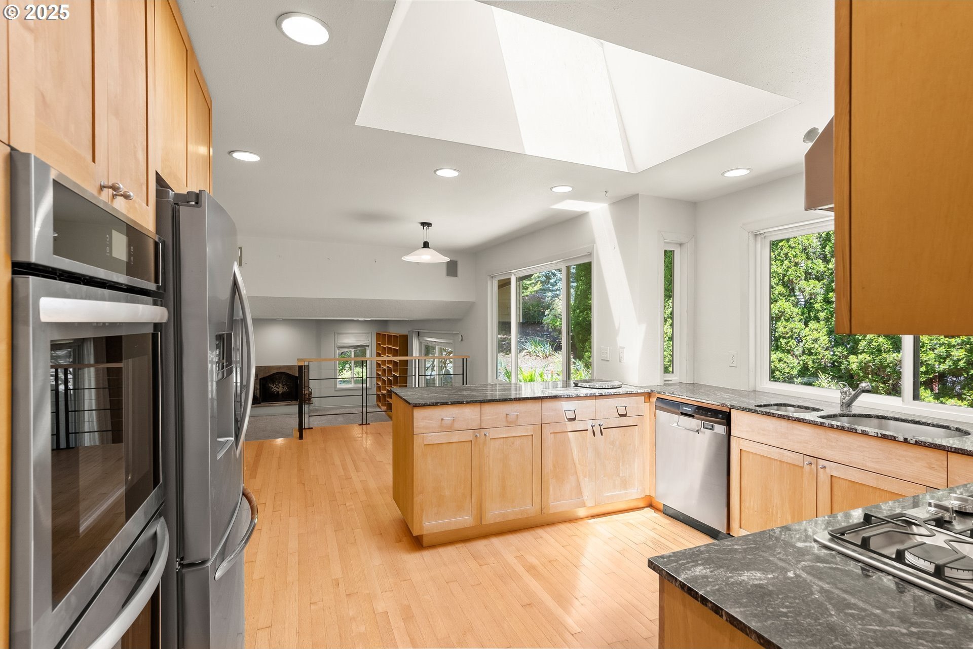 Open House: Sat 12-2 & Sun 10-12! This beautifully updated home offers space, light, and comfort across 3,196 square feet—all nestled in a desirable, well-established neighborhood. Step into a vaulted living room with brand-new carpet, fresh paint, and abundant natural light. The custom kitchen features stainless steel appliances, a new built-in gas cooktop, a sleek hood, and a skylight that fills the space with natural light. The dining room continues the airy feel with vaulted ceilings and updated finishes. A cozy eating nook sits just off the kitchen with a view down into the family room--perfect for site-lines! Downstairs, the large family room includes a wood-beam ceiling and a slider that opens to a slate patio—ideal for entertaining or relaxing. Additional highlights include vinyl windows throughout, new paint, multiple patios, lush green yard, built-in garage shelving and more!