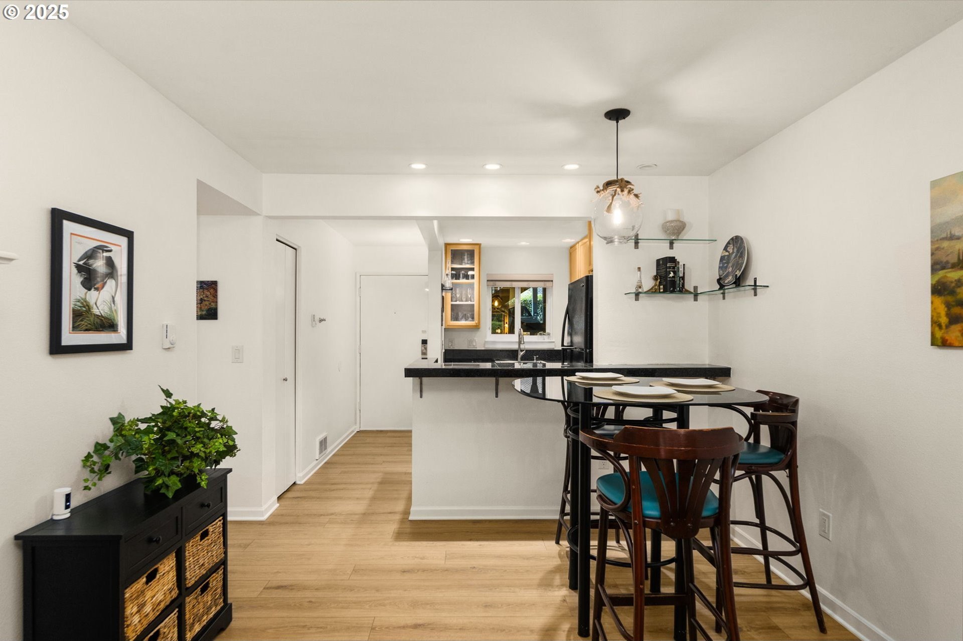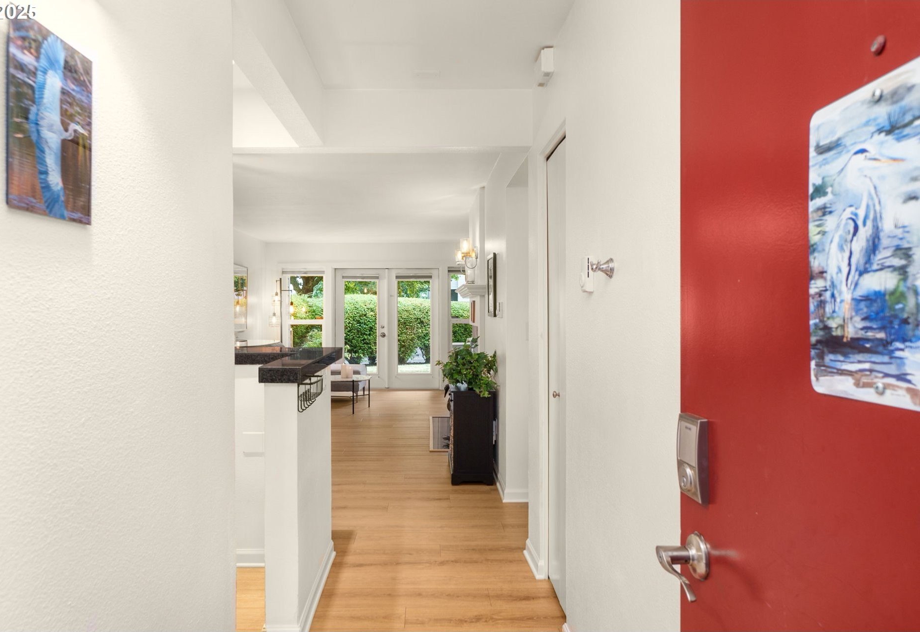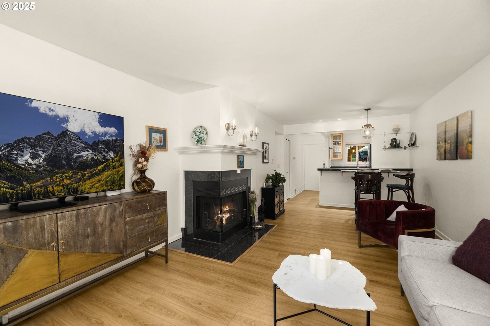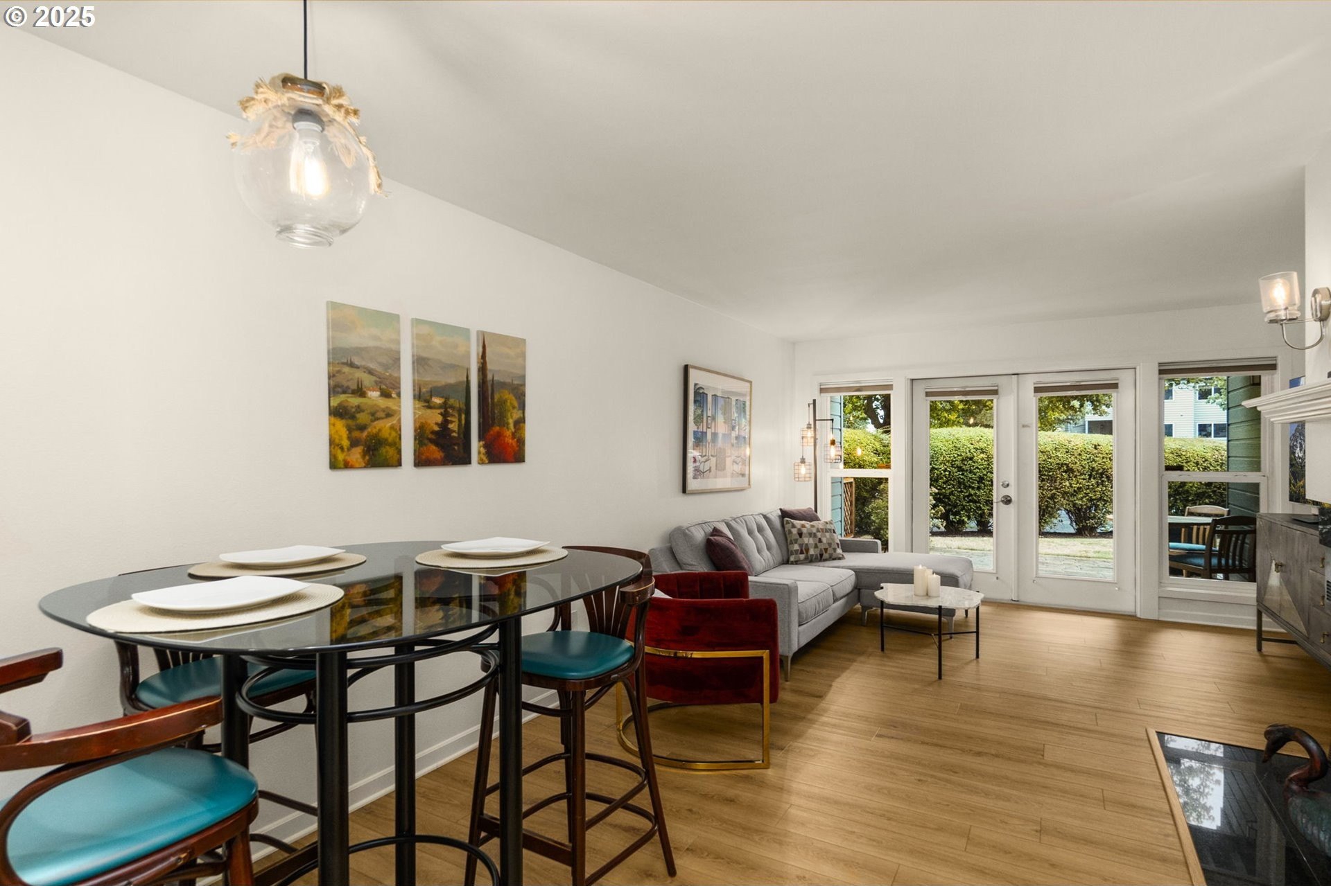Updated 2-bedroom, 2-bath condo in Johns Landing with over $45,000 in recent renovations! Steps from the river, minutes from downtown, this home has been beautifully updated for move-in ease. Wide-plank white oak LVP floors create a fresh, modern feel throughout. The kitchen features granite tile counters, a glass top range, new dishwasher, and an eating bar that opens to the dining and living areas. French doors extend the space to a private paver patio for outdoor living. Both bathrooms have been remodeled with new quartz vanities, toilets, mirrors, lighting, and upgraded exhaust fans. Additional updates include a new washer and dryer, Cadet wall heaters with modern thermostats, window furnishings, and Phantom retractable screens. Owned for over two decades, this condo also has great rental history. Recently offered as a furnished rental with nearly new furnishings, it remains an excellent turnkey investment or personal retreat.Johns Landing is valued for its walkability, riverfront trails, and easy access to downtown, the OHSU tram and shops and South Waterfront. With two reserved parking spaces and quick connections to I-5 and Macadam Avenue, commuting is made easy. Ask about Seller Carried Financing! Experience easy living in this well-maintained condo, ideal for homeowners or investors alike. Open House 10/4 from 1-3pm
