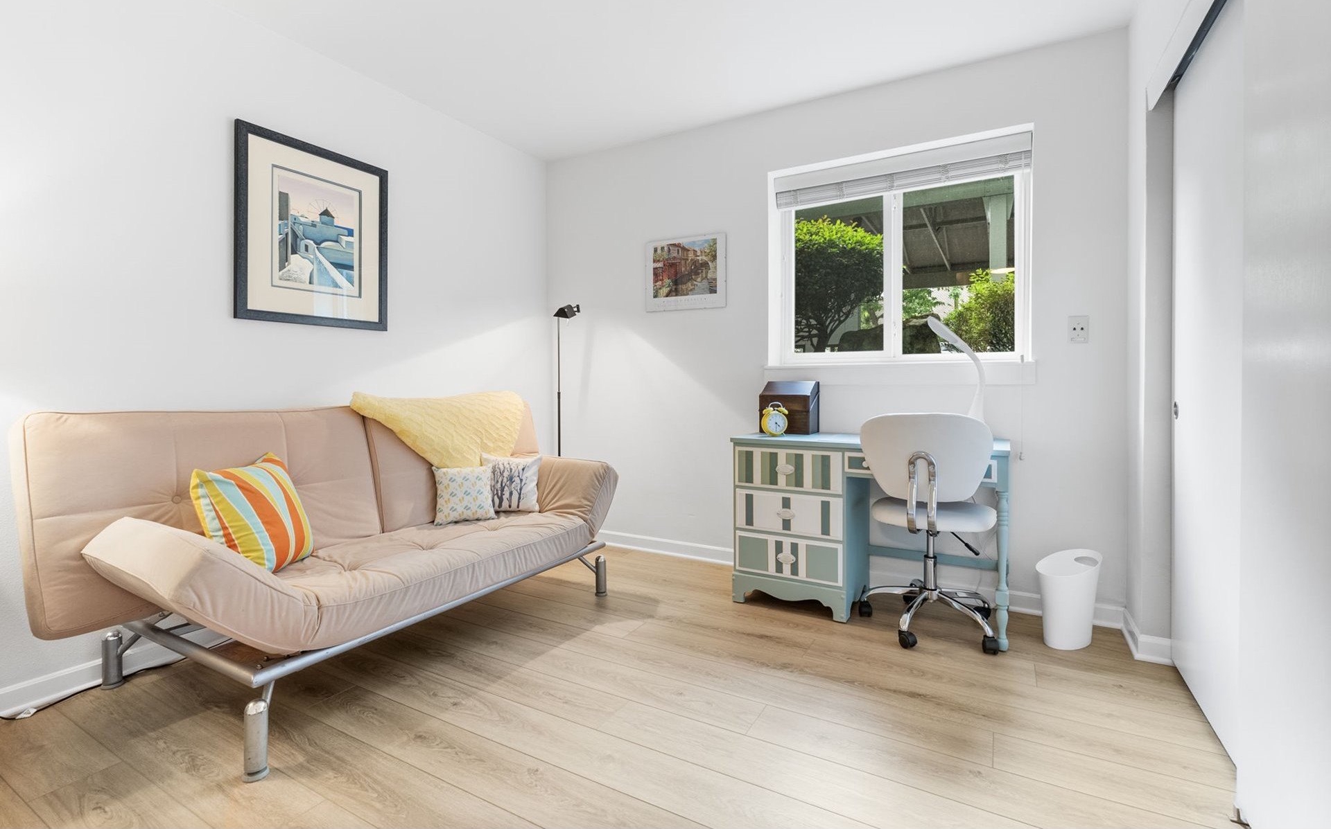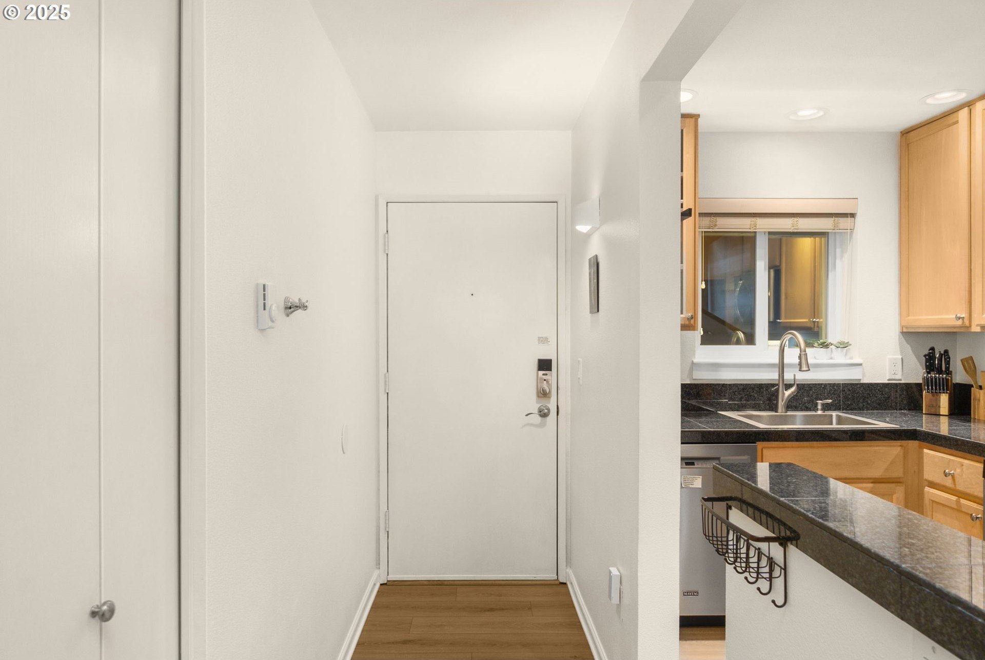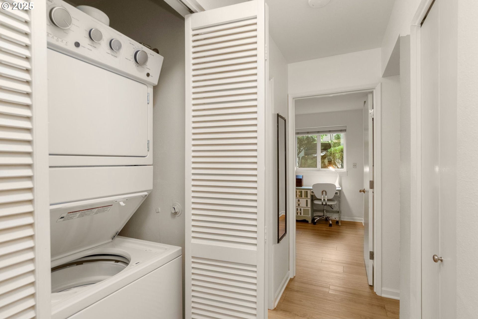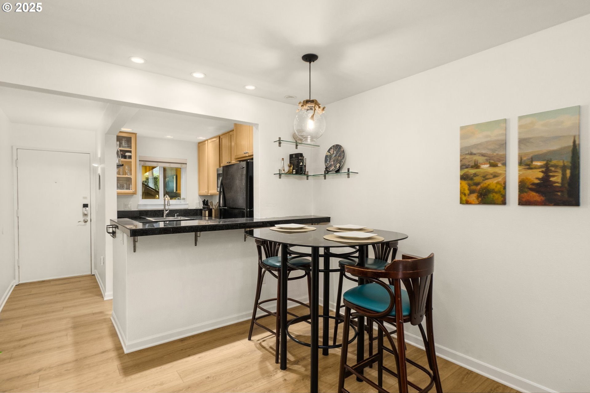 Updated 2-bedroom, 2-bath condo in Johns Landing with over $45,000 in recent renovations! Steps from the river, minutes from downtown, this home has been beautifully updated for move-in ease. Wide-plank white oak LVP floors create a fresh, modern feel throughout. The kitchen features granite tile counters, a glass top range, new dishwasher, and an eating bar that opens to the dining and living areas. French doors extend the space to a private paver patio for outdoor living. Both bathrooms have been remodeled with new quartz vanities, toilets, mirrors, lighting, and upgraded exhaust fans. Additional updates include a new washer and dryer, Cadet wall heaters with modern thermostats, window furnishings, and Phantom retractable screens. Owned for over two decades, this condo also has great rental history. Recently offered as a furnished rental with nearly new furnishings, it remains an excellent turnkey investment or personal retreat.Johns Landing is valued for its walkability, riverfront trails, and easy access to downtown, the OHSU tram and shops and South Waterfront. With two reserved parking spaces and quick connections to I-5 and Macadam Avenue, commuting is made easy. Ask about Seller Carried Financing! Experience easy living in this well-maintained condo, ideal for homeowners or investors alike. Open House 10/4 from 1-3pm