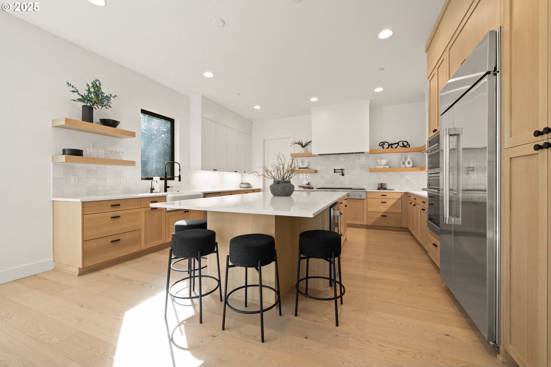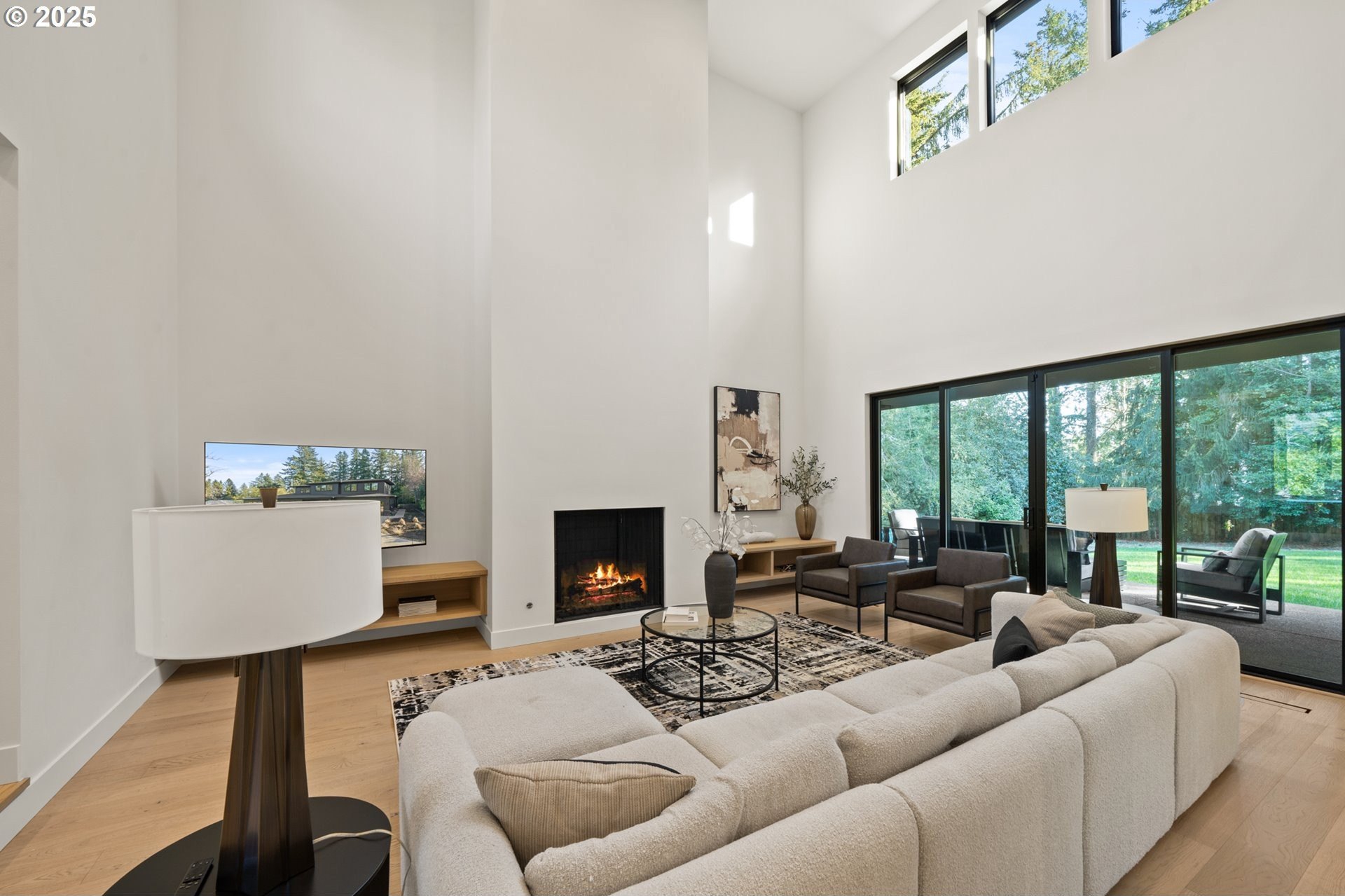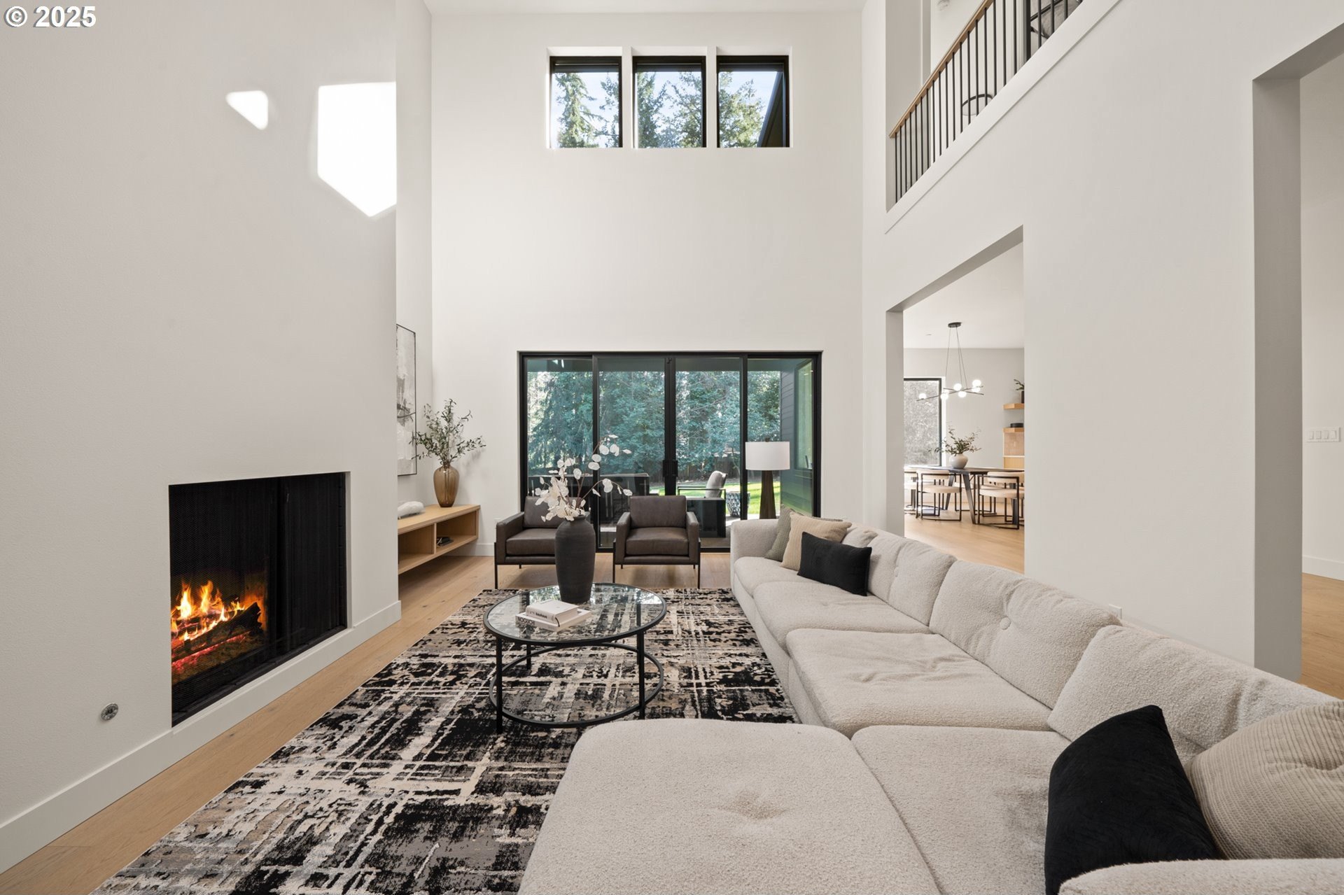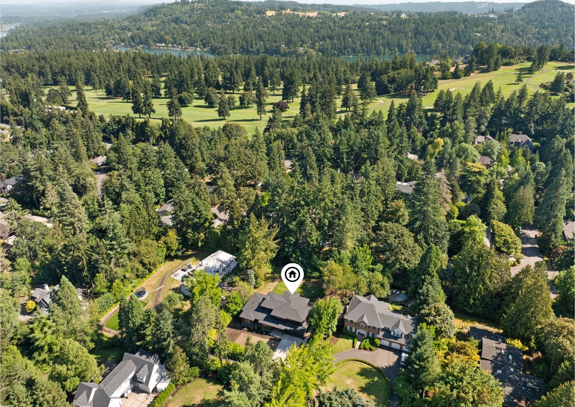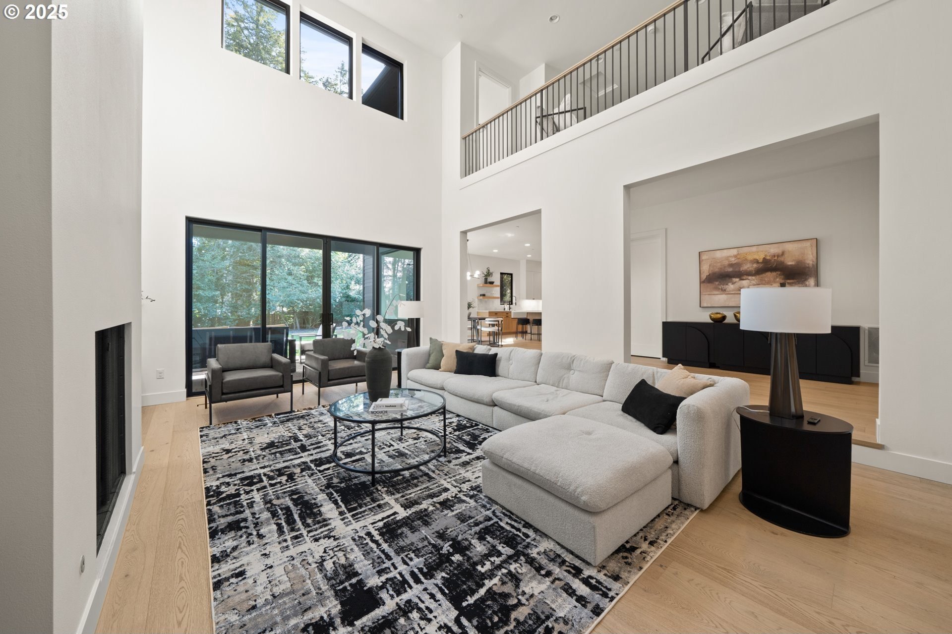 Tucked into the coveted First Highlands neighborhood, this newer custom build by notable Street of Dreams builder is a striking blend of minimalistic design and warm, organic elegance. Set on an ultra-rare 0.6-acre lot, the home offers unmatched privacy, a sprawling backyard with endless potential, and the quiet serenity of an elevated lifestyle. Step inside to soaring two-story ceilings in the great room, grounded by a stunning wood-burning masonry fireplace. The open-concept floor plan is intentionally designed with defined, yet open spaces including a sunken living room, custom white oak cabinetry, clean lines, and refined finishes throughout. A seamless indoor-outdoor flow leads to a covered outdoor living space, perfect for year-round enjoyment. The main floor offers highly desirable main-level living with both primary suite and guest room. Enjoy the versatility of dual home offices with built-ins, each thoughtfully positioned on the main level and the upper floor, offering separate work spaces. Upstairs, a lofted common area and expansive bonus room offer flexibility for media, fitness, or play. A statement of refined craftsmanship from a celebrated builder, this residence is surrounded by nature, beautifully situated on one of the neighborhood’s most exceptional lots.