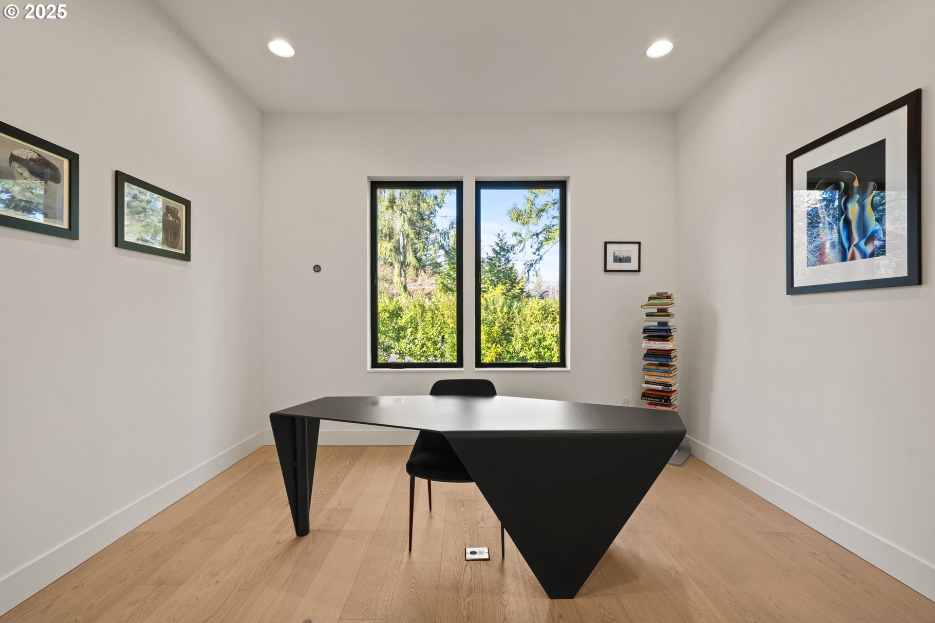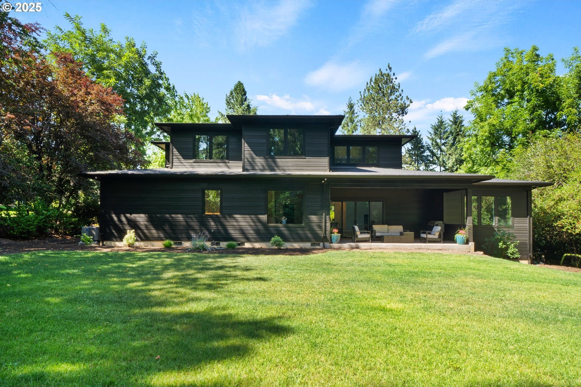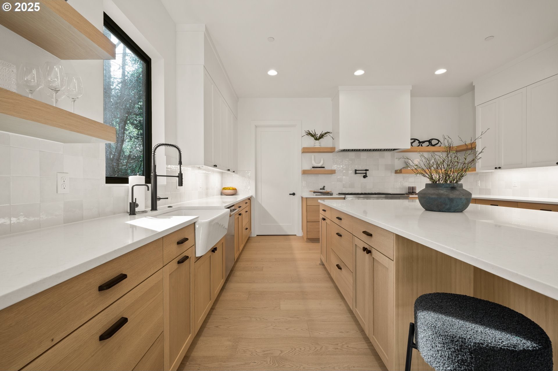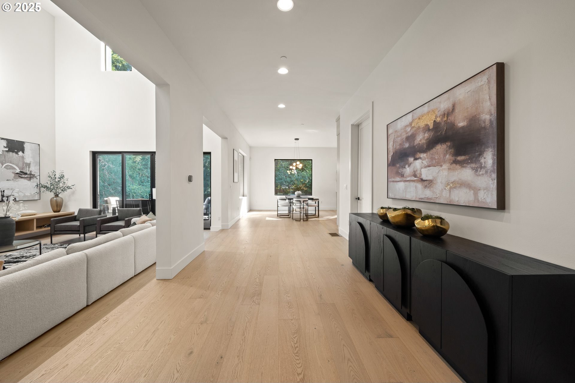 Tucked into the coveted First Highlands neighborhood, this newer custom build by notable Street of Dreams builder is a striking blend of minimalistic design and warm, organic elegance. Set on an ultra-rare 0.6-acre lot, the home offers unmatched privacy, a sprawling backyard with endless potential, and the quiet serenity of an elevated lifestyle. Step inside to soaring two-story ceilings in the great room, grounded by a stunning wood-burning masonry fireplace. The open-concept floor plan is intentionally designed with defined, yet open spaces including a sunken living room, custom white oak cabinetry, clean lines, and refined finishes throughout. A seamless indoor-outdoor flow leads to a covered outdoor living space, perfect for year-round enjoyment. The main floor offers highly desirable main-level living with both primary suite and guest room. Enjoy the versatility of dual home offices with built-ins, each thoughtfully positioned on the main level and the upper floor, offering separate work spaces. Upstairs, a lofted common area and expansive bonus room offer flexibility for media, fitness, or play. A statement of refined craftsmanship from a celebrated builder, this residence is surrounded by nature, beautifully situated on one of the neighborhood’s most exceptional lots.