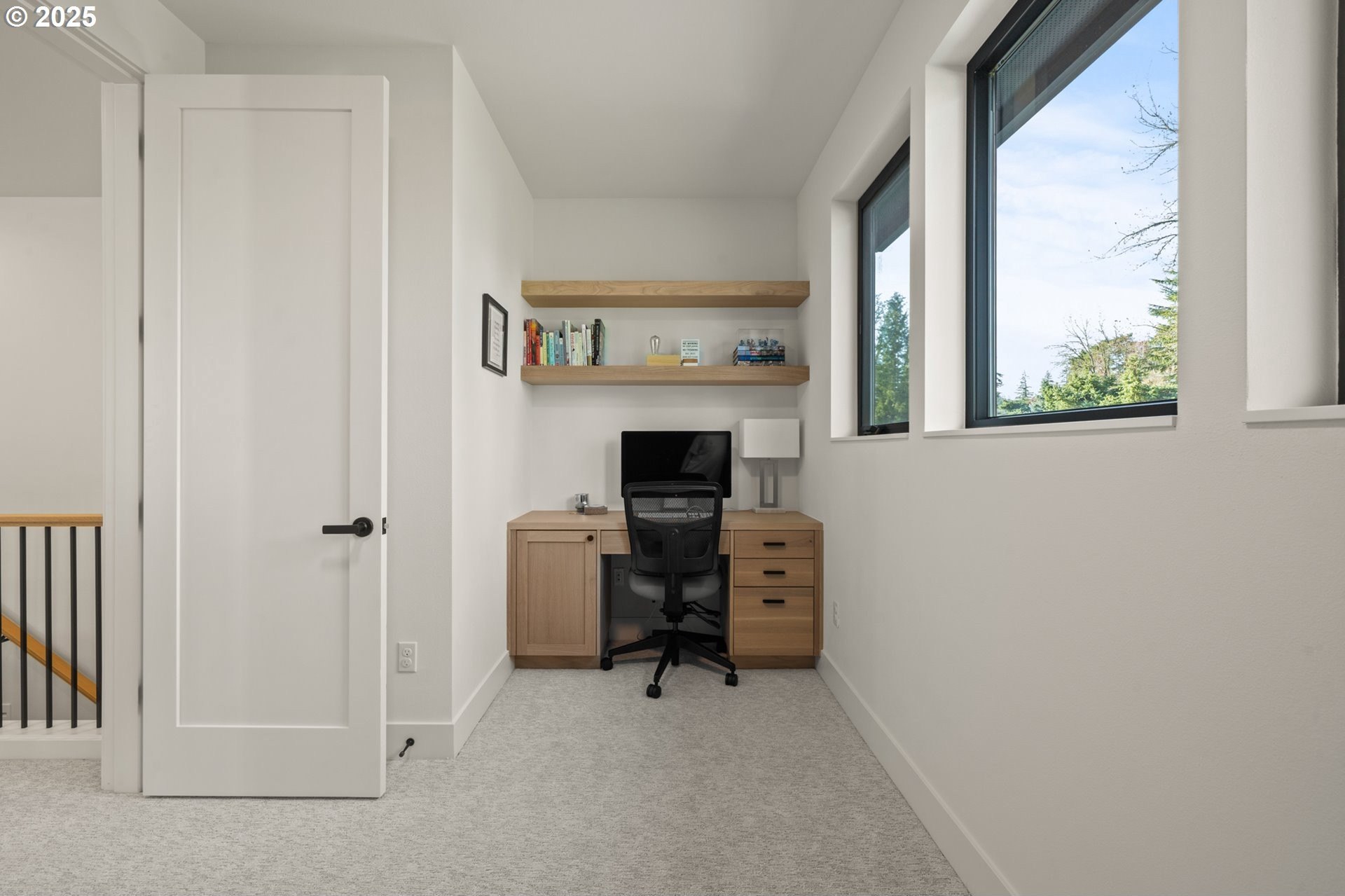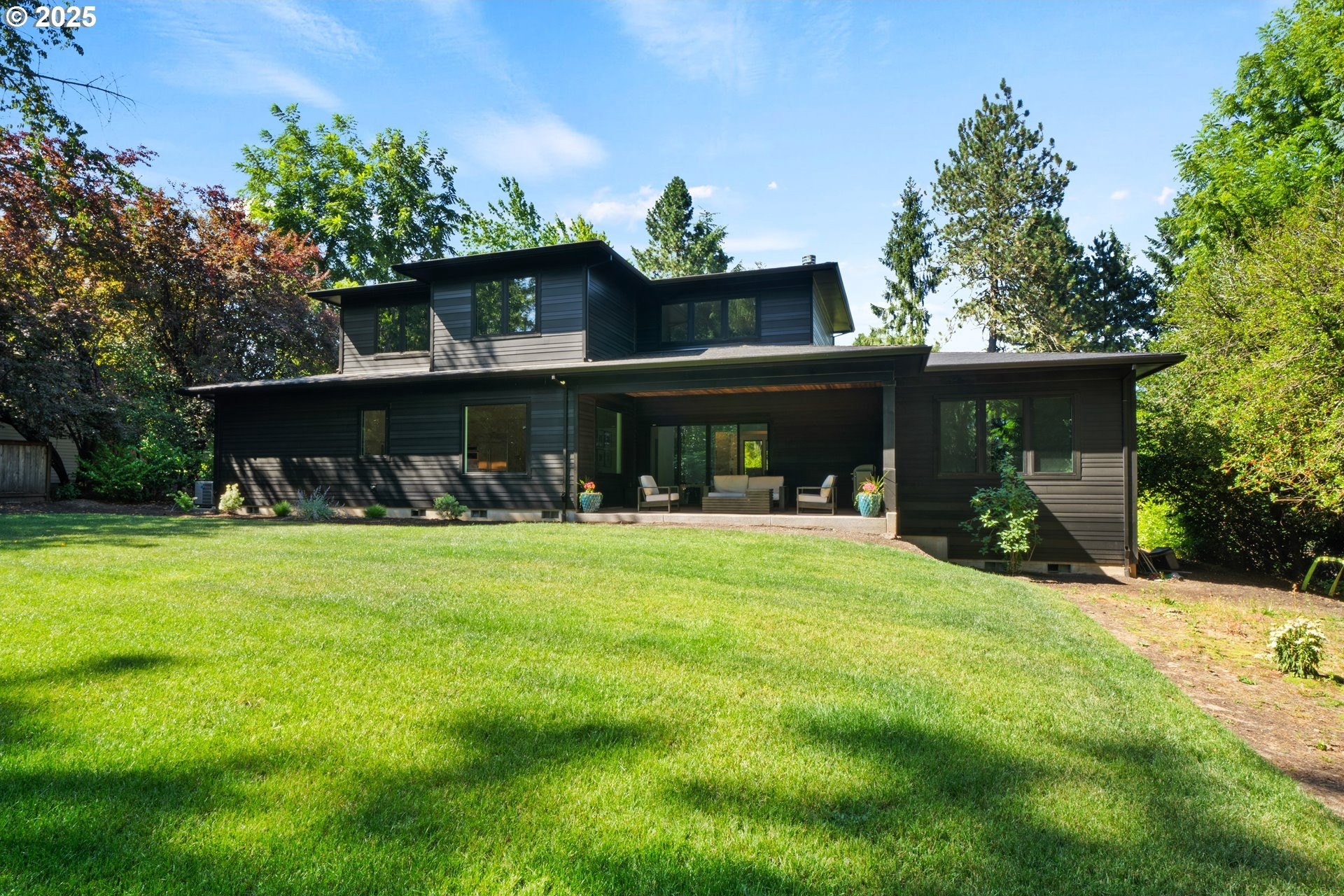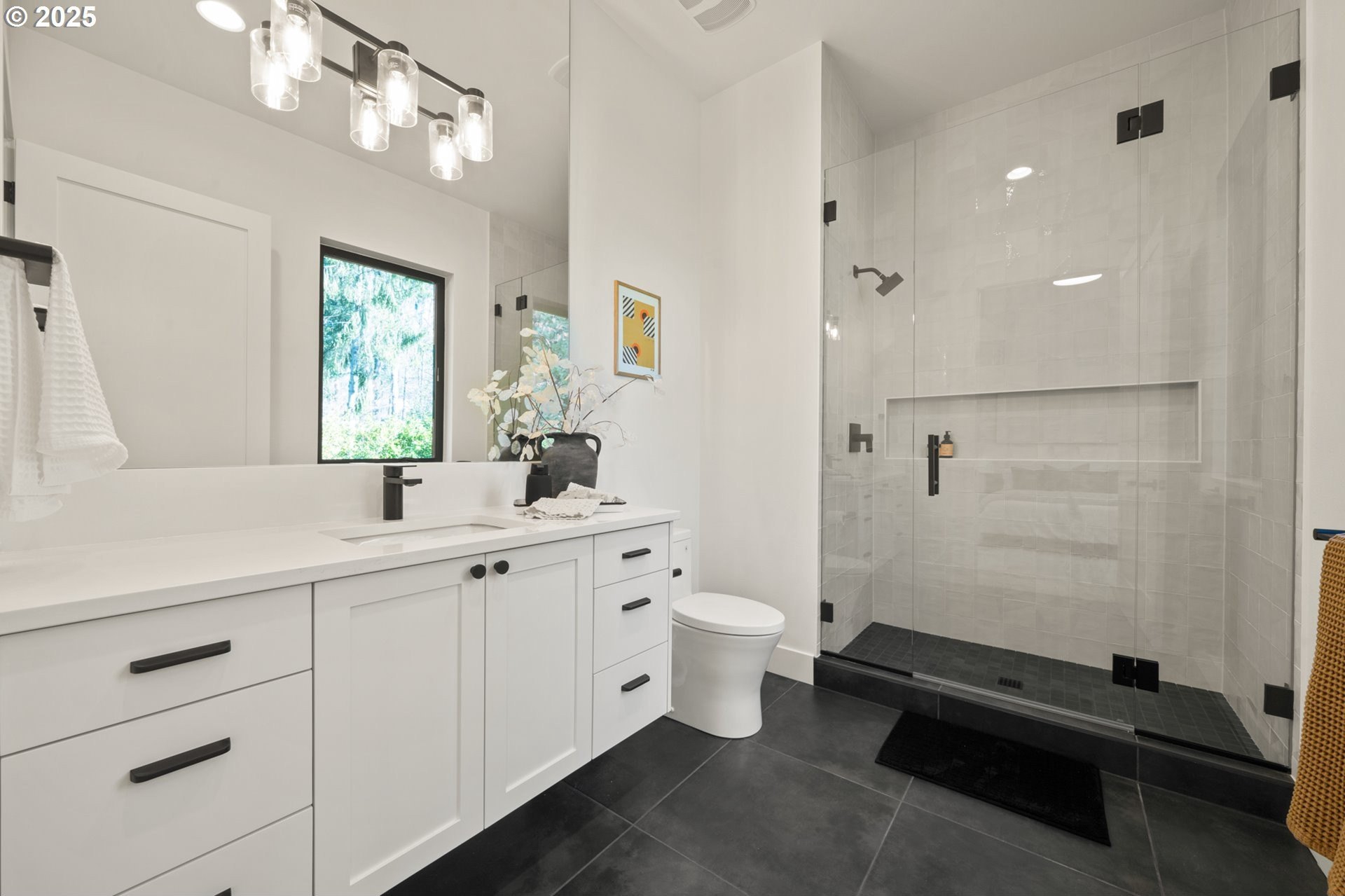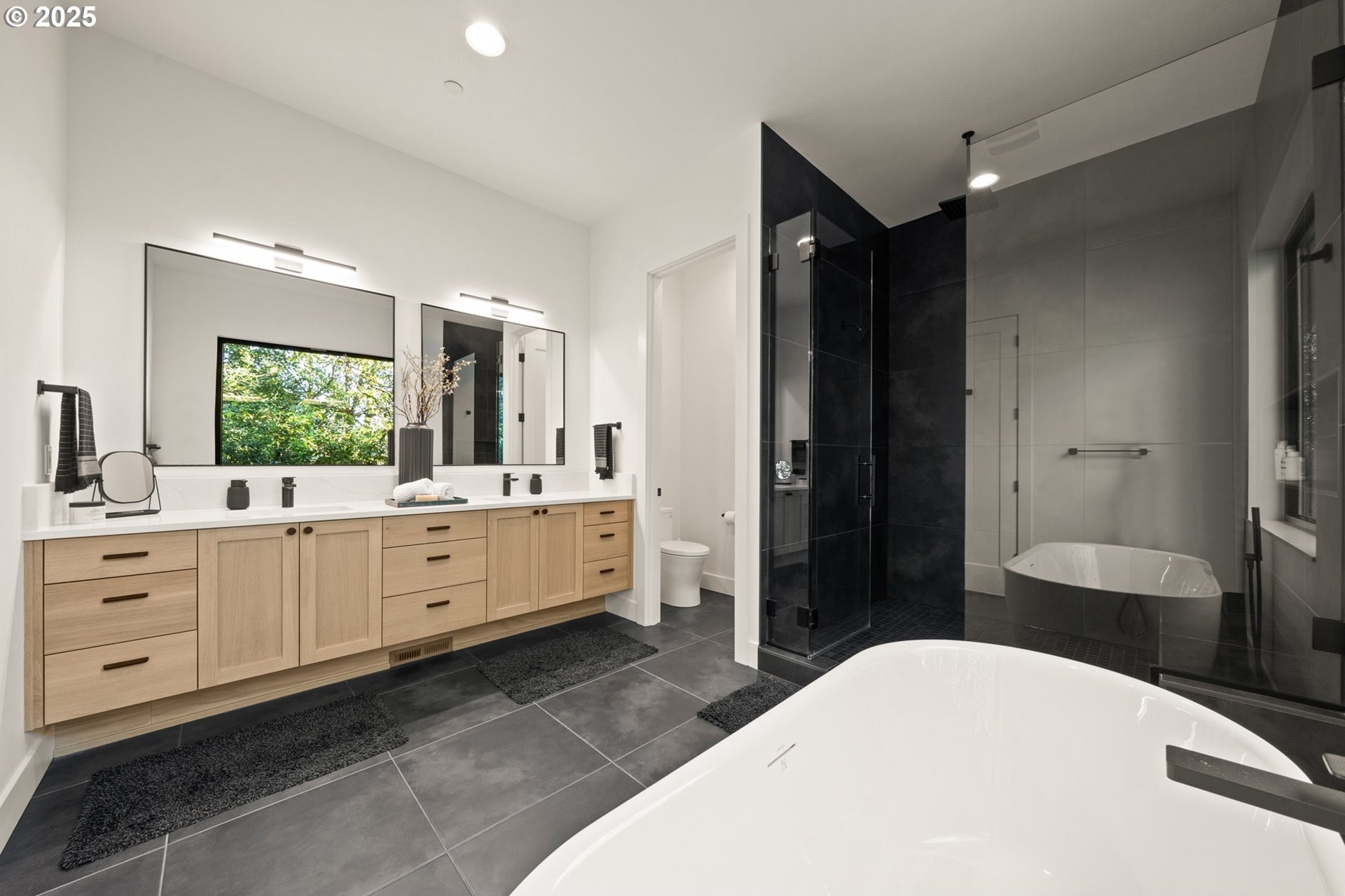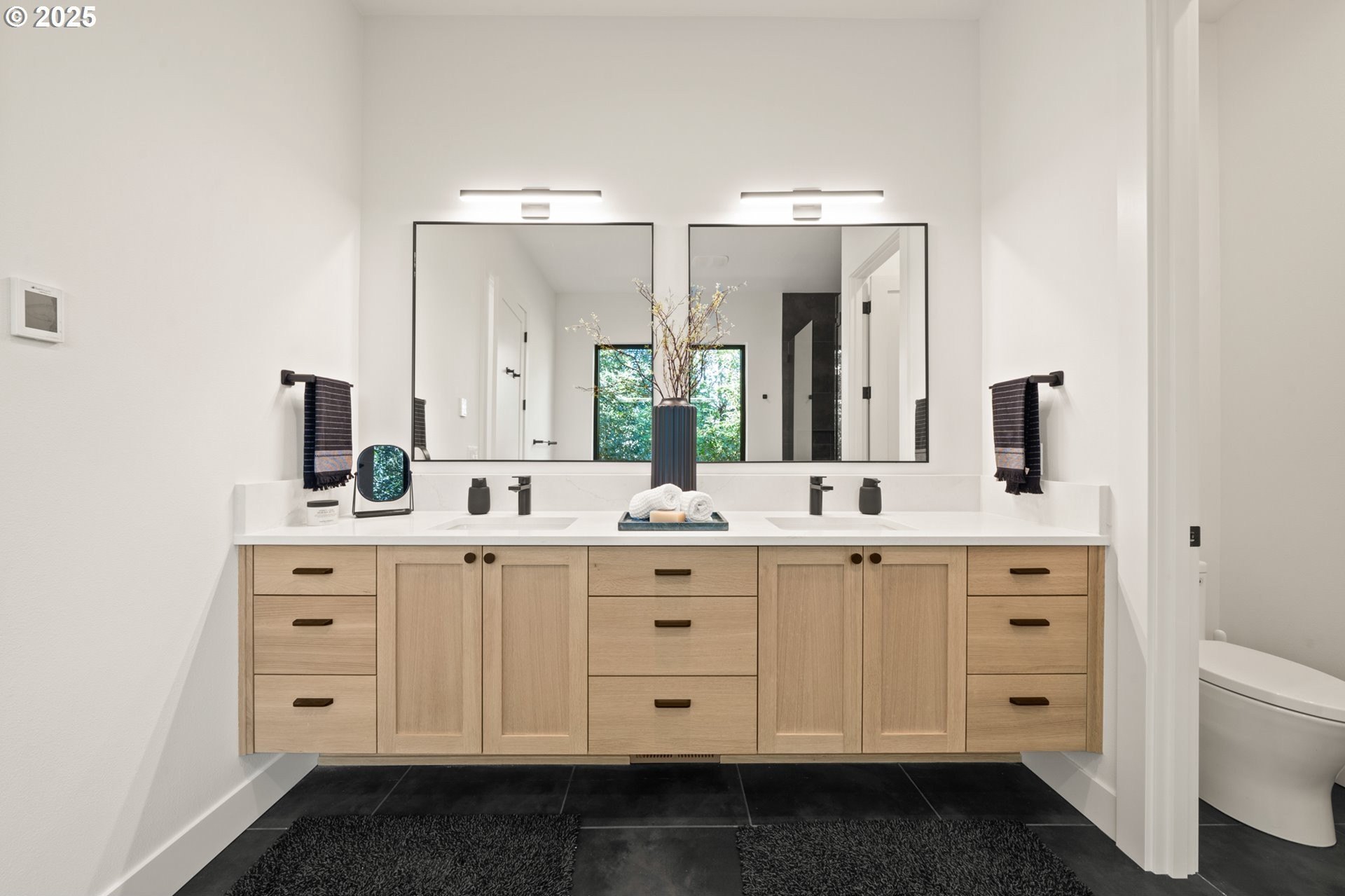 Tucked into the coveted First Highlands neighborhood, this newer custom build by notable Street of Dreams builder is a striking blend of minimalistic design and warm, organic elegance. Set on an ultra-rare 0.6-acre lot, the home offers unmatched privacy, a sprawling backyard with endless potential, and the quiet serenity of an elevated lifestyle. Step inside to soaring two-story ceilings in the great room, grounded by a stunning wood-burning masonry fireplace. The open-concept floor plan is intentionally designed with defined, yet open spaces including a sunken living room, custom white oak cabinetry, clean lines, and refined finishes throughout. A seamless indoor-outdoor flow leads to a covered outdoor living space, perfect for year-round enjoyment. The main floor offers highly desirable main-level living with both primary suite and guest room. Enjoy the versatility of dual home offices with built-ins, each thoughtfully positioned on the main level and the upper floor, offering separate work spaces. Upstairs, a lofted common area and expansive bonus room offer flexibility for media, fitness, or play. A statement of refined craftsmanship from a celebrated builder, this residence is surrounded by nature, beautifully situated on one of the neighborhood’s most exceptional lots.