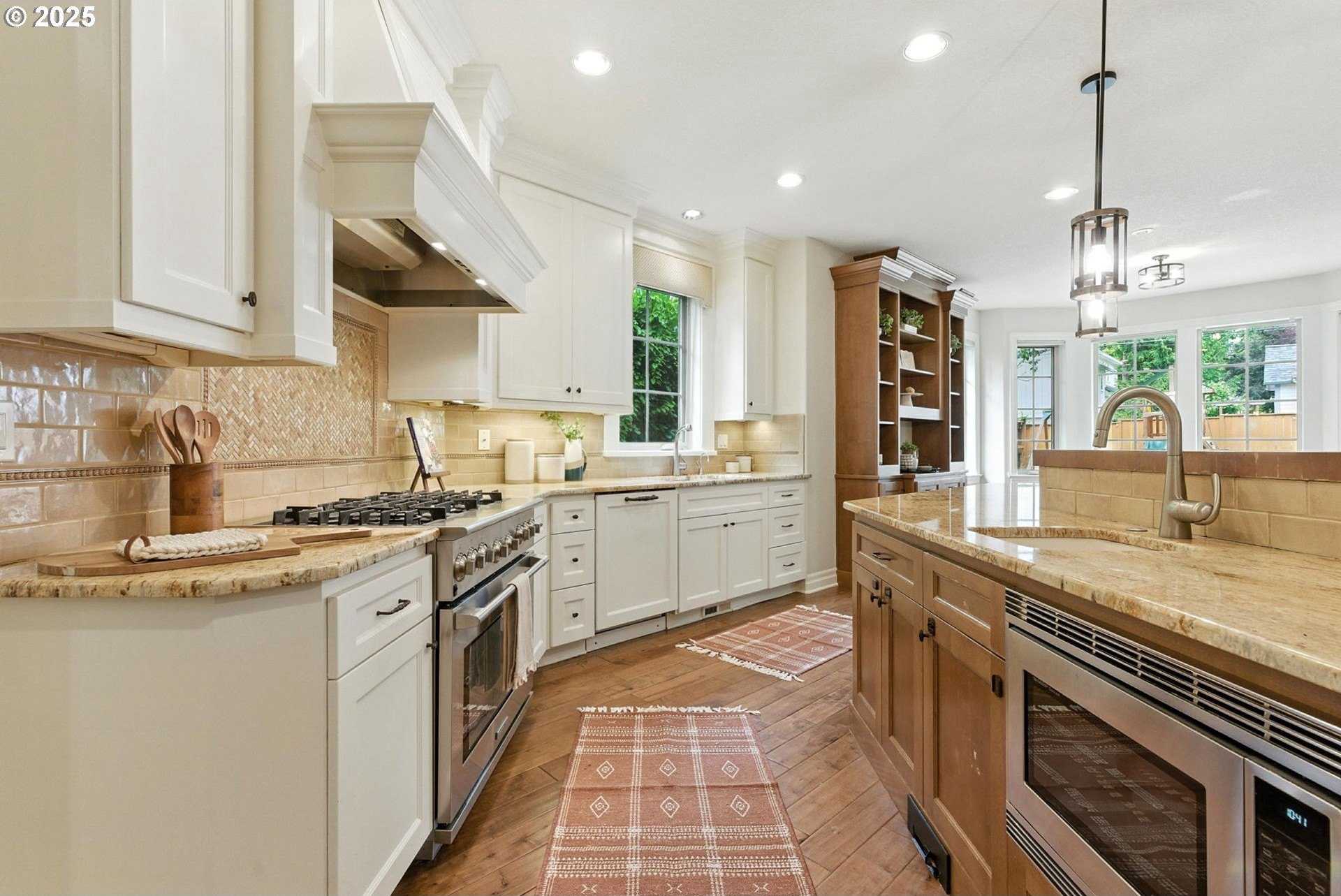 Located in Lake Oswego’s sought-after First Addition, this custom home blends craftsmanship with comfort. The main level features tall ceilings, wide-plank hardwoods, rich millwork, and an open layout ideal for entertaining. The gourmet kitchen includes a Wolf range, Sub-Zero fridge, oversized island, and walk-in pantry, flowing into the great room with built-ins and a gas fireplace. A formal dining area and office complete the main floor. Upstairs, the elegant primary suite offers a spa-like bath with heated floors, soaking tub, walk-in shower, and custom closet. Two additional bedrooms share a full bath, and the laundry room is conveniently nearby. The finished lower level includes a guest suite, family room with wet bar, media room, workout space, and storage. Outside, enjoy low-maintenance turf, hardscaping, and fully fenced front and back yard. A rare bonus—an ADU above the garage with full bath—adds flexible space for guests, work, or rental. Blocks to parks, shops, library, dining, and top-rated schools. OPEN HOUSE SATURDAY 8/9 12-2PM.