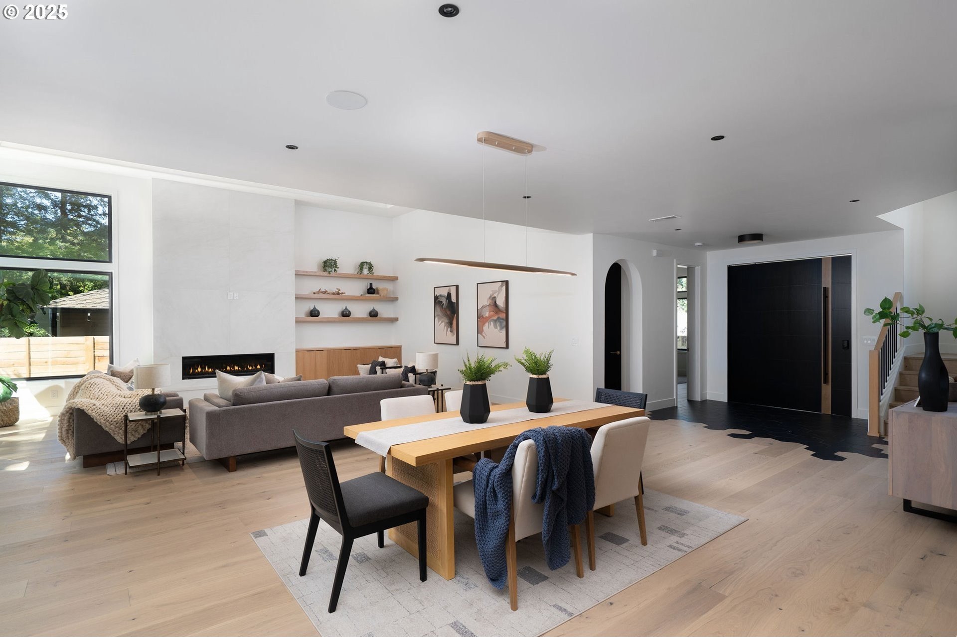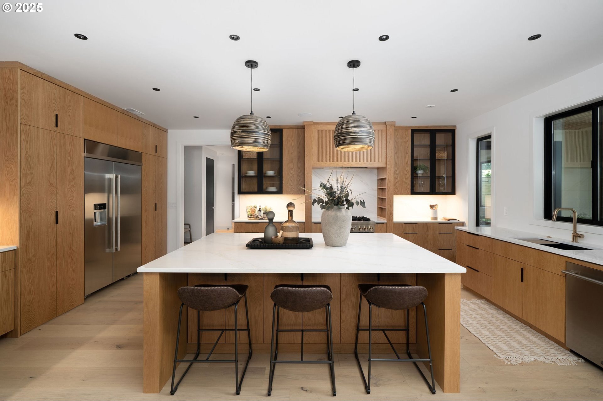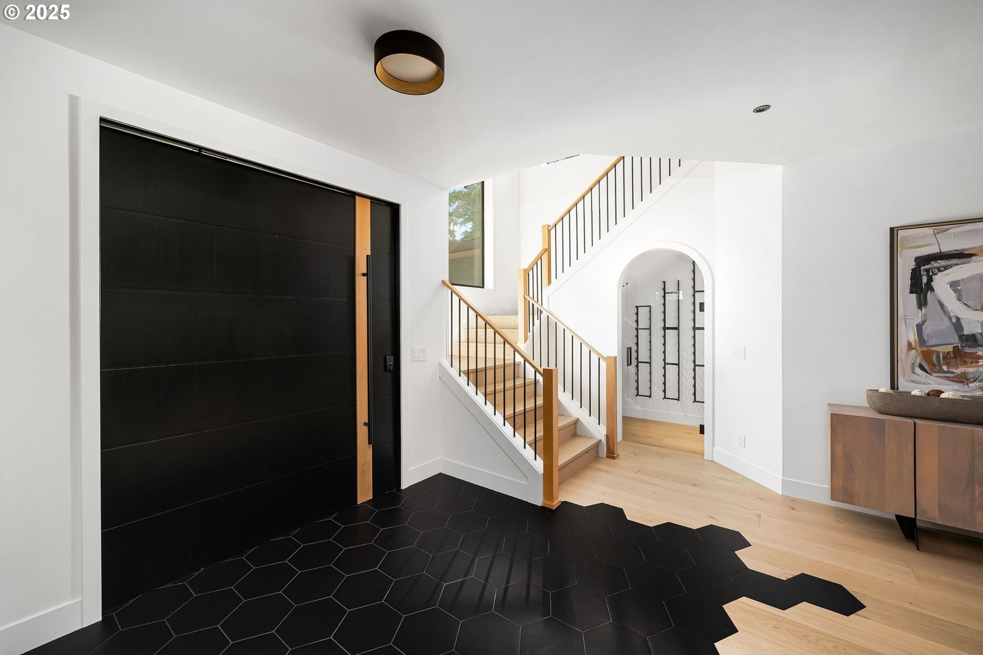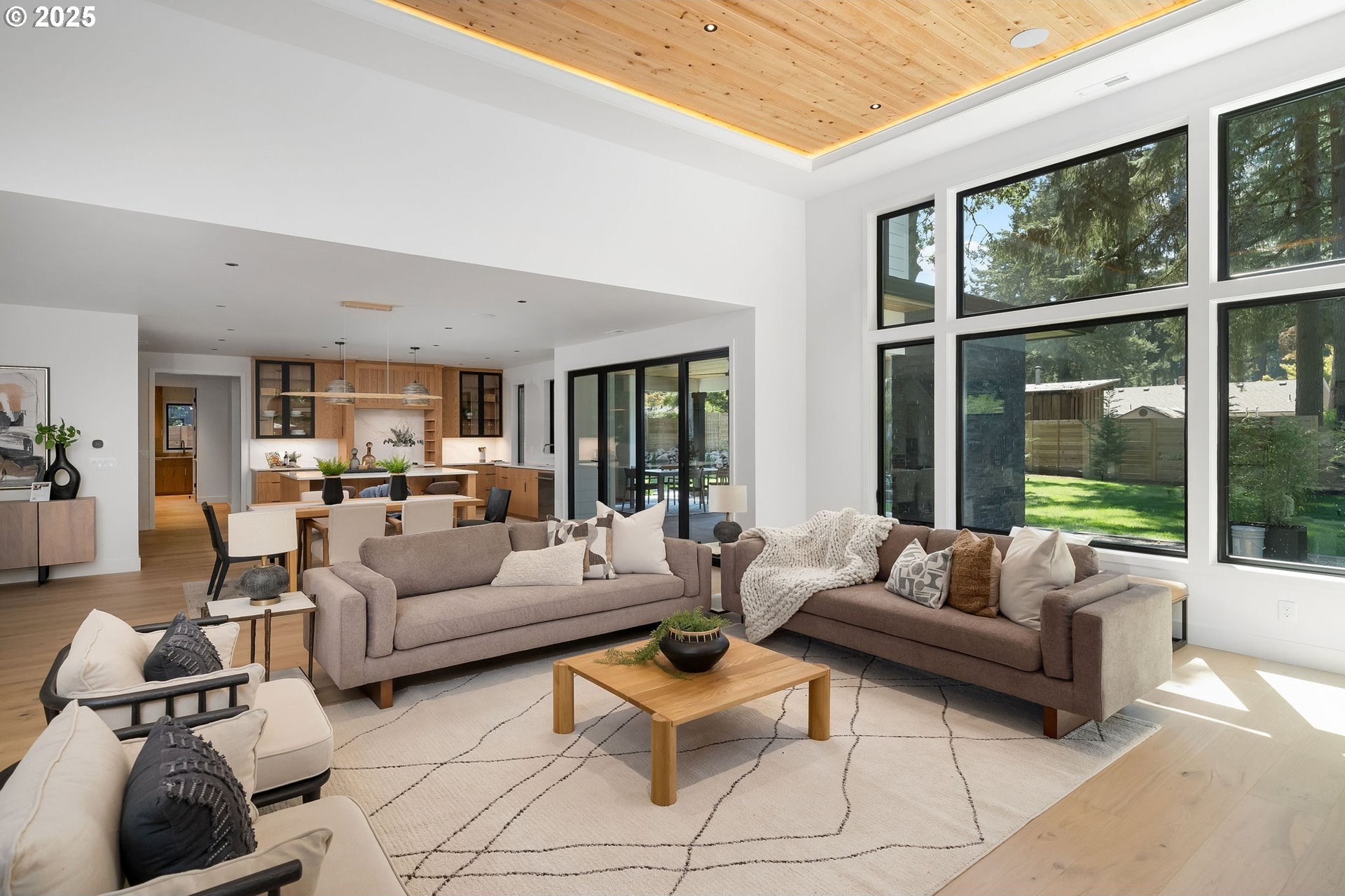 Anchored by mature trees in Lake Oswego’s Bryant neighborhood, 4340 Chapman Way is a newly constructed 4,100-square-foot home that embraces warmth, simplicity, and material integrity. The facade pairs black die sand–finish concrete with cedar soffits, ledger stone, and a custom pivot door scaled for quiet impact. Inside, wide-plank engineered hardwoods ground an open floor plan where natural light moves easily through curated spaces. Custom white oak cabinetry, quartz surfaces, and smooth wall finishes define the kitchen and great room, which connect seamlessly to a wine cellar and covered outdoor area with gas fireplace. The main level includes a generous primary suite, a second full bath, and a flexible office or guest bedroom. Every detail supports comfort: blown-in insulation, a 40-year roof, Navien tankless water heater, dual Bryant high-efficiency furnaces and A/C units, Cat6 wiring, and integrated ceiling audio. Glass and aluminum garage doors open to a fully irrigated landscape, illuminated by architectural lighting and supported by underground stormwater management. Just minutes from Bridgeport Village, Zupan’s, neighborhood parks, and trails, the home sits within one of Oregon’s top-rated school districts—with direct access I-5.